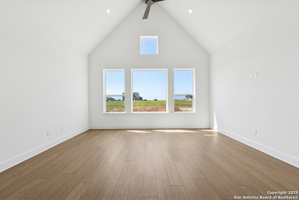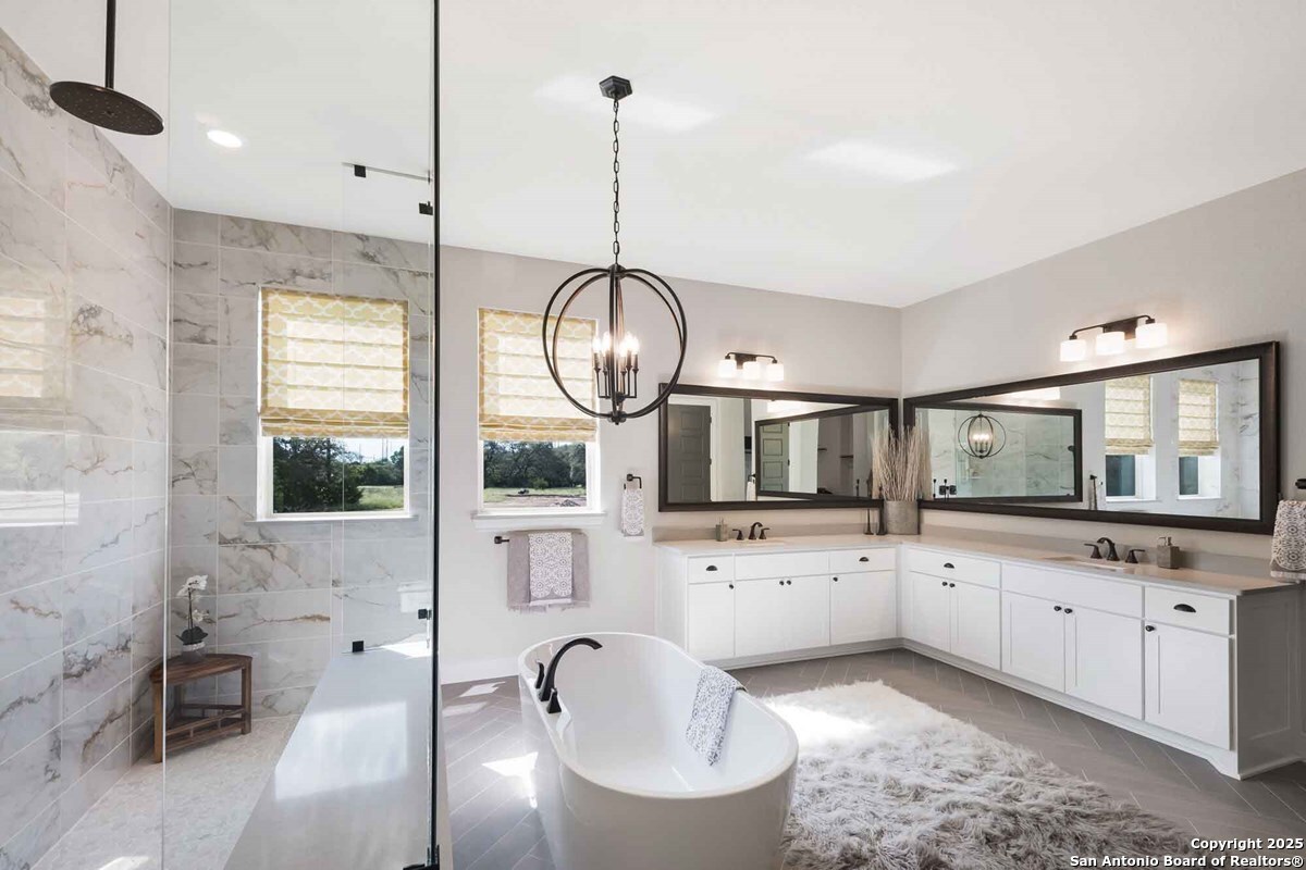 WIDE OPEN SPACES! Enjoy everyday luxury in the beautiful Chadwick by David Weekley Homes. The incredible Texas-sized courtyard welcomes you to a covered front patio and double 8' front doors. The massive island at your gourmet kitchen can easily seat 5-6 guests. Custom soft grey kitchen cabinets to the ceiling and in the adjoining dining space provide extra storage for the budding gourmet or entertainer. The stylish dining space and your Owner's Retreat boast vaulted ceilings, while elegant 8' interior doors and sliding glass doors to the back patio create a wall of windows. You may be tempted to spend hours in the Super Owner's bath, with a magnificent double-entry shower and free-standing tub, plus His and Hers closets! Relax in front of the family room fireplace or on your grand outdoor living patio, complete with ceiling fans, a gas stub for your barbeque grill and outlet for an outdoor TV. Spacious secondary bedrooms ensure that everyone has a great place to make their own, and the private en-suite bedroom with walk-in shower is perfect for guests. The roomy study has 8' French doors and may be used as an office or game room. A 3-car side-load garage, garage door openers and window blinds complete this masterpiece on a beautiful 1/2 acre home site. Visit Megan's Landing today to claim your stake in Texas