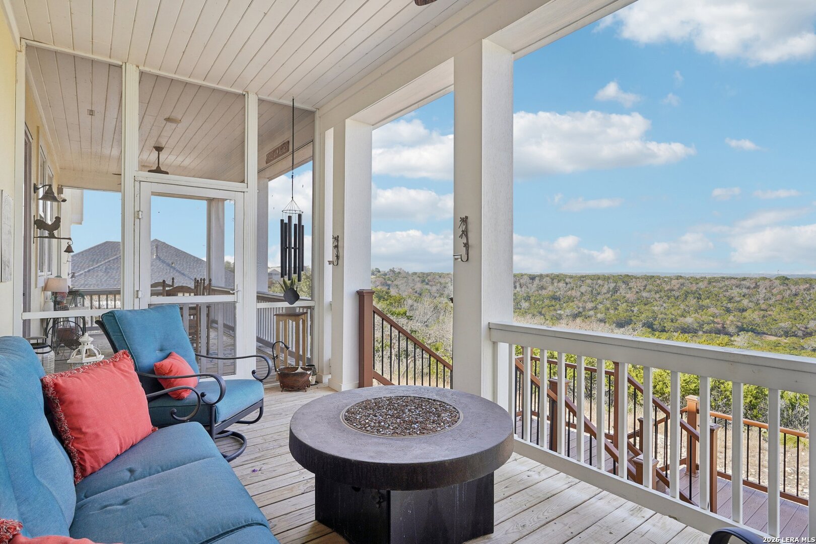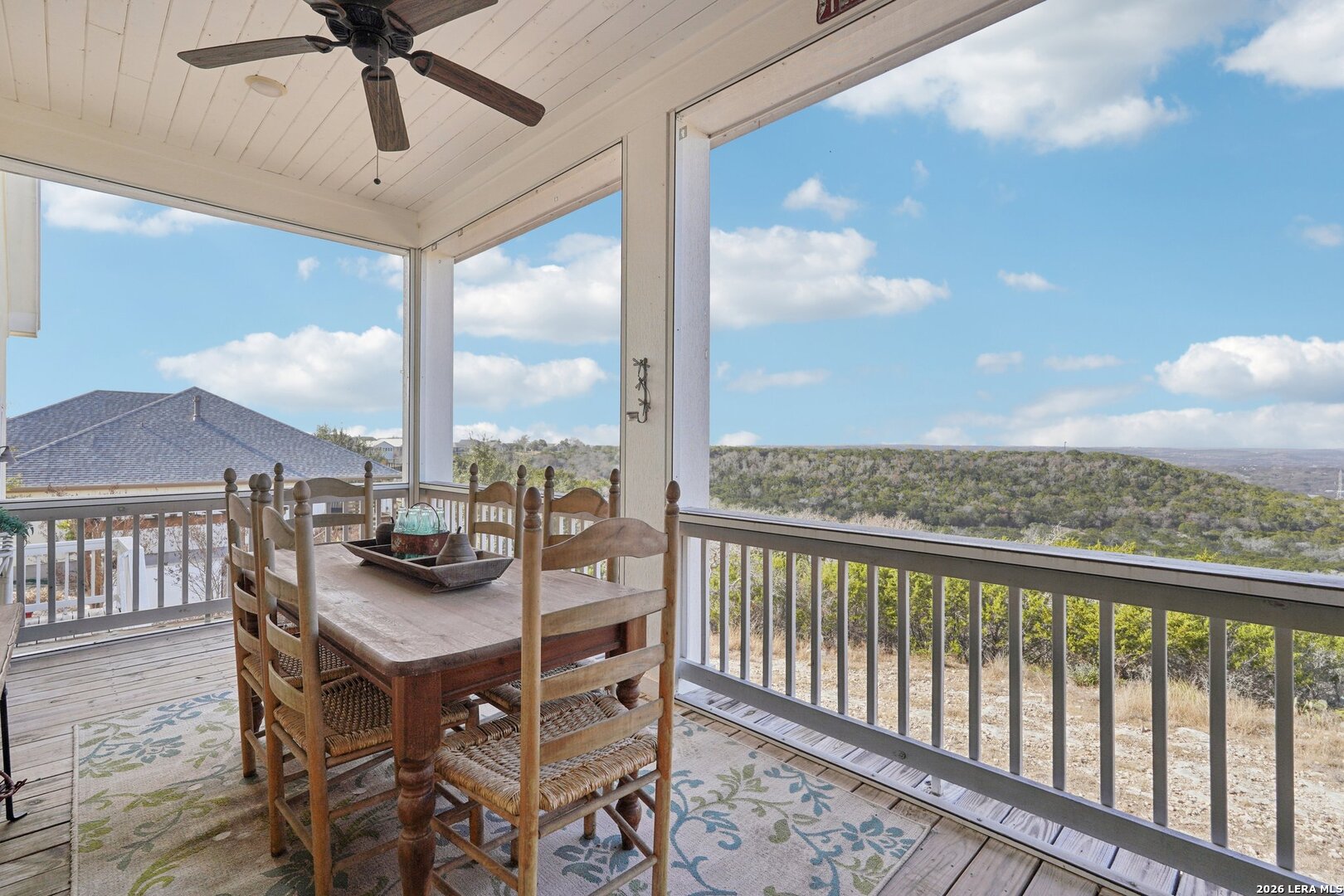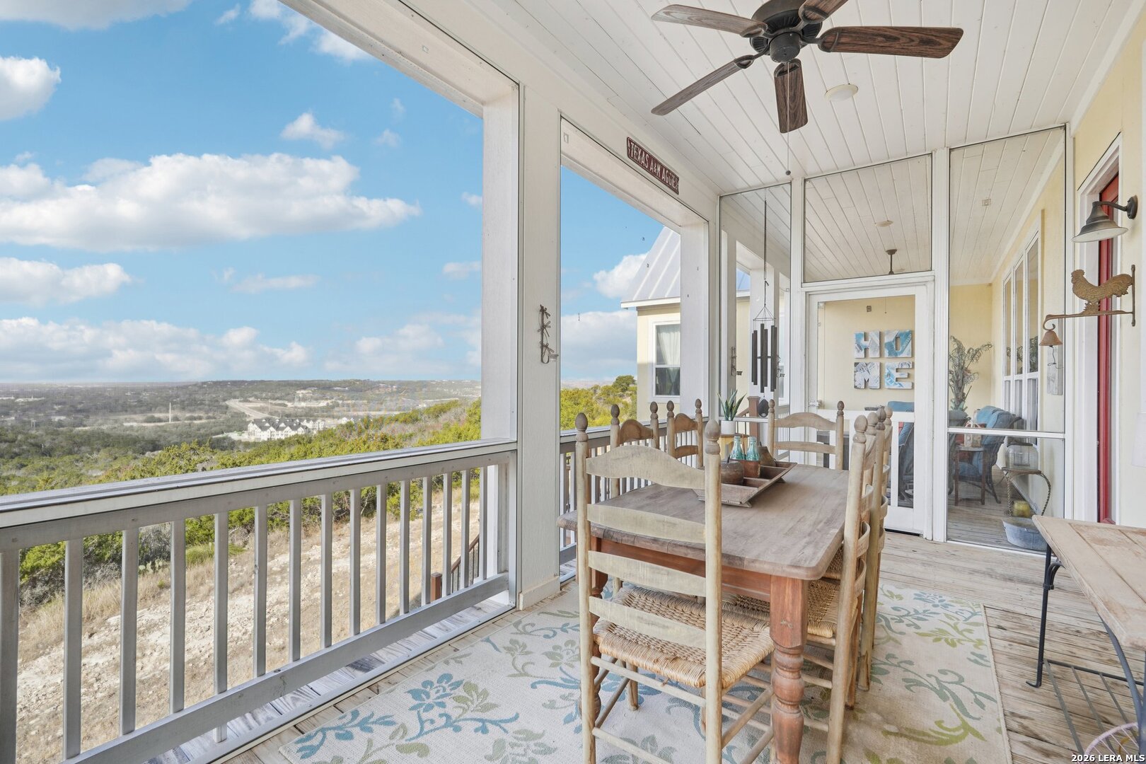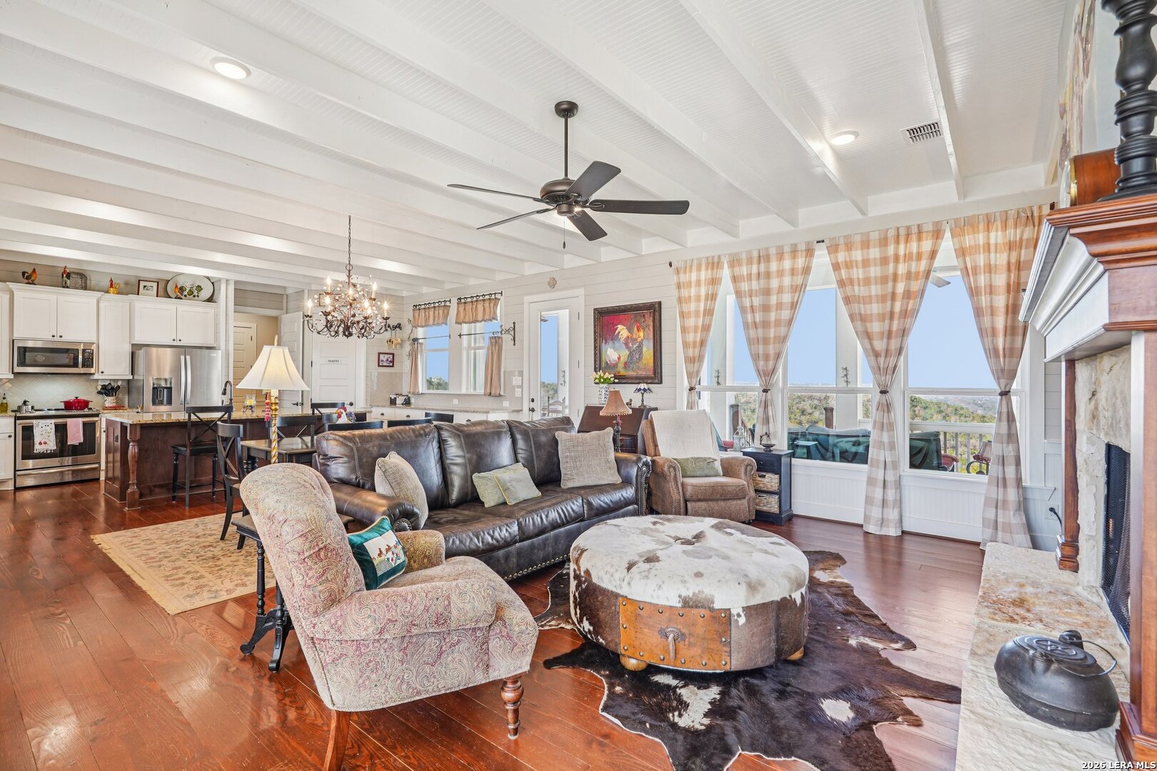 Light, bright, and full of character, this exceptional two-story home blends classic Americana style with Farmhouse style charm. An all-masonry exterior and standing-seam metal roof create striking curb appeal, while the elevated setting on a quiet cul-de-sac captures knockout views and cooling breezes. Covered front and back porches invite outdoor living and enhance the home's welcoming presence. Inside, wide-plank hardwood floors, tall doors, and high ceilings set a warm, timeless tone, with expansive windows throughout flooding the home with natural light. The living area is anchored by a beautiful stone gas fireplace, and the kitchen is designed for both function and style with an electric range, large island, granite countertops, and ample cabinetry. The primary suite features serene bedside views, a generous walk-in closet, and a spa-inspired bath with dual vanities plus a separate soaking tub and shower. Additional highlights include an oversized laundry room with abundant storage and an oversized two-car garage with a climate-controlled workshop or hobby room. Centrally located in Kerrville, this home offers timeless design, thoughtful functionality, and unforgettable views