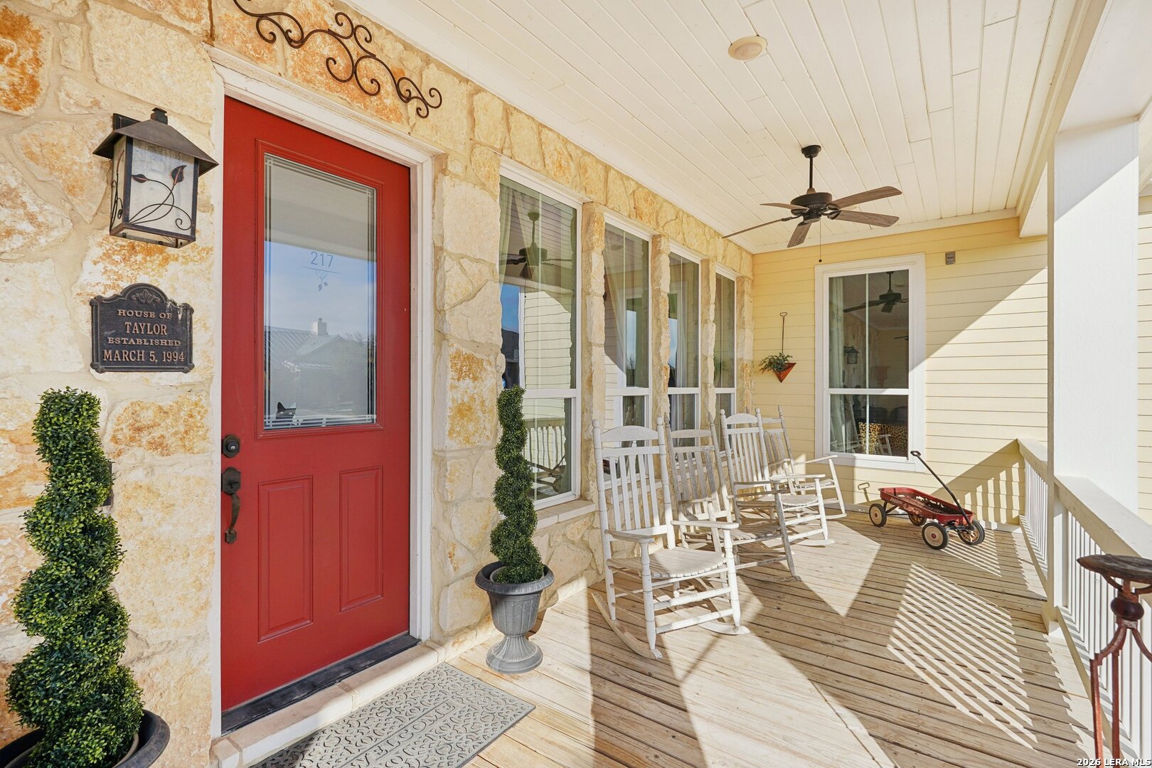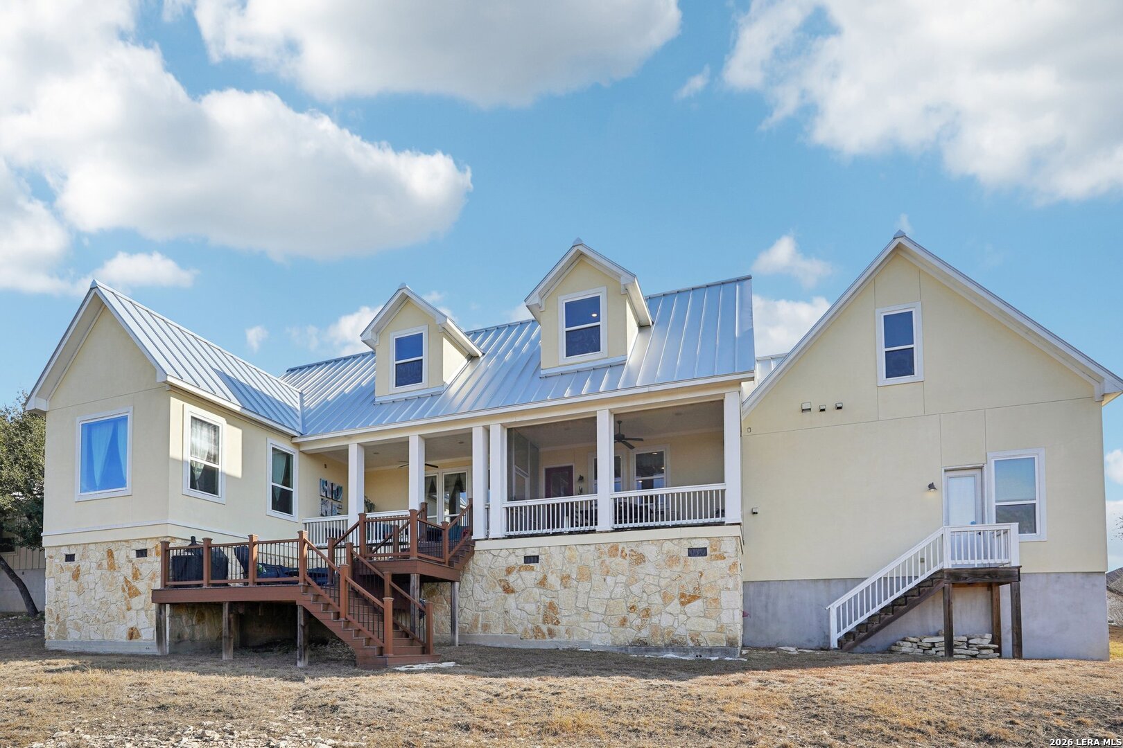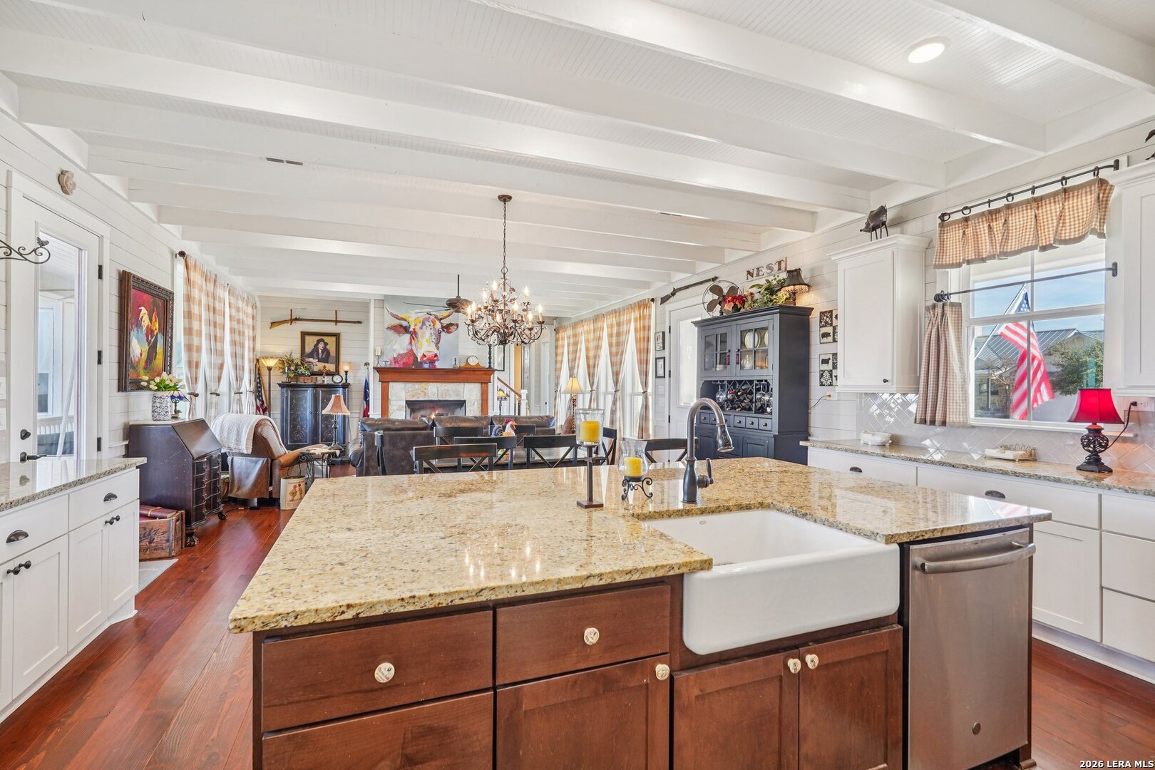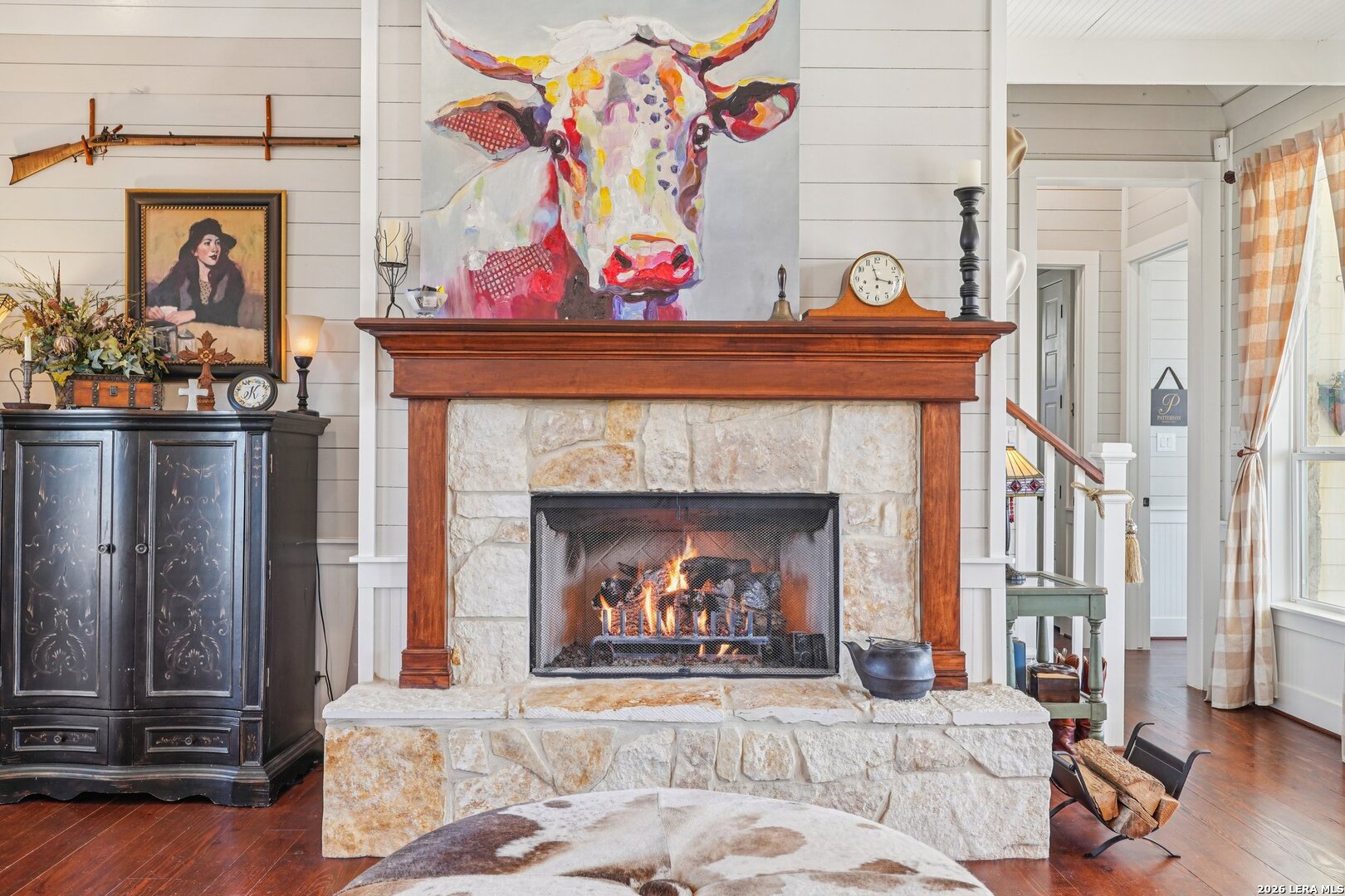 Light, bright, and full of character, this exceptional two-story home blends classic Americana style with Farmhouse style charm. An all-masonry exterior and standing-seam metal roof create striking curb appeal, while the elevated setting on a quiet cul-de-sac captures knockout views and cooling breezes. Covered front and back porches invite outdoor living and enhance the home's welcoming presence. Inside, wide-plank hardwood floors, tall doors, and high ceilings set a warm, timeless tone, with expansive windows throughout flooding the home with natural light. The living area is anchored by a beautiful stone gas fireplace, and the kitchen is designed for both function and style with an electric range, large island, granite countertops, and ample cabinetry. The primary suite features serene bedside views, a generous walk-in closet, and a spa-inspired bath with dual vanities plus a separate soaking tub and shower. Additional highlights include an oversized laundry room with abundant storage and an oversized two-car garage with a climate-controlled workshop or hobby room. Centrally located in Kerrville, this home offers timeless design, thoughtful functionality, and unforgettable views