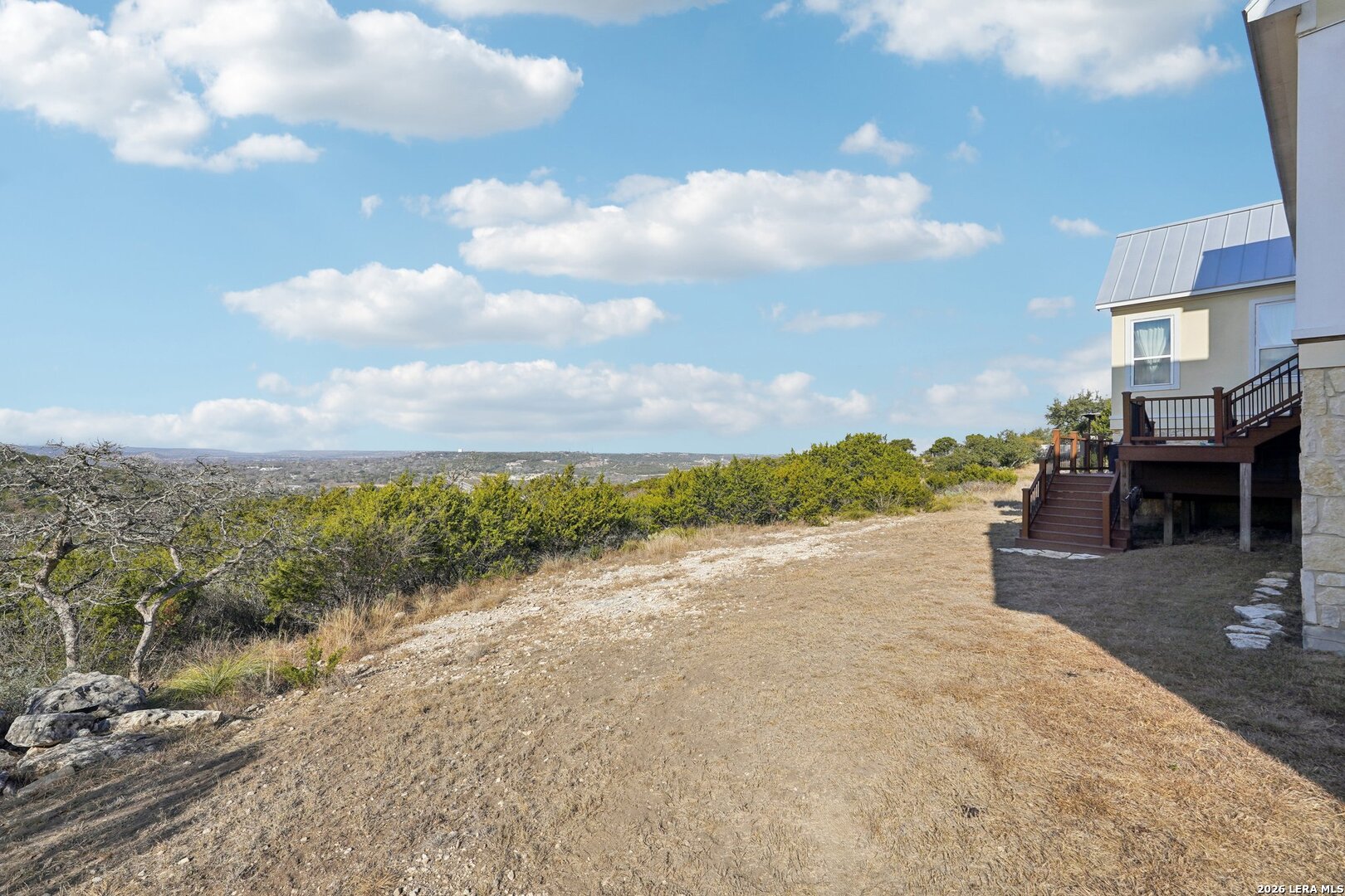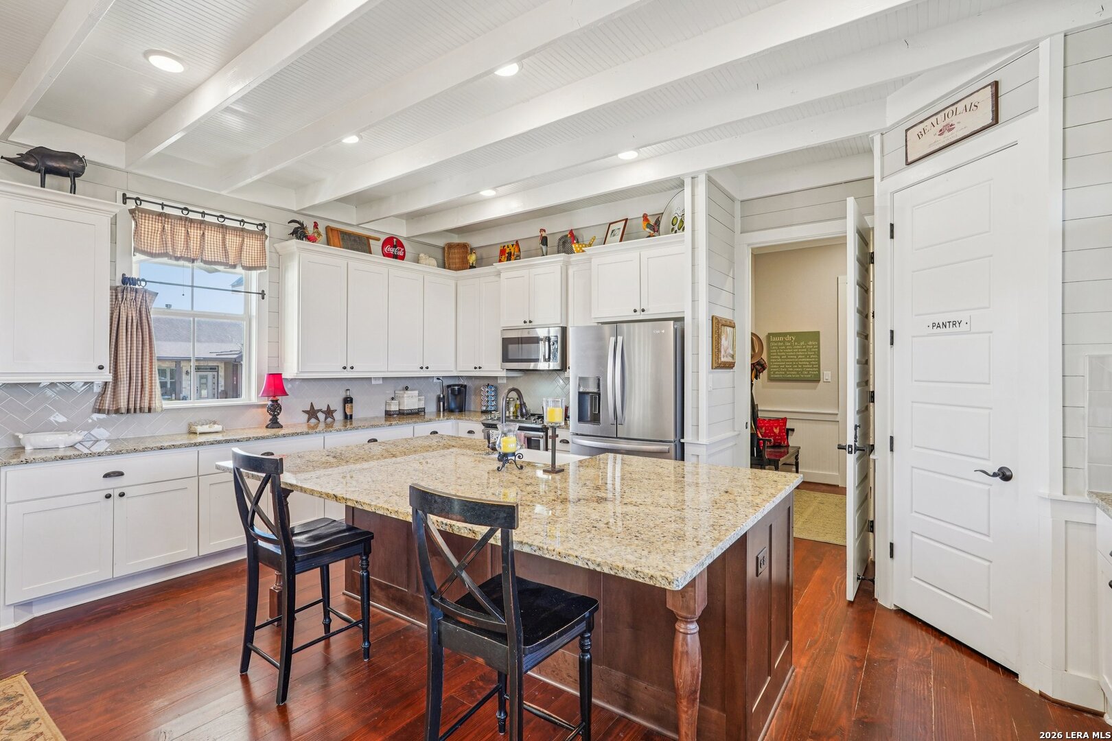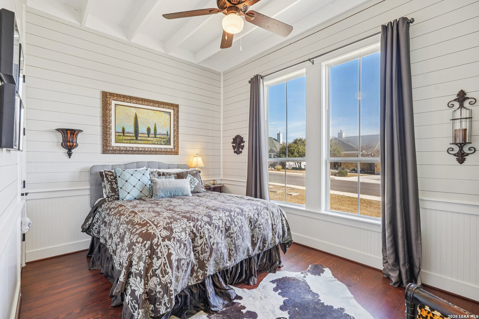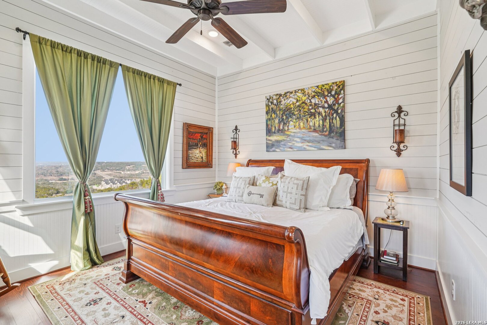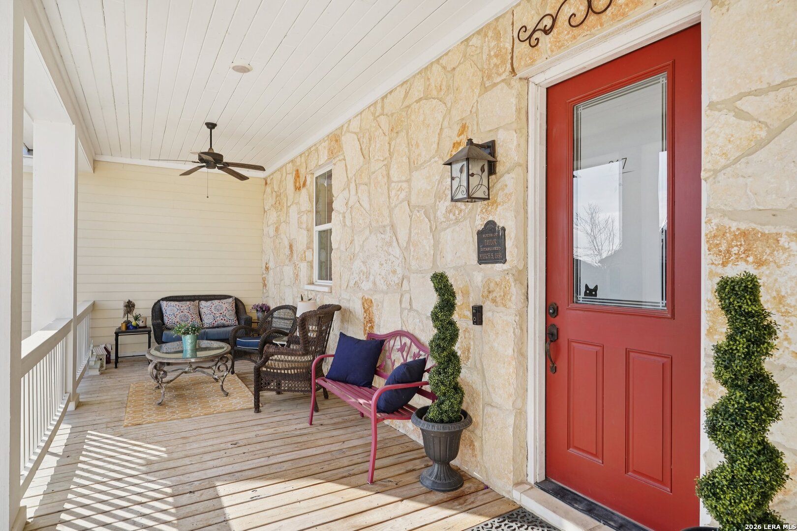 Light, bright, and full of character, this exceptional two-story home blends classic Americana style with Farmhouse style charm. An all-masonry exterior and standing-seam metal roof create striking curb appeal, while the elevated setting on a quiet cul-de-sac captures knockout views and cooling breezes. Covered front and back porches invite outdoor living and enhance the home's welcoming presence. Inside, wide-plank hardwood floors, tall doors, and high ceilings set a warm, timeless tone, with expansive windows throughout flooding the home with natural light. The living area is anchored by a beautiful stone gas fireplace, and the kitchen is designed for both function and style with an electric range, large island, granite countertops, and ample cabinetry. The primary suite features serene bedside views, a generous walk-in closet, and a spa-inspired bath with dual vanities plus a separate soaking tub and shower. Additional highlights include an oversized laundry room with abundant storage and an oversized two-car garage with a climate-controlled workshop or hobby room. Centrally located in Kerrville, this home offers timeless design, thoughtful functionality, and unforgettable views