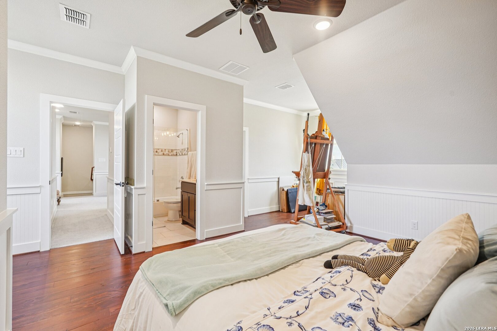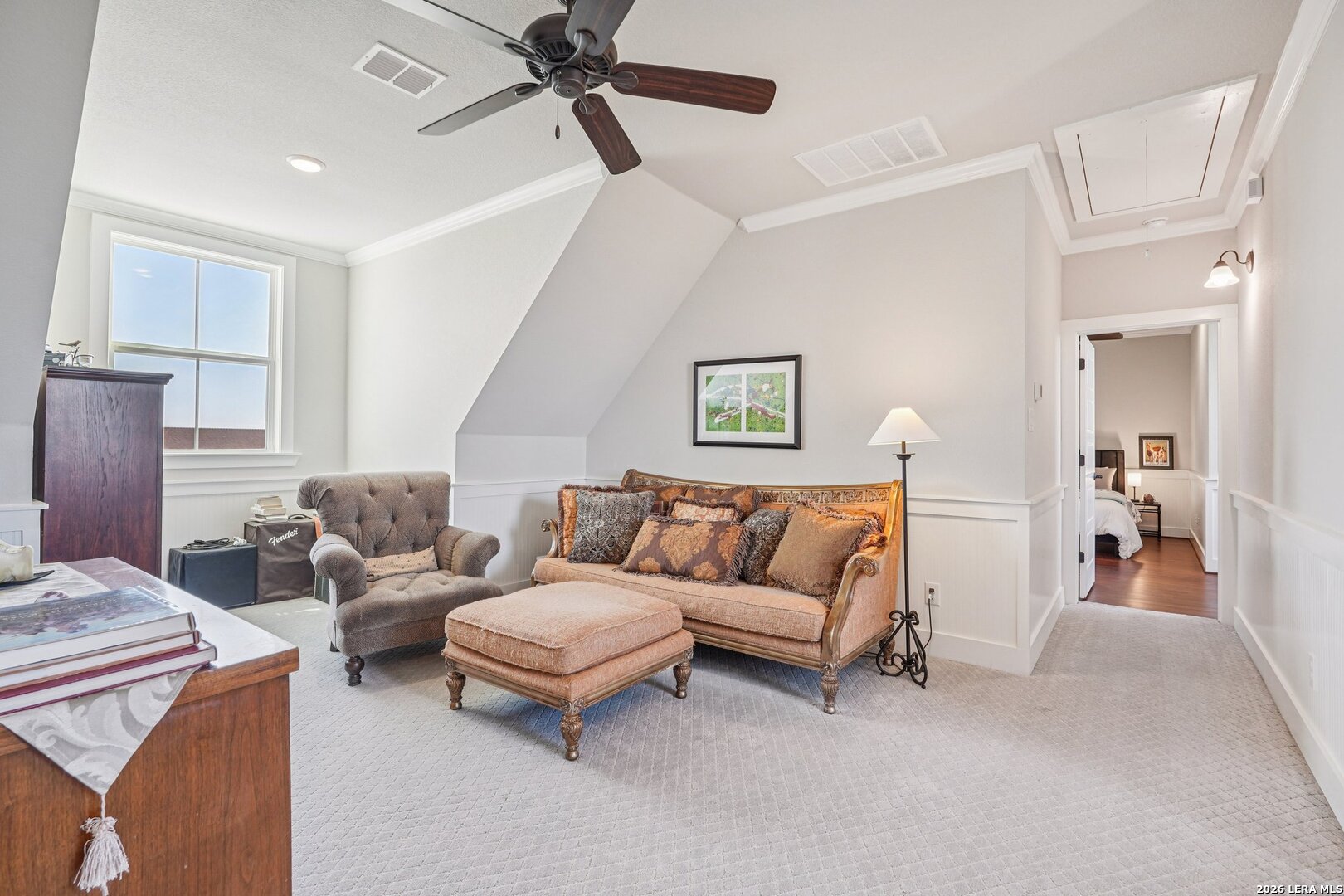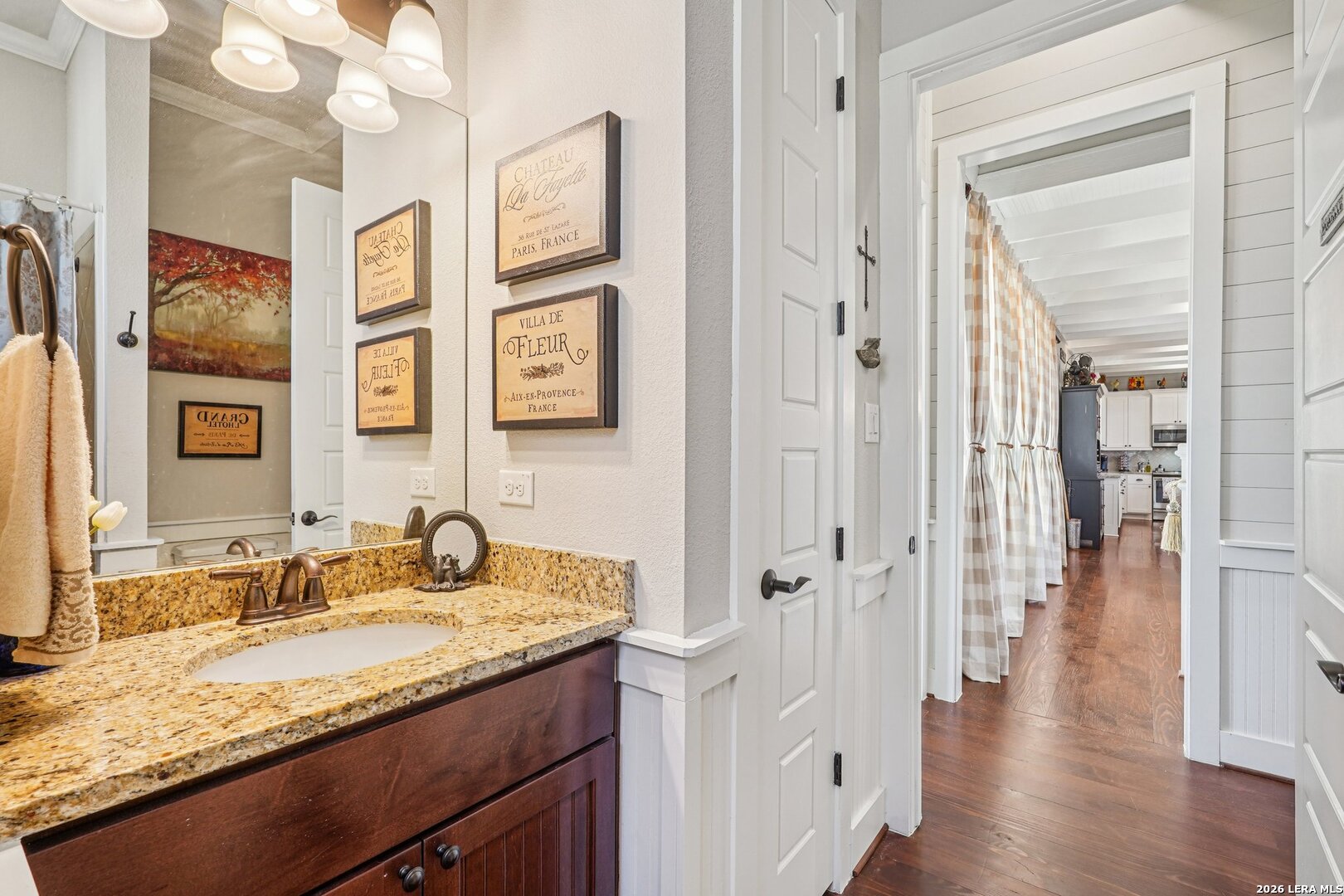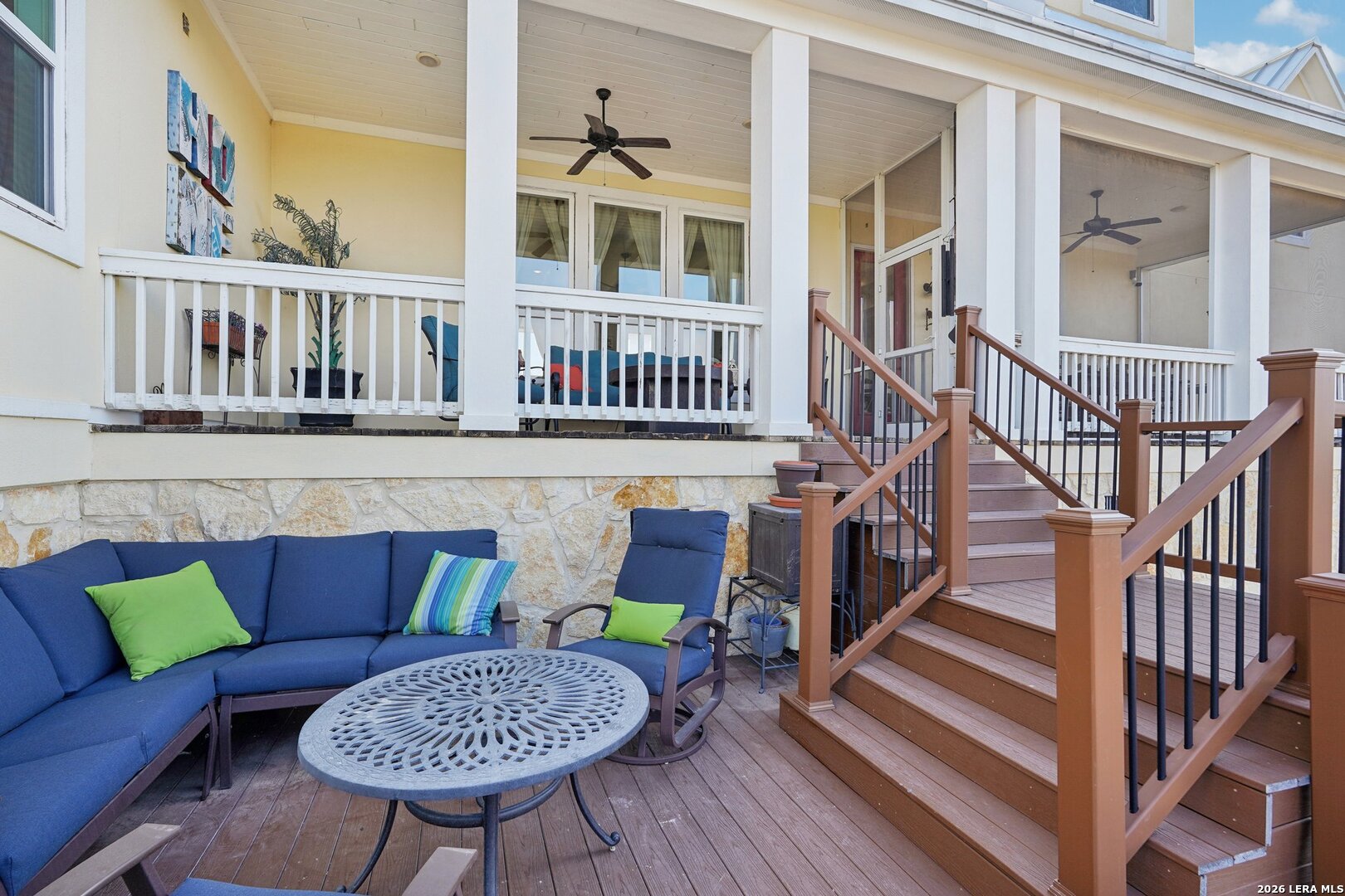 Light, bright, and full of character, this exceptional two-story home blends classic Americana style with Farmhouse style charm. An all-masonry exterior and standing-seam metal roof create striking curb appeal, while the elevated setting on a quiet cul-de-sac captures knockout views and cooling breezes. Covered front and back porches invite outdoor living and enhance the home's welcoming presence. Inside, wide-plank hardwood floors, tall doors, and high ceilings set a warm, timeless tone, with expansive windows throughout flooding the home with natural light. The living area is anchored by a beautiful stone gas fireplace, and the kitchen is designed for both function and style with an electric range, large island, granite countertops, and ample cabinetry. The primary suite features serene bedside views, a generous walk-in closet, and a spa-inspired bath with dual vanities plus a separate soaking tub and shower. Additional highlights include an oversized laundry room with abundant storage and an oversized two-car garage with a climate-controlled workshop or hobby room. Centrally located in Kerrville, this home offers timeless design, thoughtful functionality, and unforgettable views