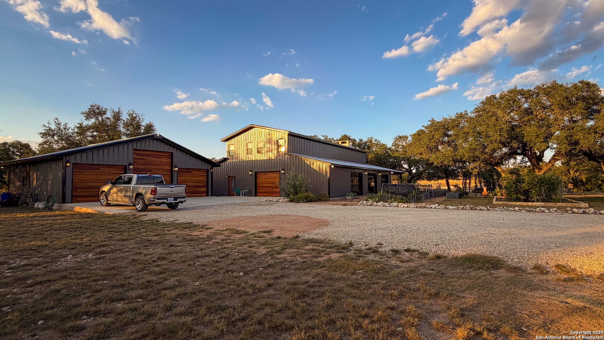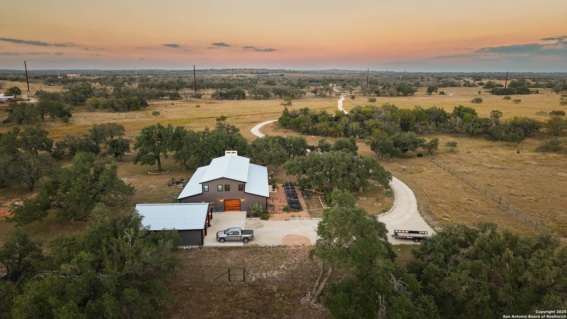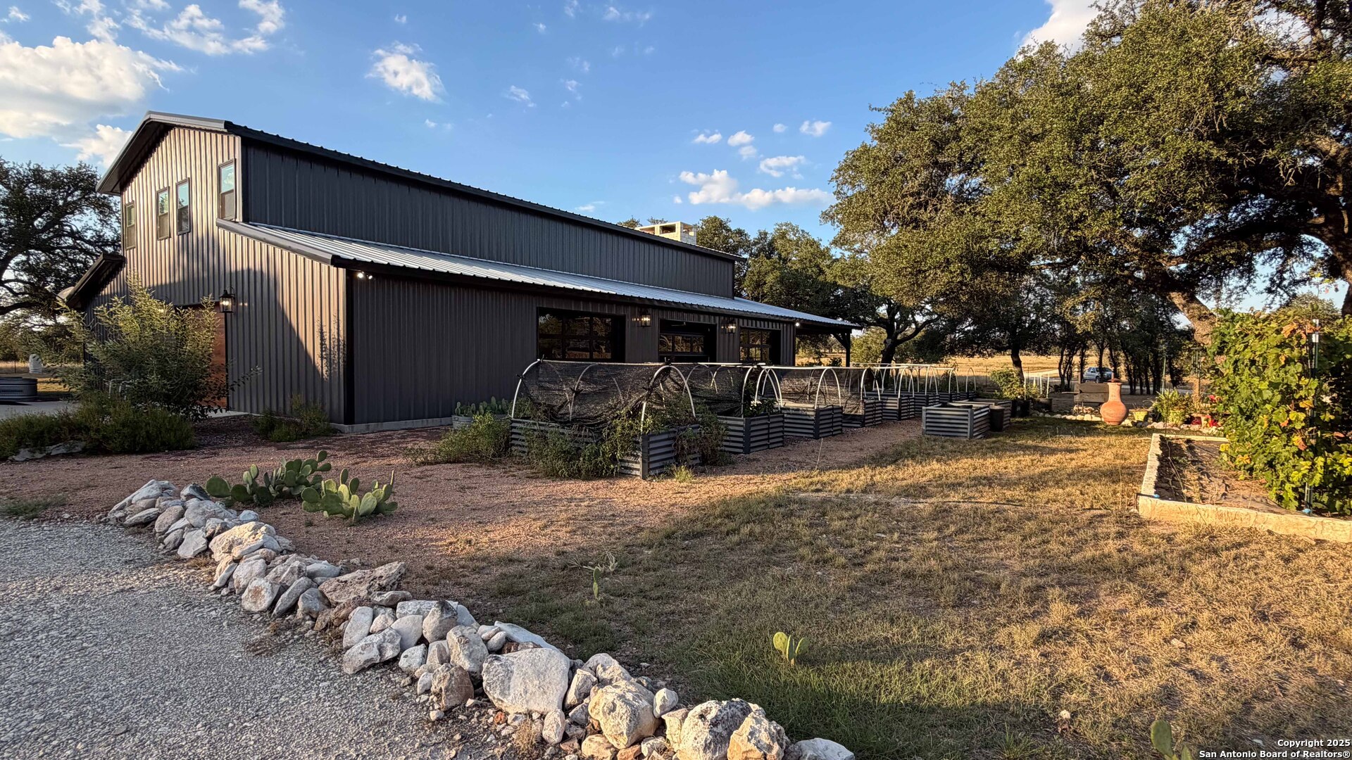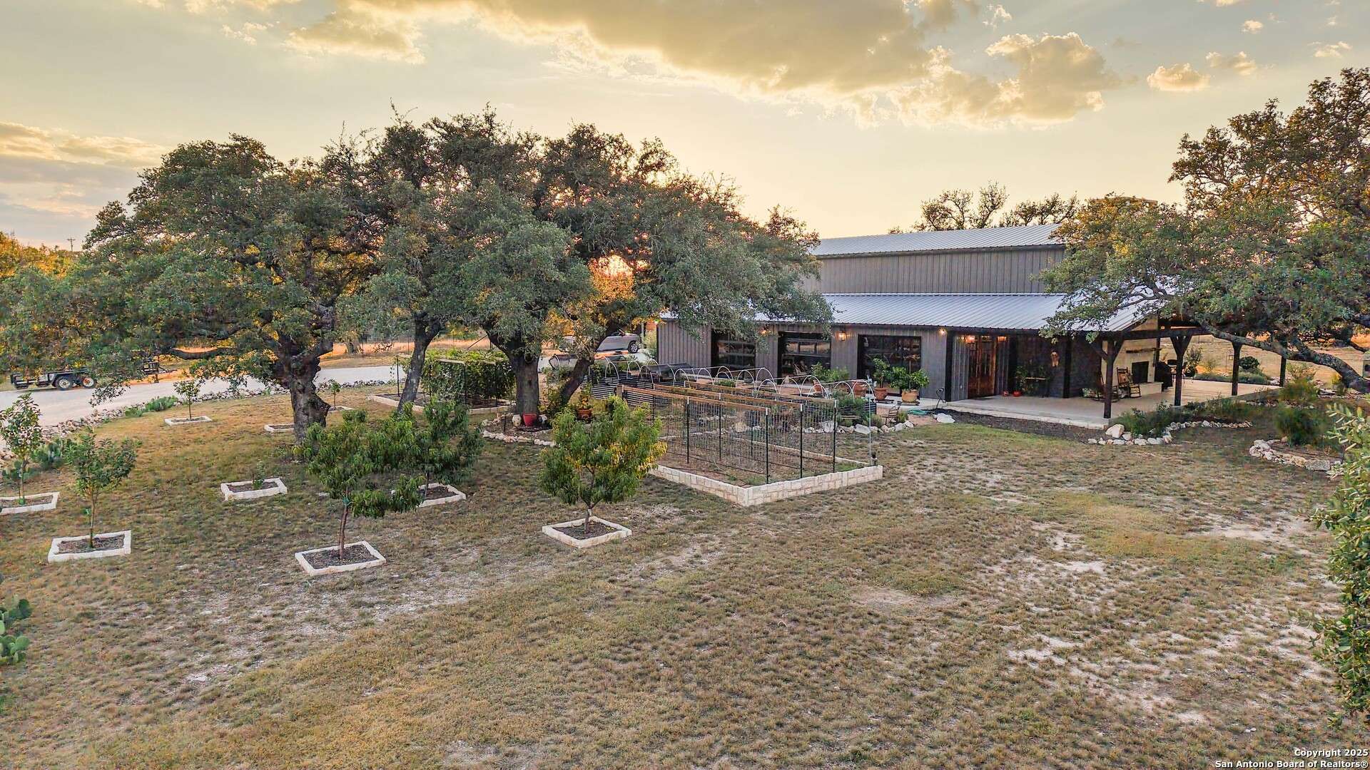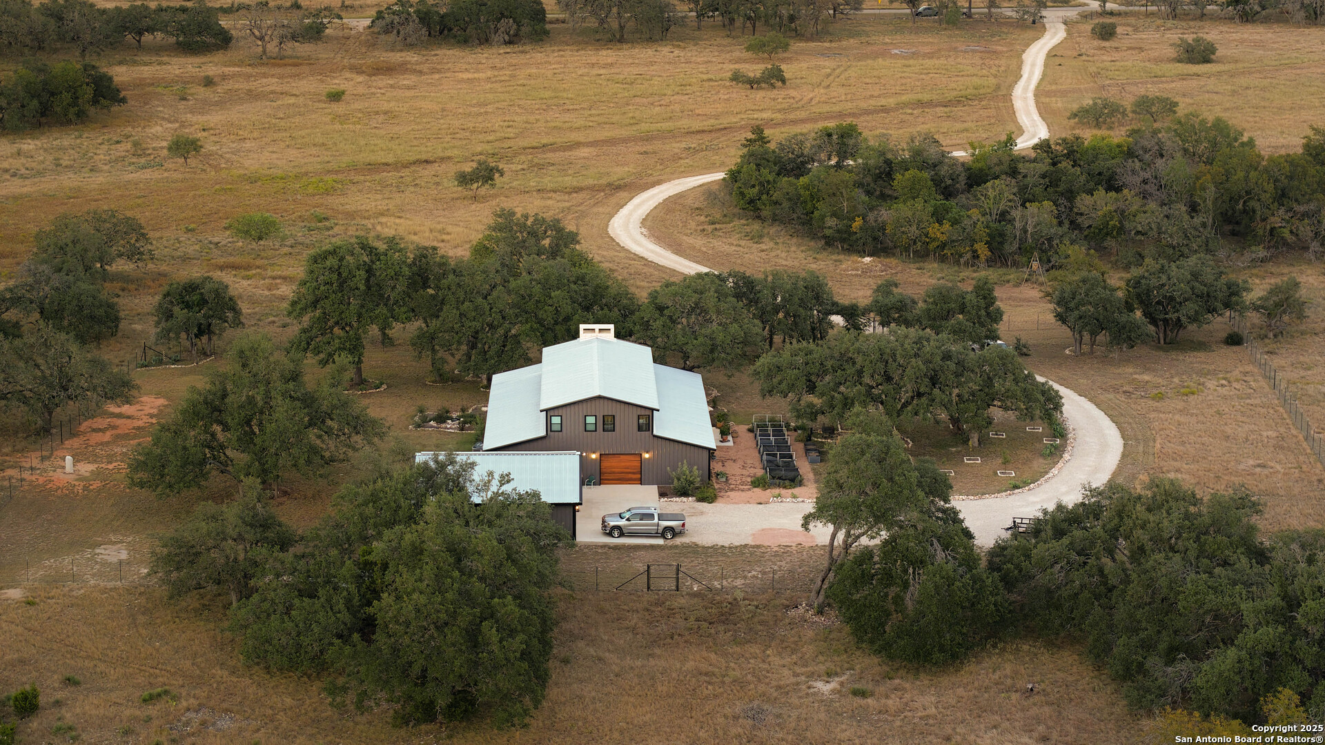 Located just south of Harper, this 20 acre Hill Country homestead offers a rare blend of privacy, thoughtful improvements, and exceptional access. The property sits minutes from the amenities, cafes, and grocery options in Harper, with Fredericksburg-one of Texas's premier destinations for dining, wineries, and shopping -just an easy drive to the east. Also a short drive to the south is access to Kerrville and the top ranked Peterson Health System. With no HOA fees, minimal deed restrictions, and 19 acres under ag valuation (plus a 1-acre deer-proof fenced homestead), the property delivers both freedom and long-term tax advantages. The land features gently rolling terrain, deep soils, mature oaks and cedar elms, and classic views of the dry Pedernales River country, known for its scenic limestone bluffs. The owners have established extensive native landscaping along with productive gardens and plantings, including ten above-ground planter boxes, two 20'x20' raised beds, multiple herb gardens, eighteen mature grape vines, and an orchard with fig, peach, apple, and pear trees. Water systems include a private well with a 1,350-gallon AquaScience holding tank plus a separate 2,500-gallon rainwater collection tank. The newly constructed home is built with durability and efficiency in mind, featuring all-metal siding and roofing, stick framing, blown-in insulation, insulated garage doors, an owned 250-gallon propane tank, and a 1,000-gallon septic system. Offering nearly 2,900 sq. ft. of heated and cooled space (5,200 sq. ft. under roof), the home includes concrete floors, ceilings ranging from 9' to 22', custom alder cabinetry, Whirlpool appliances, an oversized 12'x20' butler's pantry, and an open-concept design centered around a double-sided indoor/outdoor masonry fireplace. The downstairs primary suite features separate vanities, a large closet with washer/dryer, and an aging-in-place wet room. The home includes three bedrooms, two full baths, and two half baths, with ADA-friendly features such as 36" doors and accessible bathrooms. Two additional upstairs bedrooms and a 12'x21' flex room are served by a separate HVAC system and can be closed off when not in use. A standout element is the 14'x50' downstairs flex room-ideal as a greenhouse, den, or game room-with three insulated 10'x8' roll-up doors, drainage, and a sink area. The 54'x20' covered front porch, complete with the outdoor side of the masonry fireplace, creates an inviting space to enjoy sunrise views and wildlife. Beyond the home, a separate 36'x36' insulated garage includes three insulated roll-up doors, a workshop area, and full RV accommodations with 50-amp service, septic hookup, and freshwater connection. An additional 1,296 sq. ft. insulated barn with roll-up doors offers even more storage for equipment, vehicles, or recreational use. Two automated entry gates enhance privacy and convenience, and the property supports abundant native wildlife along with free-roaming exotics such as axis and blackbuck. This is a turnkey Hill Country homestead-quality construction, mature improvements, productive land, and unmatched access to both Harper and Fredericksburg-ready to enjoy from day one.