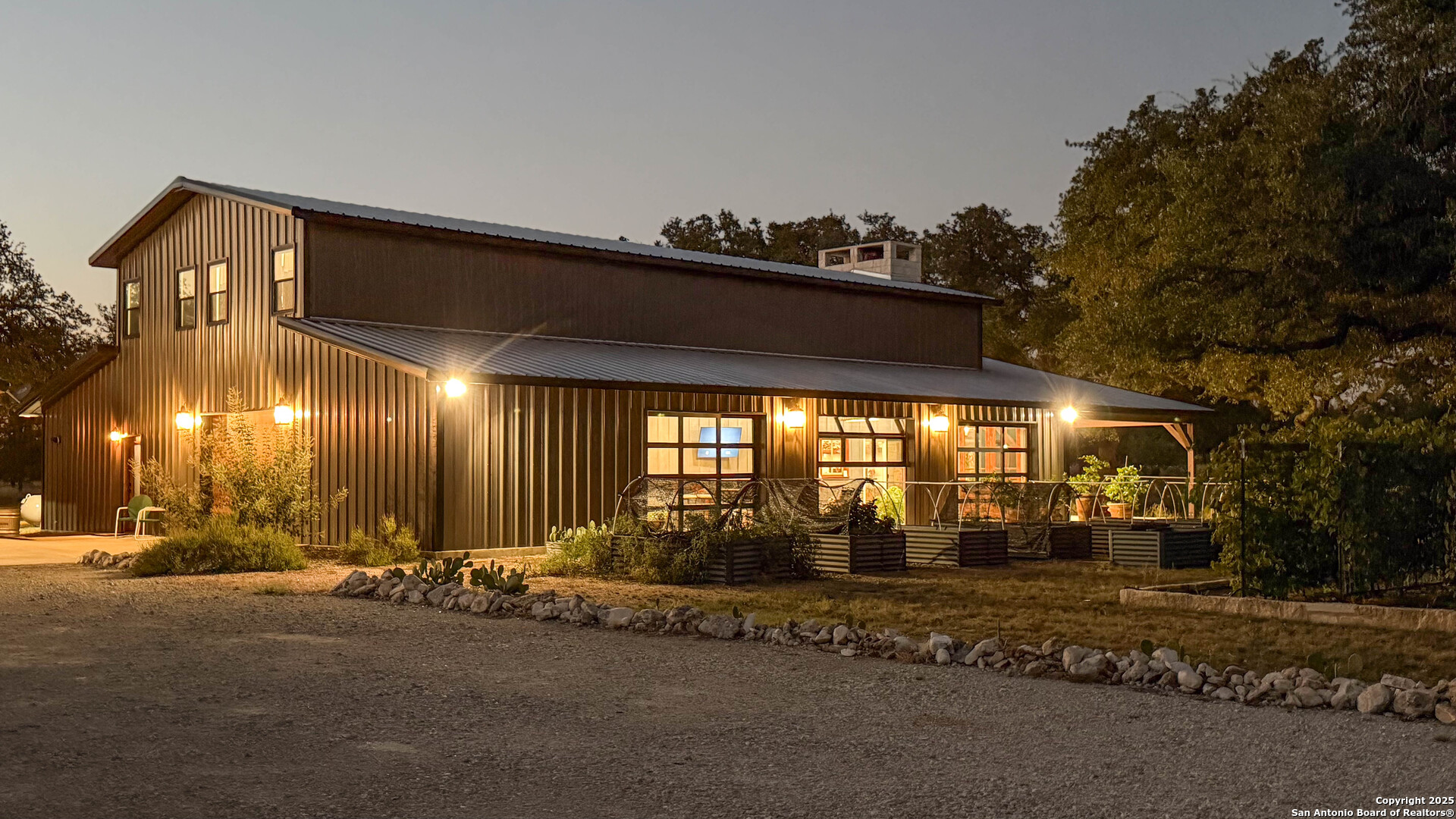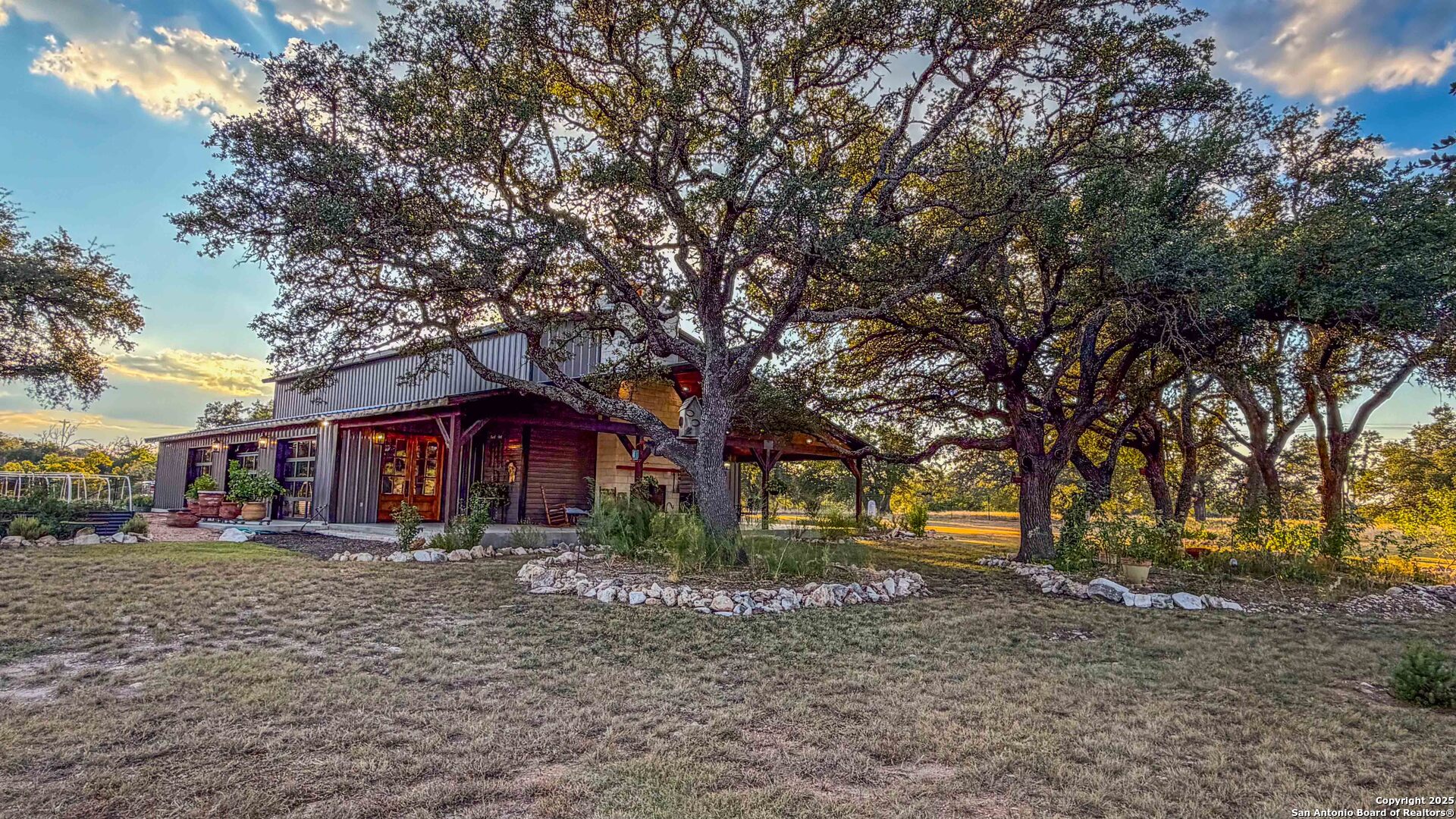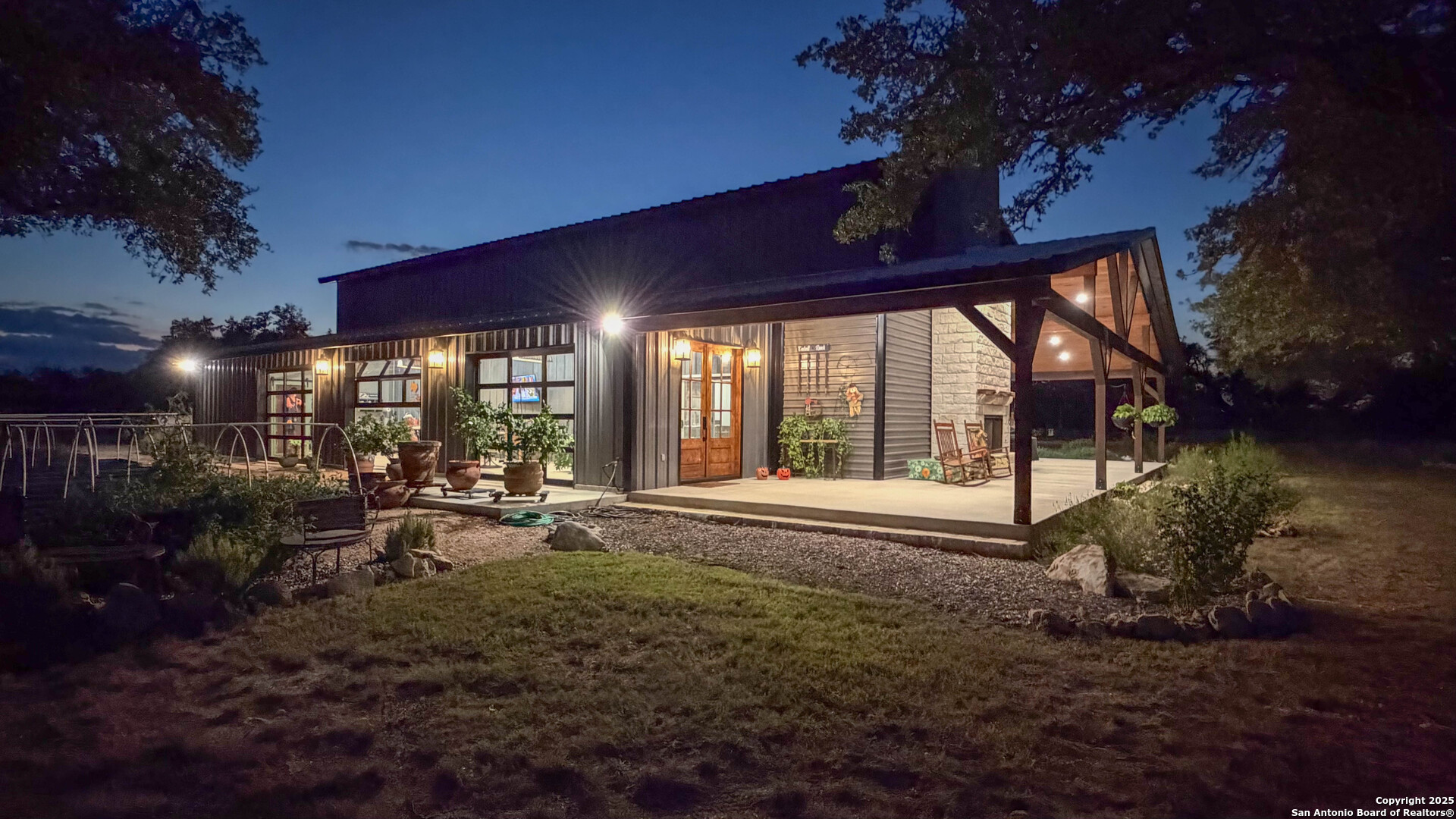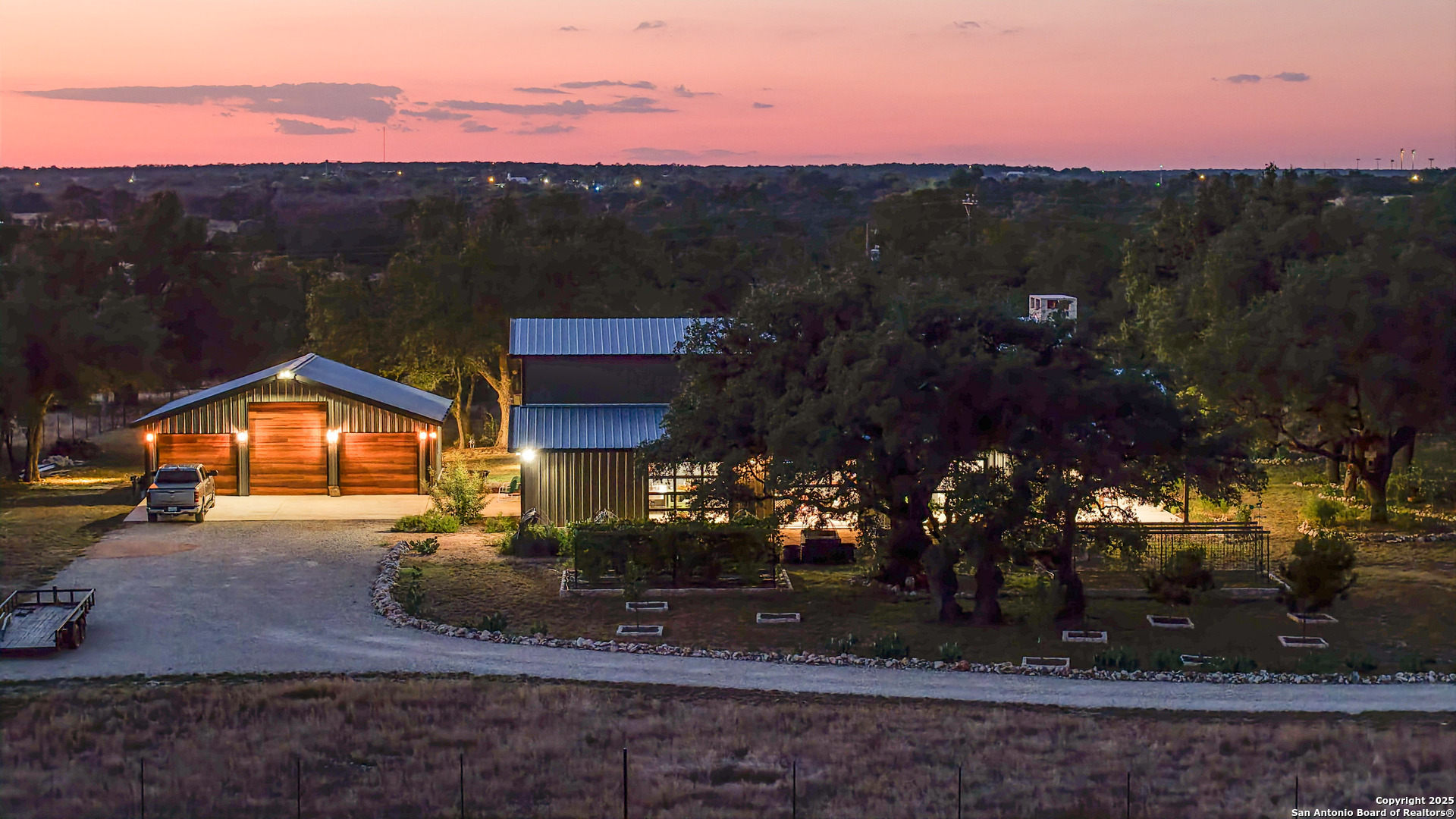 Located just south of Harper, this 20 acre Hill Country homestead offers a rare blend of privacy, thoughtful improvements, and exceptional access. The property sits minutes from the amenities, cafes, and grocery options in Harper, with Fredericksburg-one of Texas's premier destinations for dining, wineries, and shopping -just an easy drive to the east. Also a short drive to the south is access to Kerrville and the top ranked Peterson Health System. With no HOA fees, minimal deed restrictions, and 19 acres under ag valuation (plus a 1-acre deer-proof fenced homestead), the property delivers both freedom and long-term tax advantages. The land features gently rolling terrain, deep soils, mature oaks and cedar elms, and classic views of the dry Pedernales River country, known for its scenic limestone bluffs. The owners have established extensive native landscaping along with productive gardens and plantings, including ten above-ground planter boxes, two 20'x20' raised beds, multiple herb gardens, eighteen mature grape vines, and an orchard with fig, peach, apple, and pear trees. Water systems include a private well with a 1,350-gallon AquaScience holding tank plus a separate 2,500-gallon rainwater collection tank. The newly constructed home is built with durability and efficiency in mind, featuring all-metal siding and roofing, stick framing, blown-in insulation, insulated garage doors, an owned 250-gallon propane tank, and a 1,000-gallon septic system. Offering nearly 2,900 sq. ft. of heated and cooled space (5,200 sq. ft. under roof), the home includes concrete floors, ceilings ranging from 9' to 22', custom alder cabinetry, Whirlpool appliances, an oversized 12'x20' butler's pantry, and an open-concept design centered around a double-sided indoor/outdoor masonry fireplace. The downstairs primary suite features separate vanities, a large closet with washer/dryer, and an aging-in-place wet room. The home includes three bedrooms, two full baths, and two half baths, with ADA-friendly features such as 36" doors and accessible bathrooms. Two additional upstairs bedrooms and a 12'x21' flex room are served by a separate HVAC system and can be closed off when not in use. A standout element is the 14'x50' downstairs flex room-ideal as a greenhouse, den, or game room-with three insulated 10'x8' roll-up doors, drainage, and a sink area. The 54'x20' covered front porch, complete with the outdoor side of the masonry fireplace, creates an inviting space to enjoy sunrise views and wildlife. Beyond the home, a separate 36'x36' insulated garage includes three insulated roll-up doors, a workshop area, and full RV accommodations with 50-amp service, septic hookup, and freshwater connection. An additional 1,296 sq. ft. insulated barn with roll-up doors offers even more storage for equipment, vehicles, or recreational use. Two automated entry gates enhance privacy and convenience, and the property supports abundant native wildlife along with free-roaming exotics such as axis and blackbuck. This is a turnkey Hill Country homestead-quality construction, mature improvements, productive land, and unmatched access to both Harper and Fredericksburg-ready to enjoy from day one.