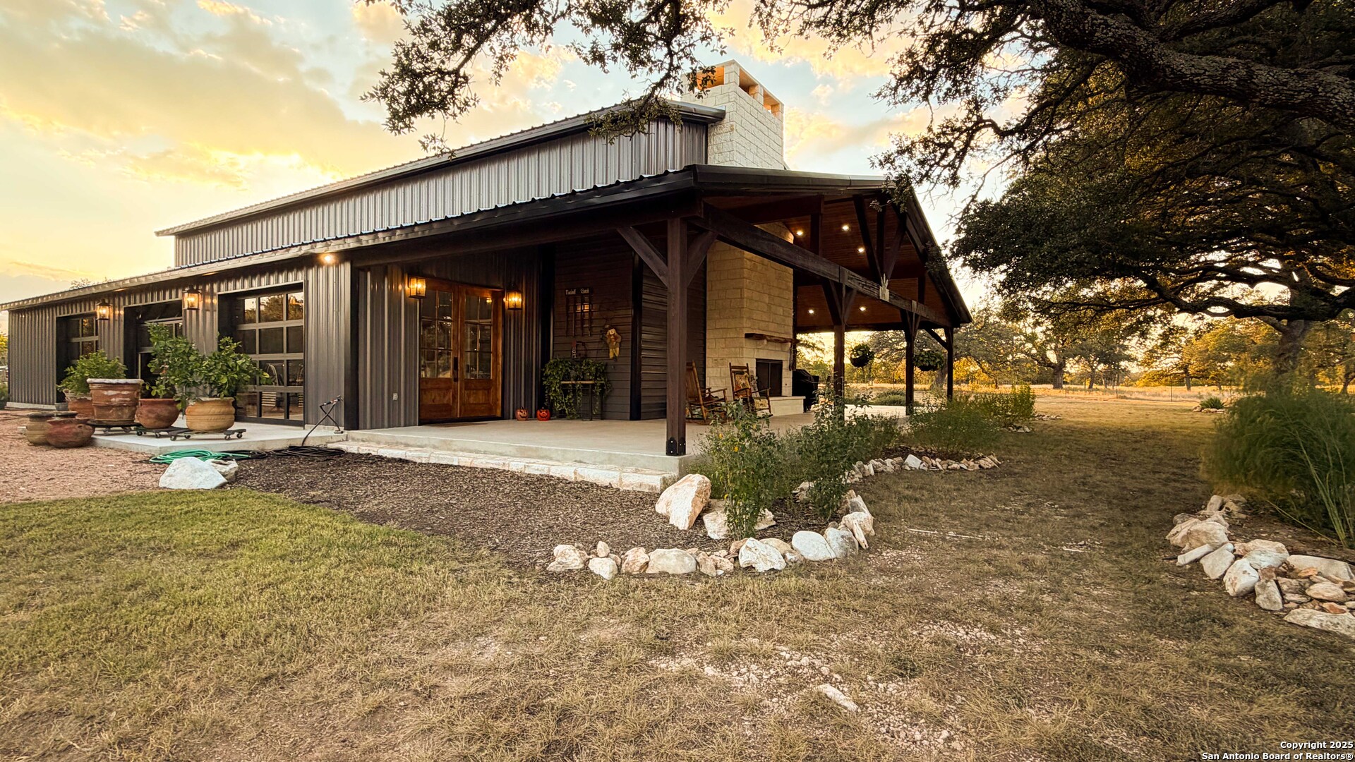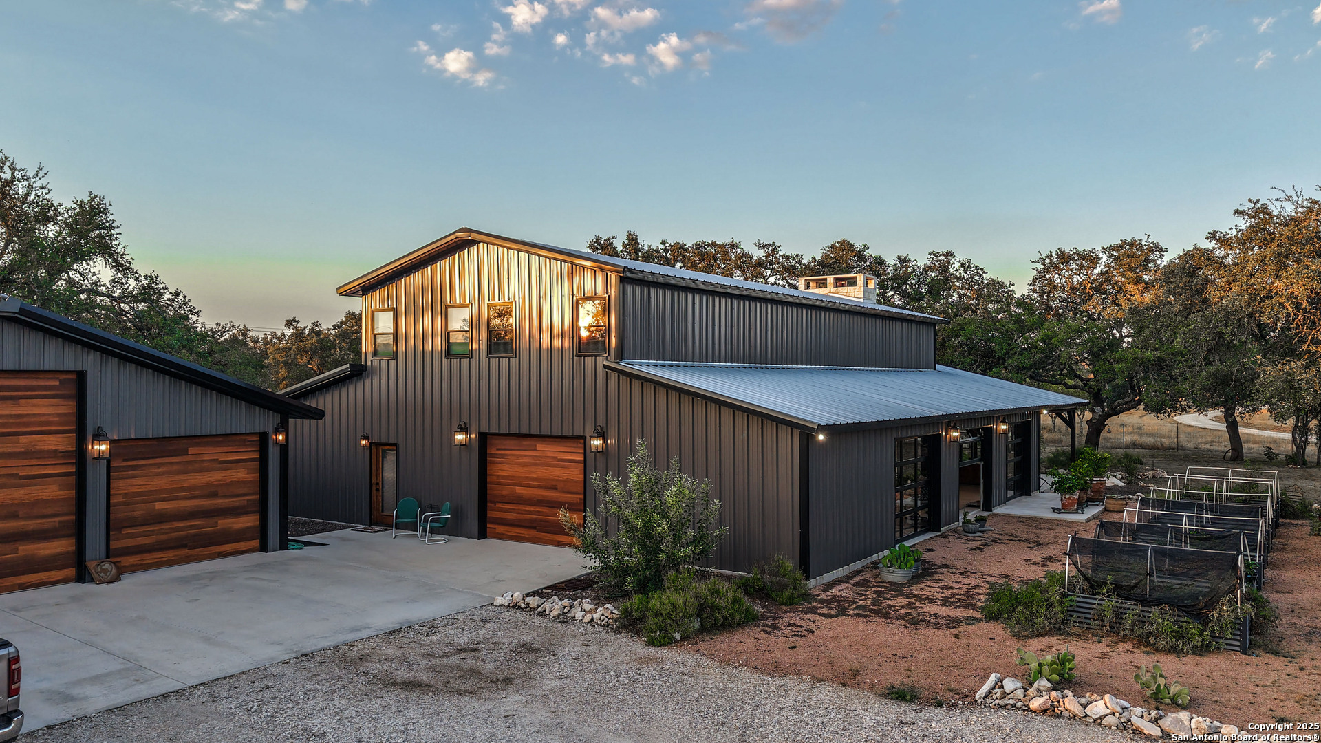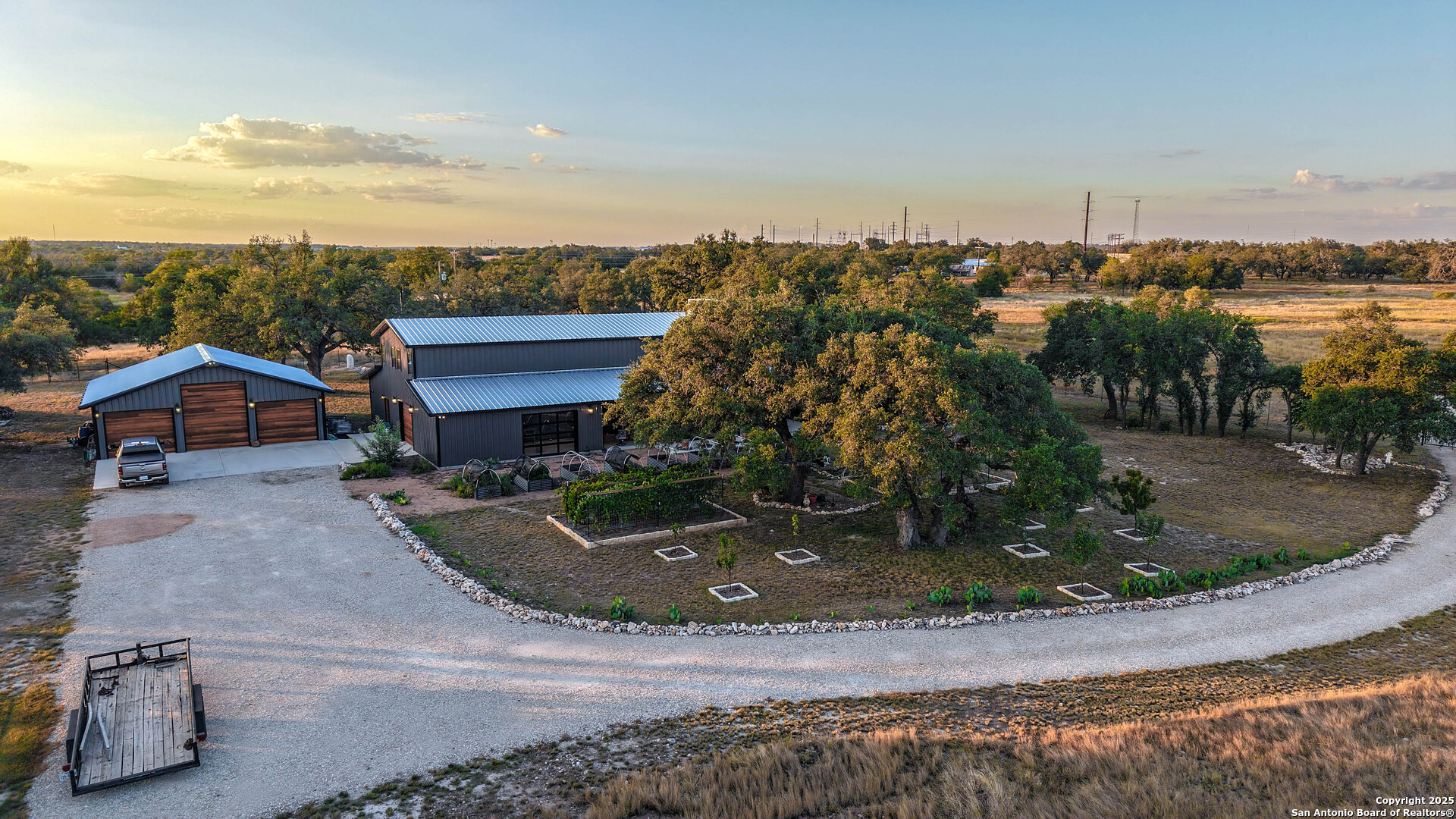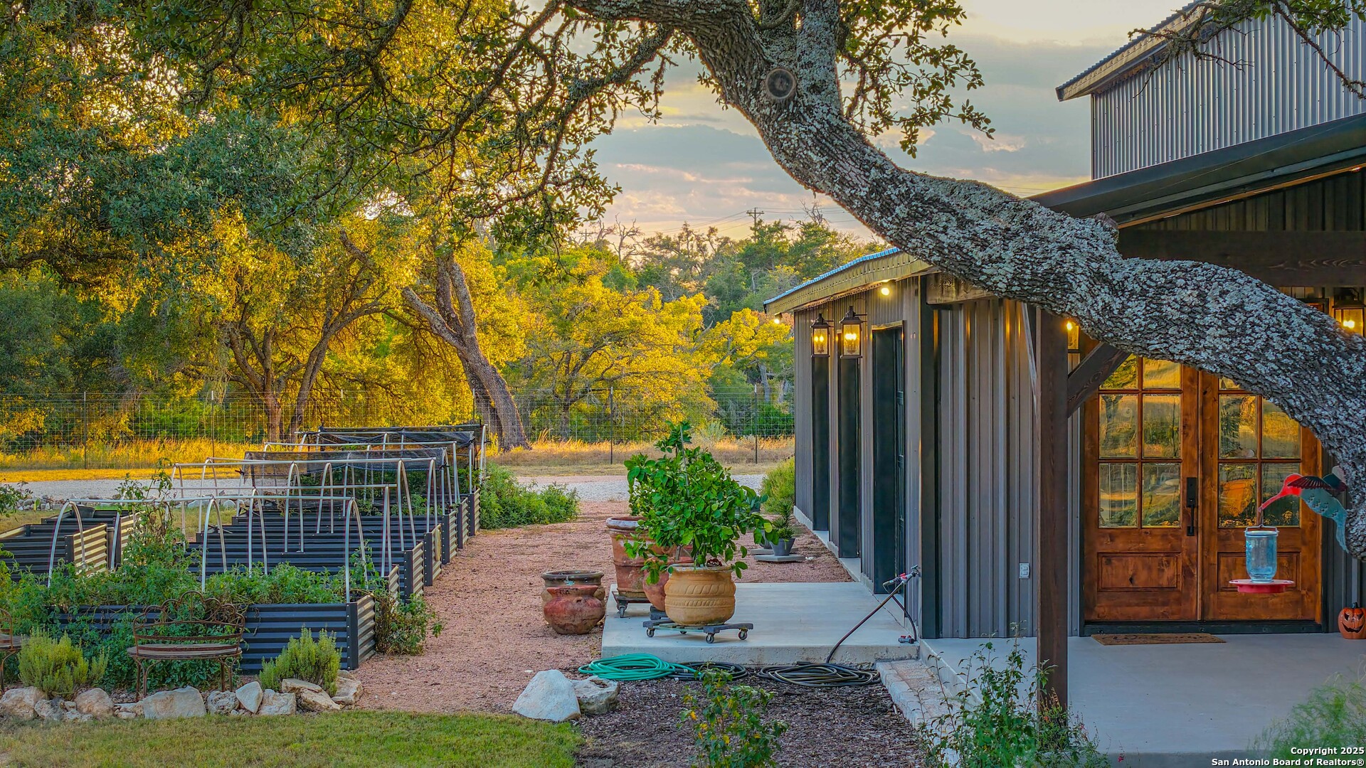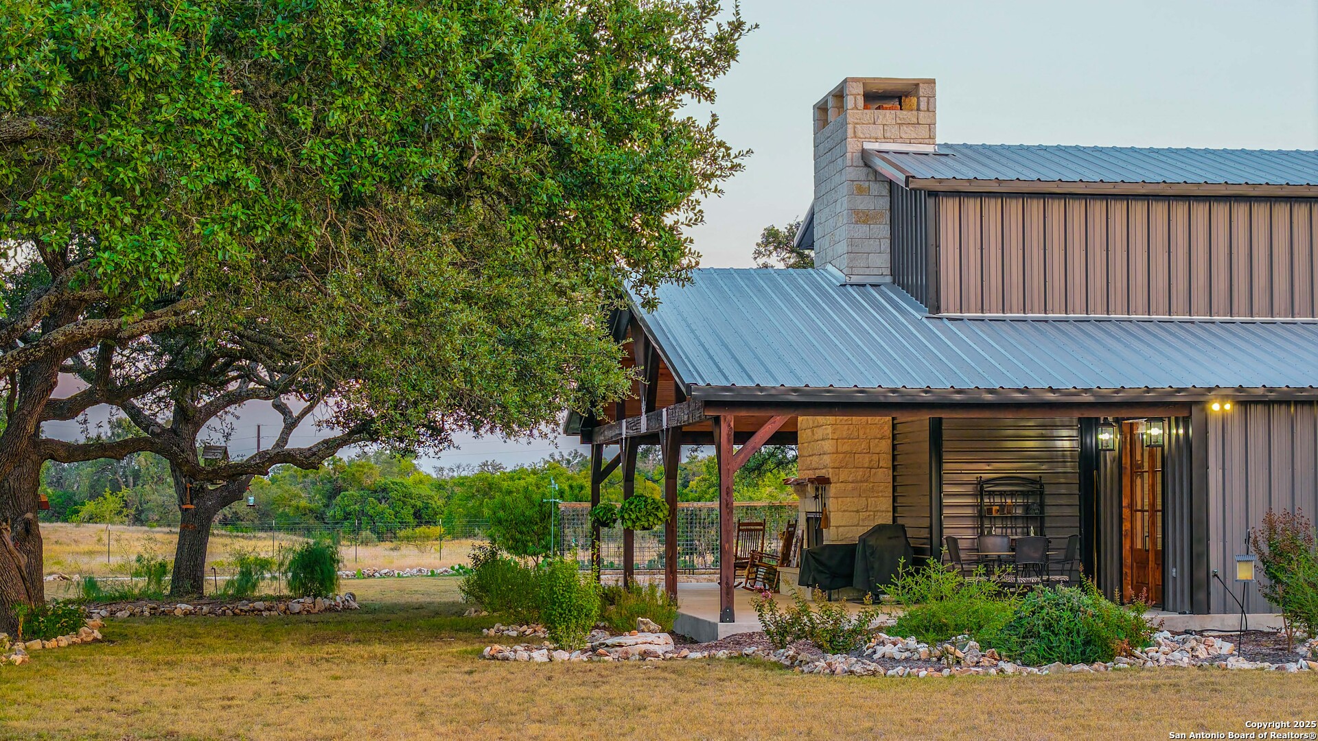 Located just south of Harper, this 20 acre Hill Country homestead offers a rare blend of privacy, thoughtful improvements, and exceptional access. The property sits minutes from the amenities, cafes, and grocery options in Harper, with Fredericksburg-one of Texas's premier destinations for dining, wineries, and shopping -just an easy drive to the east. Also a short drive to the south is access to Kerrville and the top ranked Peterson Health System. With no HOA fees, minimal deed restrictions, and 19 acres under ag valuation (plus a 1-acre deer-proof fenced homestead), the property delivers both freedom and long-term tax advantages. The land features gently rolling terrain, deep soils, mature oaks and cedar elms, and classic views of the dry Pedernales River country, known for its scenic limestone bluffs. The owners have established extensive native landscaping along with productive gardens and plantings, including ten above-ground planter boxes, two 20'x20' raised beds, multiple herb gardens, eighteen mature grape vines, and an orchard with fig, peach, apple, and pear trees. Water systems include a private well with a 1,350-gallon AquaScience holding tank plus a separate 2,500-gallon rainwater collection tank. The newly constructed home is built with durability and efficiency in mind, featuring all-metal siding and roofing, stick framing, blown-in insulation, insulated garage doors, an owned 250-gallon propane tank, and a 1,000-gallon septic system. Offering nearly 2,900 sq. ft. of heated and cooled space (5,200 sq. ft. under roof), the home includes concrete floors, ceilings ranging from 9' to 22', custom alder cabinetry, Whirlpool appliances, an oversized 12'x20' butler's pantry, and an open-concept design centered around a double-sided indoor/outdoor masonry fireplace. The downstairs primary suite features separate vanities, a large closet with washer/dryer, and an aging-in-place wet room. The home includes three bedrooms, two full baths, and two half baths, with ADA-friendly features such as 36" doors and accessible bathrooms. Two additional upstairs bedrooms and a 12'x21' flex room are served by a separate HVAC system and can be closed off when not in use. A standout element is the 14'x50' downstairs flex room-ideal as a greenhouse, den, or game room-with three insulated 10'x8' roll-up doors, drainage, and a sink area. The 54'x20' covered front porch, complete with the outdoor side of the masonry fireplace, creates an inviting space to enjoy sunrise views and wildlife. Beyond the home, a separate 36'x36' insulated garage includes three insulated roll-up doors, a workshop area, and full RV accommodations with 50-amp service, septic hookup, and freshwater connection. An additional 1,296 sq. ft. insulated barn with roll-up doors offers even more storage for equipment, vehicles, or recreational use. Two automated entry gates enhance privacy and convenience, and the property supports abundant native wildlife along with free-roaming exotics such as axis and blackbuck. This is a turnkey Hill Country homestead-quality construction, mature improvements, productive land, and unmatched access to both Harper and Fredericksburg-ready to enjoy from day one.