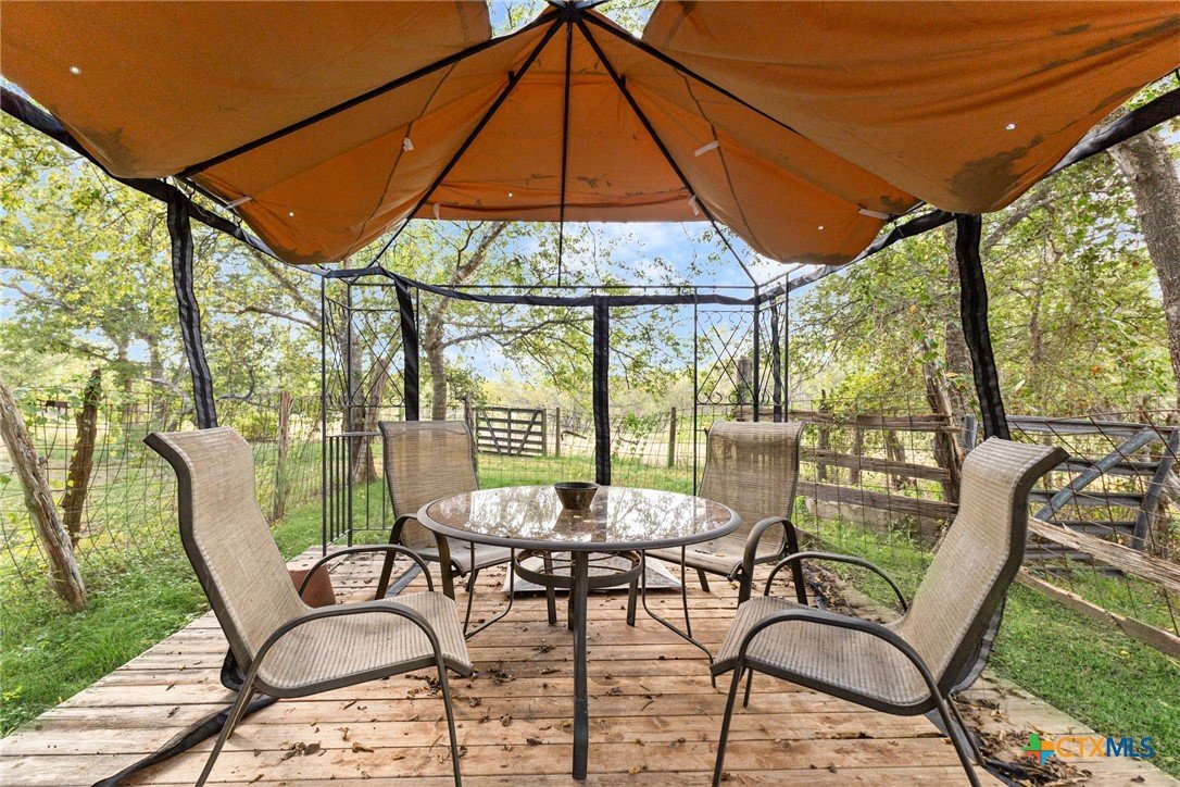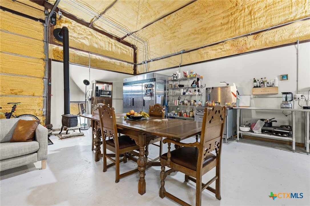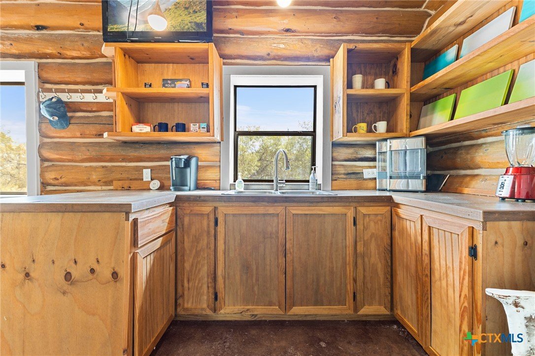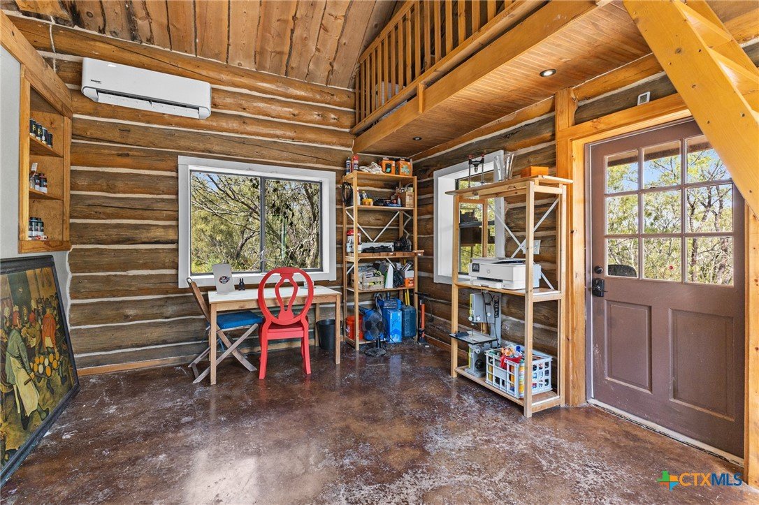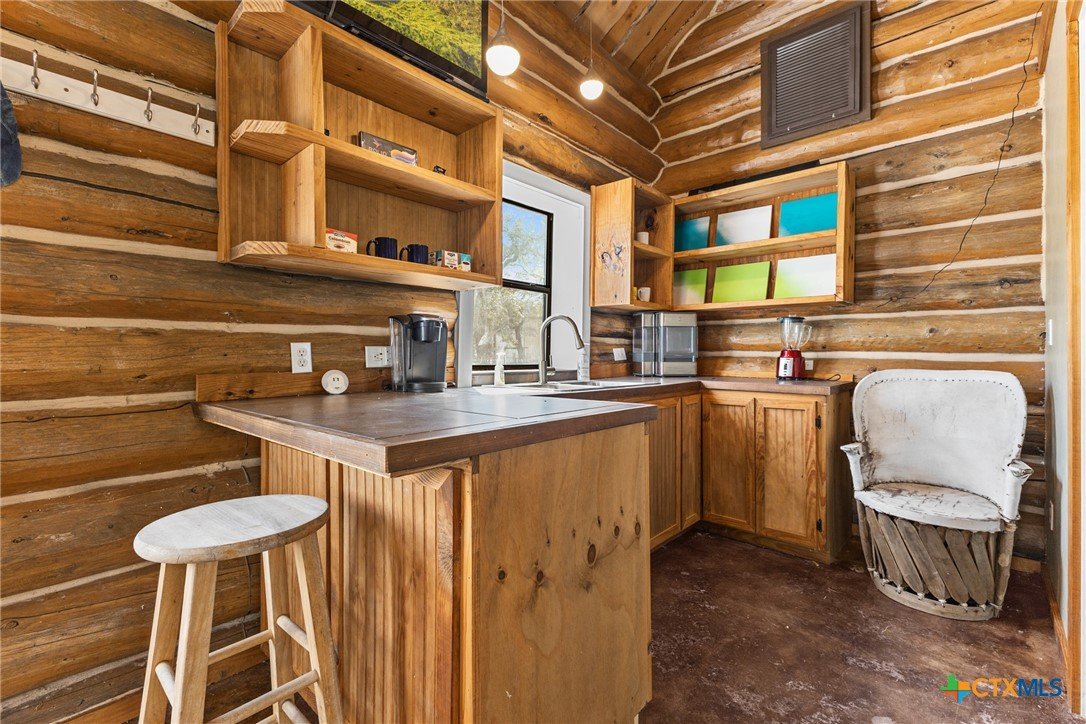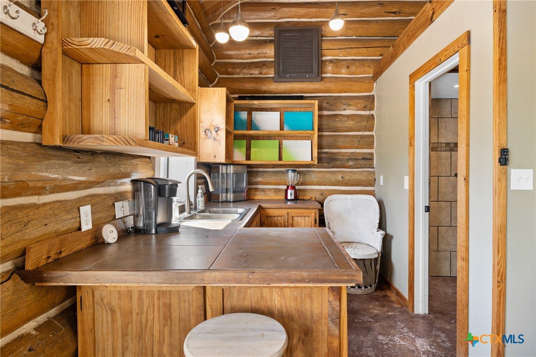 Escape the hustle and embrace simple living on this beautiful 10.05 acre property, ideal for those seeking privacy, space, functionality and opportunity. Tucked away in a grove of old mesquite and live oak trees, this land features a 2,000 sq ft, 1 bedroom, 1 bath barndominium full of rustic character and modern simplicity. With a cozy 550 sq ft tiny log cabin, offering potential for guest quarters, rental income, or a separate studio space. The potential does not stop there! With a rifle range, chicken coop with a solar powered automatic door, large 33 ft above ground pool, fenced garden, hunting blind with an outhouse, off-grid well water system with a salt based water softener, two storage sheds, recently installed aerobic plumbing field, and covered carport you can easily enjoy a fun and sustainable lifestyle. The fenced property has a homestead and ag exemption to help keep lower property taxes! The yard garden also offers peach and pear trees, asparagus, tomatoes, thyme and rosemary with room to grow much more. The open air barndominium with vaulted ceilings also boasts a five-star gourmet, commercial kitchen experience with stainless steel large 3-tier fridge, gas/oven range, and 3-tier sink with an ice machine outside. Enjoy a walk in shower with two triple shower heads complete with rain water, hand held and body faucet alongside a heated towel rack. Whether you’re looking to homestead, invest, or enjoy a more sustainable lifestyle, this property offers flexibility and charm to be a family compound, brewery, and much more. The possibilities here are as big as the Texas sky!