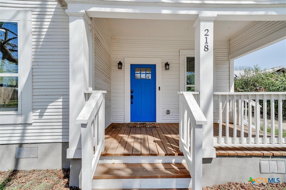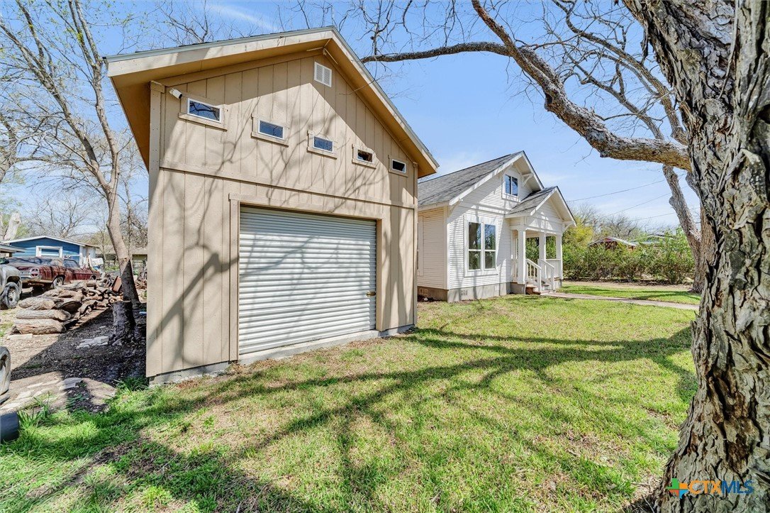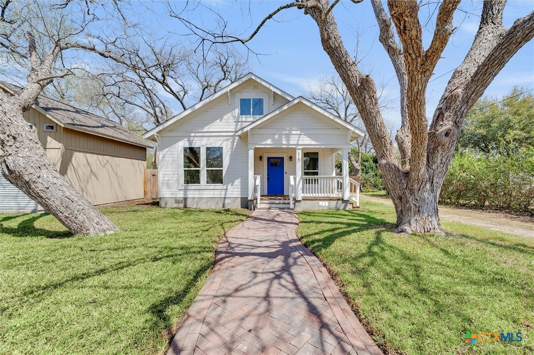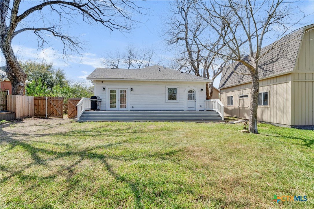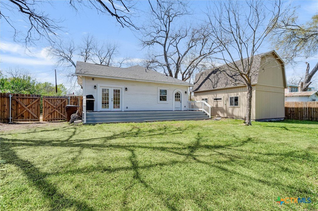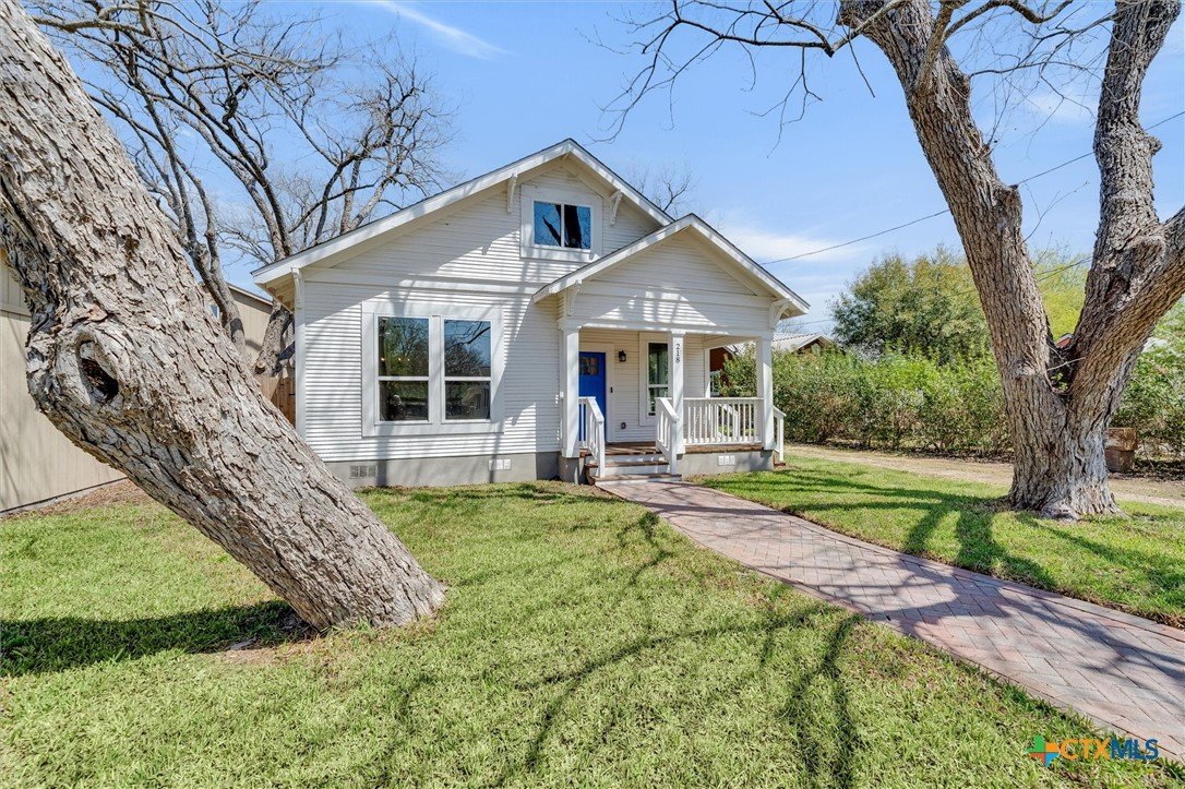 Nestled in the heart of Lockhart, this enchanting 1925 Craftsman/Farmhouse blends historic charm with modern updates. The home’s inviting white exterior, shaded by towering pecan trees, welcomes you with a lovely front porch—perfect for sipping sweet tea and enjoying the Texas breeze. Inside, original hardwoods and exposed shiplap walls highlight the home’s character, while high ceilings, recessed lighting, and thoughtful renovations create a bright, airy atmosphere. The fully remodeled kitchen is a chef’s dream, featuring custom white cabinets, a mosaic tile backsplash, stainless steel appliances, floating shelves, and a wine refrigerator nestled in the island. A charming Dutch door in the laundry room leads to the backyard, blending function and style. The primary suite is a serene retreat, with original shiplap ceilings, French doors to the backyard, and a spacious walk-in closet with built-in shelving. The en suite bathroom exudes vintage elegance with dual vanities, a walk-in shower, and classic hex and penny tile. Two additional bedrooms share a beautifully appointed hallway bathroom, complete with intricate marble and porcelain tilework. Outside, a sprawling 32’ back deck runs the length of the home, overlooking a huge, private yard. Two impressive workshops offer endless possibilities—the first (14’x20’) features a roll-up garage door and a concrete slab, while the second (16’x24’) includes a loft with stairs and double doors for easy access. Just minutes from Lockhart’s historic square, this home offers walkable convenience without an HOA. Move-in ready and oozing charm, this is a rare opportunity to own a piece of Texas history with all the comforts of modern living.