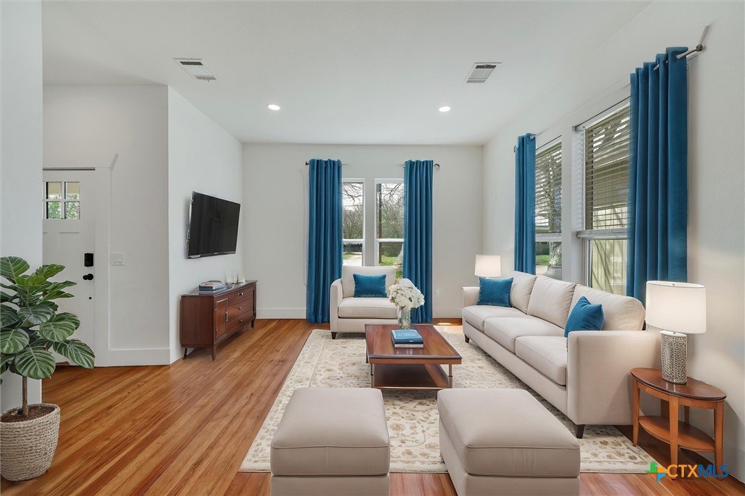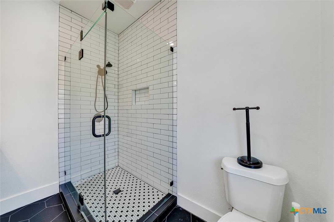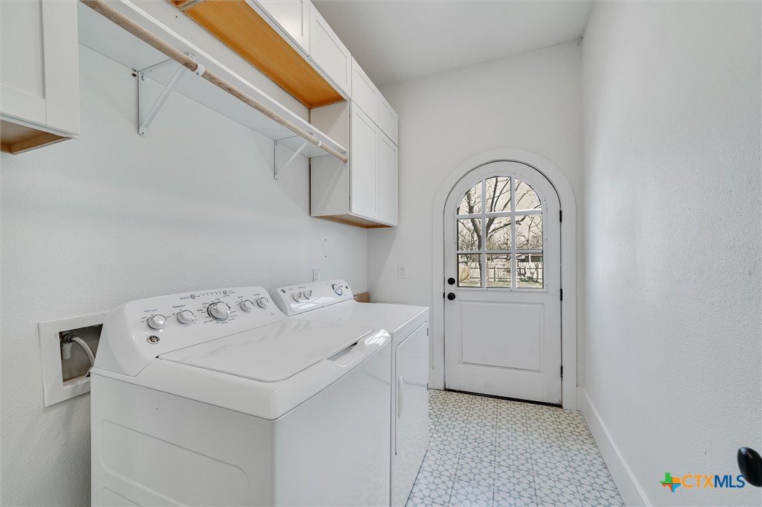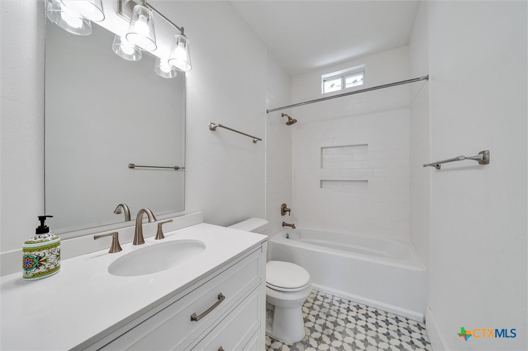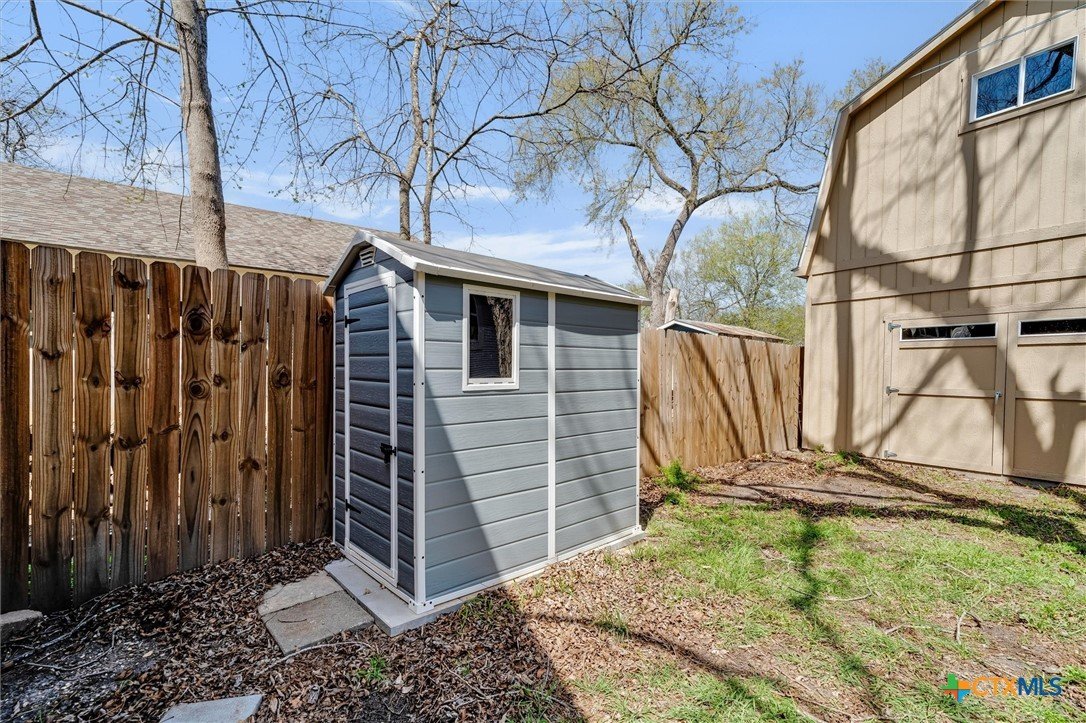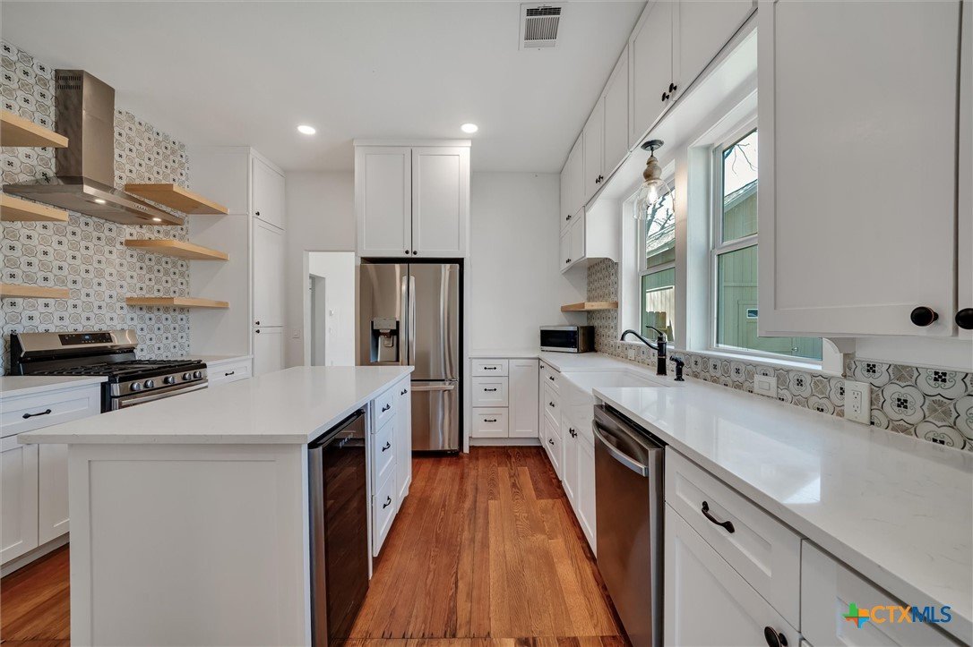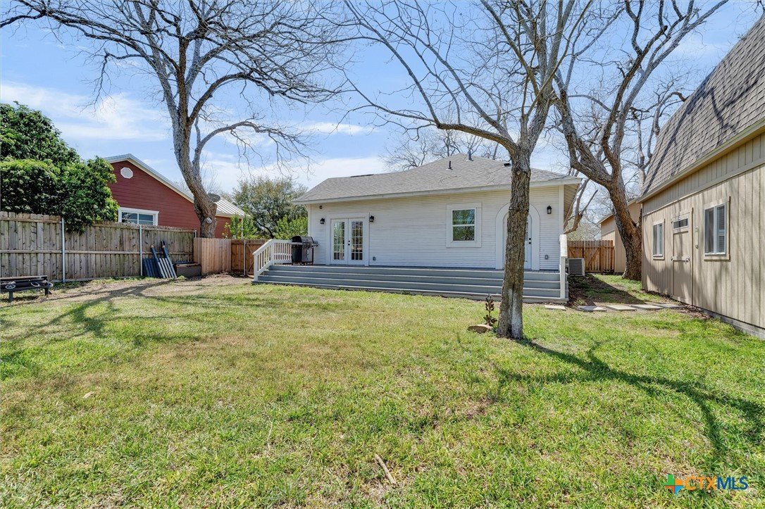 Nestled in the heart of Lockhart, this enchanting 1925 Craftsman/Farmhouse blends historic charm with modern updates. The home’s inviting white exterior, shaded by towering pecan trees, welcomes you with a lovely front porch—perfect for sipping sweet tea and enjoying the Texas breeze. Inside, original hardwoods and exposed shiplap walls highlight the home’s character, while high ceilings, recessed lighting, and thoughtful renovations create a bright, airy atmosphere. The fully remodeled kitchen is a chef’s dream, featuring custom white cabinets, a mosaic tile backsplash, stainless steel appliances, floating shelves, and a wine refrigerator nestled in the island. A charming Dutch door in the laundry room leads to the backyard, blending function and style. The primary suite is a serene retreat, with original shiplap ceilings, French doors to the backyard, and a spacious walk-in closet with built-in shelving. The en suite bathroom exudes vintage elegance with dual vanities, a walk-in shower, and classic hex and penny tile. Two additional bedrooms share a beautifully appointed hallway bathroom, complete with intricate marble and porcelain tilework. Outside, a sprawling 32’ back deck runs the length of the home, overlooking a huge, private yard. Two impressive workshops offer endless possibilities—the first (14’x20’) features a roll-up garage door and a concrete slab, while the second (16’x24’) includes a loft with stairs and double doors for easy access. Just minutes from Lockhart’s historic square, this home offers walkable convenience without an HOA. Move-in ready and oozing charm, this is a rare opportunity to own a piece of Texas history with all the comforts of modern living.