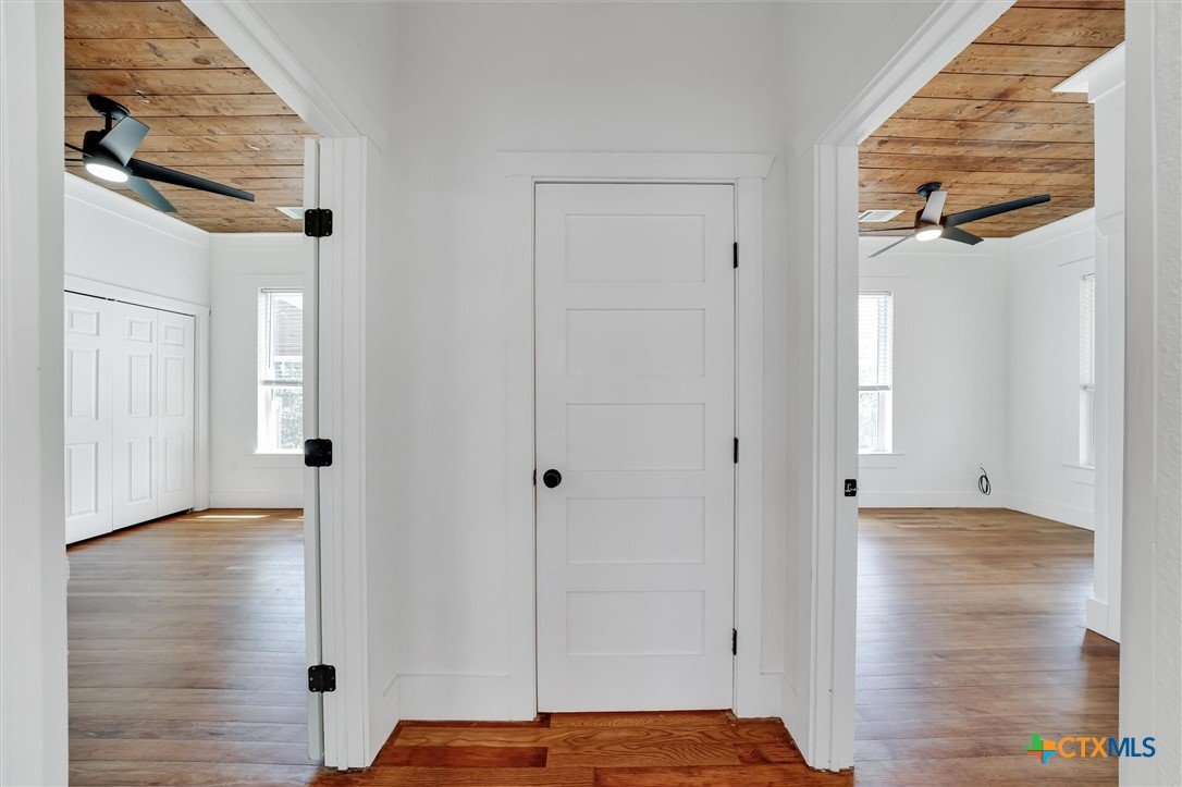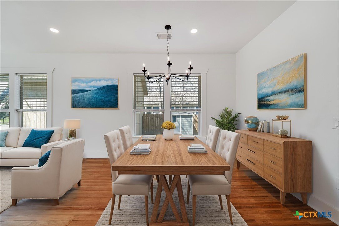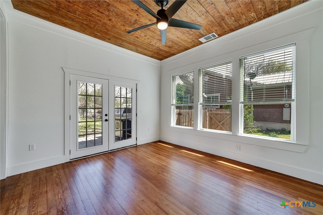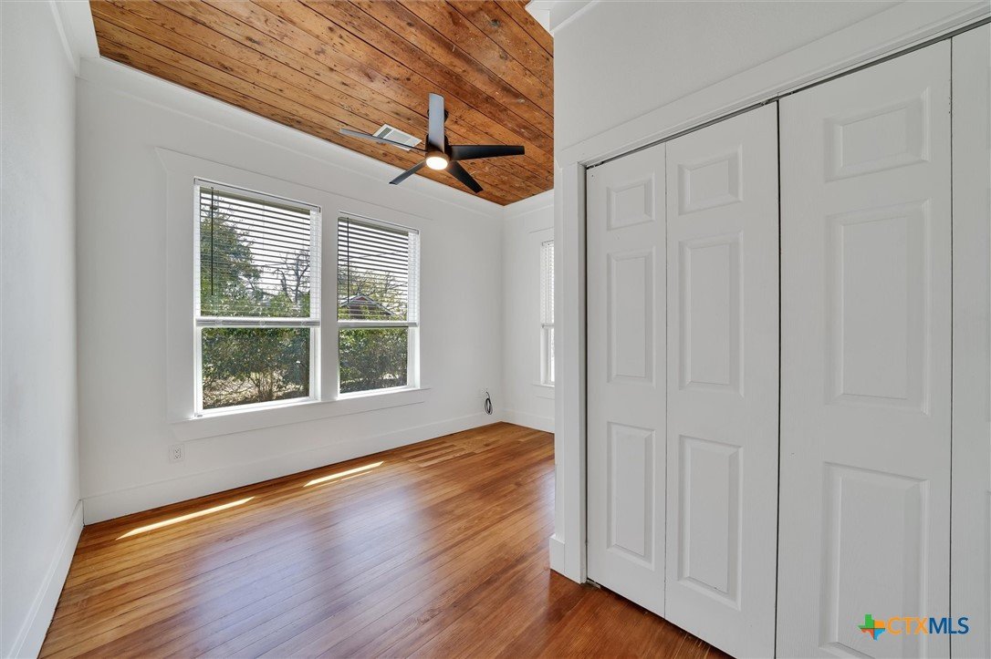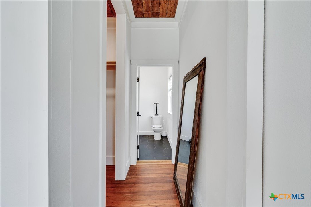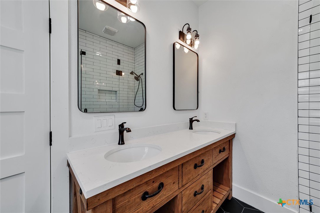 Nestled in the heart of Lockhart, this enchanting 1925 Craftsman/Farmhouse blends historic charm with modern updates. The home’s inviting white exterior, shaded by towering pecan trees, welcomes you with a lovely front porch—perfect for sipping sweet tea and enjoying the Texas breeze. Inside, original hardwoods and exposed shiplap walls highlight the home’s character, while high ceilings, recessed lighting, and thoughtful renovations create a bright, airy atmosphere. The fully remodeled kitchen is a chef’s dream, featuring custom white cabinets, a mosaic tile backsplash, stainless steel appliances, floating shelves, and a wine refrigerator nestled in the island. A charming Dutch door in the laundry room leads to the backyard, blending function and style. The primary suite is a serene retreat, with original shiplap ceilings, French doors to the backyard, and a spacious walk-in closet with built-in shelving. The en suite bathroom exudes vintage elegance with dual vanities, a walk-in shower, and classic hex and penny tile. Two additional bedrooms share a beautifully appointed hallway bathroom, complete with intricate marble and porcelain tilework. Outside, a sprawling 32’ back deck runs the length of the home, overlooking a huge, private yard. Two impressive workshops offer endless possibilities—the first (14’x20’) features a roll-up garage door and a concrete slab, while the second (16’x24’) includes a loft with stairs and double doors for easy access. Just minutes from Lockhart’s historic square, this home offers walkable convenience without an HOA. Move-in ready and oozing charm, this is a rare opportunity to own a piece of Texas history with all the comforts of modern living.