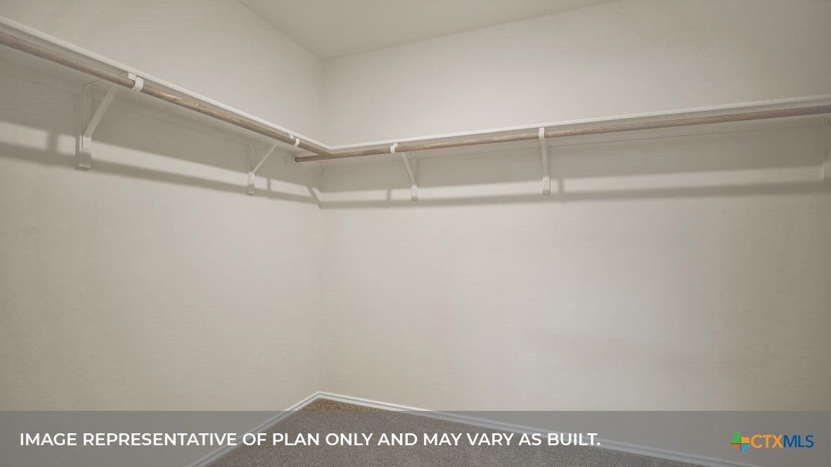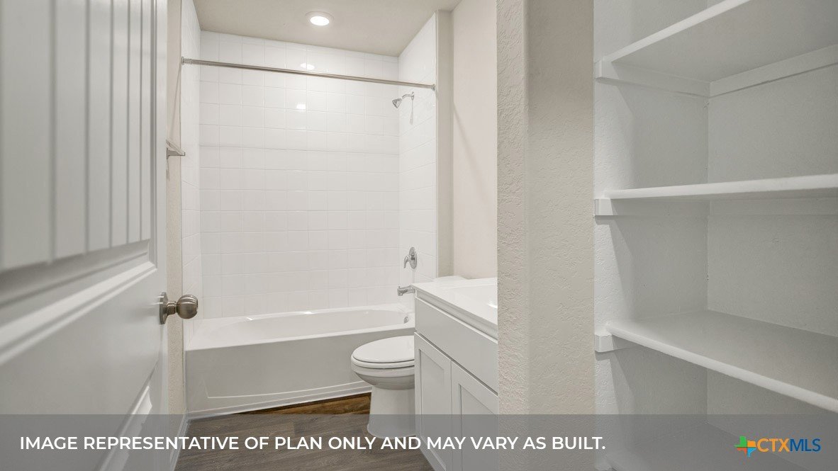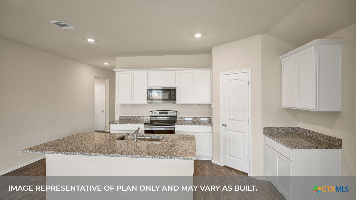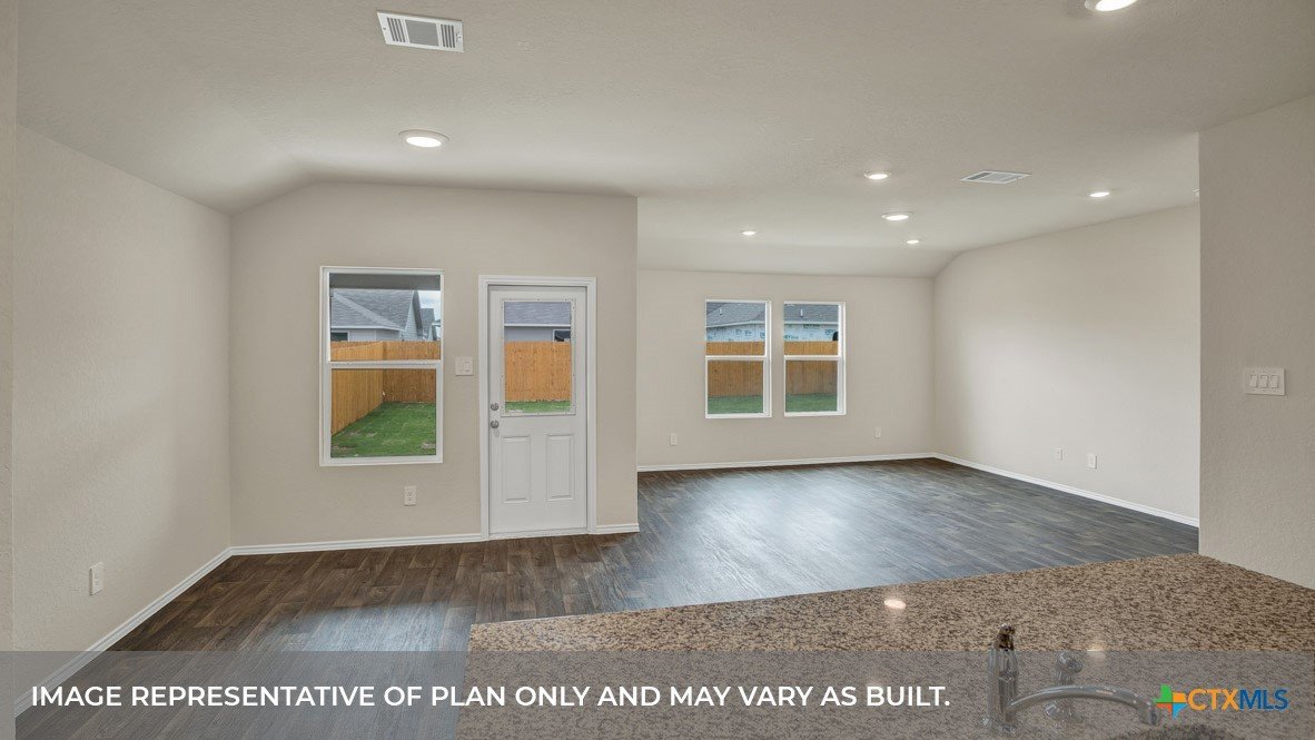 MOVE IN READY! The Irvine is one of our one-story floorplans offered at Hansford in Lockhart, Texas. This 4-bedroom, 2-bathroom home includes a 2-car garage within its 1,788 square feet of comfortable living space. Our homes in Hansford feature farmhouse exteriors. Step into this home from the covered entryway and make your way down the hall to the main living space. The open kitchen looks out to your dining area and family room, allowing for conversations to easily flow from all spaces. The L-shaped kitchen includes granite countertops, a large island with an undermount sink, a corner pantry closet, stainless-steel appliances and 36’’ upper cabinets. Off the family room is the primary bedroom, with its own private bathroom. This relaxing bathroom space features a 5’ walk in shower, vanity, private toilet area with a door, and an oversized walk-in closet. At the front of the house, you will find bedroom 2 and 3, with the secondary bathroom conveniently located between the rooms. Bathroom 2 includes a tub/shower combination and open shelving for extra storage or décor. Across the foyer and down a short hall is the utility room and bedroom 4. Whether you use these rooms as an office, child’s room or guest room, there is enough space for work, sleep and play. The Irvine includes vinyl flooring throughout the common areas of the home, and carpet in the bedrooms. All our new homes feature a covered back patio, full sod, an irrigation system in the front and back yard, and a 6’ privacy fence around the back yard. This home includes our America’s Smart Home base package, which includes the Amazon Echo Pop, Front Doorbell, Front Door Deadbolt Lock, Home Hub, Thermostat, and Deako® Smart Switches.