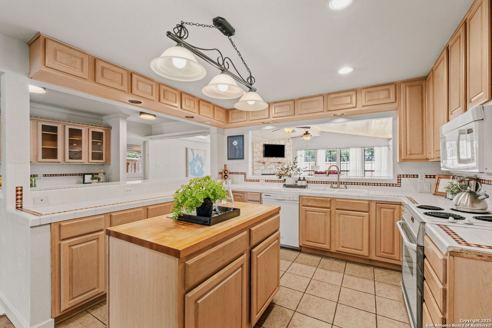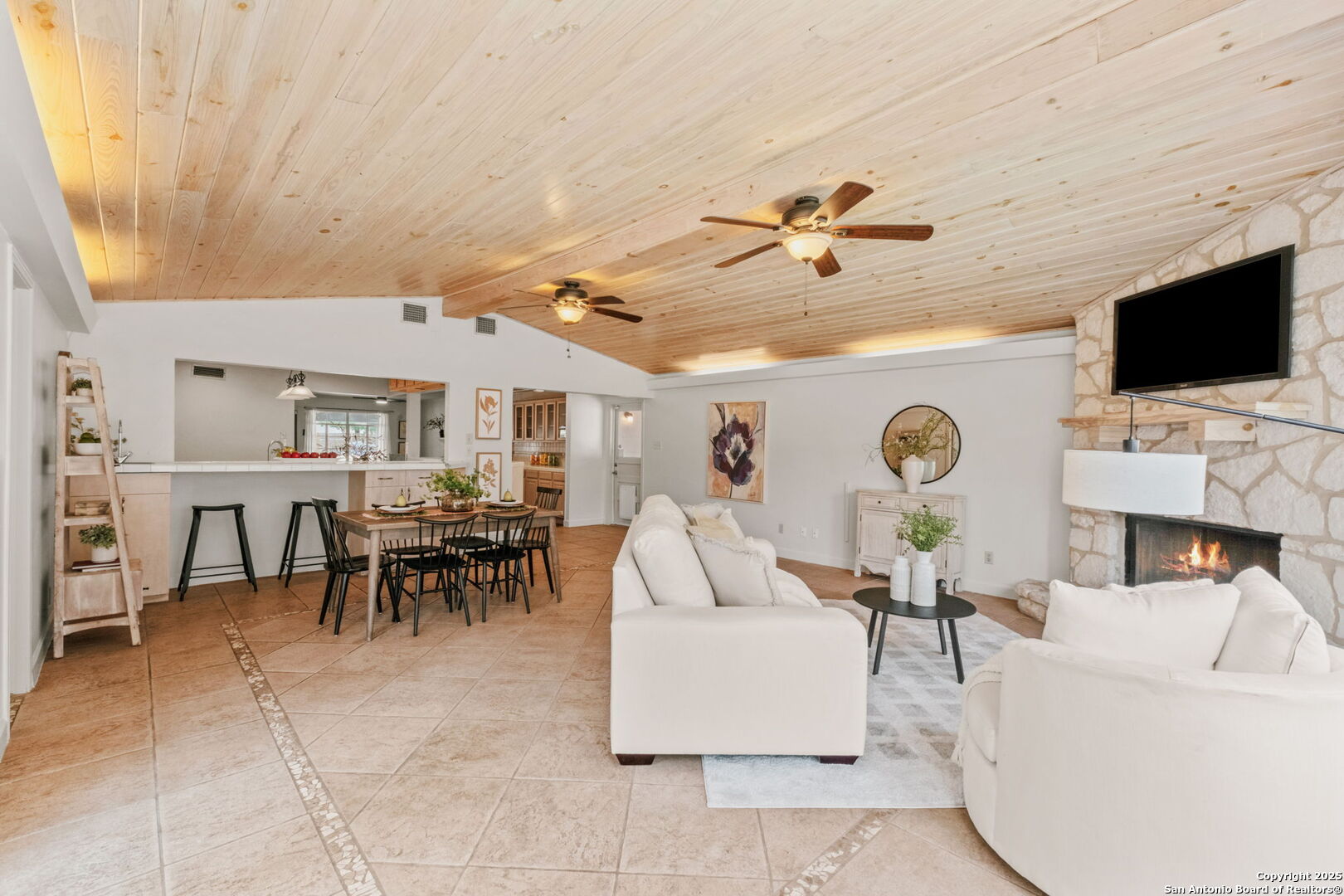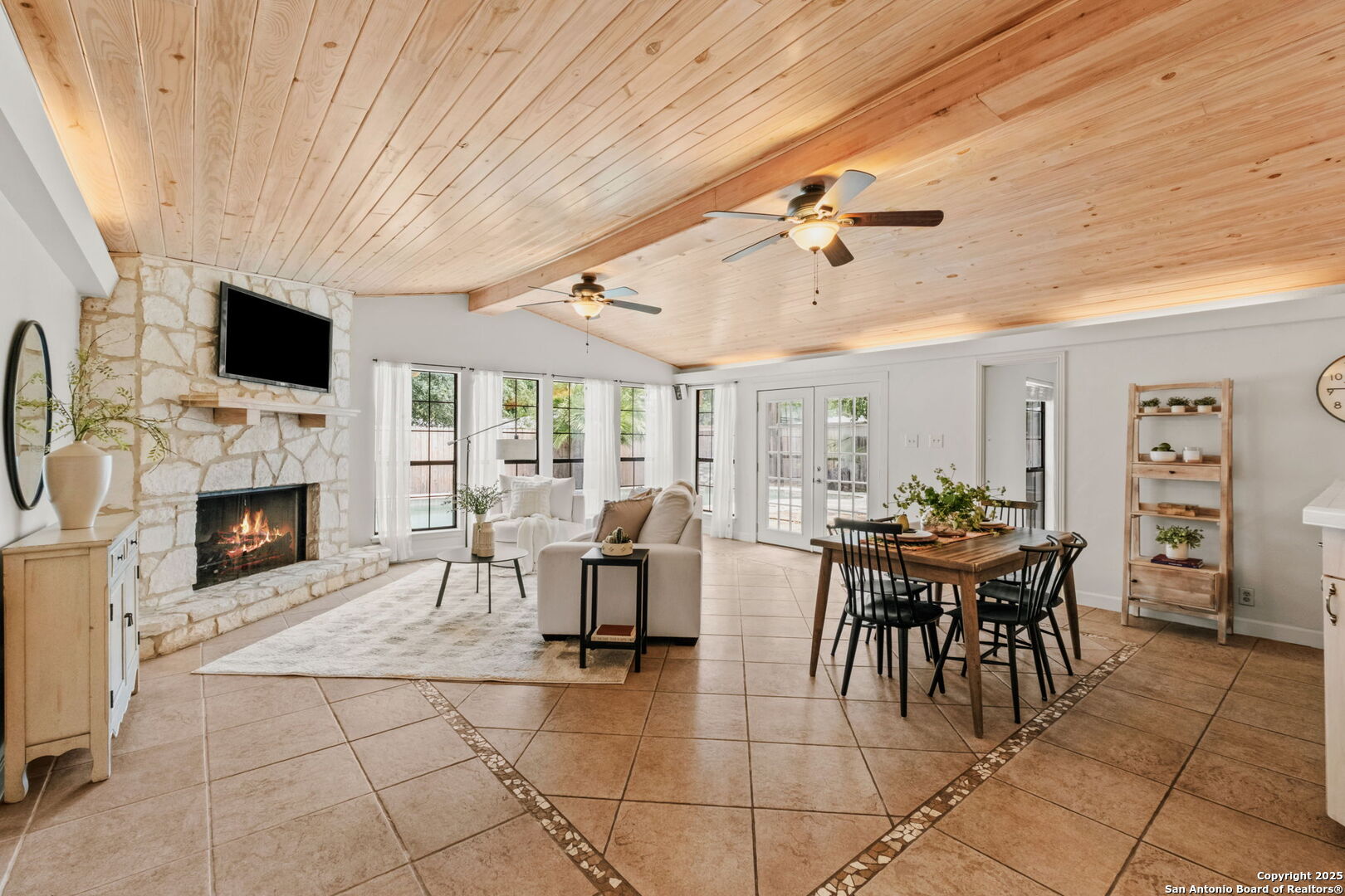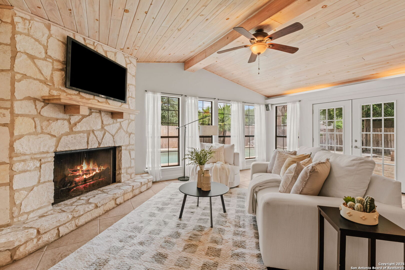 Welcome to 219 Ridgehaven Place, a stunning single-story retreat in the sought-after Northridge neighborhood, zoned to the highly acclaimed Alamo Heights ISD. This 3-bedroom, 2-bathroom home measuring nearly 2300 square feet offers an elevated living experience with a layout designed for comfort. Step inside to an open-concept design where rich hardwood floors guide you into a bright living area. A marble-surround gas fireplace creates a warm focal point, ideal for cozy evenings. The space flows effortlessly into the kitchen, featuring ample cabinetry, a butcher-block island, and a modern breakfast bar-great for casual meals or entertaining. Just beyond, a second living area with its own stone-clad gas fireplace adds versatility, whether you're hosting guests or enjoying a quiet night in. The dining area, framed by large windows and French doors, is soaked with an abundance of natural lighting and opens to the outdoors, making it perfect for gatherings. The primary bedroom offers a serene escape with hardwood floors and a welcoming ambiance, while the two additional bedrooms provide flexibility for family or guests. A bonus room adds even more value-use it as a guest suite, a home office, or a quiet study to suit your needs. The backyard is a true private oasis. A sparkling pool is ready for those summer days, and a stone fire pit sets the stage for memorable evenings under the stars. Combinations of surrounding mature and palm trees provide shade and a sense of seclusion, making this outdoor space a true retreat. With two distinct living areas, a smart layout, and a prime location, 219 Ridgehaven Place is a rare find. Schedule your private tour today and see why this home is the perfect place to start your next chapter!
