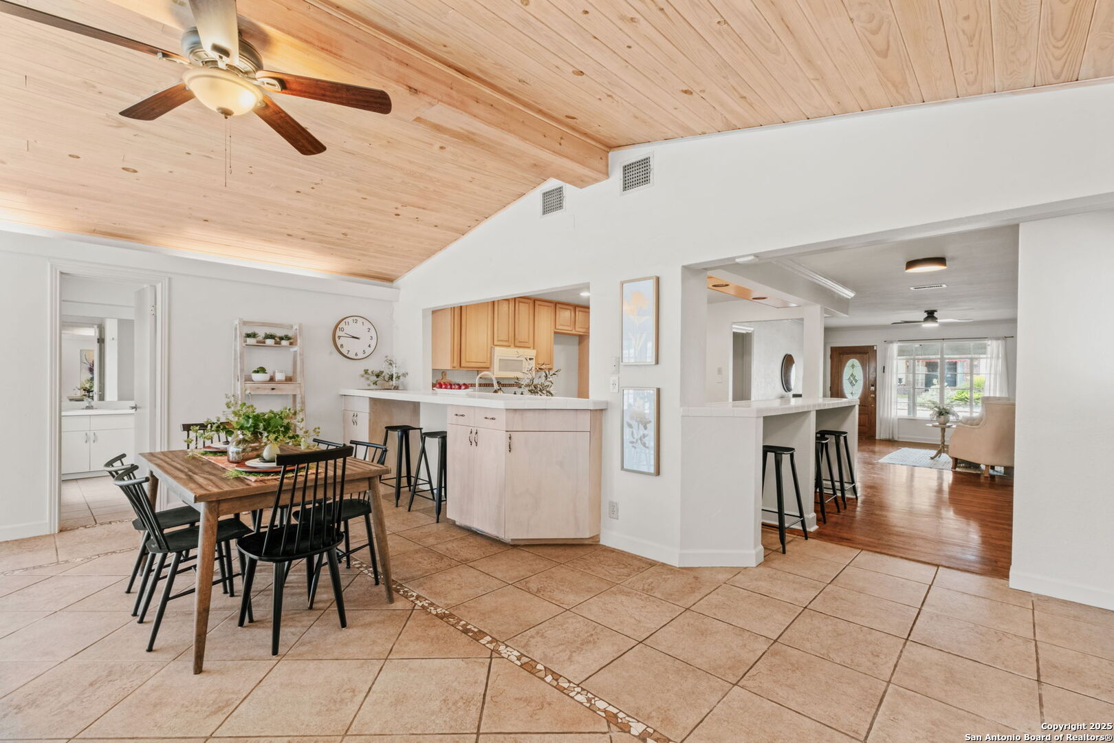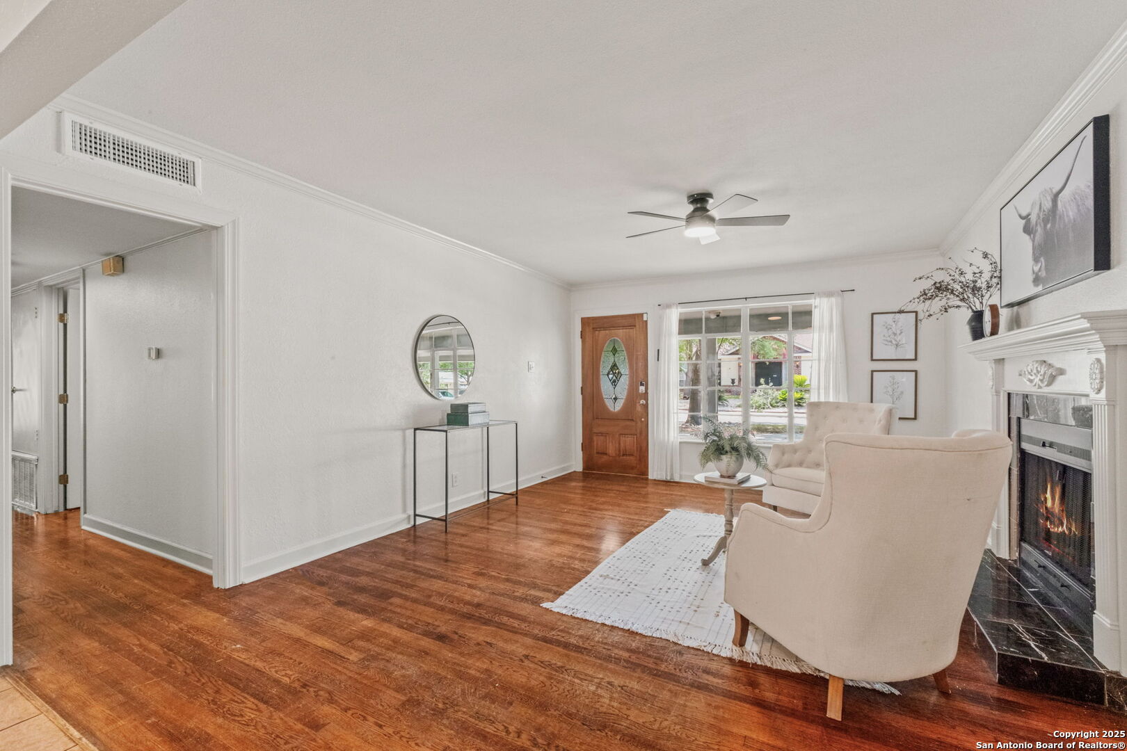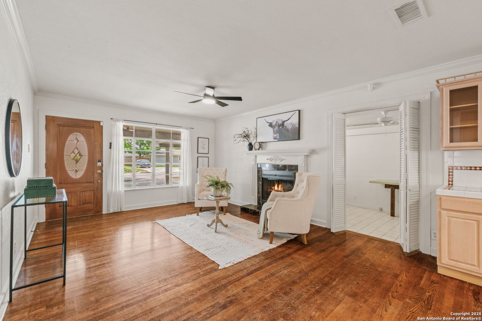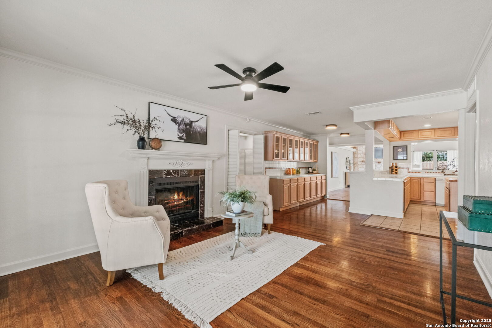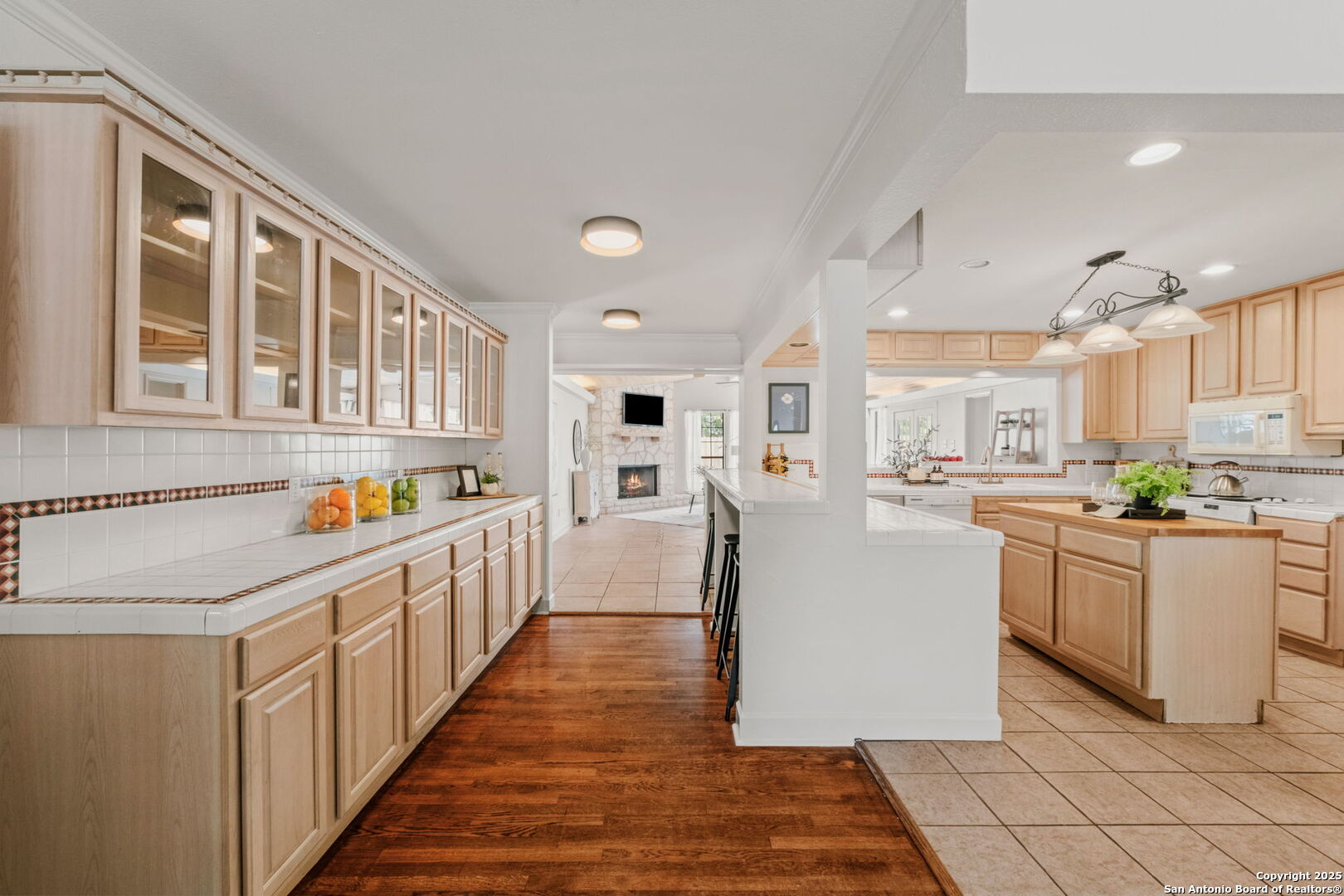 Welcome to 219 Ridgehaven Place, a stunning single-story retreat in the sought-after Northridge neighborhood, zoned to the highly acclaimed Alamo Heights ISD. This 3-bedroom, 2-bathroom home measuring nearly 2300 square feet offers an elevated living experience with a layout designed for comfort. Step inside to an open-concept design where rich hardwood floors guide you into a bright living area. A marble-surround gas fireplace creates a warm focal point, ideal for cozy evenings. The space flows effortlessly into the kitchen, featuring ample cabinetry, a butcher-block island, and a modern breakfast bar-great for casual meals or entertaining. Just beyond, a second living area with its own stone-clad gas fireplace adds versatility, whether you're hosting guests or enjoying a quiet night in. The dining area, framed by large windows and French doors, is soaked with an abundance of natural lighting and opens to the outdoors, making it perfect for gatherings. The primary bedroom offers a serene escape with hardwood floors and a welcoming ambiance, while the two additional bedrooms provide flexibility for family or guests. A bonus room adds even more value-use it as a guest suite, a home office, or a quiet study to suit your needs. The backyard is a true private oasis. A sparkling pool is ready for those summer days, and a stone fire pit sets the stage for memorable evenings under the stars. Combinations of surrounding mature and palm trees provide shade and a sense of seclusion, making this outdoor space a true retreat. With two distinct living areas, a smart layout, and a prime location, 219 Ridgehaven Place is a rare find. Schedule your private tour today and see why this home is the perfect place to start your next chapter!