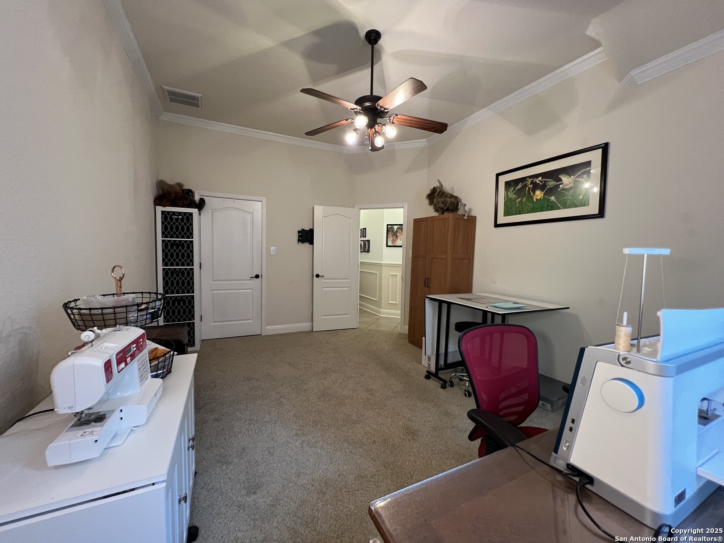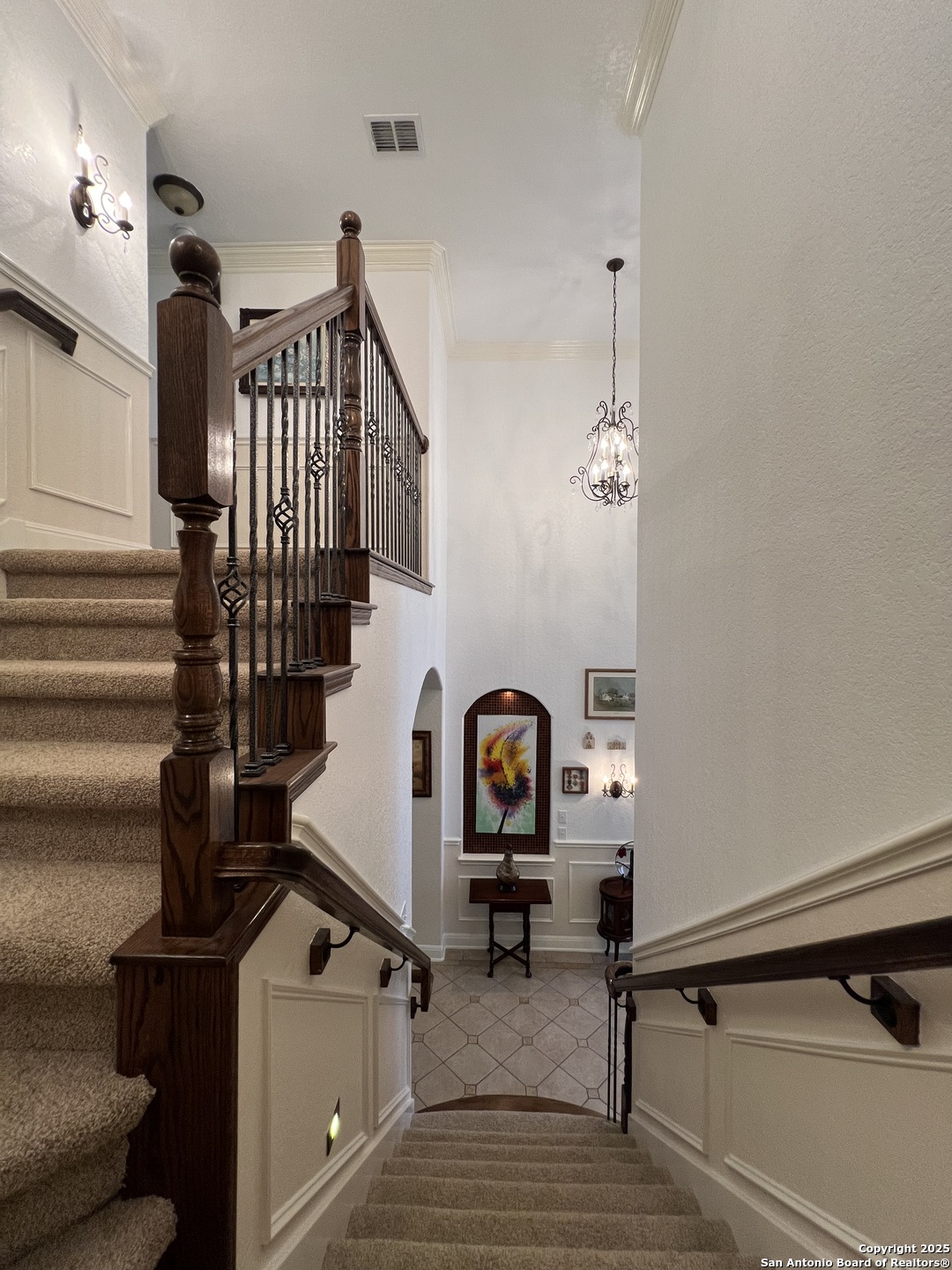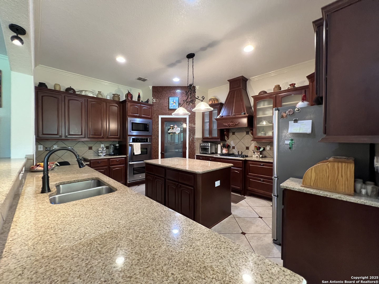 This stunning home has 4 bedrooms, 3.5 baths, office, separate breakfast area w/decorative ceiling over looking the amazing backyard, formal dining room fit for a King, desirable kitchen w/lots of custom cabinets, cook top, double ovens, built-in microwave, granite counters, island kitchen, walk-in pantry and overlooks a spacious living room w/stone fireplace, built in decorative wall cabinet. 3 bedrooms and master down, one bedroom, full bath and media room upstairs. There are so many upgrades and beautiful touches to this home! A few of the exterior features include a large covered porch, lots of mature trees, sprinkler system, concrete and rod iron fencing, 3 car garage, garage door openers. This home is truly a must see!