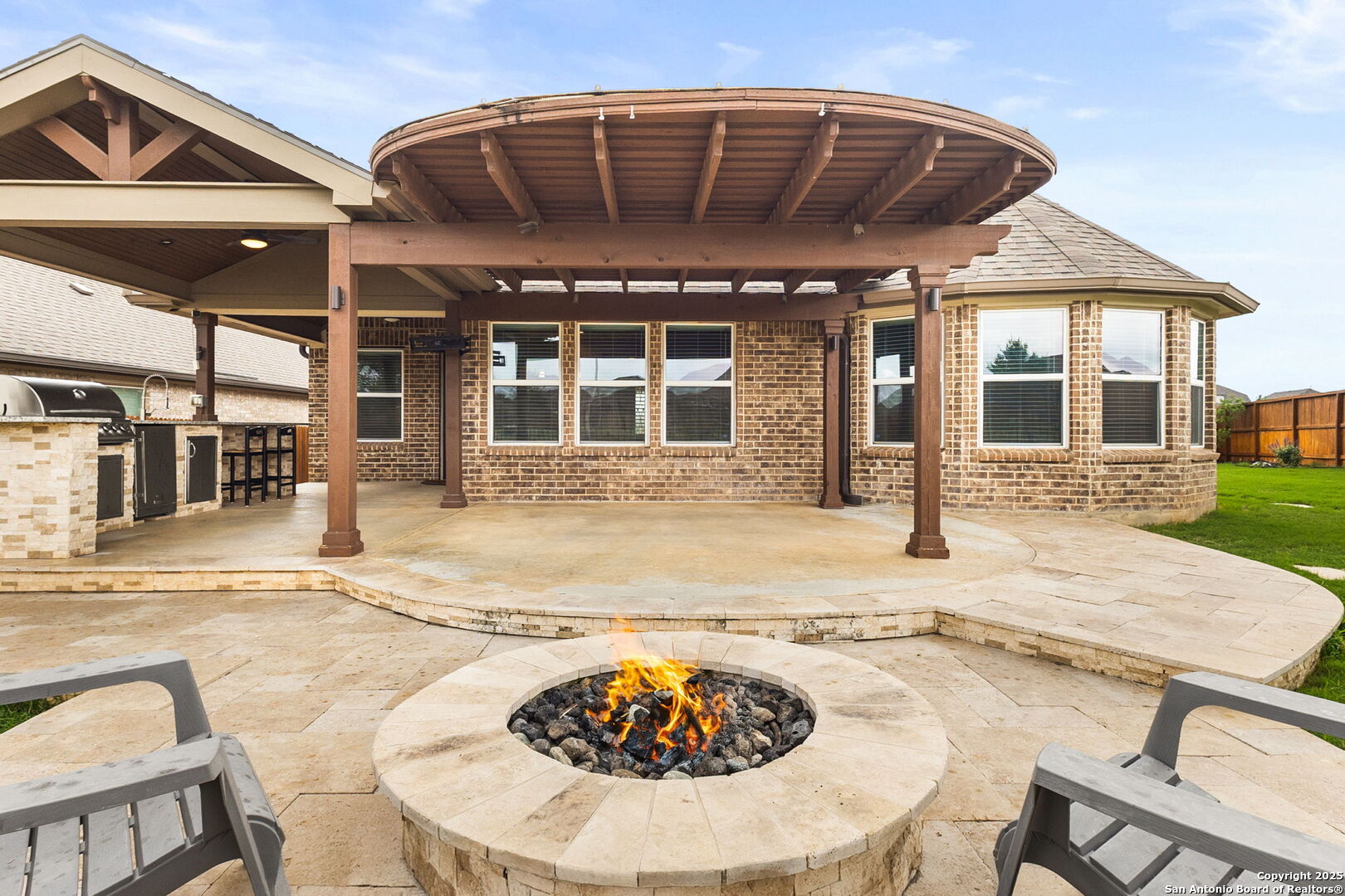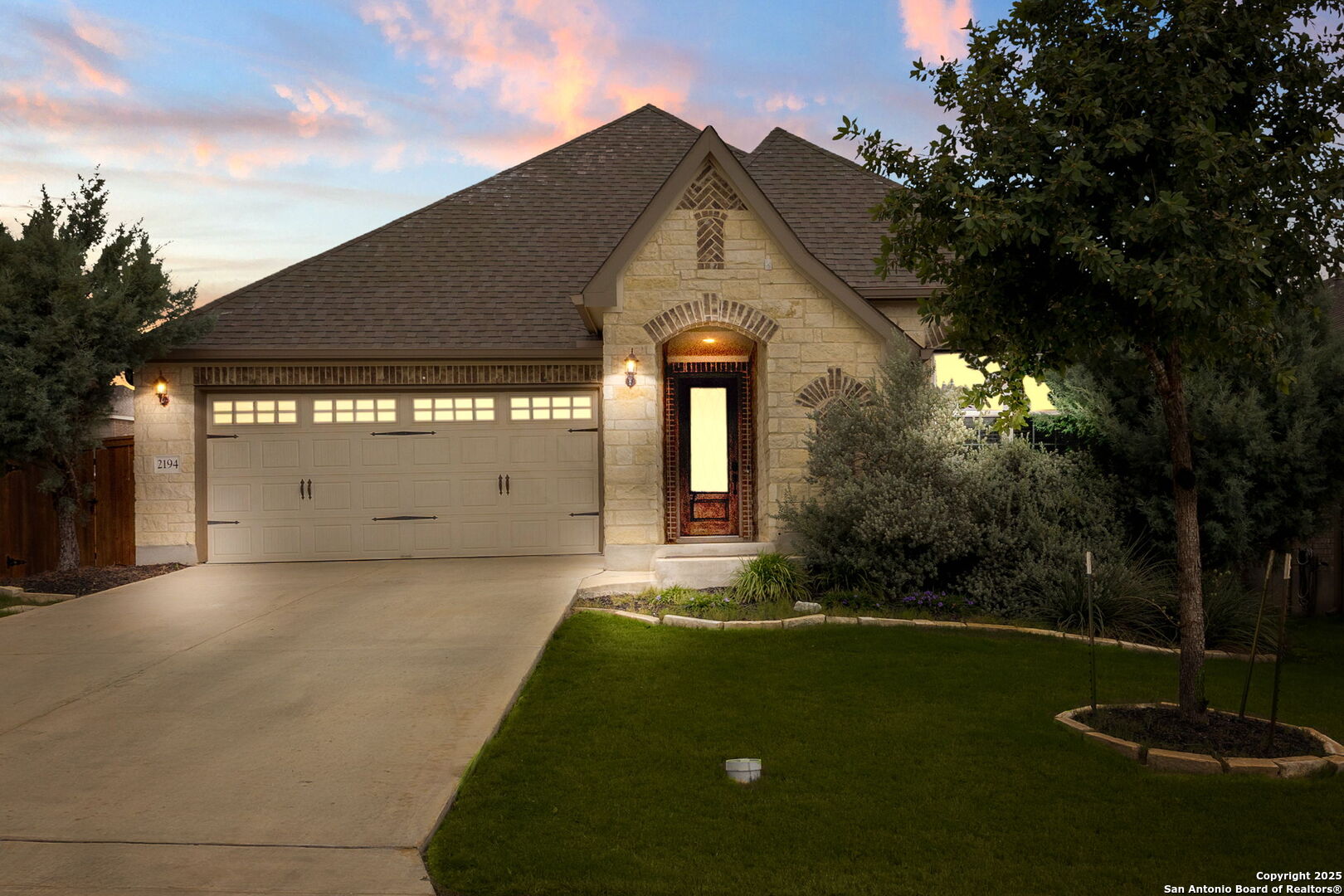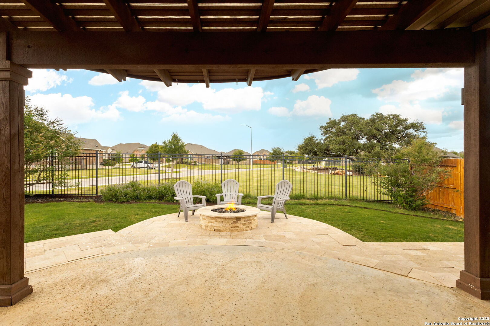 Welcome to 2194 Indigobush Drive, a meticulously maintained and fully upgraded 4-bedroom, 2-bathroom former model home situated on an oversized premium corner lot in the highly sought-after Veramendi community of New Braunfels. Surrounded by expansive green space in both the front and back, this home offers rare privacy, openness, and a park-like setting. Ideally located within walking distance to Veramendi Elementary, and just minutes from Oak Run Middle School and New Braunfels High School, this home combines exceptional convenience with elevated living. Enjoy close proximity to the resort-style community pool, neighborhood parks, and local favorites like Breakfast and Winslet Provisions-blending refined living with vibrant community charm. Step inside to discover an open-concept layout centered around a light-filled living room with a cozy fireplace, flowing into a beautifully appointed kitchen and elegant dining area-perfect for both everyday comfort and stylish entertaining. A dedicated office/flex room offers versatile space for work or study. This former model home showcases an impressive array of upgrades, including the optional fourth bedroom/study, custom-designed closets in every room, and built-in cabinetry and workspaces in both the laundry room and garage. Additional features include a water softener system, full gutter installation, upgraded ceiling fans, and pre-wiring for surround sound and outdoor television. The luxurious primary suite is a private retreat, complete with graceful bay windows, a spa-like bathroom, and a meticulously finished walk-in closet. Step outside to a beautifully designed outdoor living area, featuring a travertine-tiled, pergola-covered patio, a fully equipped outdoor kitchen, and a gas fire pit-an ideal space for relaxing or entertaining under the Texas sky. This move-in ready home combines thoughtful design, elegant finishes, and a highly desirable location. Experience elevated Hill Country living in one of New Braunfels' most coveted neighborhoods-Veramendi.