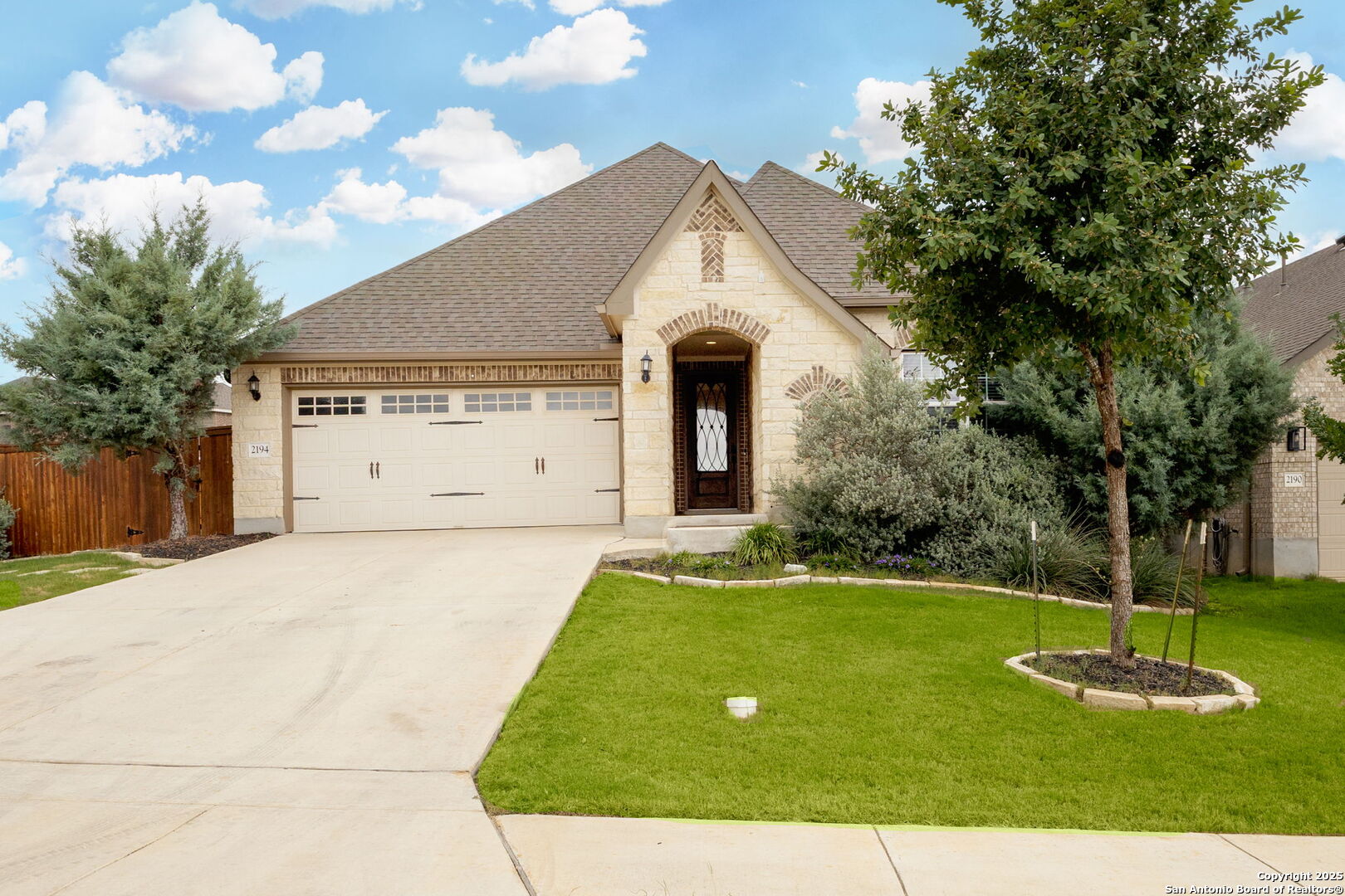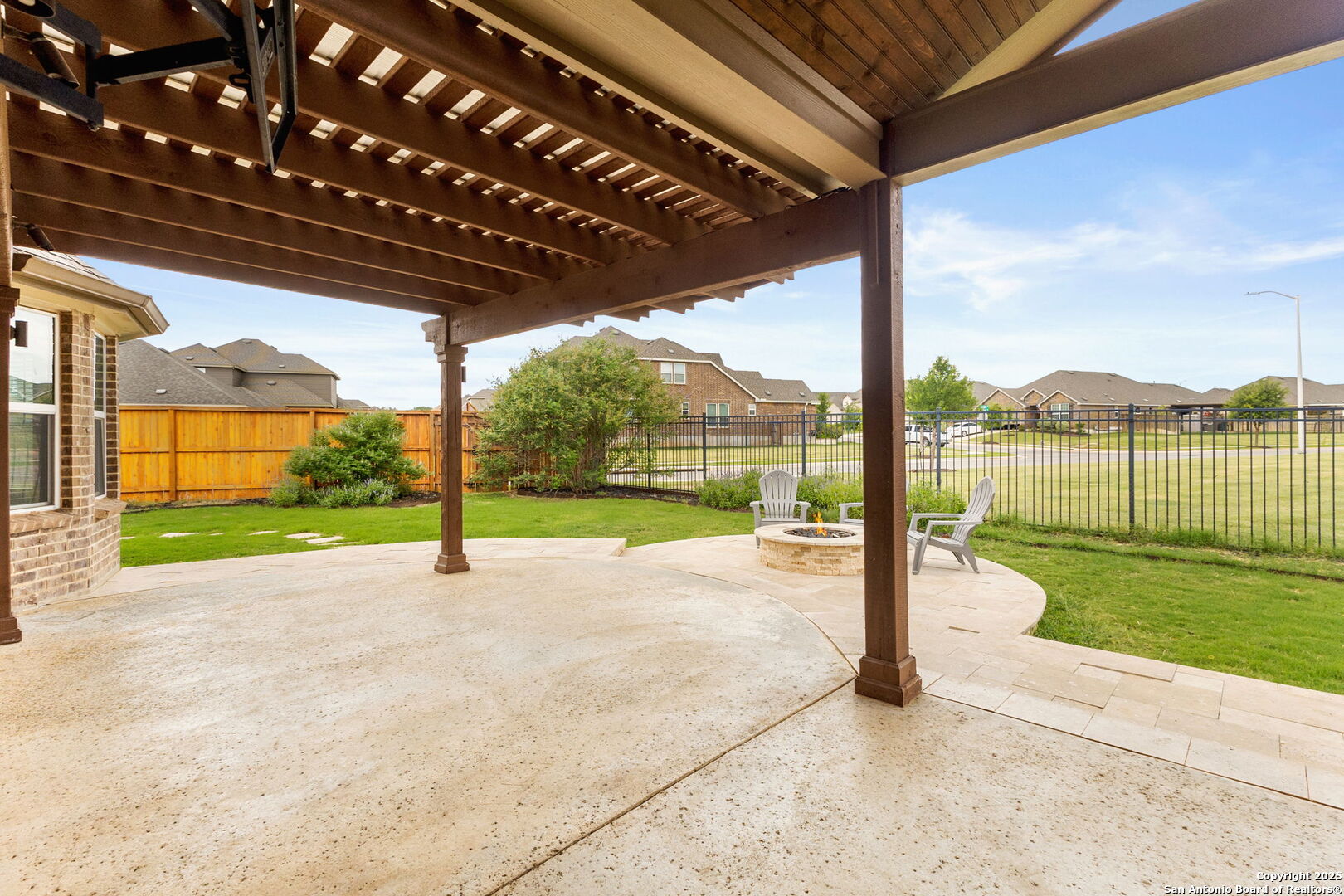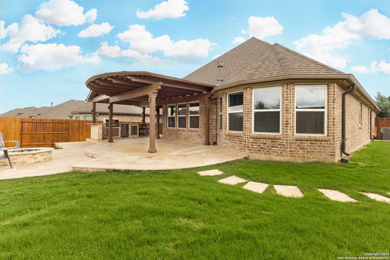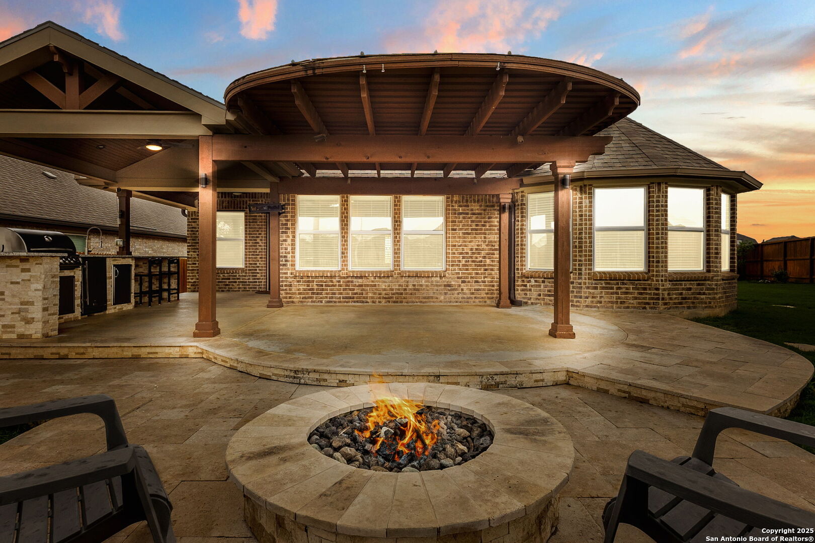 Welcome to 2194 Indigobush Drive, a meticulously maintained and fully upgraded 4-bedroom, 2-bathroom former model home situated on an oversized premium corner lot in the highly sought-after Veramendi community of New Braunfels. Surrounded by expansive green space in both the front and back, this home offers rare privacy, openness, and a park-like setting. Ideally located within walking distance to Veramendi Elementary, and just minutes from Oak Run Middle School and New Braunfels High School, this home combines exceptional convenience with elevated living. Enjoy close proximity to the resort-style community pool, neighborhood parks, and local favorites like Breakfast and Winslet Provisions-blending refined living with vibrant community charm. Step inside to discover an open-concept layout centered around a light-filled living room with a cozy fireplace, flowing into a beautifully appointed kitchen and elegant dining area-perfect for both everyday comfort and stylish entertaining. A dedicated office/flex room offers versatile space for work or study. This former model home showcases an impressive array of upgrades, including the optional fourth bedroom/study, custom-designed closets in every room, and built-in cabinetry and workspaces in both the laundry room and garage. Additional features include a water softener system, full gutter installation, upgraded ceiling fans, and pre-wiring for surround sound and outdoor television. The luxurious primary suite is a private retreat, complete with graceful bay windows, a spa-like bathroom, and a meticulously finished walk-in closet. Step outside to a beautifully designed outdoor living area, featuring a travertine-tiled, pergola-covered patio, a fully equipped outdoor kitchen, and a gas fire pit-an ideal space for relaxing or entertaining under the Texas sky. This move-in ready home combines thoughtful design, elegant finishes, and a highly desirable location. Experience elevated Hill Country living in one of New Braunfels' most coveted neighborhoods-Veramendi.
