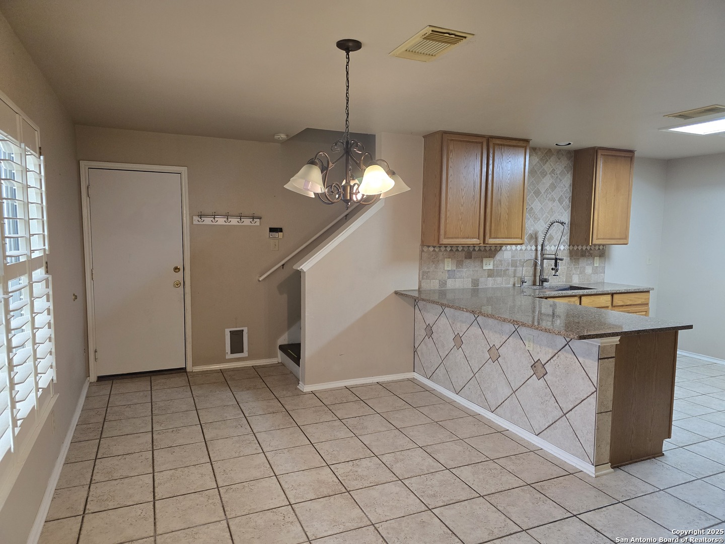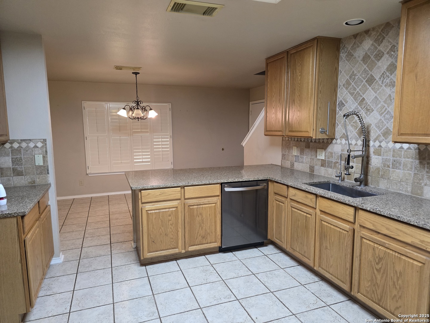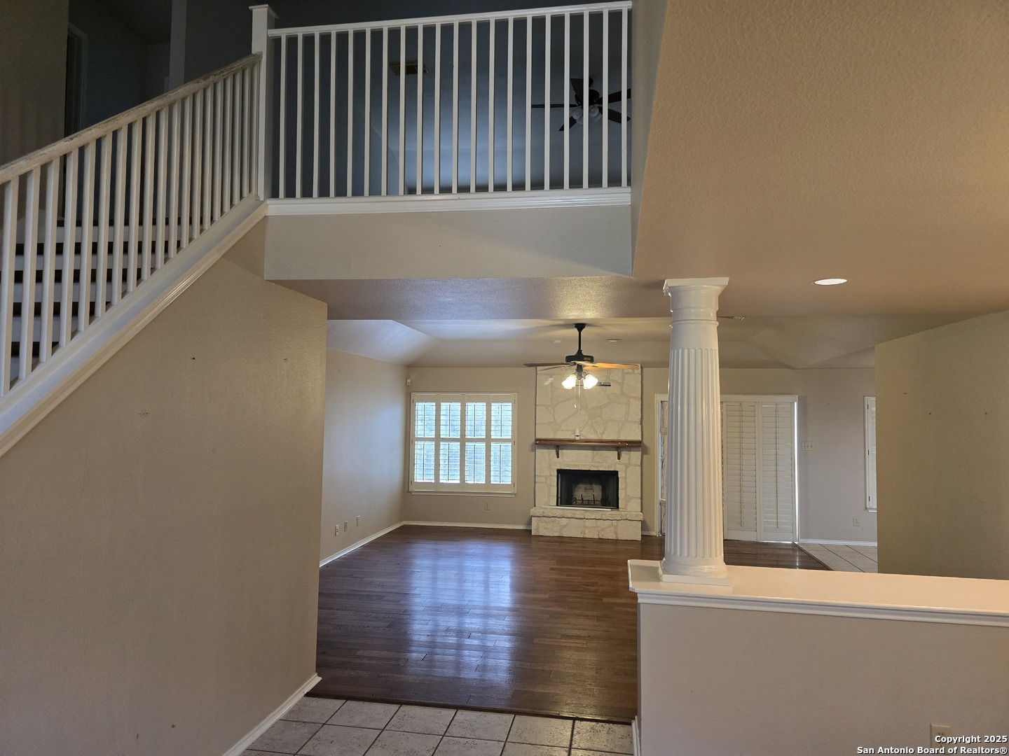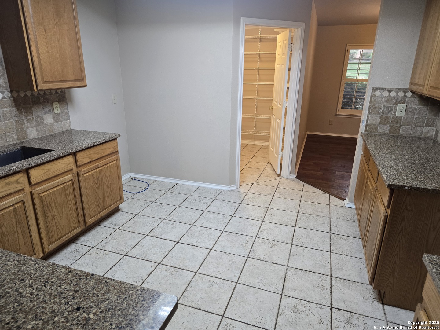 This beautiful home offers 5 bedrooms, 3.5 baths, and a 3-car garage, all situated on a large corner lot-just over a quarter acre-backing to a serene greenbelt. Step inside to a soaring entry, a formal dining room, and a large family room with a stunning rock, wood-burning fireplace. The kitchen features quartz countertops and a stone backsplash. The primary suite is conveniently located on the first floor with a walk-in shower, double sinks, and a linen closet. Upstairs you'll find a spacious game room with its own staircase off the breakfast area, plus four bedrooms with ceiling fans and carpet throughout. Tile in all wet areas. Bathrooms also feature quartz countertops. Enjoy outdoor living with a huge patio, privacy fence, and mature oak tree in the backyard. Close to schools and shopping for added convenience!