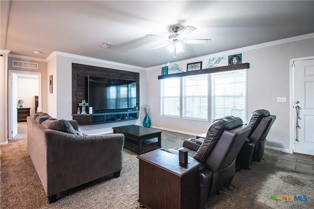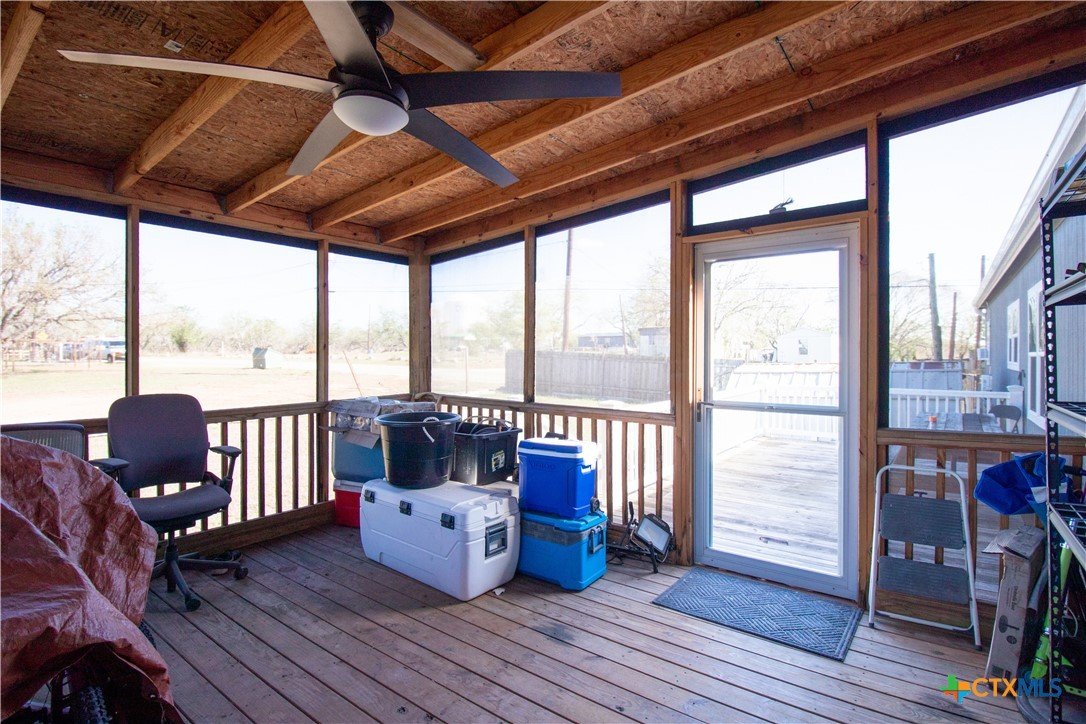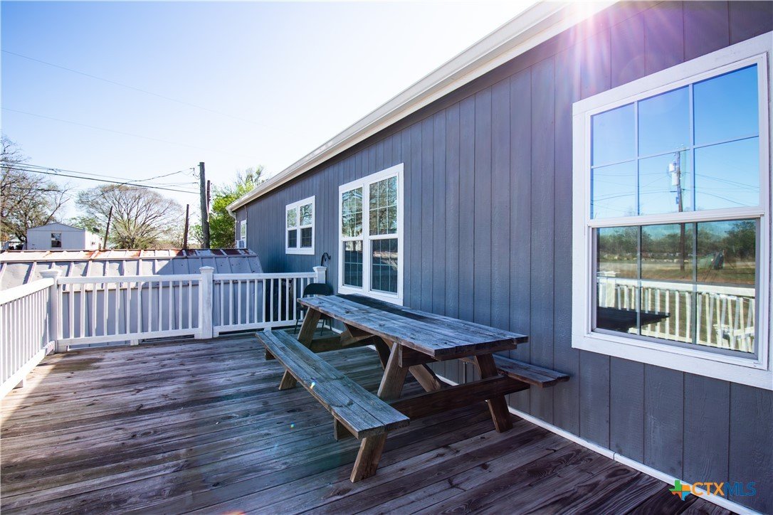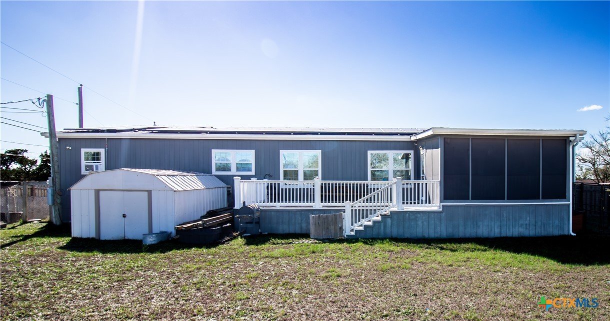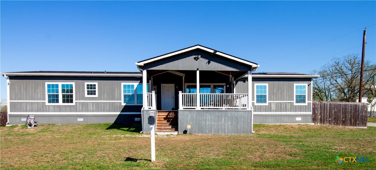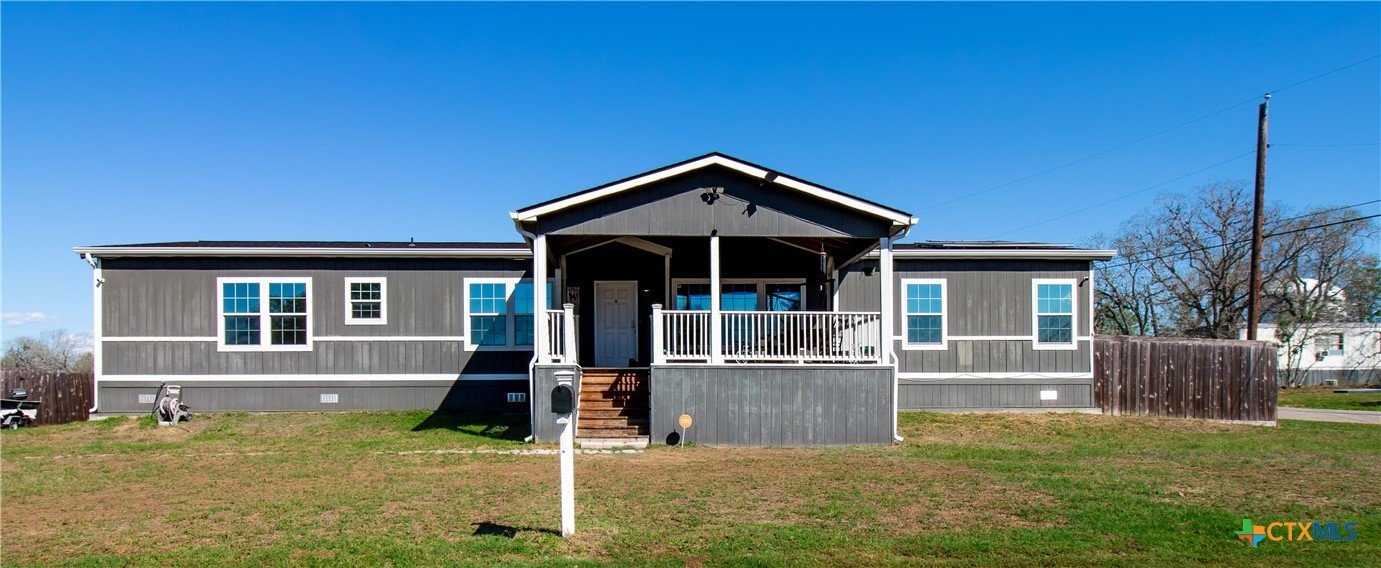 Efficiency, space, and standout features in Cuero! This 2018 4BR/2BA manufactured home offers the perfect blend of comfort and smart upgrades. Enjoy a large covered front porch deck with classic white picket railing, plus a spacious screened-in back patio and deck—ideal for relaxing or entertaining. Inside, you’ll find recessed lighting, crown molding, and a mix of carpet and laminate flooring, along with a flexible 2nd living area for added space. The oversized primary suite features a tray ceiling and a unique hidden study nook behind sliding barn doors. The ensuite bath includes dual single vanities, a deep soaking tub, and a separate walk-in shower. Energy efficiency shines with 36 solar panels, tinted windows, metal roof sheeting, and a new 2024 composition roof, plus a 2018 A/C system. Situated on five lots with a wood privacy fence and an indoor laundry room, this property offers room to live, grow, and enjoy. Move-in ready with upgrades that truly matter—don’t miss it!