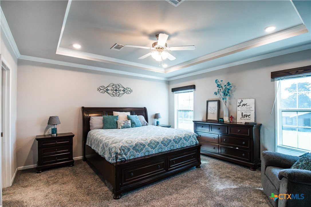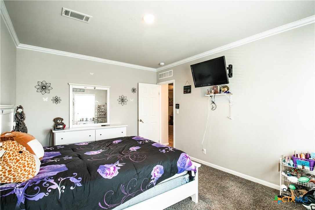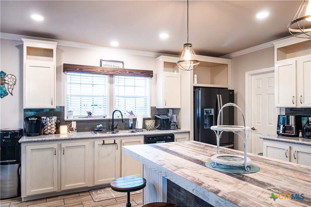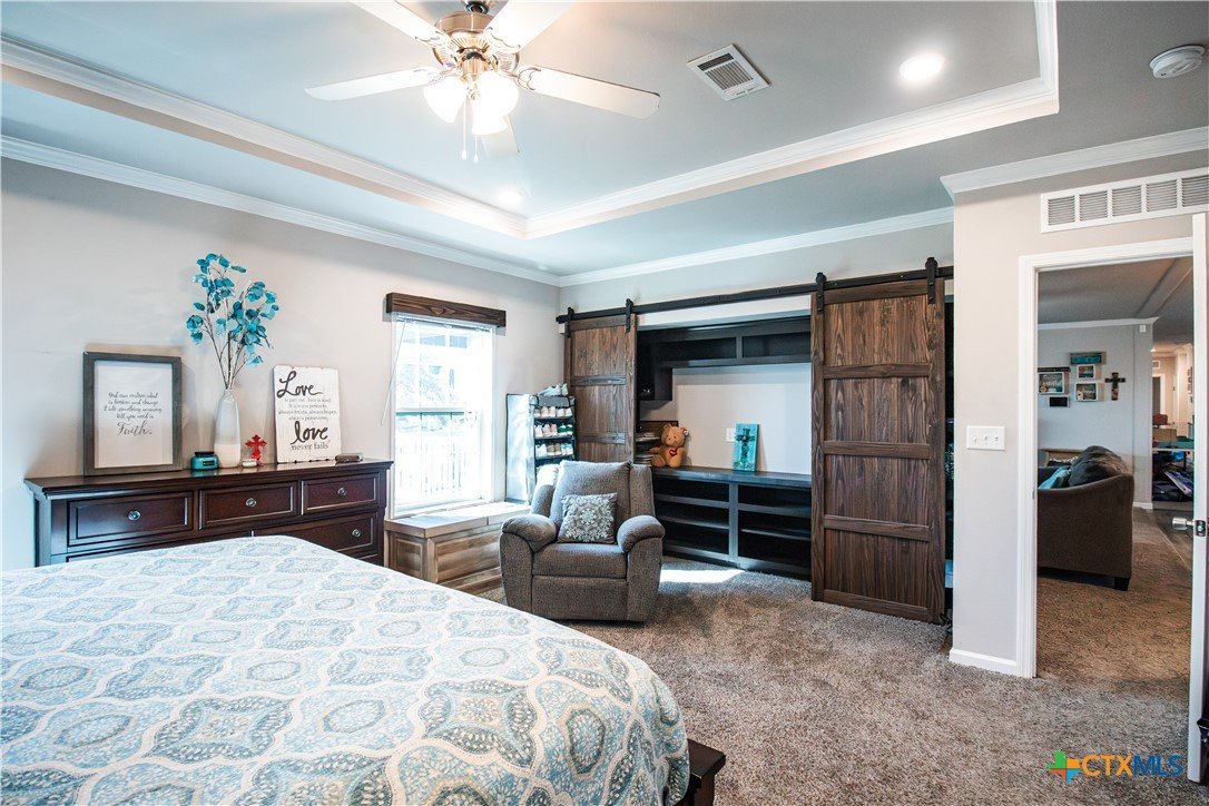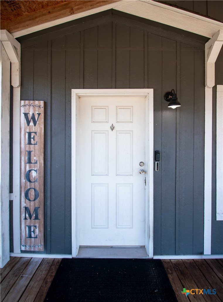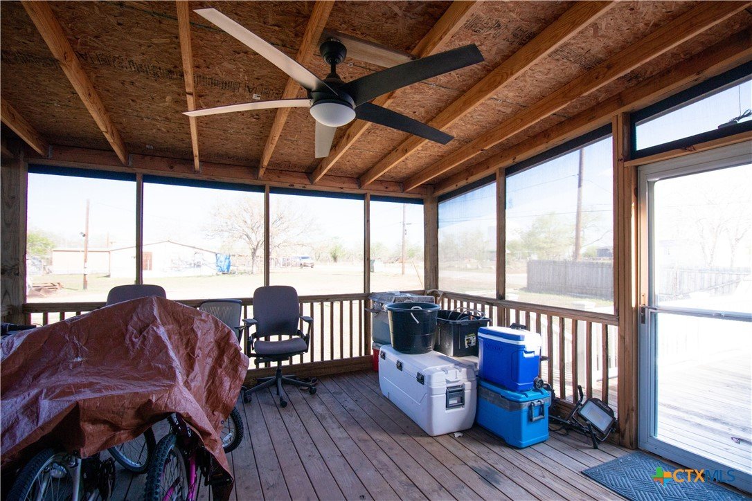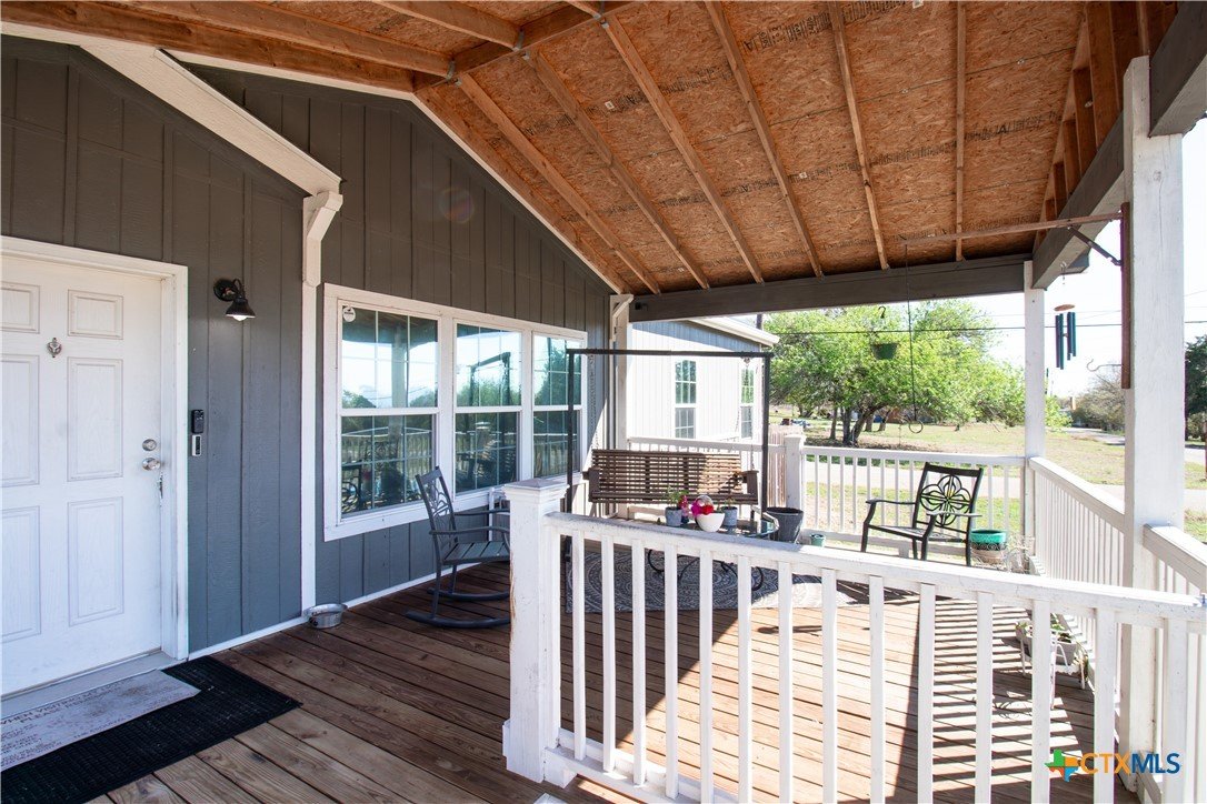 Efficiency, space, and standout features in Cuero! This 2018 4BR/2BA manufactured home offers the perfect blend of comfort and smart upgrades. Enjoy a large covered front porch deck with classic white picket railing, plus a spacious screened-in back patio and deck—ideal for relaxing or entertaining. Inside, you’ll find recessed lighting, crown molding, and a mix of carpet and laminate flooring, along with a flexible 2nd living area for added space. The oversized primary suite features a tray ceiling and a unique hidden study nook behind sliding barn doors. The ensuite bath includes dual single vanities, a deep soaking tub, and a separate walk-in shower. Energy efficiency shines with 36 solar panels, tinted windows, metal roof sheeting, and a new 2024 composition roof, plus a 2018 A/C system. Situated on five lots with a wood privacy fence and an indoor laundry room, this property offers room to live, grow, and enjoy. Move-in ready with upgrades that truly matter—don’t miss it!