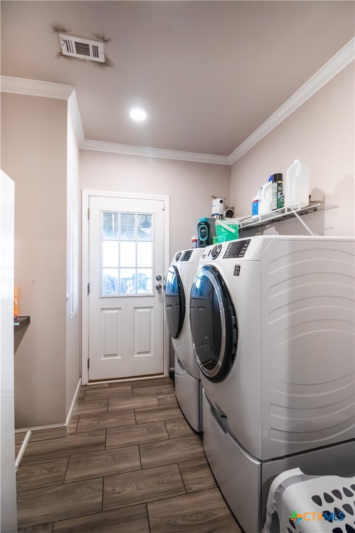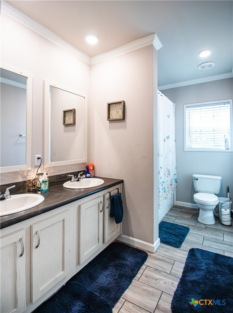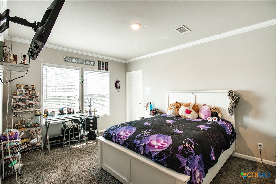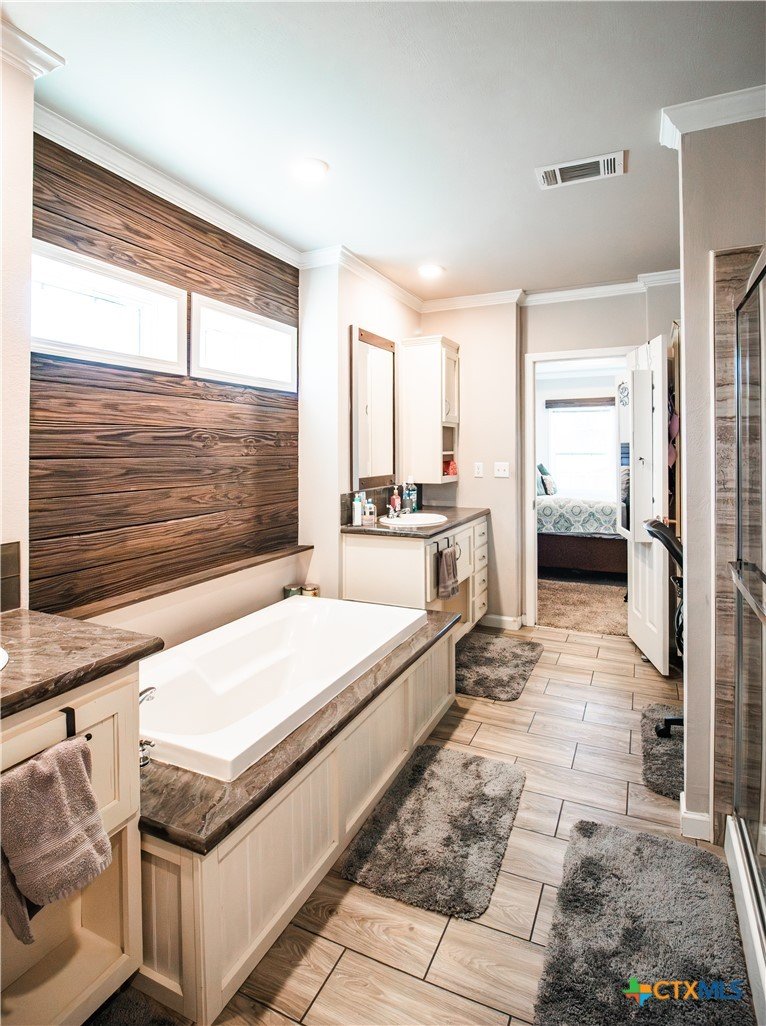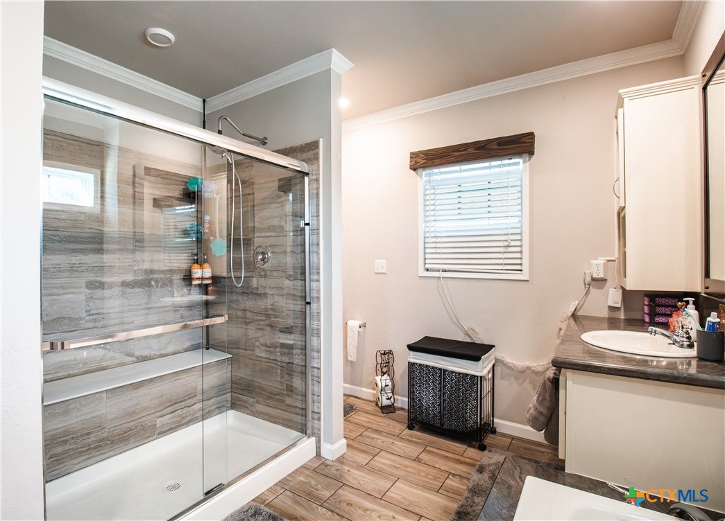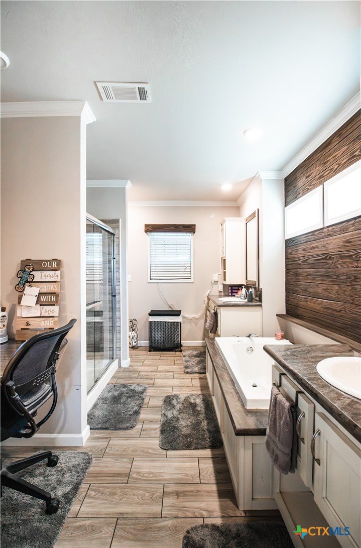 Efficiency, space, and standout features in Cuero! This 2018 4BR/2BA manufactured home offers the perfect blend of comfort and smart upgrades. Enjoy a large covered front porch deck with classic white picket railing, plus a spacious screened-in back patio and deck—ideal for relaxing or entertaining. Inside, you’ll find recessed lighting, crown molding, and a mix of carpet and laminate flooring, along with a flexible 2nd living area for added space. The oversized primary suite features a tray ceiling and a unique hidden study nook behind sliding barn doors. The ensuite bath includes dual single vanities, a deep soaking tub, and a separate walk-in shower. Energy efficiency shines with 36 solar panels, tinted windows, metal roof sheeting, and a new 2024 composition roof, plus a 2018 A/C system. Situated on five lots with a wood privacy fence and an indoor laundry room, this property offers room to live, grow, and enjoy. Move-in ready with upgrades that truly matter—don’t miss it!