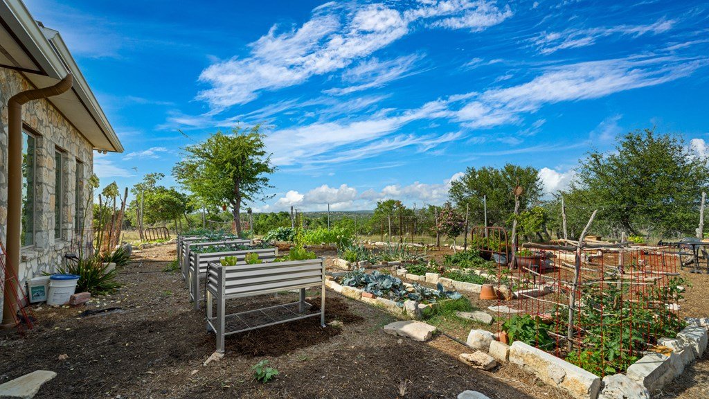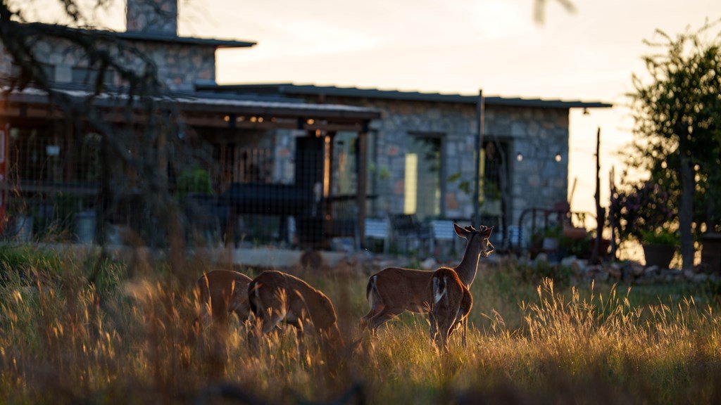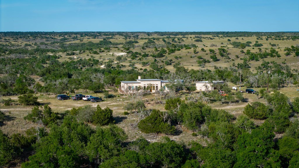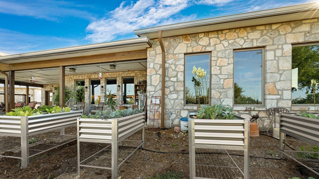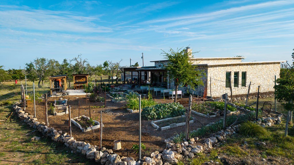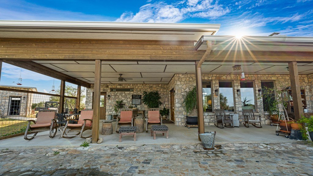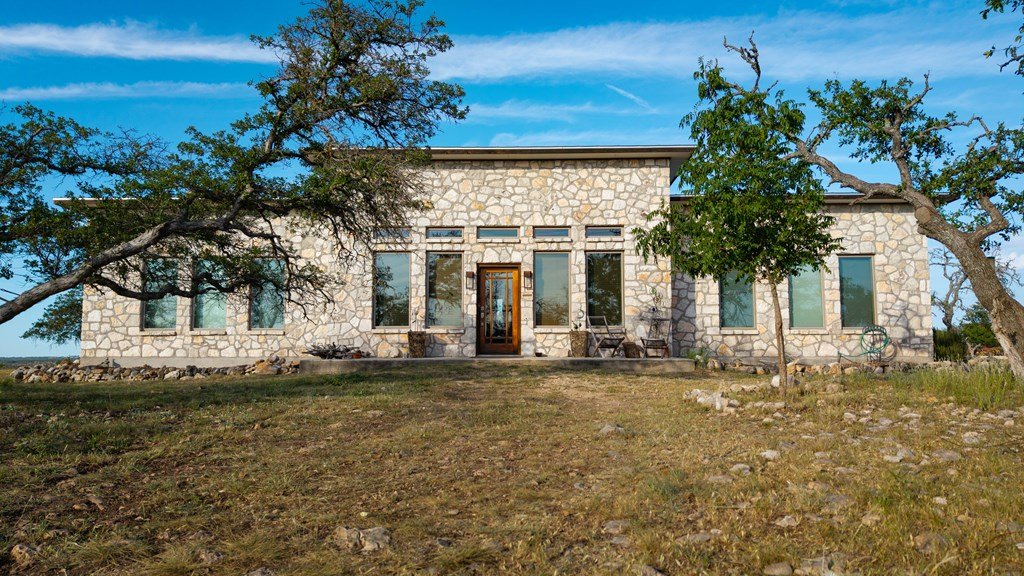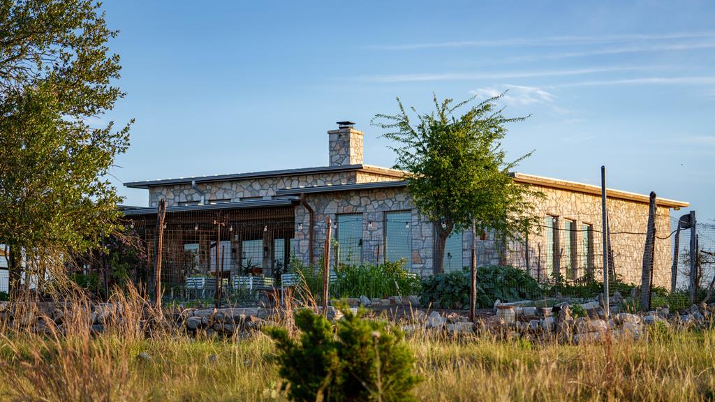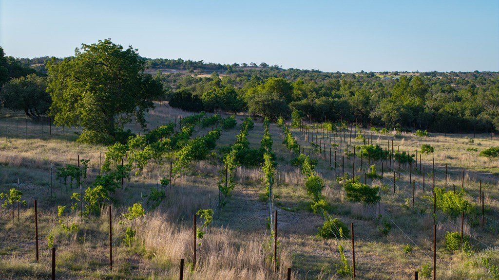 Experience refined living on 100 rolling acres just 13 miles from Fredericksburg. This eco-friendly estate blends modern efficiency with timeless Hill Country beauty. The custom main home features native rock construction, energy-efficient design, and panoramic views of oak-covered hills. Enjoy an open-concept layout with bamboo and slate floors, a chef's kitchen with Energy Star appliances, and expansive windows framing stunning vistas. Outdoor living shines with a spacious back porch, kitchen/grill area, fruit trees, and gardens. Additional highlights include a renovated guest house, 17-acre high-fenced vineyard, 30,000-gallon rainwater system with 100 +gpm well backup, wildlife exemption, and turnkey furnishings. Perfectly positioned for privacy yet convenient to Fredericksburg, Austin, and San Antonio, this property offers sustainable luxury in the heart of the Texas Hill Country.