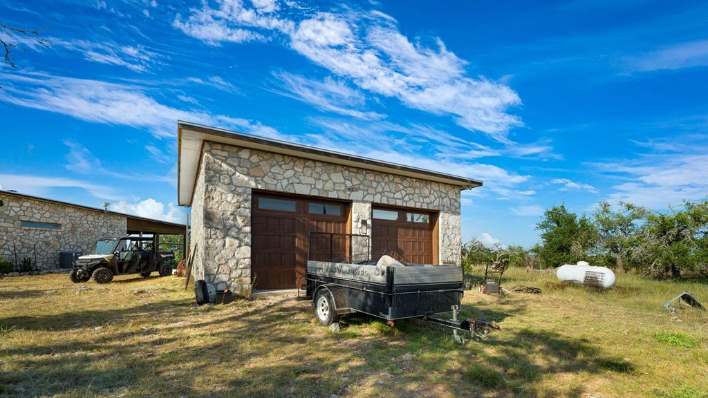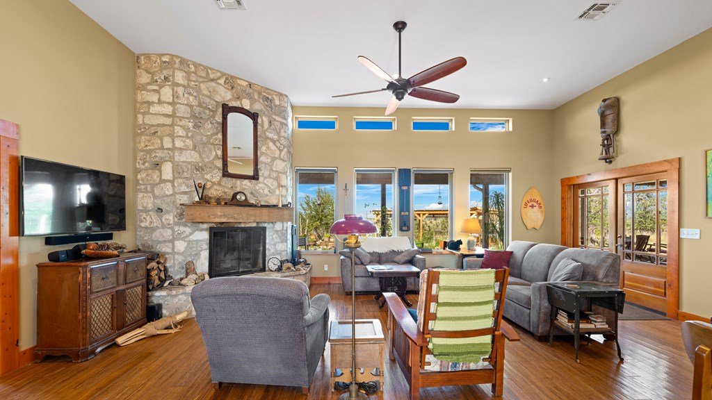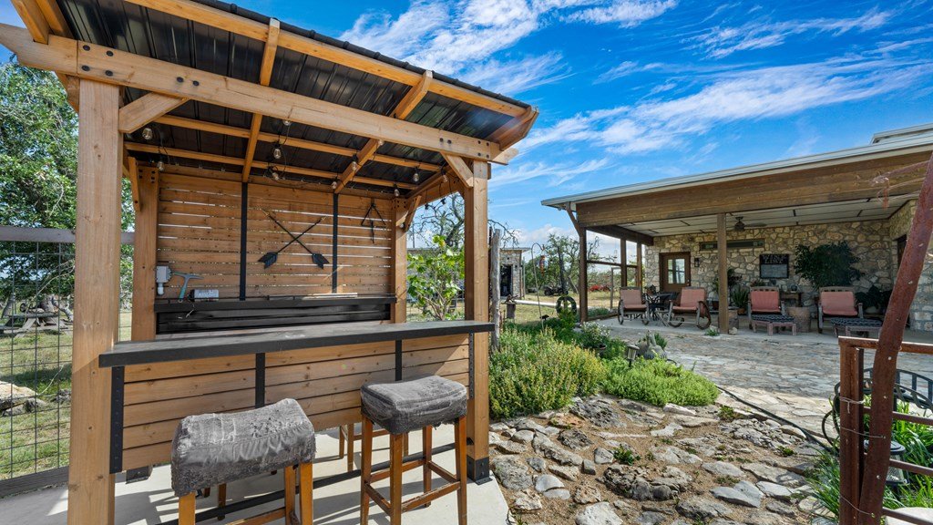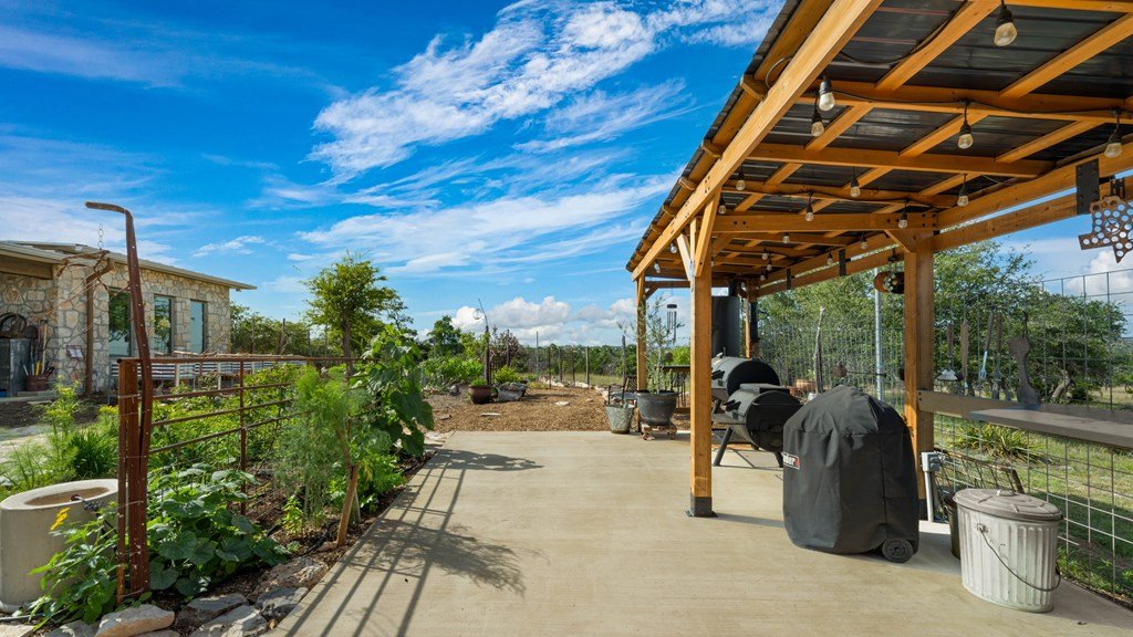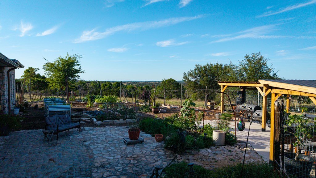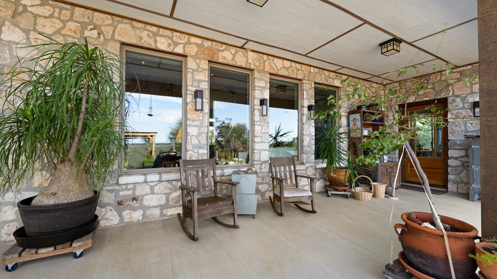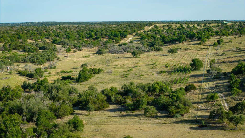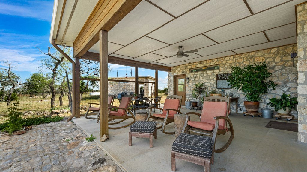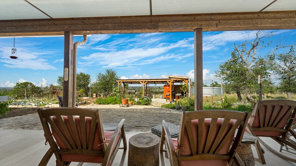 Experience refined living on 100 rolling acres just 13 miles from Fredericksburg. This eco-friendly estate blends modern efficiency with timeless Hill Country beauty. The custom main home features native rock construction, energy-efficient design, and panoramic views of oak-covered hills. Enjoy an open-concept layout with bamboo and slate floors, a chef's kitchen with Energy Star appliances, and expansive windows framing stunning vistas. Outdoor living shines with a spacious back porch, kitchen/grill area, fruit trees, and gardens. Additional highlights include a renovated guest house, 17-acre high-fenced vineyard, 30,000-gallon rainwater system with 100 +gpm well backup, wildlife exemption, and turnkey furnishings. Perfectly positioned for privacy yet convenient to Fredericksburg, Austin, and San Antonio, this property offers sustainable luxury in the heart of the Texas Hill Country.