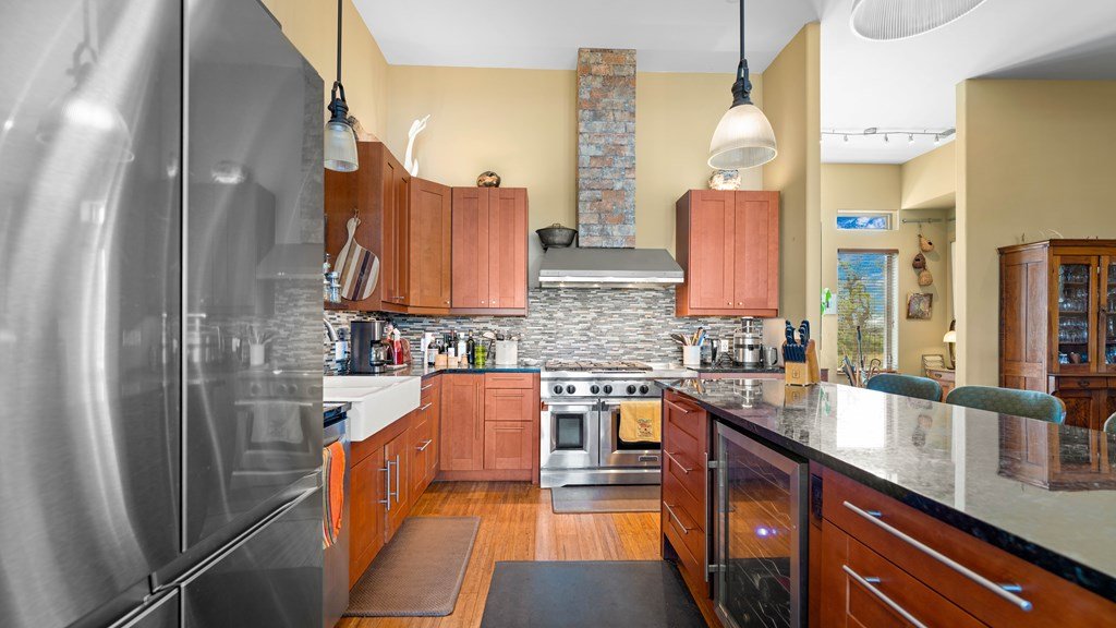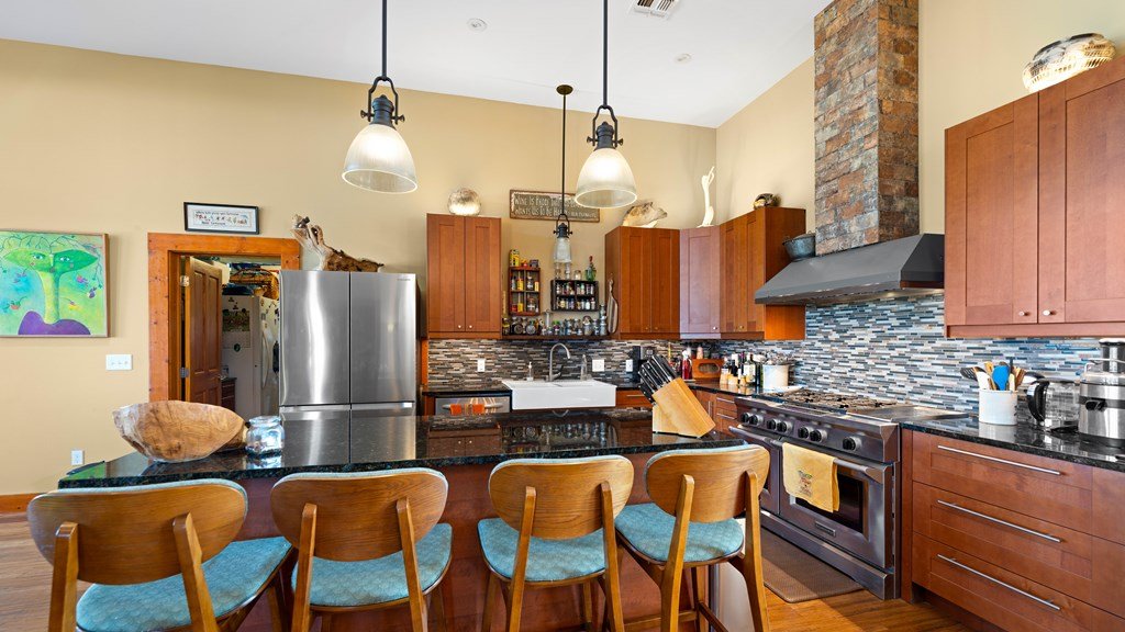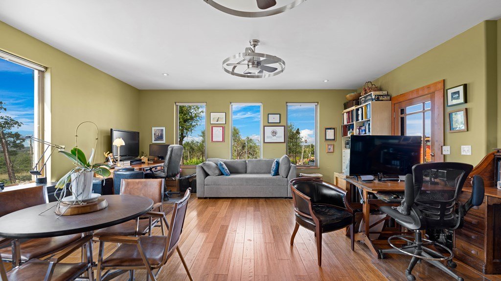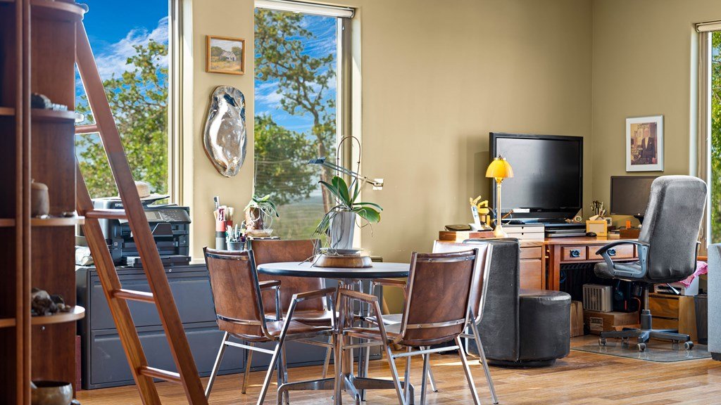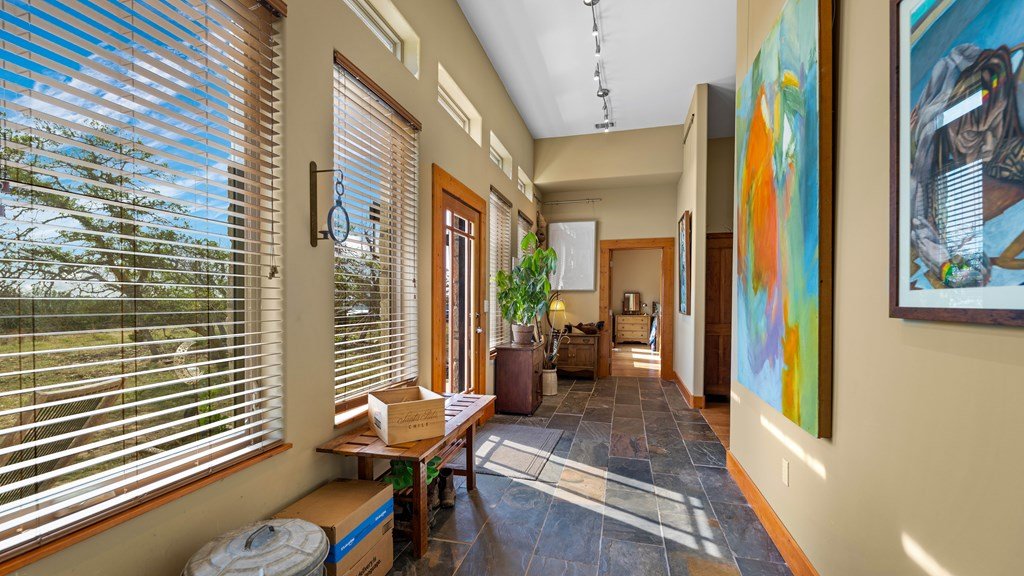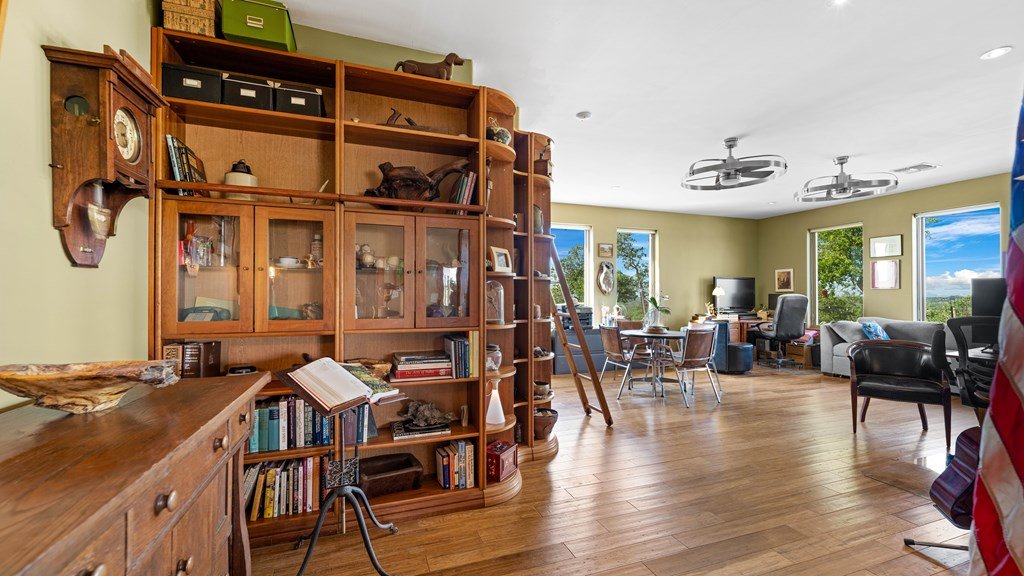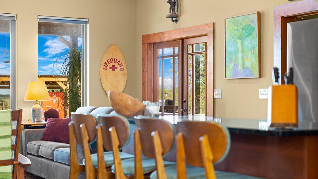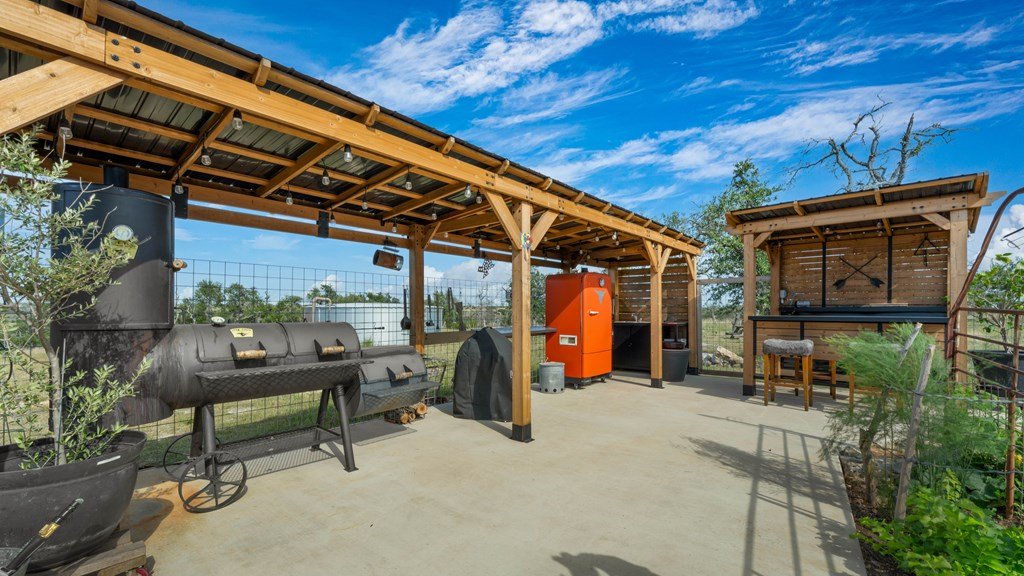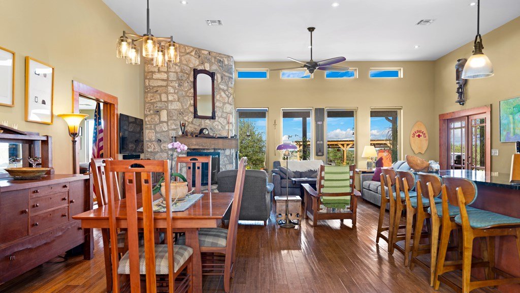 Experience refined living on 100 rolling acres just 13 miles from Fredericksburg. This eco-friendly estate blends modern efficiency with timeless Hill Country beauty. The custom main home features native rock construction, energy-efficient design, and panoramic views of oak-covered hills. Enjoy an open-concept layout with bamboo and slate floors, a chef's kitchen with Energy Star appliances, and expansive windows framing stunning vistas. Outdoor living shines with a spacious back porch, kitchen/grill area, fruit trees, and gardens. Additional highlights include a renovated guest house, 17-acre high-fenced vineyard, 30,000-gallon rainwater system with 100 +gpm well backup, wildlife exemption, and turnkey furnishings. Perfectly positioned for privacy yet convenient to Fredericksburg, Austin, and San Antonio, this property offers sustainable luxury in the heart of the Texas Hill Country.