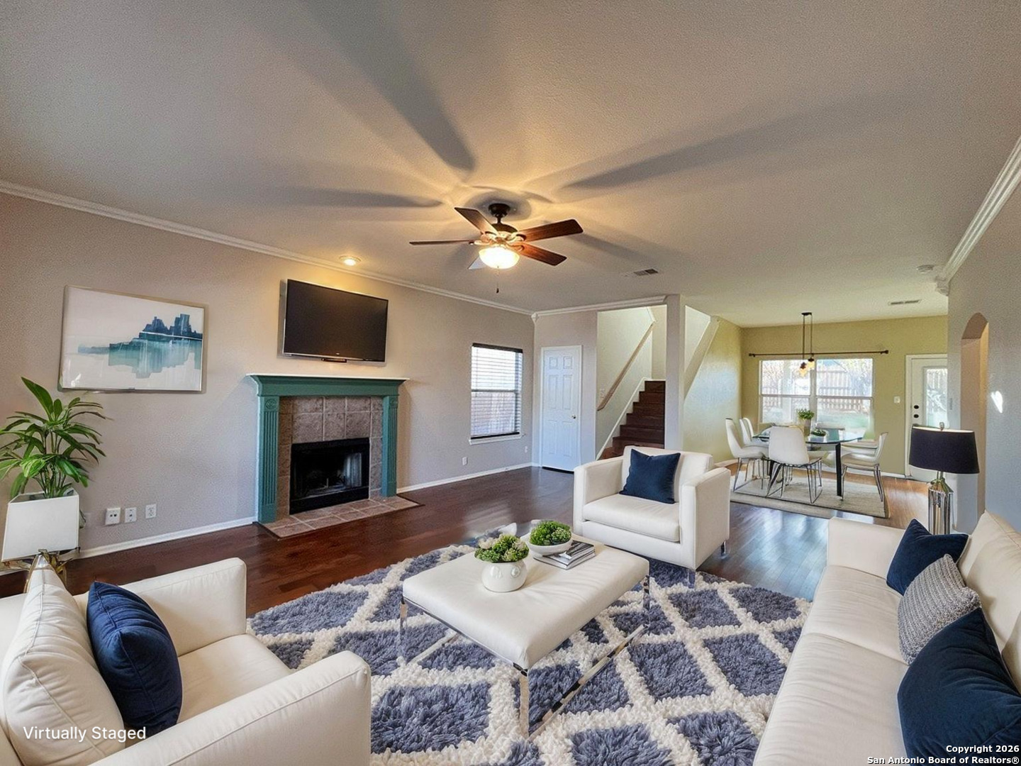 Welcome to this spacious 3-bedroom, 2.5-bathroom home, thoughtfully designed to offer modern comforts and a comfortable living space within a gated community. This residence features a combination of plush carpet, elegant ceramic tile, and durable vinyl flooring, creating a stylish and practical environment. As you enter, the inviting living room boasts a wood-burning fireplace, providing a cozy and warm ambiance for gatherings and relaxation. The eat-in kitchen offers a dedicated space for meals and entertaining. The kitchen is well-equipped with essential appliances, including a dishwasher, stove/range, and a microwave, ensuring convenience in meal preparation and everyday living. The primary bedroom is your private sanctuary, featuring an ensuite with a convenient shower/garden tub combo and a spacious walk-in closet. The home includes an upstairs closet laundry room with a dryer, simplifying your daily routines. Step outside to the backyard, where you'll discover a covered patio, perfect for outdoor relaxation or dining. Mature trees add natural beauty to the surroundings, all within the confines of a privacy fence. Additionally, this home includes a 1-car garage, offering shelter for your vehicle and additional storage space. With its modern comforts, inviting design, and secure gated community setting, this home presents an excellent rental opportunity. "*Our award winning Resident Benefits Package (RBP) required program includes Liability Insurance, Pest Control, Monthly Air Filter Delivery, Move-in Concierge (utilities/cable/internet), Credit Building, Resident Rewards, Identity Fraud Protection and more for only $65/mo. *If you provide your own insurance policy, the RBP cost will be reduced. Optional Premium Upgrades Available as well, More details in application. *PET APPS $30 with credit card/debit payment per profile or $25 by ACH per profile. All information in this marketing material is deemed reliable but is not guaranteed. Prospective tenants are advised to independently verify all information, including property features, availability, and lease terms, to their satisfaction. *some marketing photos may be virtually staged images*"