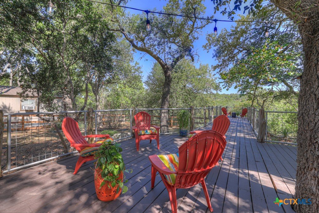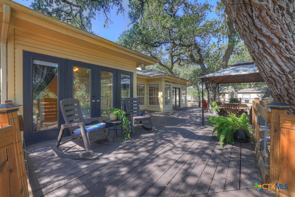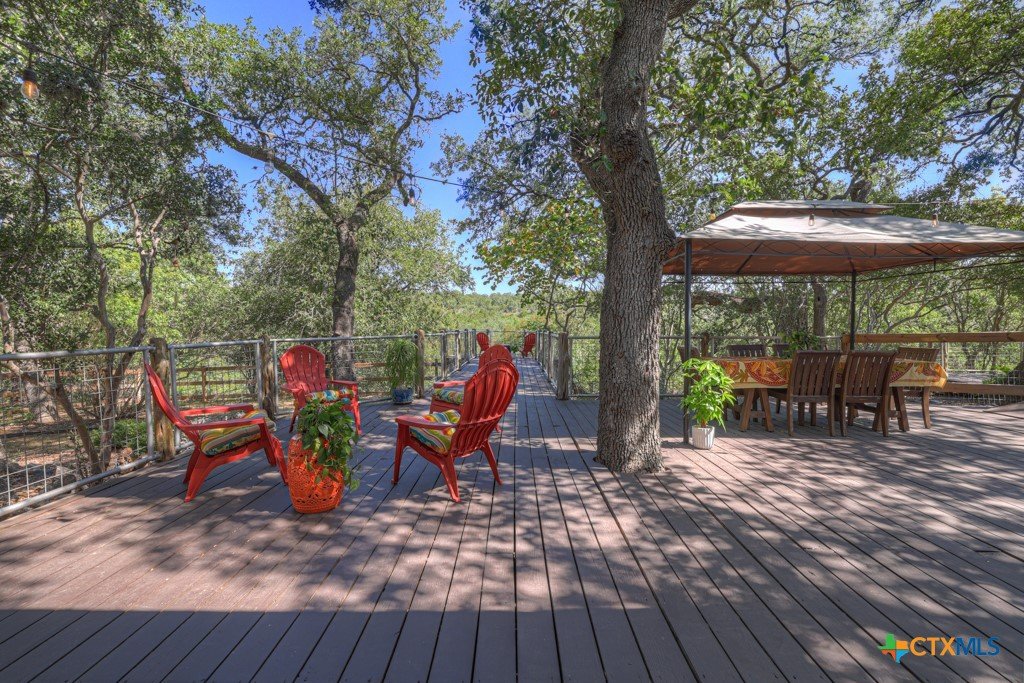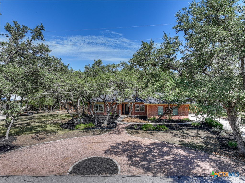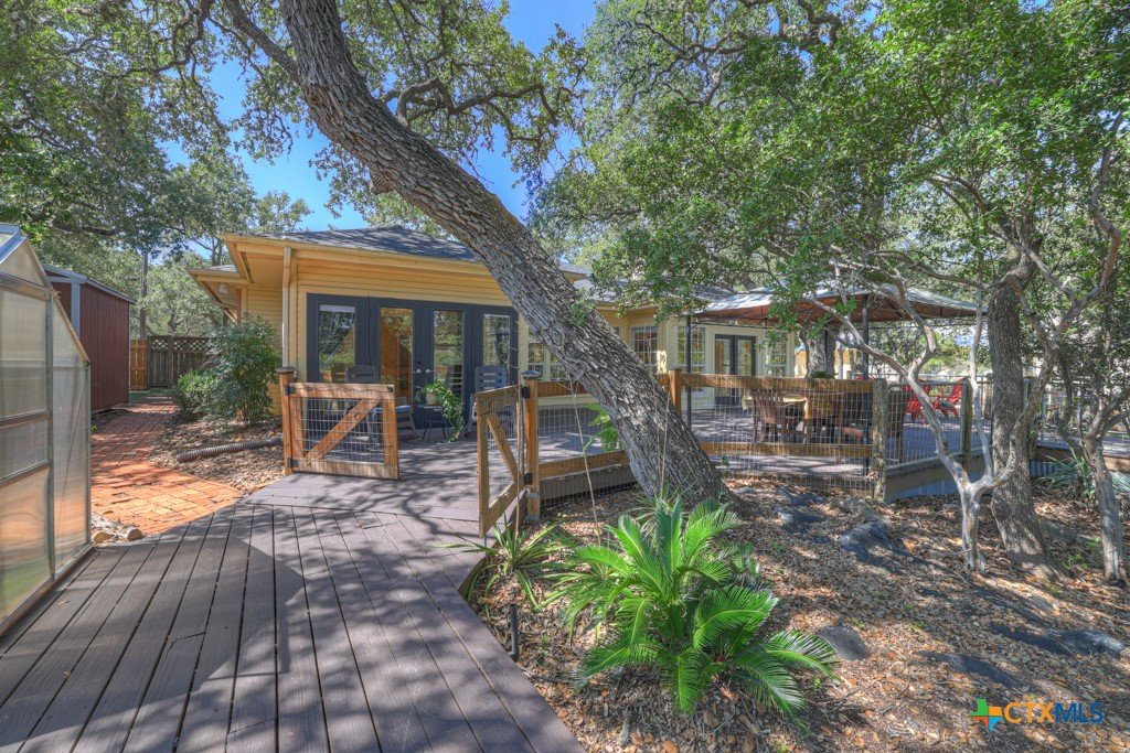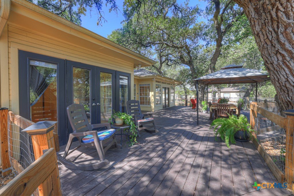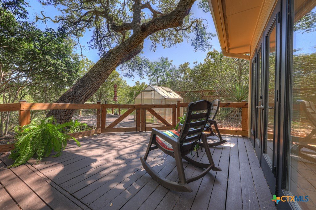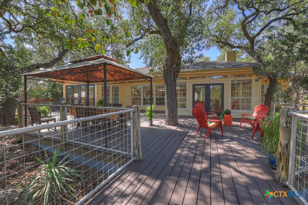 This custom brick home in the Estates of San Marcos is set on a one-acre lot that backs directly to the City’s protected Purgatory Park green space, with Purgatory Creek running across the back of the property. The natural drop in the terrain creates long Hill Country sunset views and enhances the sense of privacy. A canopy of mature oak trees shades the expansive, level deck, which offers multiple seating areas designed for gatherings, outdoor dining, or simply enjoying the quiet park-like surroundings. The home takes advantage of its setting with windows across the back, bringing in views from the living, dining, and sunroom spaces. The open layout allows the large living area to be arranged in different ways, with room for two living and two dining areas if desired. A brick fireplace with custom built-ins serves as the centerpiece, with a propane connection providing warmth and ambiance without the upkeep of a traditional wood-burning fire. Two patios have been enclosed to create sunrooms, adding flexible space for year-round enjoyment. The primary suite includes a trayed ceiling, walk-in closet, soaking tub, separate shower, and direct access to both a sunroom and the deck. Secondary bedrooms are set apart from the primary for privacy, and a dedicated office offers convenience for remote work or study. Recent upgrades include new 30-year shingles and an aerobic septic system. The property also features a newer 8x10 storage building, a greenhouse, and an RV plug. Located on a quiet cul-de-sac in a well-maintained neighborhood, this home combines thoughtful updates on the custom design, and a setting that is difficult to find—acreage, privacy, and Hill Country views, all within minutes of Downtown San Marcos and Texas State University, with low county property tax rates and no HOA.