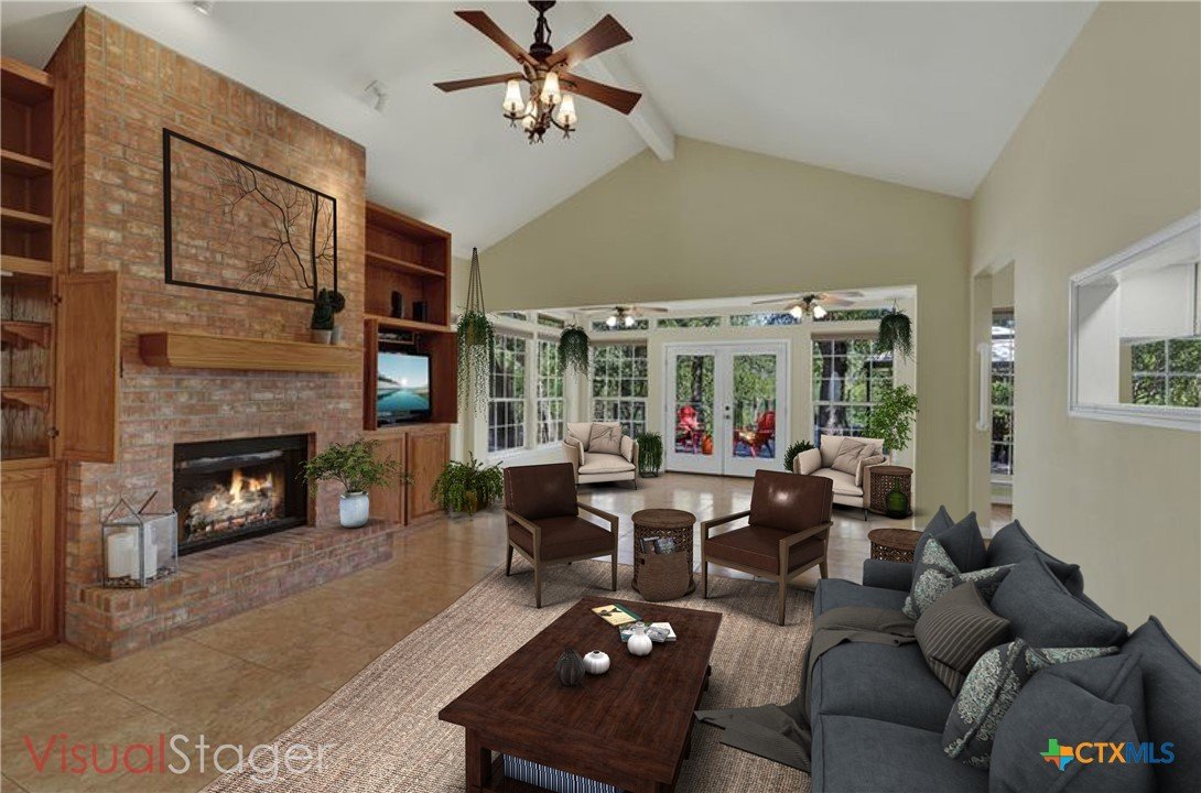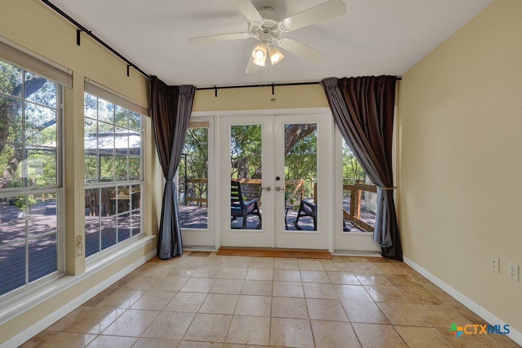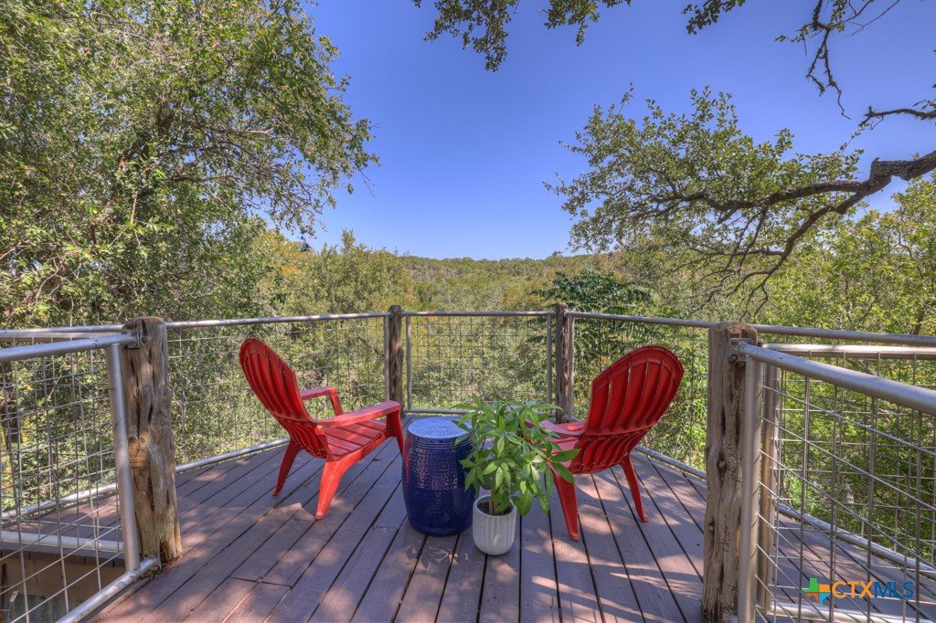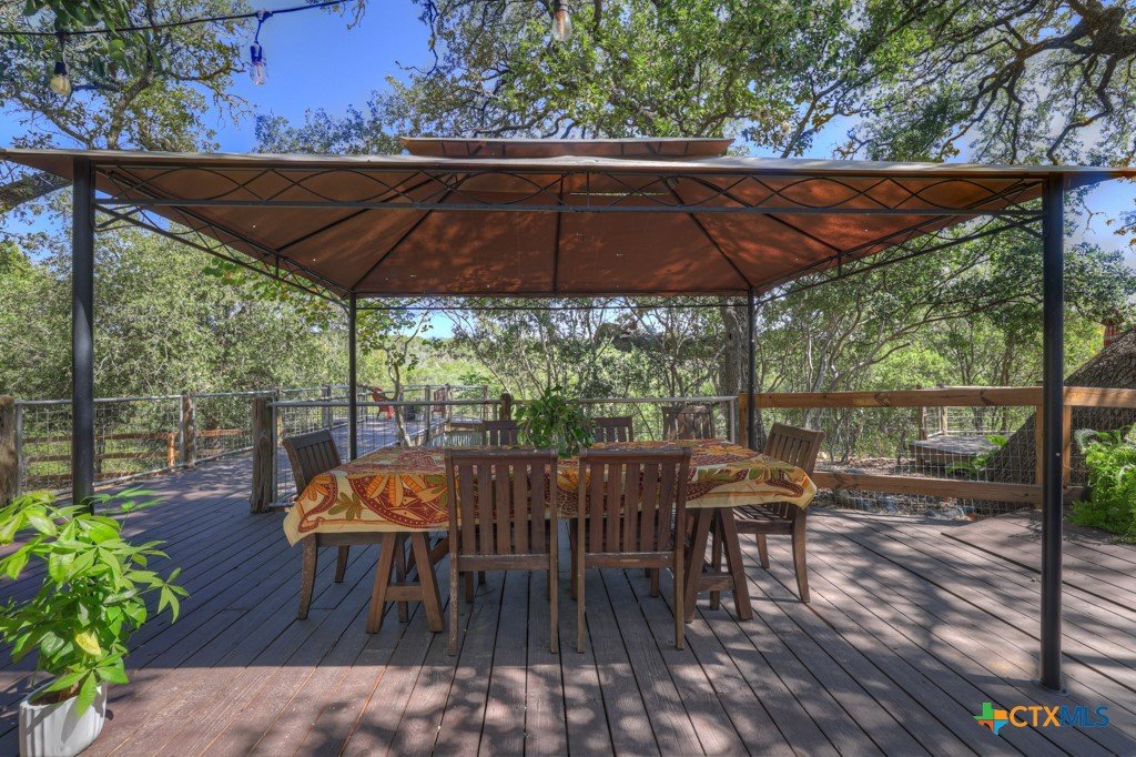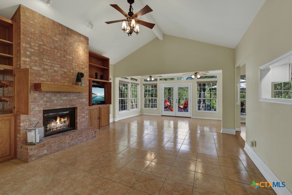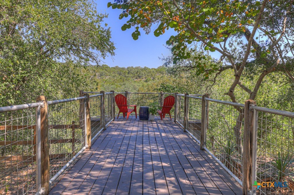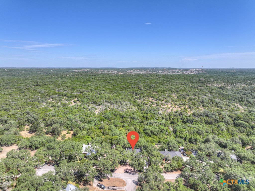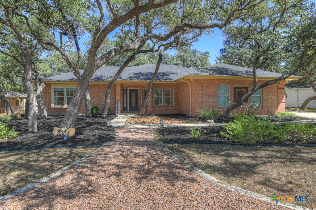 This custom brick home in the Estates of San Marcos is set on a one-acre lot that backs directly to the City’s protected Purgatory Park green space, with Purgatory Creek running across the back of the property. The natural drop in the terrain creates long Hill Country sunset views and enhances the sense of privacy. A canopy of mature oak trees shades the expansive, level deck, which offers multiple seating areas designed for gatherings, outdoor dining, or simply enjoying the quiet park-like surroundings. The home takes advantage of its setting with windows across the back, bringing in views from the living, dining, and sunroom spaces. The open layout allows the large living area to be arranged in different ways, with room for two living and two dining areas if desired. A brick fireplace with custom built-ins serves as the centerpiece, with a propane connection providing warmth and ambiance without the upkeep of a traditional wood-burning fire. Two patios have been enclosed to create sunrooms, adding flexible space for year-round enjoyment. The primary suite includes a trayed ceiling, walk-in closet, soaking tub, separate shower, and direct access to both a sunroom and the deck. Secondary bedrooms are set apart from the primary for privacy, and a dedicated office offers convenience for remote work or study. Recent upgrades include new 30-year shingles and an aerobic septic system. The property also features a newer 8x10 storage building, a greenhouse, and an RV plug. Located on a quiet cul-de-sac in a well-maintained neighborhood, this home combines thoughtful updates on the custom design, and a setting that is difficult to find—acreage, privacy, and Hill Country views, all within minutes of Downtown San Marcos and Texas State University, with low county property tax rates and no HOA.