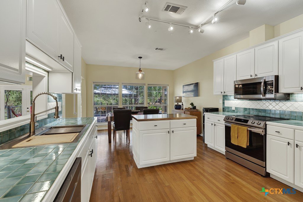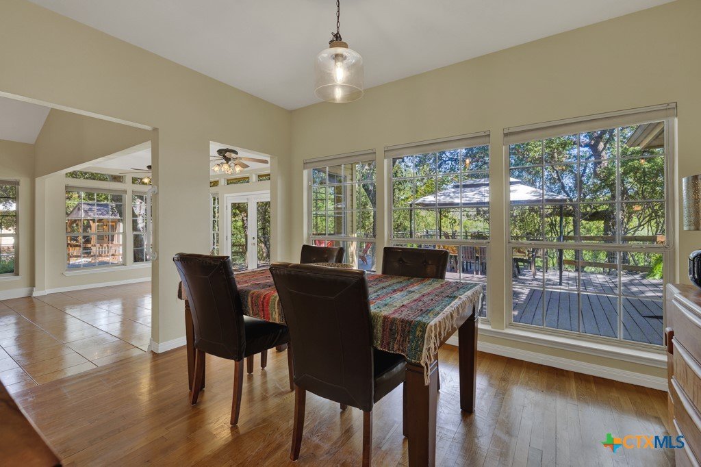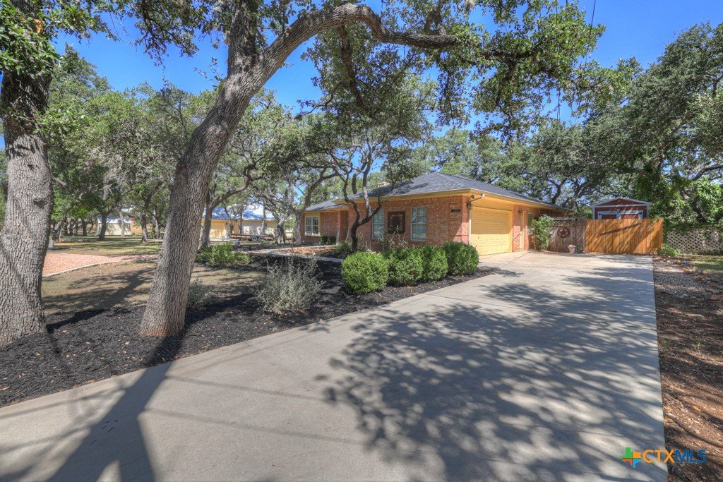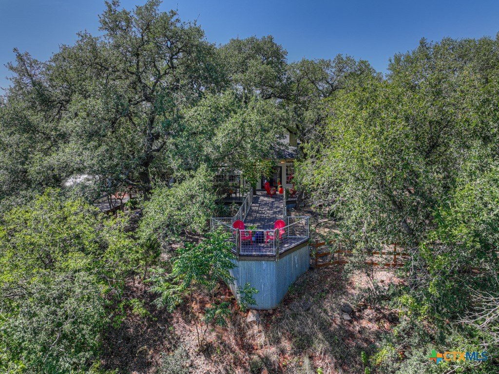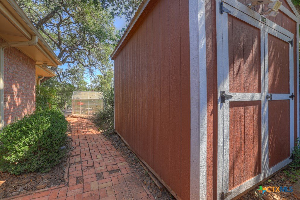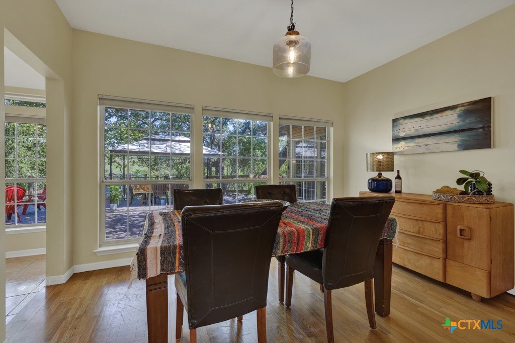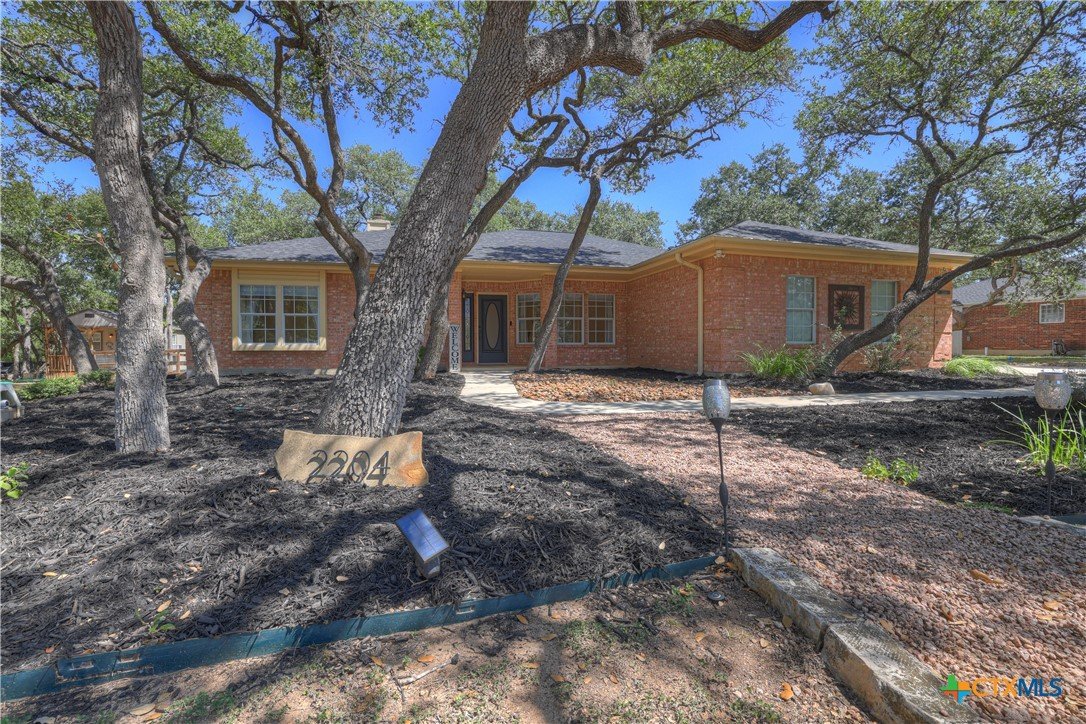 This custom brick home in the Estates of San Marcos is set on a one-acre lot that backs directly to the City’s protected Purgatory Park green space, with Purgatory Creek running across the back of the property. The natural drop in the terrain creates long Hill Country sunset views and enhances the sense of privacy. A canopy of mature oak trees shades the expansive, level deck, which offers multiple seating areas designed for gatherings, outdoor dining, or simply enjoying the quiet park-like surroundings. The home takes advantage of its setting with windows across the back, bringing in views from the living, dining, and sunroom spaces. The open layout allows the large living area to be arranged in different ways, with room for two living and two dining areas if desired. A brick fireplace with custom built-ins serves as the centerpiece, with a propane connection providing warmth and ambiance without the upkeep of a traditional wood-burning fire. Two patios have been enclosed to create sunrooms, adding flexible space for year-round enjoyment. The primary suite includes a trayed ceiling, walk-in closet, soaking tub, separate shower, and direct access to both a sunroom and the deck. Secondary bedrooms are set apart from the primary for privacy, and a dedicated office offers convenience for remote work or study. Recent upgrades include new 30-year shingles and an aerobic septic system. The property also features a newer 8x10 storage building, a greenhouse, and an RV plug. Located on a quiet cul-de-sac in a well-maintained neighborhood, this home combines thoughtful updates on the custom design, and a setting that is difficult to find—acreage, privacy, and Hill Country views, all within minutes of Downtown San Marcos and Texas State University, with low county property tax rates and no HOA.