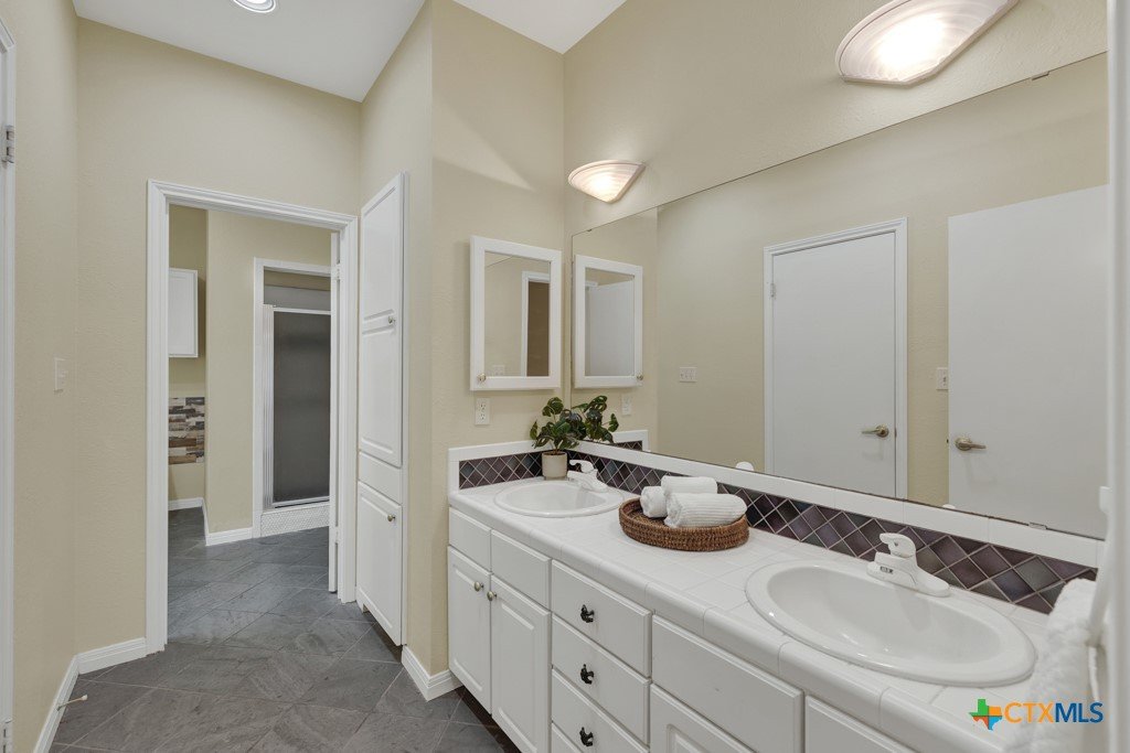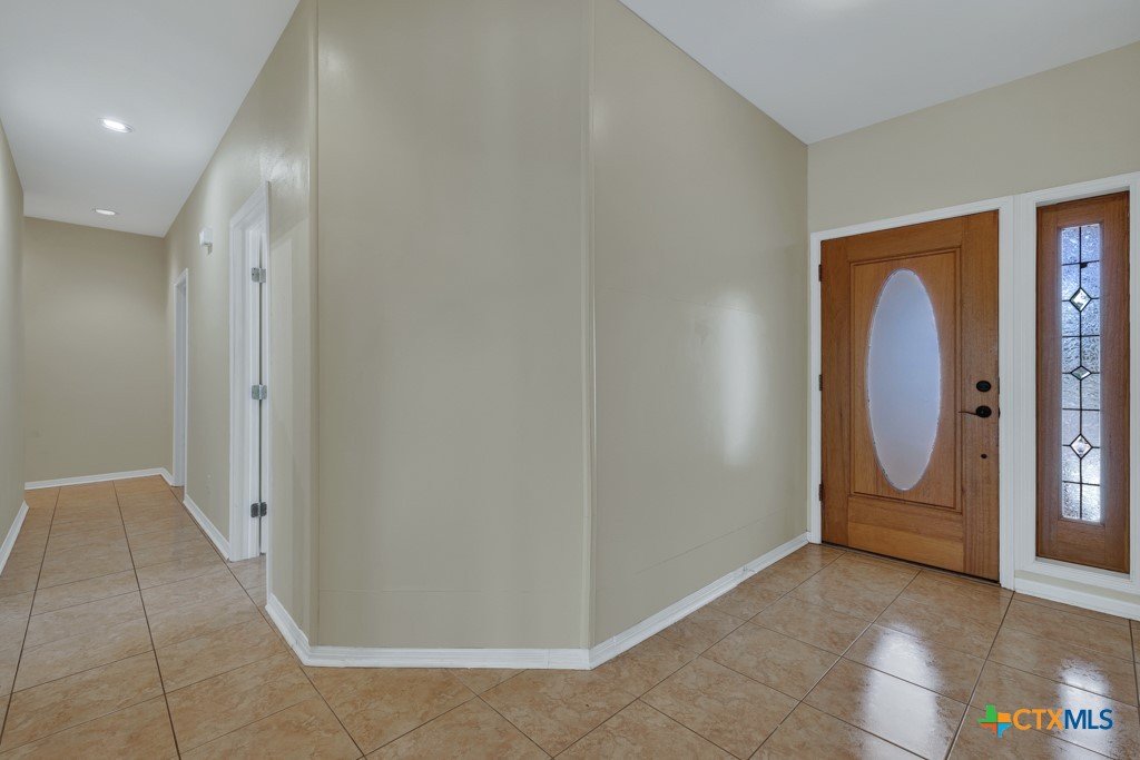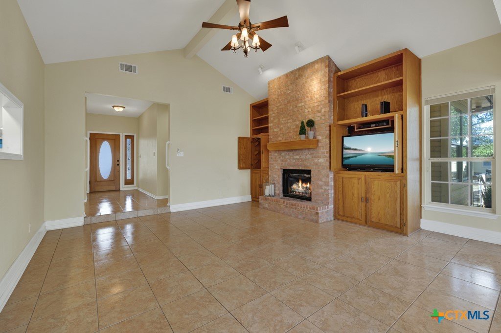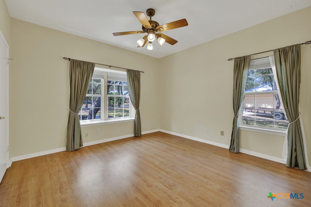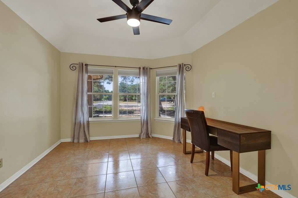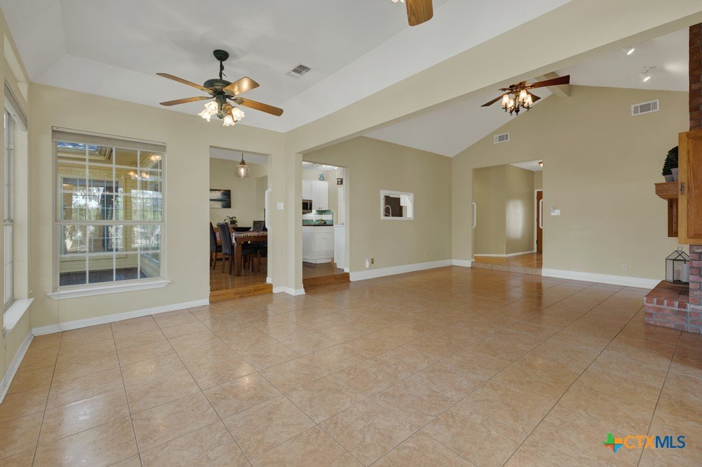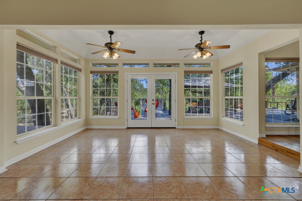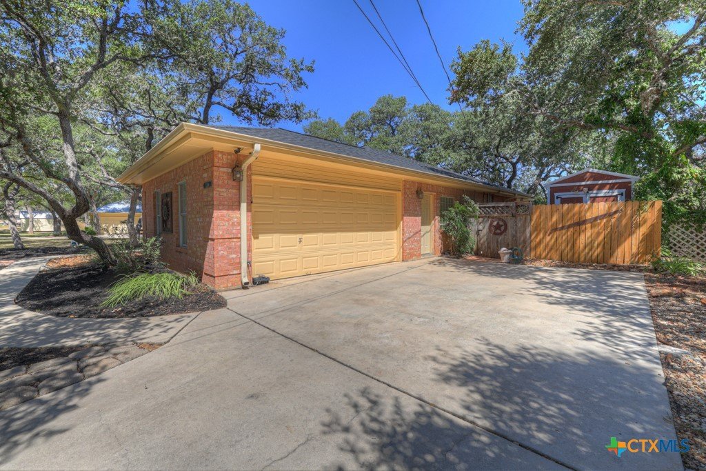 This custom brick home in the Estates of San Marcos is set on a one-acre lot that backs directly to the City’s protected Purgatory Park green space, with Purgatory Creek running across the back of the property. The natural drop in the terrain creates long Hill Country sunset views and enhances the sense of privacy. A canopy of mature oak trees shades the expansive, level deck, which offers multiple seating areas designed for gatherings, outdoor dining, or simply enjoying the quiet park-like surroundings. The home takes advantage of its setting with windows across the back, bringing in views from the living, dining, and sunroom spaces. The open layout allows the large living area to be arranged in different ways, with room for two living and two dining areas if desired. A brick fireplace with custom built-ins serves as the centerpiece, with a propane connection providing warmth and ambiance without the upkeep of a traditional wood-burning fire. Two patios have been enclosed to create sunrooms, adding flexible space for year-round enjoyment. The primary suite includes a trayed ceiling, walk-in closet, soaking tub, separate shower, and direct access to both a sunroom and the deck. Secondary bedrooms are set apart from the primary for privacy, and a dedicated office offers convenience for remote work or study. Recent upgrades include new 30-year shingles and an aerobic septic system. The property also features a newer 8x10 storage building, a greenhouse, and an RV plug. Located on a quiet cul-de-sac in a well-maintained neighborhood, this home combines thoughtful updates on the custom design, and a setting that is difficult to find—acreage, privacy, and Hill Country views, all within minutes of Downtown San Marcos and Texas State University, with low county property tax rates and no HOA.