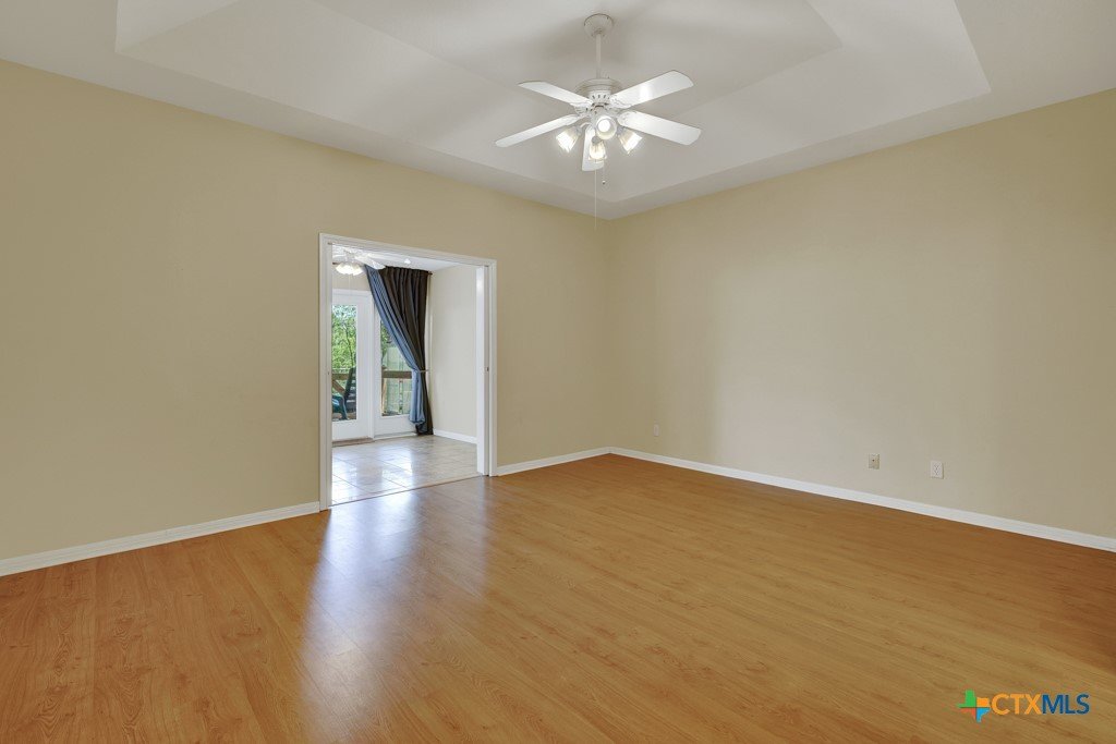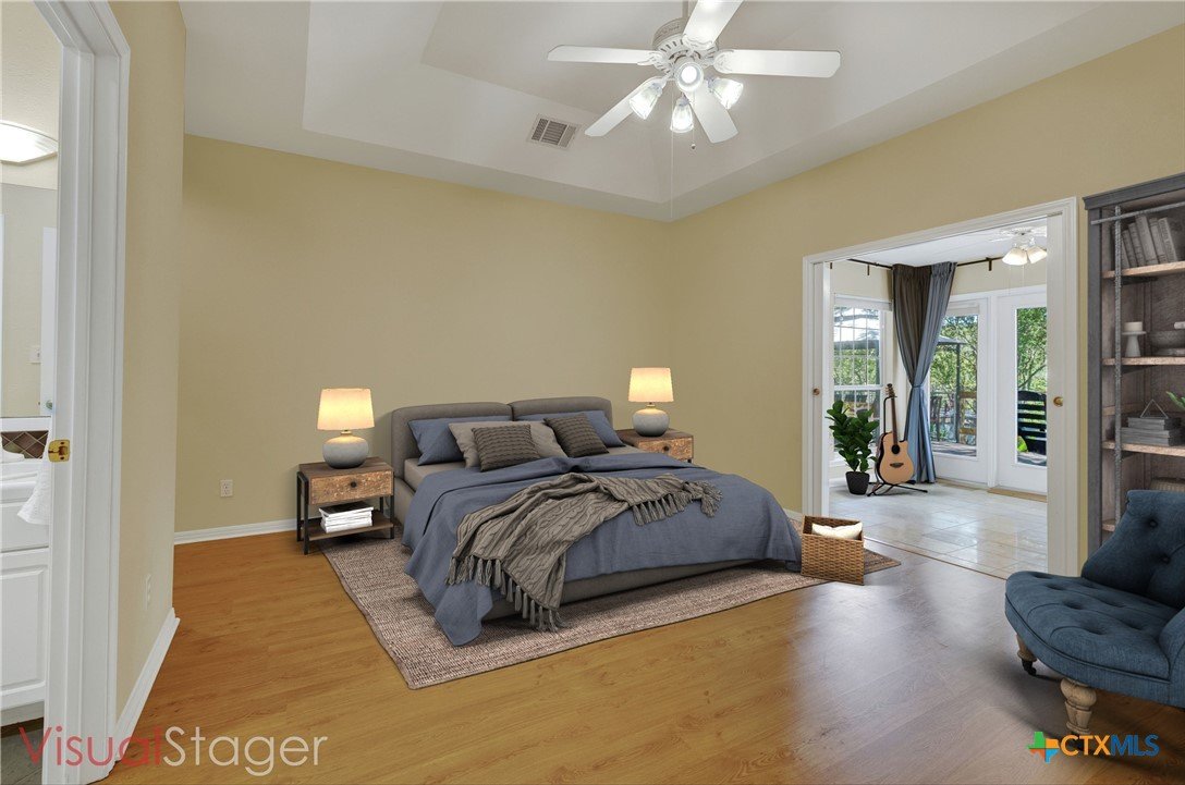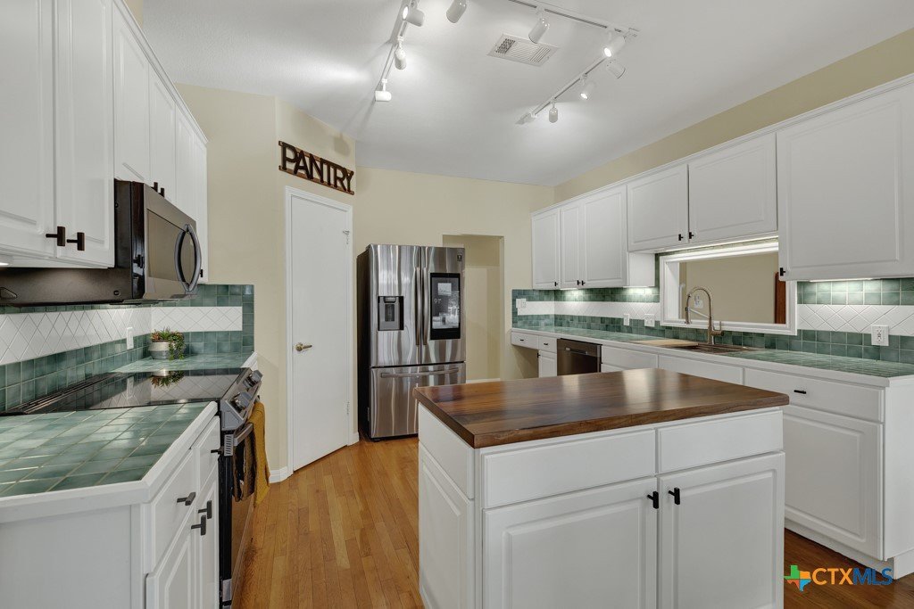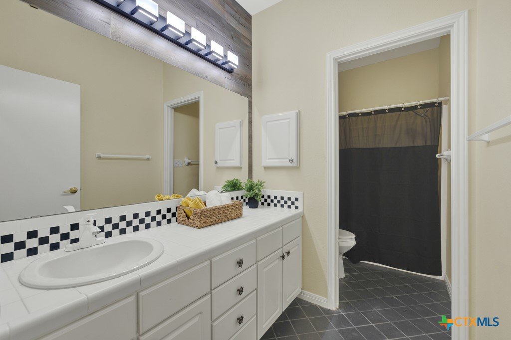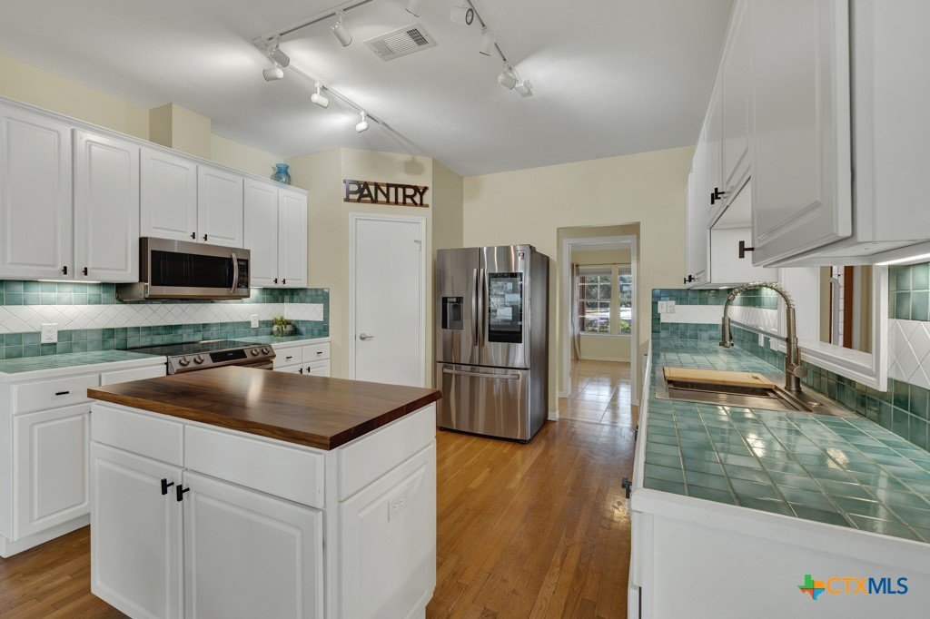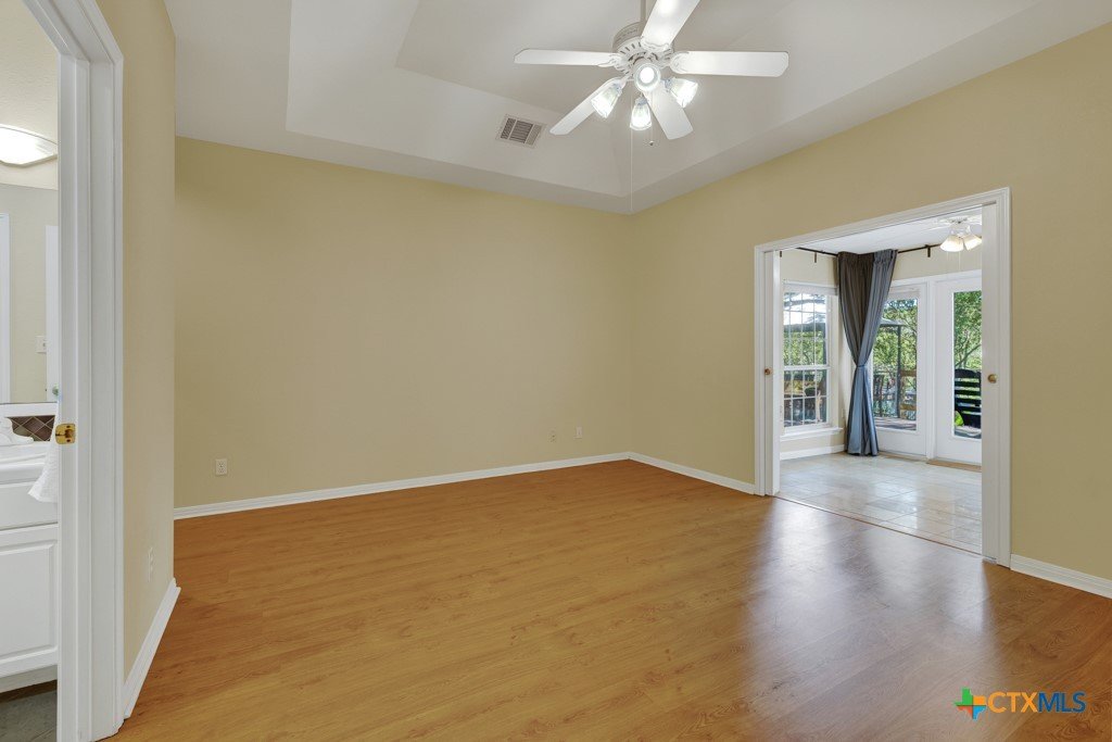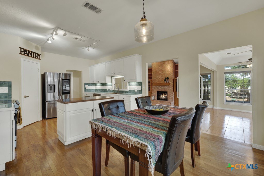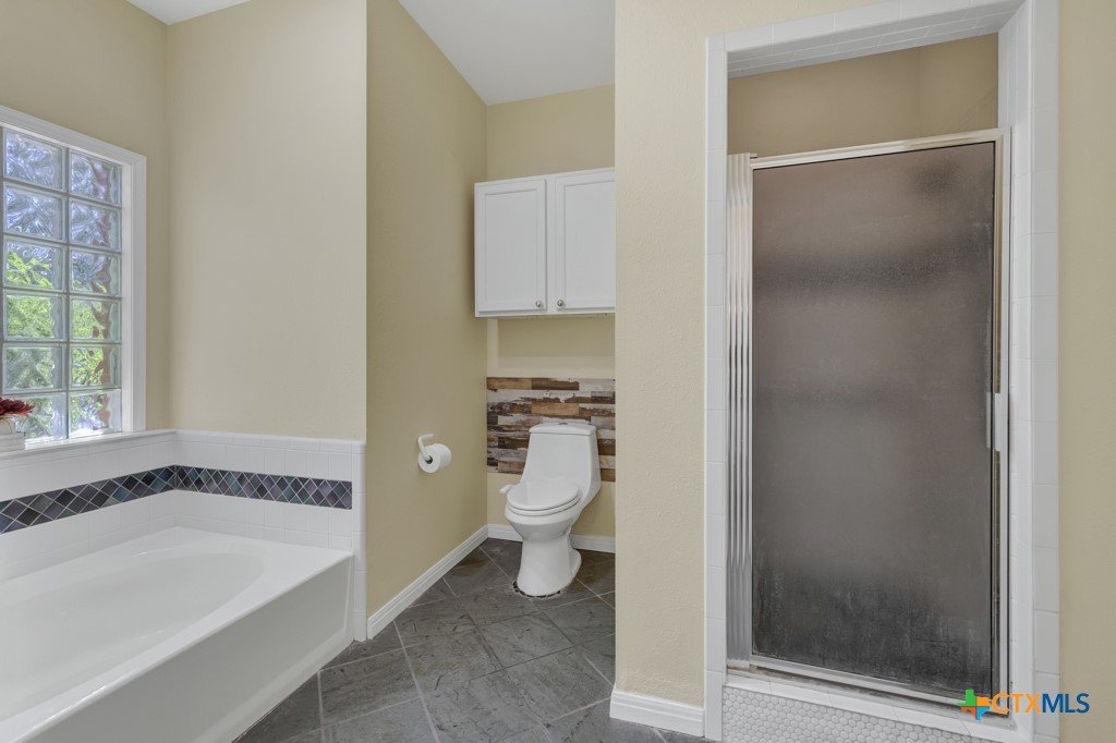 This custom brick home in the Estates of San Marcos is set on a one-acre lot that backs directly to the City’s protected Purgatory Park green space, with Purgatory Creek running across the back of the property. The natural drop in the terrain creates long Hill Country sunset views and enhances the sense of privacy. A canopy of mature oak trees shades the expansive, level deck, which offers multiple seating areas designed for gatherings, outdoor dining, or simply enjoying the quiet park-like surroundings. The home takes advantage of its setting with windows across the back, bringing in views from the living, dining, and sunroom spaces. The open layout allows the large living area to be arranged in different ways, with room for two living and two dining areas if desired. A brick fireplace with custom built-ins serves as the centerpiece, with a propane connection providing warmth and ambiance without the upkeep of a traditional wood-burning fire. Two patios have been enclosed to create sunrooms, adding flexible space for year-round enjoyment. The primary suite includes a trayed ceiling, walk-in closet, soaking tub, separate shower, and direct access to both a sunroom and the deck. Secondary bedrooms are set apart from the primary for privacy, and a dedicated office offers convenience for remote work or study. Recent upgrades include new 30-year shingles and an aerobic septic system. The property also features a newer 8x10 storage building, a greenhouse, and an RV plug. Located on a quiet cul-de-sac in a well-maintained neighborhood, this home combines thoughtful updates on the custom design, and a setting that is difficult to find—acreage, privacy, and Hill Country views, all within minutes of Downtown San Marcos and Texas State University, with low county property tax rates and no HOA.