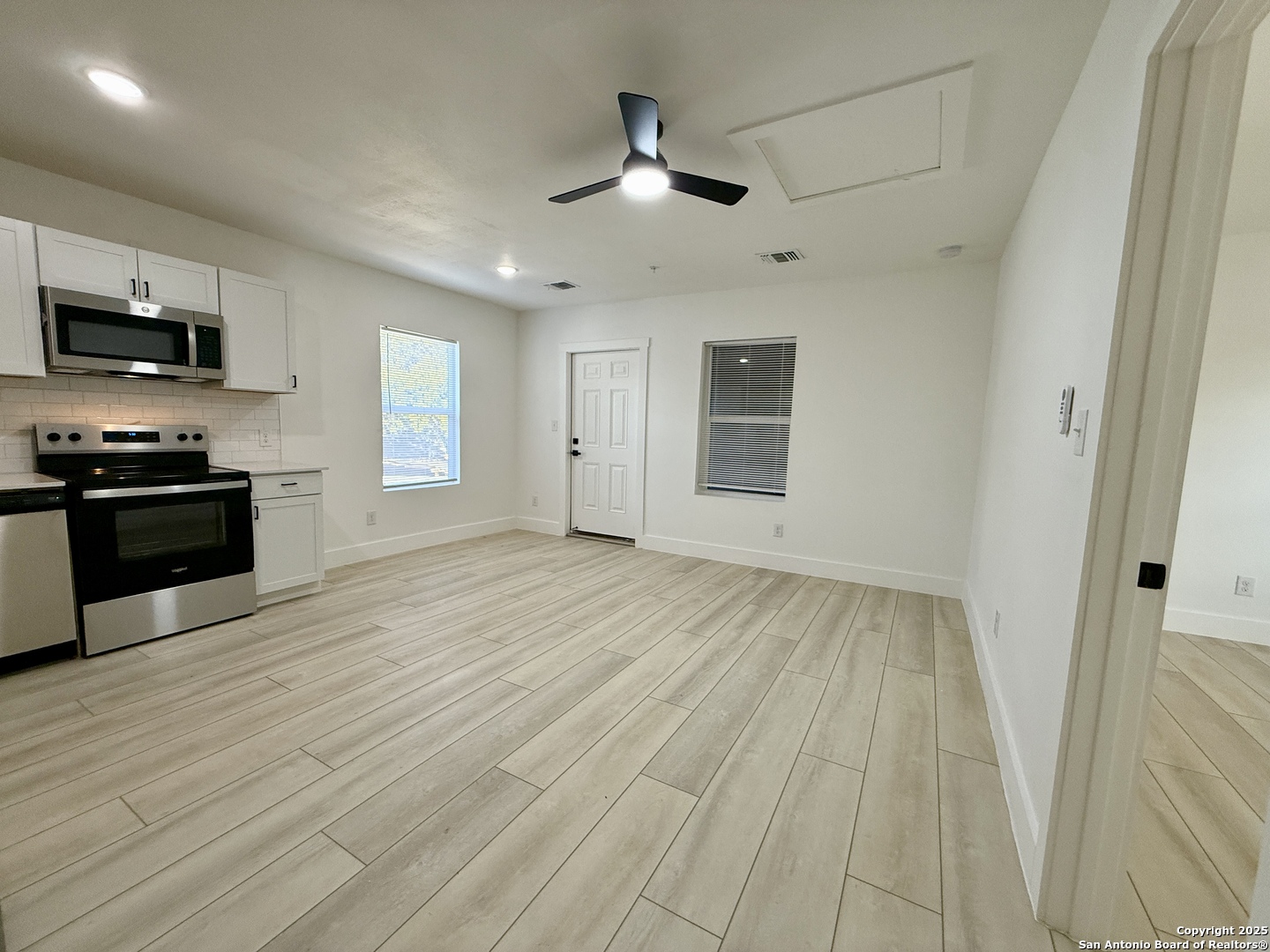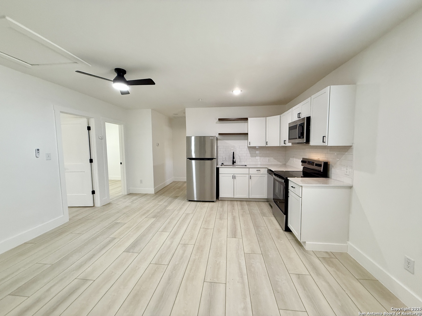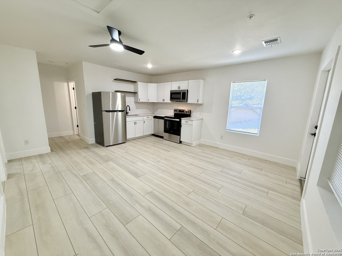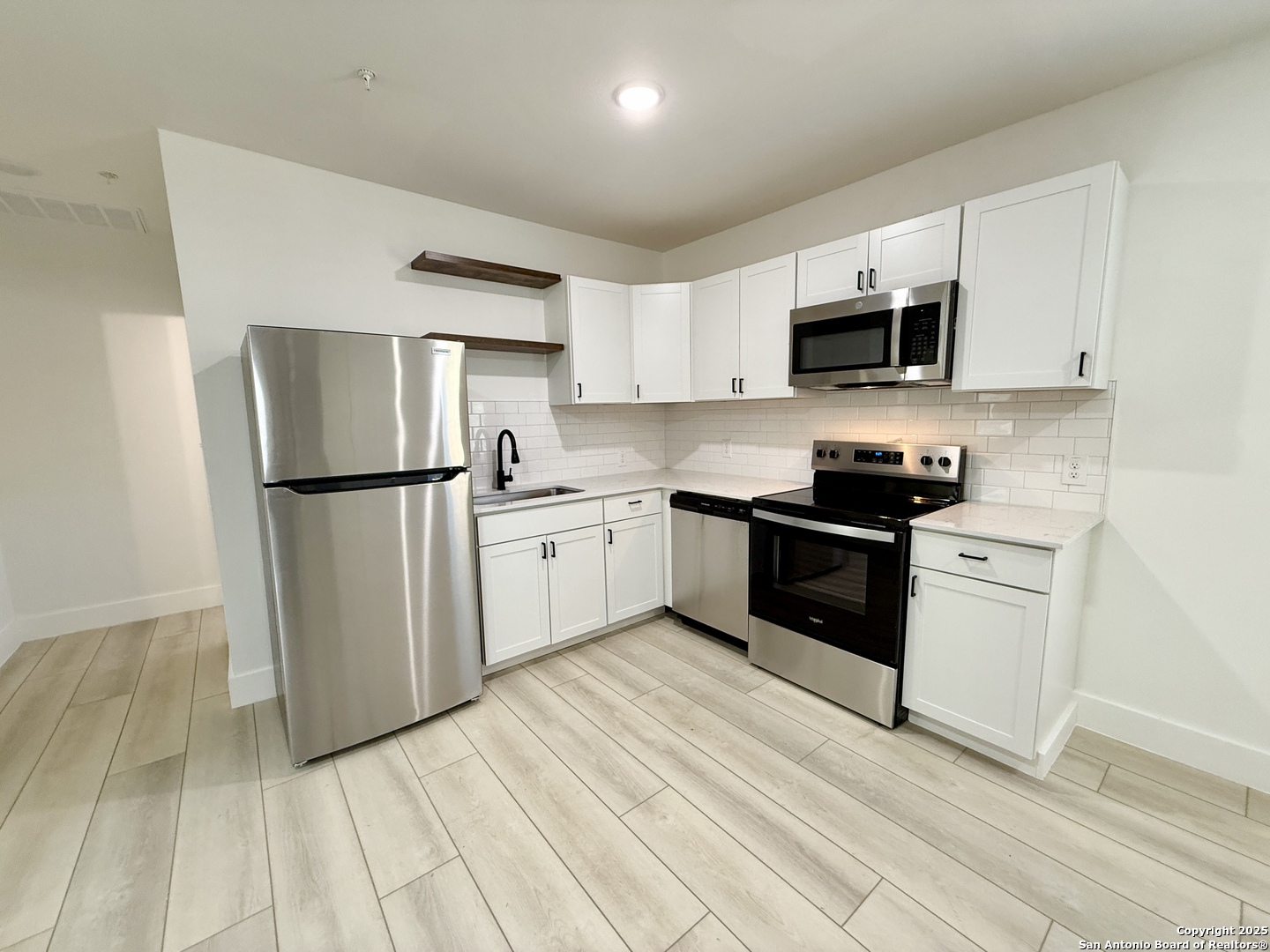 Receive TWO WEEKS FREE-Owner offering a rental rebate with 12 or 18 month lease! Be the first to occupy this fully renovated 2 bedroom, 1 bath second story rental near popular downtown New Braunfels. This fully upgraded multi-family unit is ready for move in now! Castlewood oak laminate flooring throughout. Kitchen features gorgeous granite countertops & ceramic white subway tile backsplash. Upgraded kitchen faucet and hardware on cabinets & drawers, Espresso floating shelves for extra storage. Kitchen complete with brand new stainless appliances including Fridge, Microwave, Range & Dishwasher. This residence offers one full bath with a stylish shower/tub combo featuring a luxury showerhead. Walk-in closet in bedrooms with window for natural light. Central heat & AC. Fresh sod installed. Washer & dryer access onsite. Garage parking & Covered parking available for an additional fee, while supplies last. Each unit has its own electric meter- tenant responsibility. Water is $75/month in addition to rent. Renters insurance required. Don't wait to receive your rental rebate incentive today!