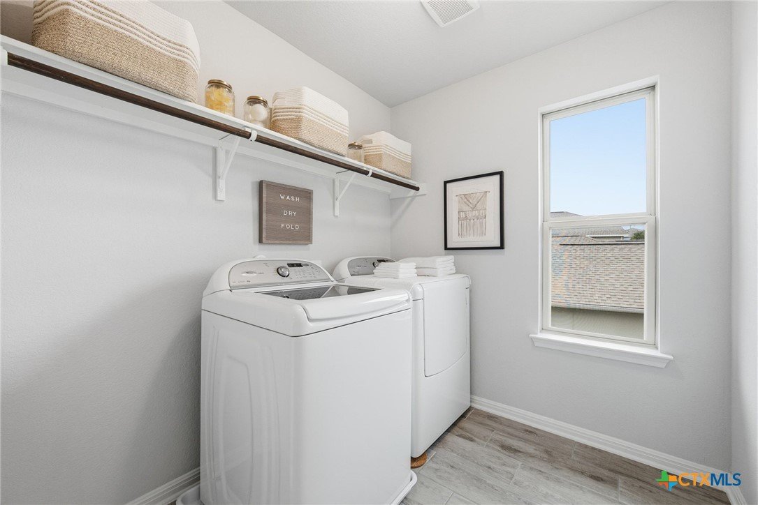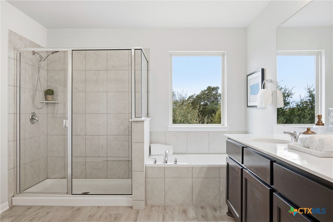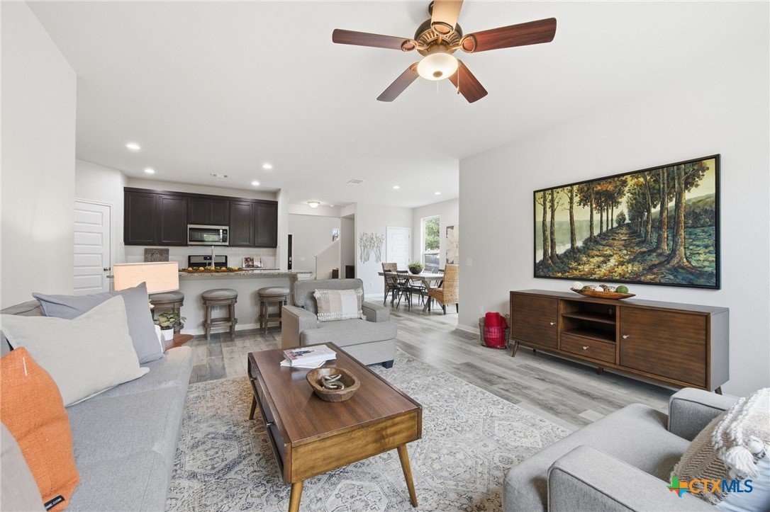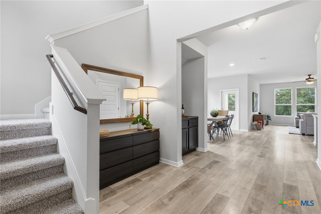 Located on a larger lot in the desirable Gatlin Creek neighborhood, this 2,716-square-foot two-story home offers a flexible floor plan, abundant storage, and inviting indoor-outdoor living. A welcoming entry with high ceilings opens to an open-concept kitchen, living, and dining area. The kitchen features granite countertops, a gas range, and walk-in pantry, while the dining area comfortably seats 6–8. A main-level bedroom and full bath provide excellent flexibility. Upstairs, a spacious game room separates the primary suite from secondary bedrooms. The primary suite offers treetop views, two walk-in closets, a soaking tub, and separate shower. Enjoy a covered back patio overlooking a large open yard, plus a covered front porch and mature oak trees.