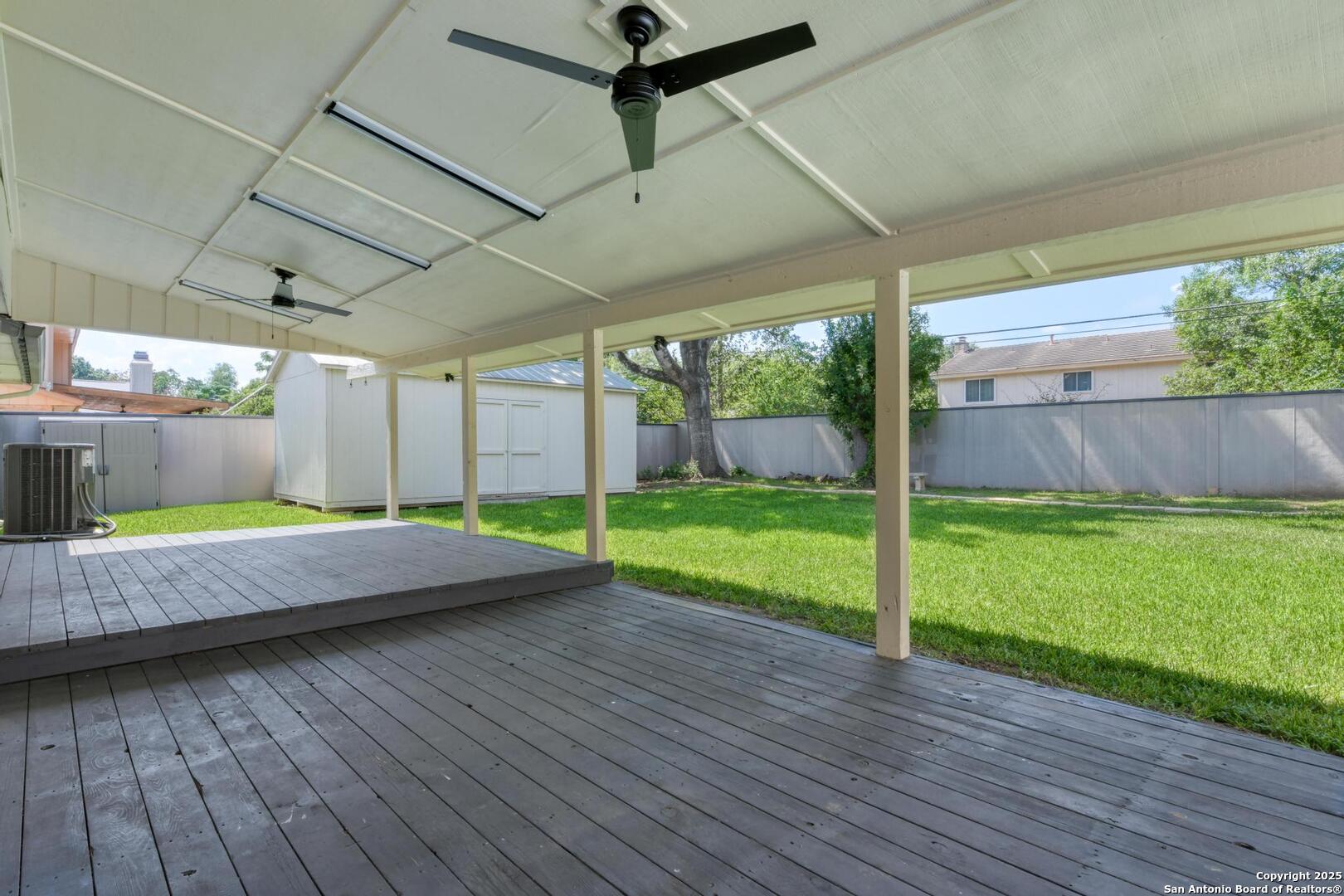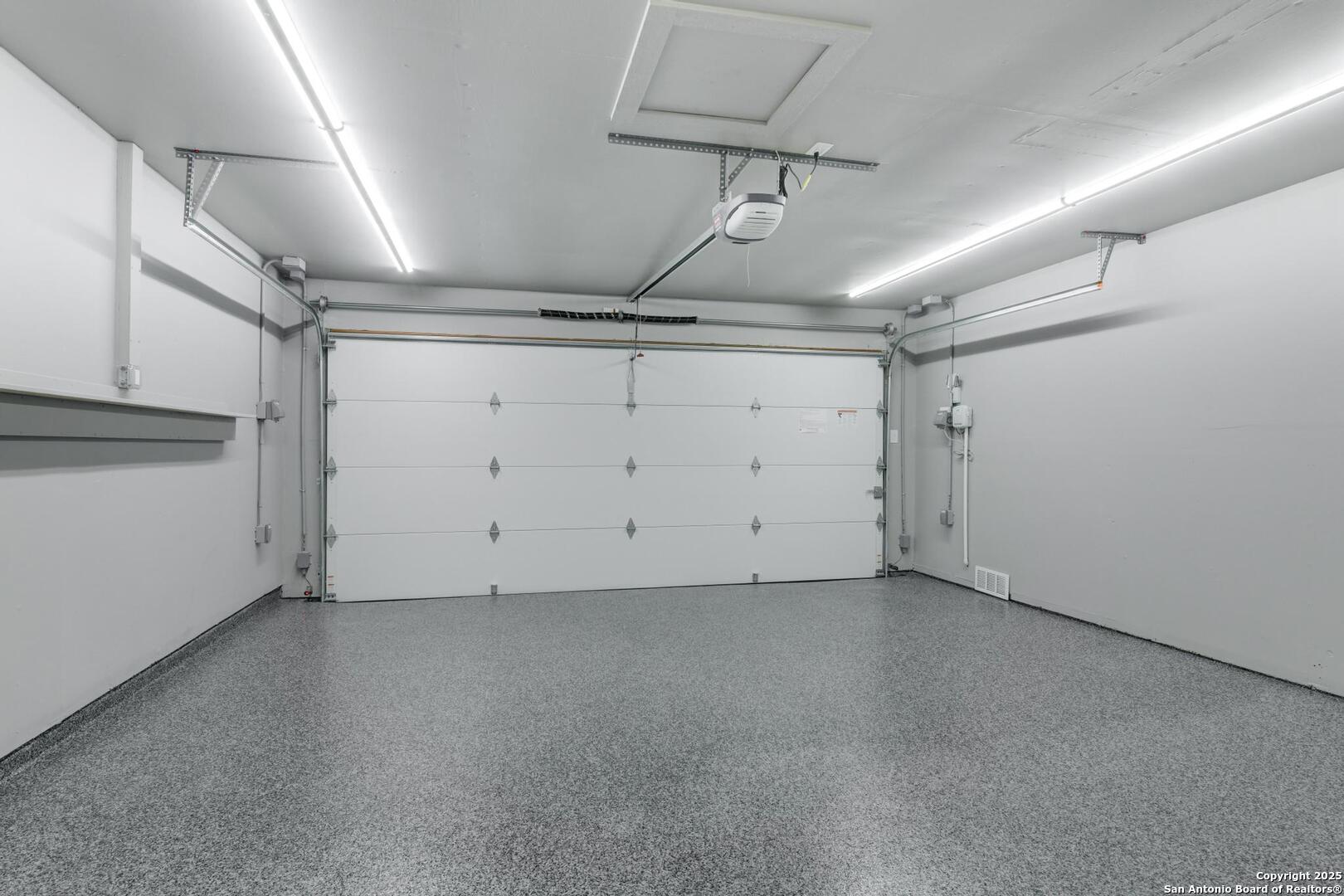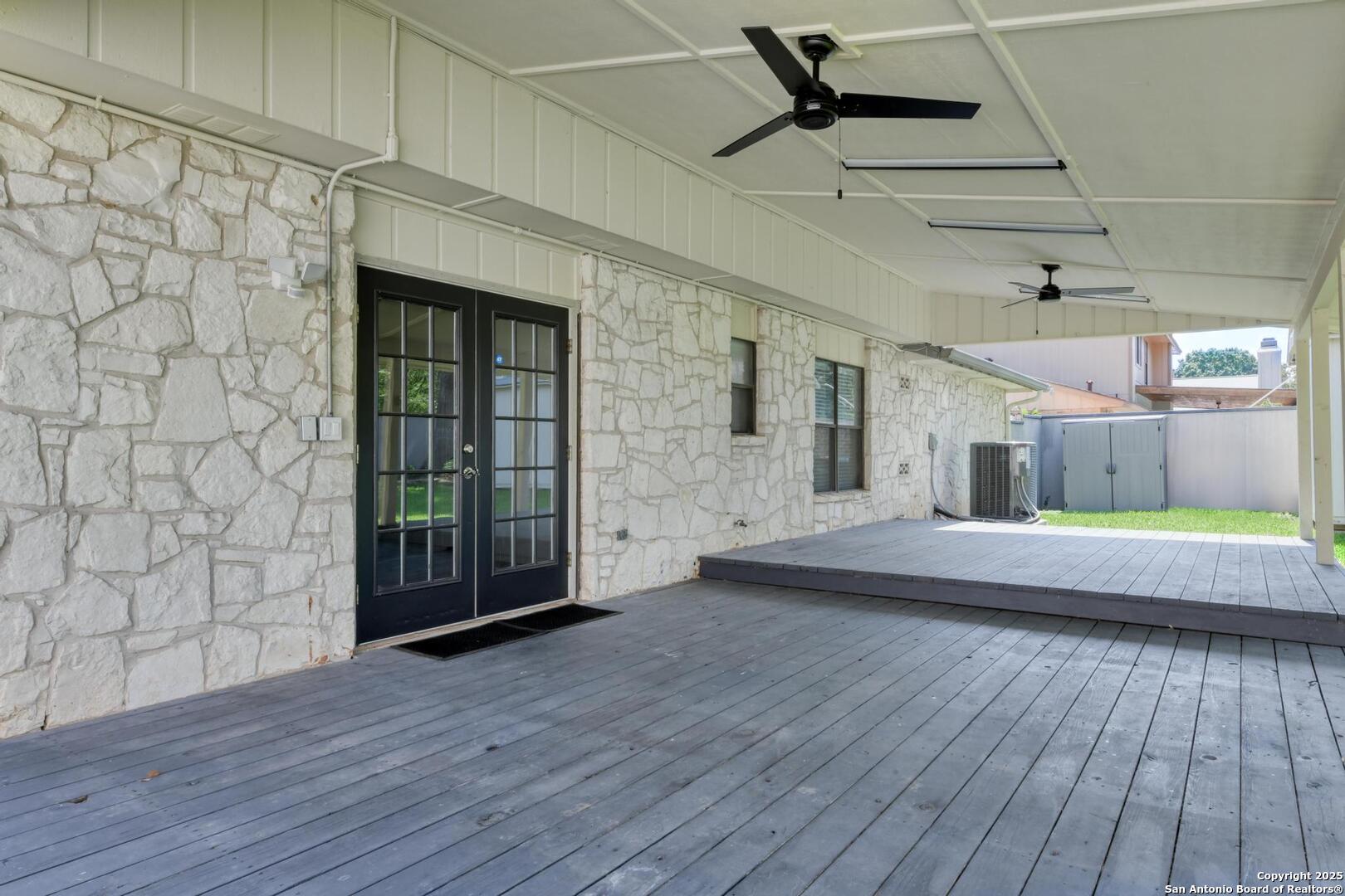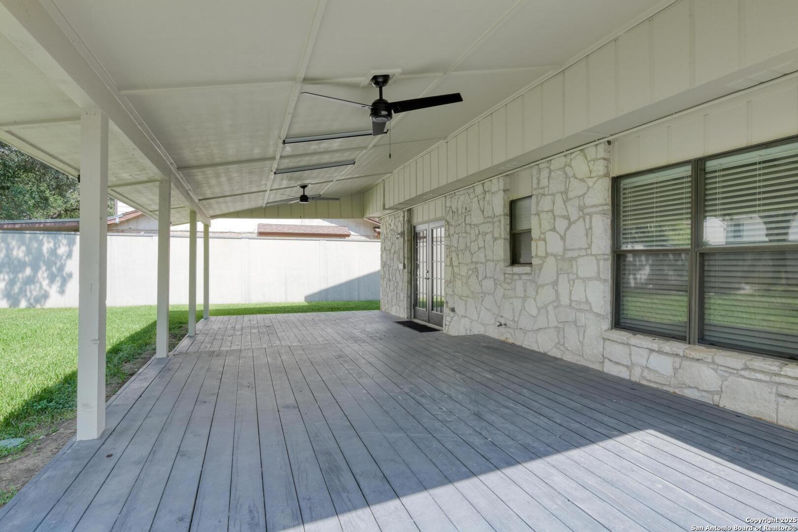 Big news! Seller heard your feedback-garage has been converted back to its original use, plus an HVAC vent was added to the laundry room for even more functional square footage. Welcome to 2215 Shady Rock Cir - a one-owner, lovingly maintained home tucked away on a quiet cul-de-sac in the heart of Castle Hills Forest. This refreshed 4-bedroom, 2.5-bath home offers both character and convenience-just minutes from Alon Town Center, Phil Hardberger Park, the airport, downtown, and the Rim. Step inside to discover fresh paint, recently installed carpet upstairs, and spacious, light-filled rooms. The kitchen is clean and crisp, with a galley-style layout featuring striking black countertops contrasted by bright white cabinets-offering both function and visual appeal. Just off the kitchen, the laundry room is a hidden gem with upper and lower cabinetry, ample counter space, and a walk-in closet complete with floor-to-ceiling shelves and excellent lighting. The outdoor living space is equally impressive with a covered deck enhanced by updated lights and fans, perfect for relaxing or entertaining. The yard has been meticulously maintained, with lush, mature grass and a full sprinkler system in place. There's also a large storage shed in back-freeing up the garage for something special. The garage has been given a major update, converted back into a functional garage with epoxy flooring, automatic doors, and painted walls. Additional highlights include a full security system with cameras and all appliances conveying-including the stainless-steel refrigerator, washer, and dryer. Castle Hills Forest offers a voluntary HOA with a host of community events, swim team for the kids, and many more amenities giving this central San Antonio gem of a neighborhood both a connected and cozy feel for all generations.