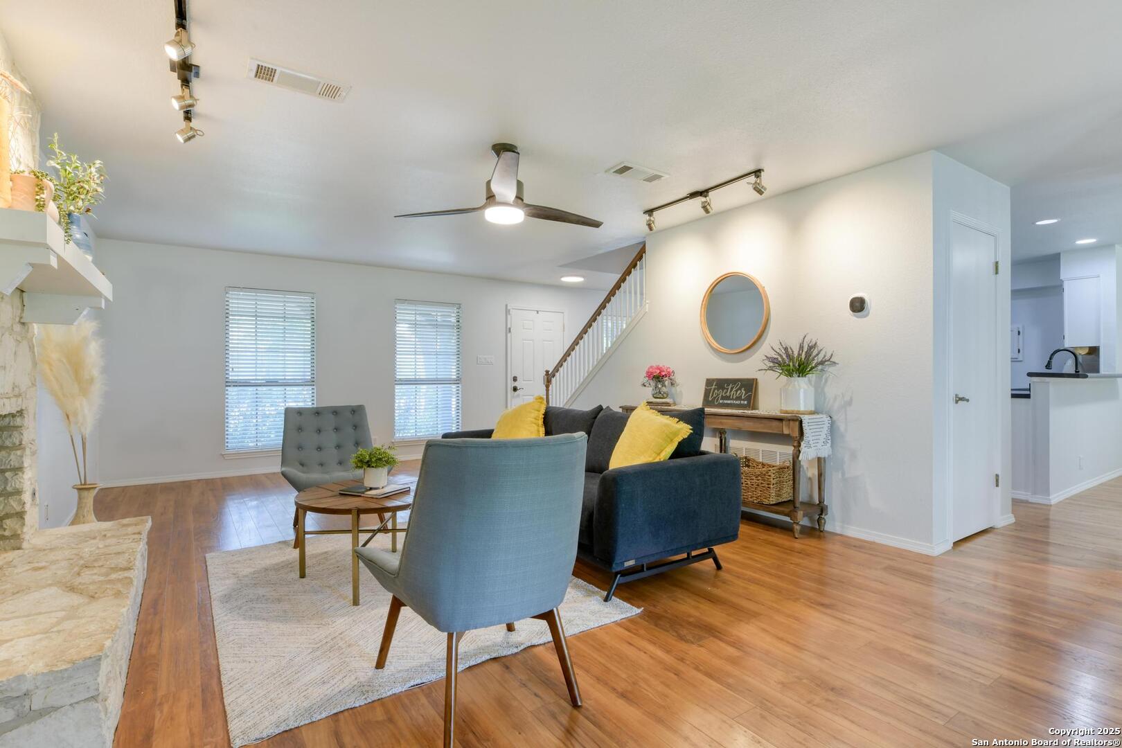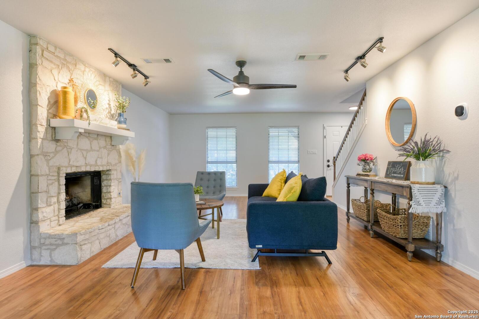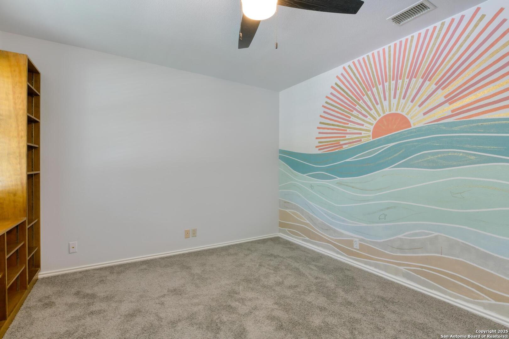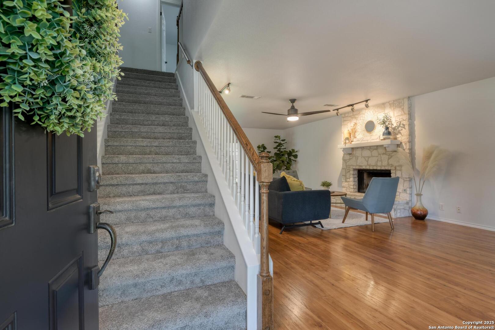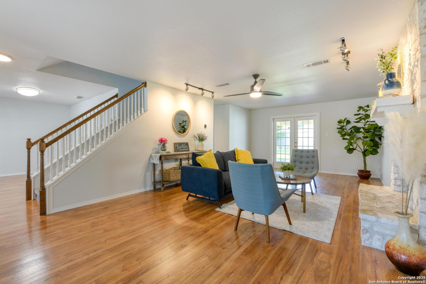 Big news! Seller heard your feedback-garage has been converted back to its original use, plus an HVAC vent was added to the laundry room for even more functional square footage. Welcome to 2215 Shady Rock Cir - a one-owner, lovingly maintained home tucked away on a quiet cul-de-sac in the heart of Castle Hills Forest. This refreshed 4-bedroom, 2.5-bath home offers both character and convenience-just minutes from Alon Town Center, Phil Hardberger Park, the airport, downtown, and the Rim. Step inside to discover fresh paint, recently installed carpet upstairs, and spacious, light-filled rooms. The kitchen is clean and crisp, with a galley-style layout featuring striking black countertops contrasted by bright white cabinets-offering both function and visual appeal. Just off the kitchen, the laundry room is a hidden gem with upper and lower cabinetry, ample counter space, and a walk-in closet complete with floor-to-ceiling shelves and excellent lighting. The outdoor living space is equally impressive with a covered deck enhanced by updated lights and fans, perfect for relaxing or entertaining. The yard has been meticulously maintained, with lush, mature grass and a full sprinkler system in place. There's also a large storage shed in back-freeing up the garage for something special. The garage has been given a major update, converted back into a functional garage with epoxy flooring, automatic doors, and painted walls. Additional highlights include a full security system with cameras and all appliances conveying-including the stainless-steel refrigerator, washer, and dryer. Castle Hills Forest offers a voluntary HOA with a host of community events, swim team for the kids, and many more amenities giving this central San Antonio gem of a neighborhood both a connected and cozy feel for all generations.