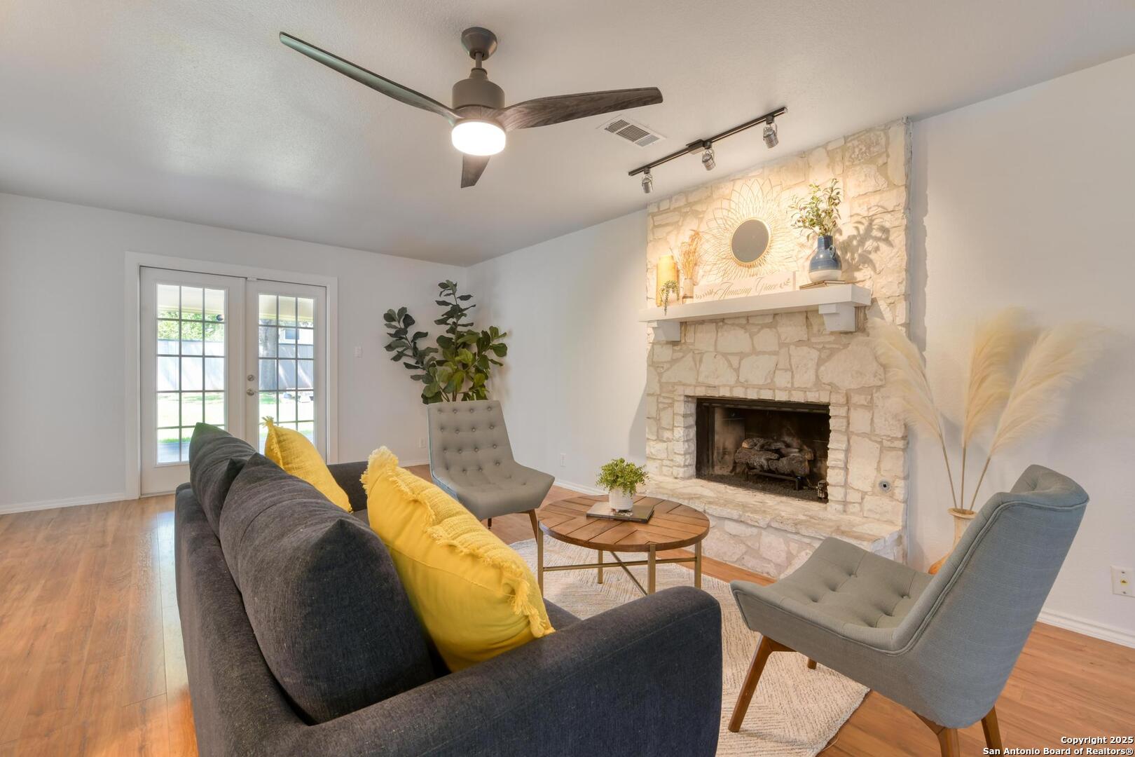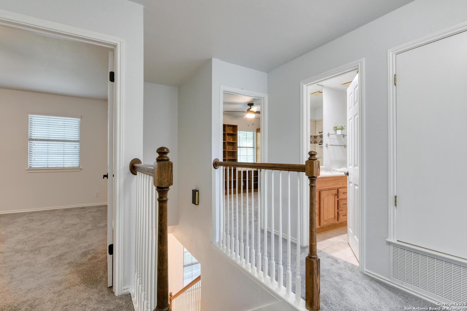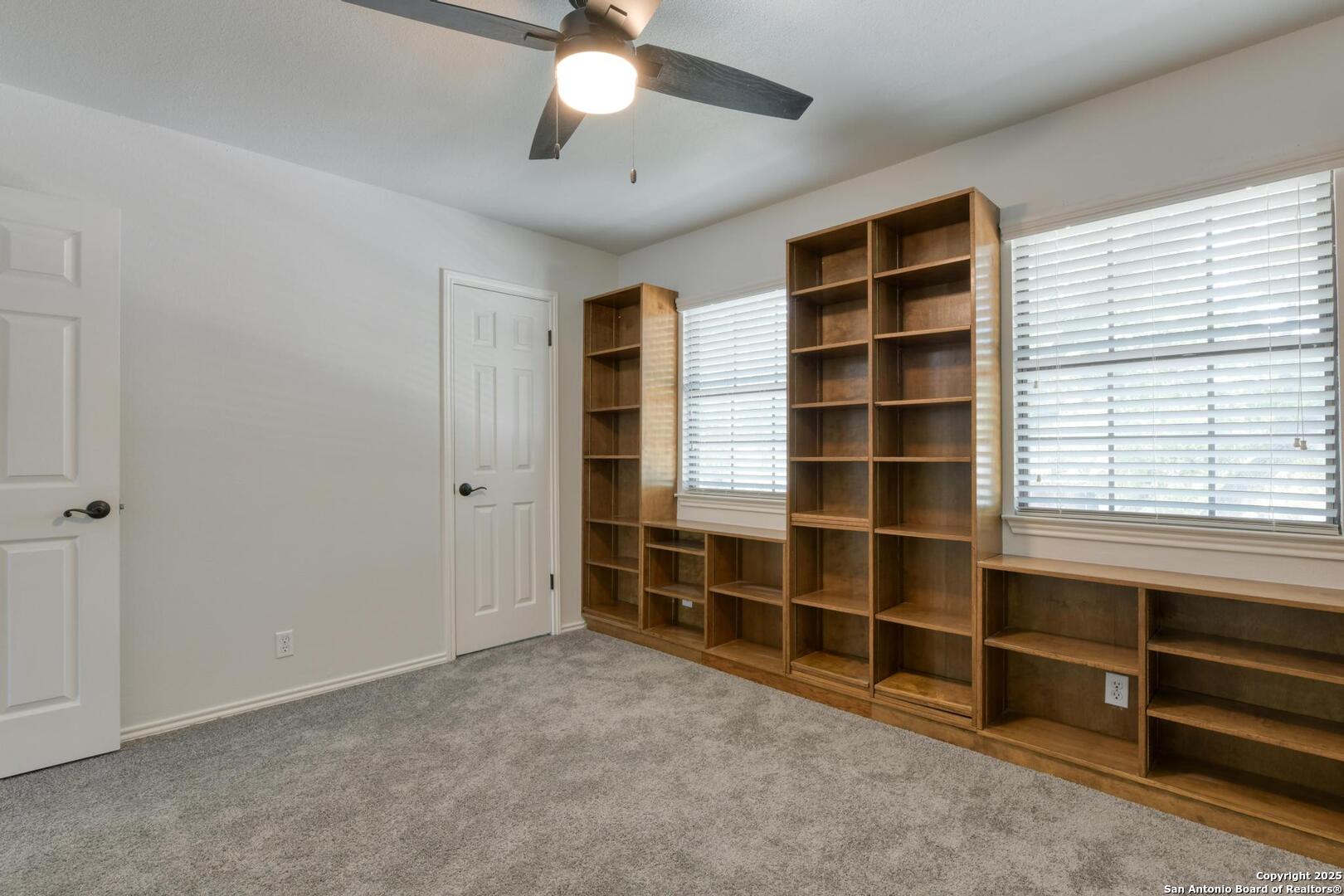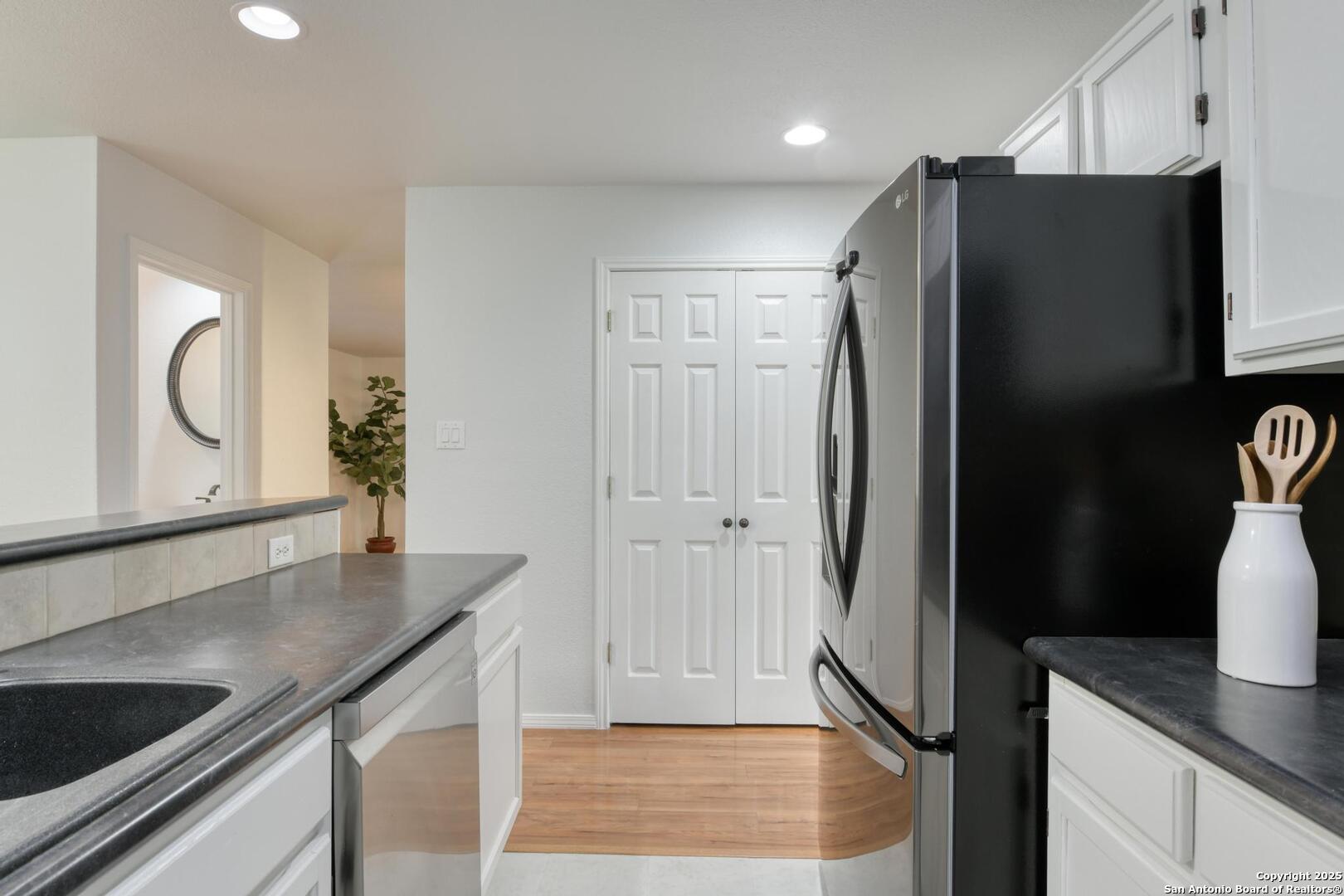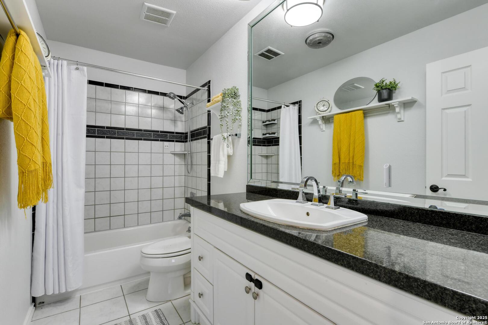 Big news! Seller heard your feedback-garage has been converted back to its original use, plus an HVAC vent was added to the laundry room for even more functional square footage. Welcome to 2215 Shady Rock Cir - a one-owner, lovingly maintained home tucked away on a quiet cul-de-sac in the heart of Castle Hills Forest. This refreshed 4-bedroom, 2.5-bath home offers both character and convenience-just minutes from Alon Town Center, Phil Hardberger Park, the airport, downtown, and the Rim. Step inside to discover fresh paint, recently installed carpet upstairs, and spacious, light-filled rooms. The kitchen is clean and crisp, with a galley-style layout featuring striking black countertops contrasted by bright white cabinets-offering both function and visual appeal. Just off the kitchen, the laundry room is a hidden gem with upper and lower cabinetry, ample counter space, and a walk-in closet complete with floor-to-ceiling shelves and excellent lighting. The outdoor living space is equally impressive with a covered deck enhanced by updated lights and fans, perfect for relaxing or entertaining. The yard has been meticulously maintained, with lush, mature grass and a full sprinkler system in place. There's also a large storage shed in back-freeing up the garage for something special. The garage has been given a major update, converted back into a functional garage with epoxy flooring, automatic doors, and painted walls. Additional highlights include a full security system with cameras and all appliances conveying-including the stainless-steel refrigerator, washer, and dryer. Castle Hills Forest offers a voluntary HOA with a host of community events, swim team for the kids, and many more amenities giving this central San Antonio gem of a neighborhood both a connected and cozy feel for all generations.