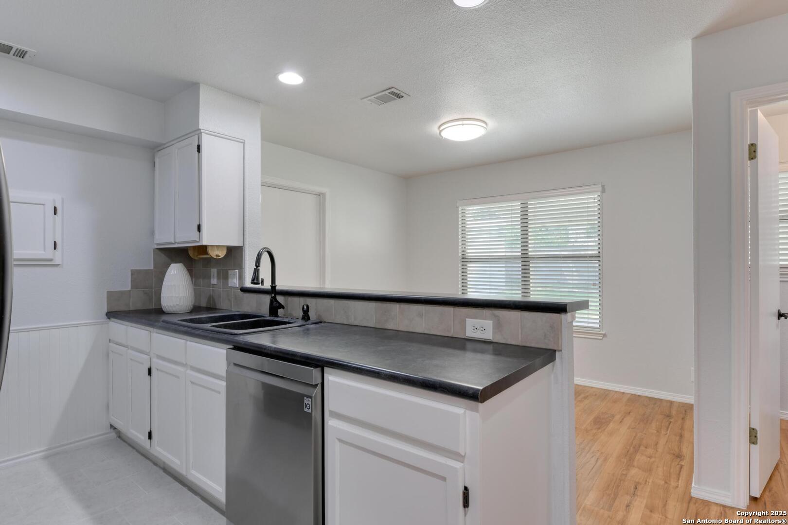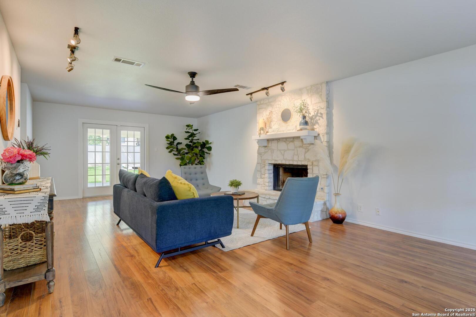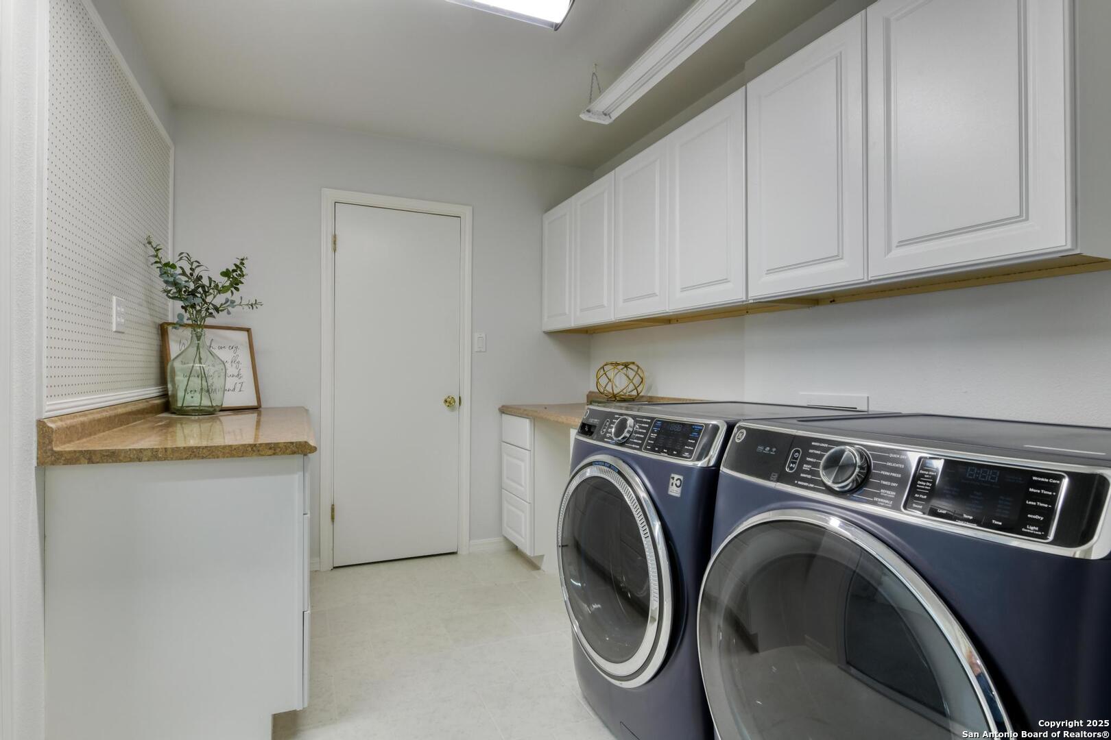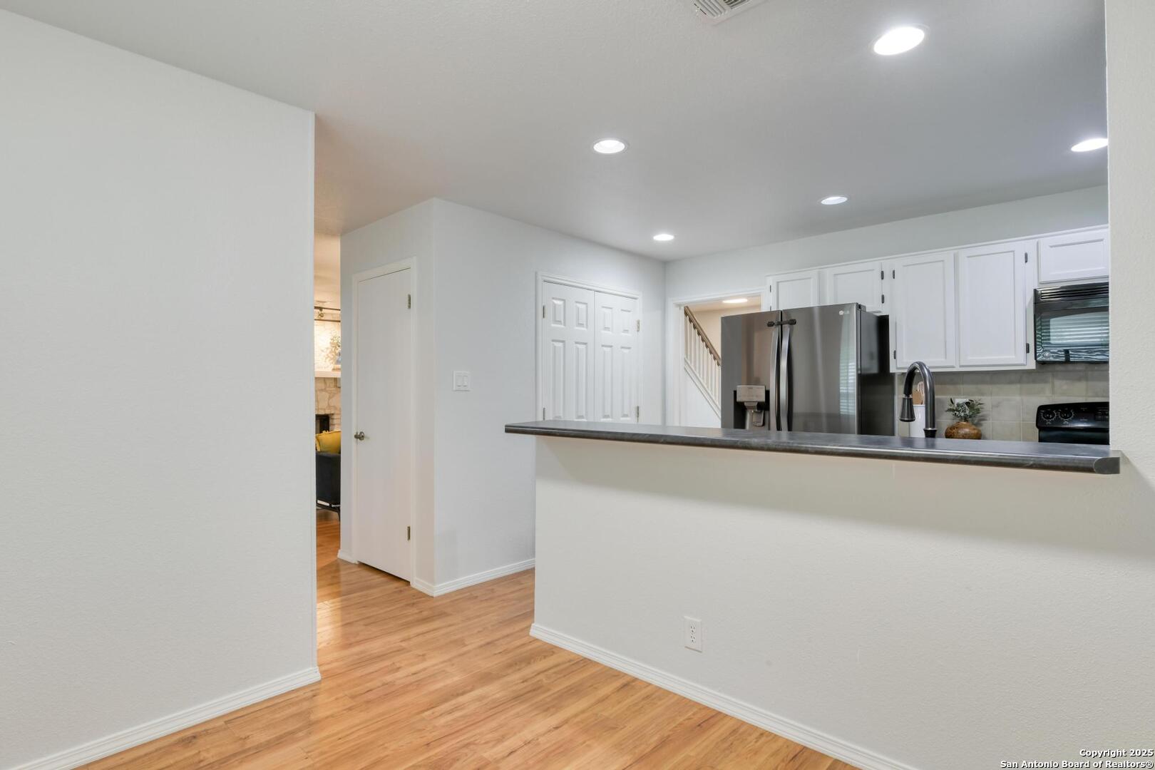Big news! Seller heard your feedback-garage has been converted back to its original use, plus an HVAC vent was added to the laundry room for even more functional square footage. Welcome to 2215 Shady Rock Cir - a one-owner, lovingly maintained home tucked away on a quiet cul-de-sac in the heart of Castle Hills Forest. This refreshed 4-bedroom, 2.5-bath home offers both character and convenience-just minutes from Alon Town Center, Phil Hardberger Park, the airport, downtown, and the Rim. Step inside to discover fresh paint, recently installed carpet upstairs, and spacious, light-filled rooms. The kitchen is clean and crisp, with a galley-style layout featuring striking black countertops contrasted by bright white cabinets-offering both function and visual appeal. Just off the kitchen, the laundry room is a hidden gem with upper and lower cabinetry, ample counter space, and a walk-in closet complete with floor-to-ceiling shelves and excellent lighting. The outdoor living space is equally impressive with a covered deck enhanced by updated lights and fans, perfect for relaxing or entertaining. The yard has been meticulously maintained, with lush, mature grass and a full sprinkler system in place. There's also a large storage shed in back-freeing up the garage for something special. The garage has been given a major update, converted back into a functional garage with epoxy flooring, automatic doors, and painted walls. Additional highlights include a full security system with cameras and all appliances conveying-including the stainless-steel refrigerator, washer, and dryer. Castle Hills Forest offers a voluntary HOA with a host of community events, swim team for the kids, and many more amenities giving this central San Antonio gem of a neighborhood both a connected and cozy feel for all generations.