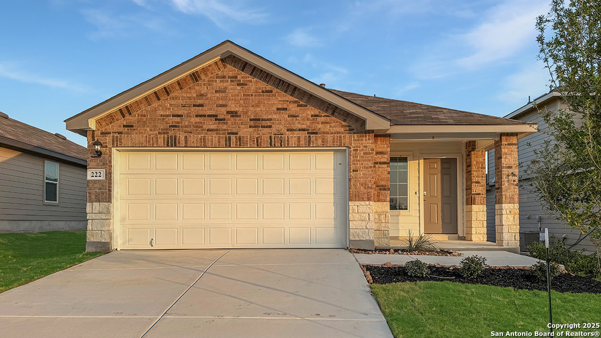 Introducing The Caroline plan, a stunning one-story home featured in Laurel Vistas in San Antonio, TX. The Caroline is sure to impress with its classic front exteriors, 3 bedrooms, 2 baths, and 2-car garage. An elongated foyer welcomes you into an open concept kitchen, dining area, and living room, perfect for entertaining. This home's kitchen includes shaker style cabinetry, granite counter tops, stainless steel appliances and a spacious kitchen island with a deep farmhouse style single basin sink. The main bedroom is located right off the living room and features a semi-vaulted ceiling and an attractive ensuite bathroom. You'll enjoy getting ready every day with plenty of bathroom space and modern bathroom features including granite countertops, shaker style cabinets, a tiled walk-in shower and spacious walk-in closet. If privacy is your top priority, this ensuite bathroom comes standard with a separate water closet. Every bedroom has quality carpet, a closet, and windows for plenty of natural lighting. Whether these rooms become bedrooms or other bonus spaces, there is sure to be comfort and functionality. Additional features include a back patio that overlooks a fully landscaped and irrigated yard, sheet vinyl flooring in entry, living room, and all wet areas, and granite countertops and tiled flooring in all secondary bathrooms. This home also comes equipped with our HOME IS CONNECTED base package. Using one central hub that talks to all the devices in your home, you can control the lights, thermostat and locks, all from your cellular device.