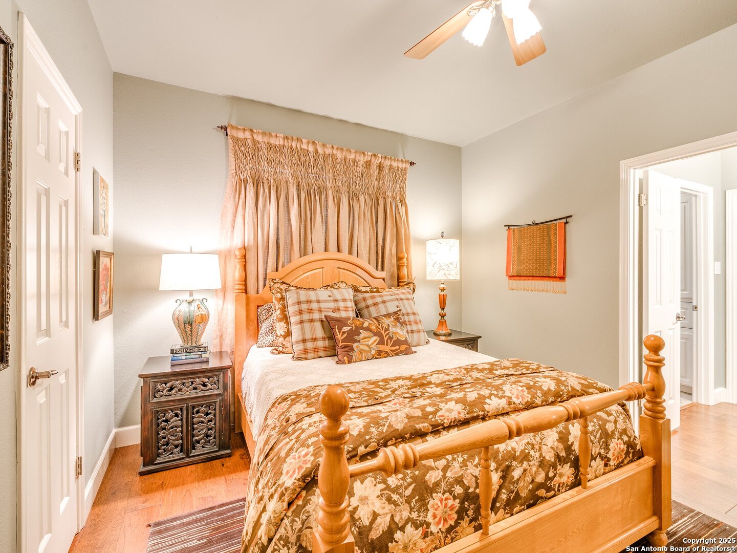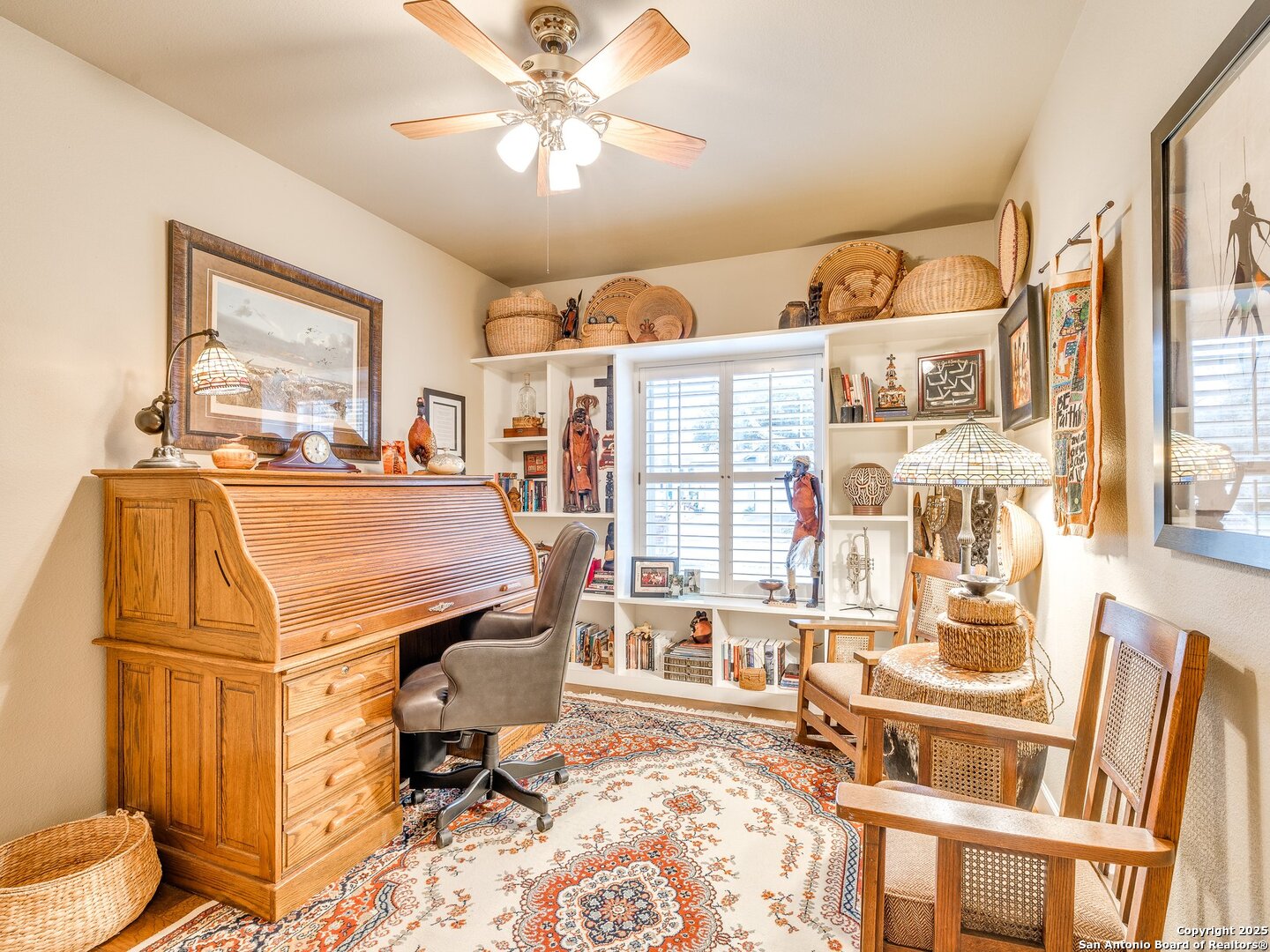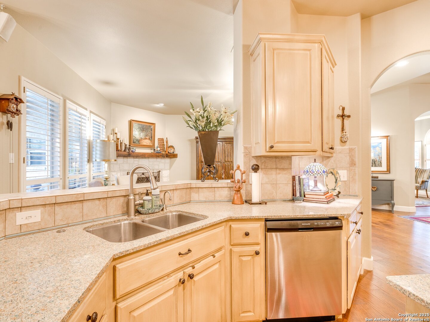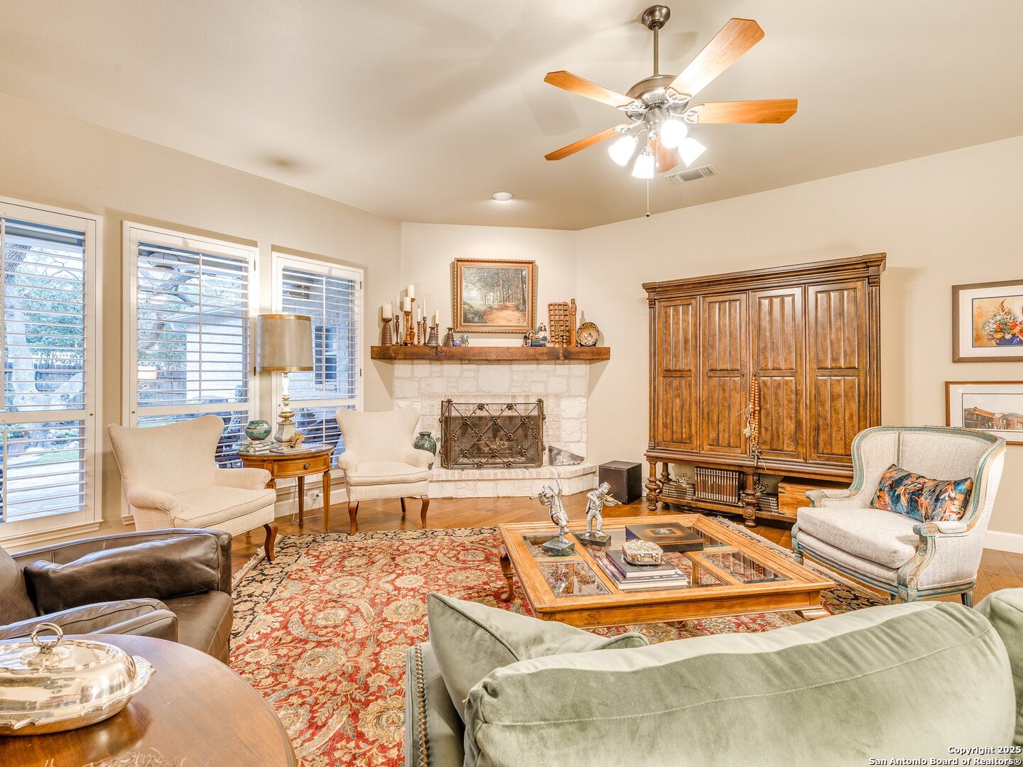 Welcome to your beautiful new house! This captivating 1-story sanctuary nestled in the heart of the prestigious gated community of Oakwood has been wonderfully updated and impeccably maintained. Every corner reflects warmth and comfort, inviting you to relax and enjoy. As you enter, you are greeted by an open floor plan that exudes elegance and charm. Wood floors and Plantation shutters throughout. 4 bedrooms - one is currently used as a home office. The heart of the home lies in the beautifully designed island kitchen and family room with a cozy fireplace. The island kitchen offers plenty of counters and cabinets, gas cooking, and double ovens. The kitchen is both a functional workspace and a gathering spot for you and your closest people. Imagine sharing stories over breakfast or hosting lively dinner parties, all while surrounded by tasteful decorator touches that elevate your home's aesthetic. The large primary suite and ensuite with separate tub and shower, double vanity and large walk-in closet offers access to the patio and backyard. 2 spare bedrooms on the opposite side of the house with Jack-n-Jill bathroom. Step outside to discover your private backyard oasis, a tranquil retreat designed for relaxation and entertainment. The covered patio beckons you to unwind in the shade, host summer barbecues, or spend quiet mornings sipping coffee while enjoying the fresh air and picturesque surroundings. It's an ideal space for just chilling out. Living in Oakwood means embracing a lifestyle of security and community. With its manicured landscapes and friendly neighbors, this gated subdivision offers a sense of belonging and peace of mind. The well-maintained subdivision offers a community pool, playground and tennis courts just a few steps away from the house. Bring your dreams to fruition in this beautifully appointed residence that welcomes you with open arms.