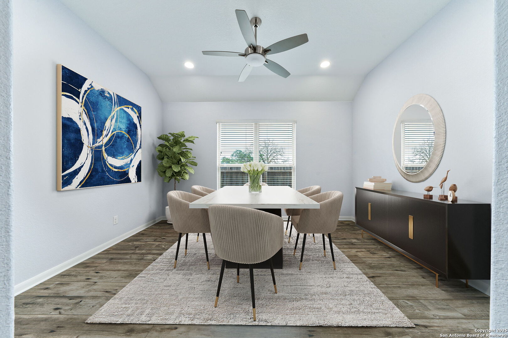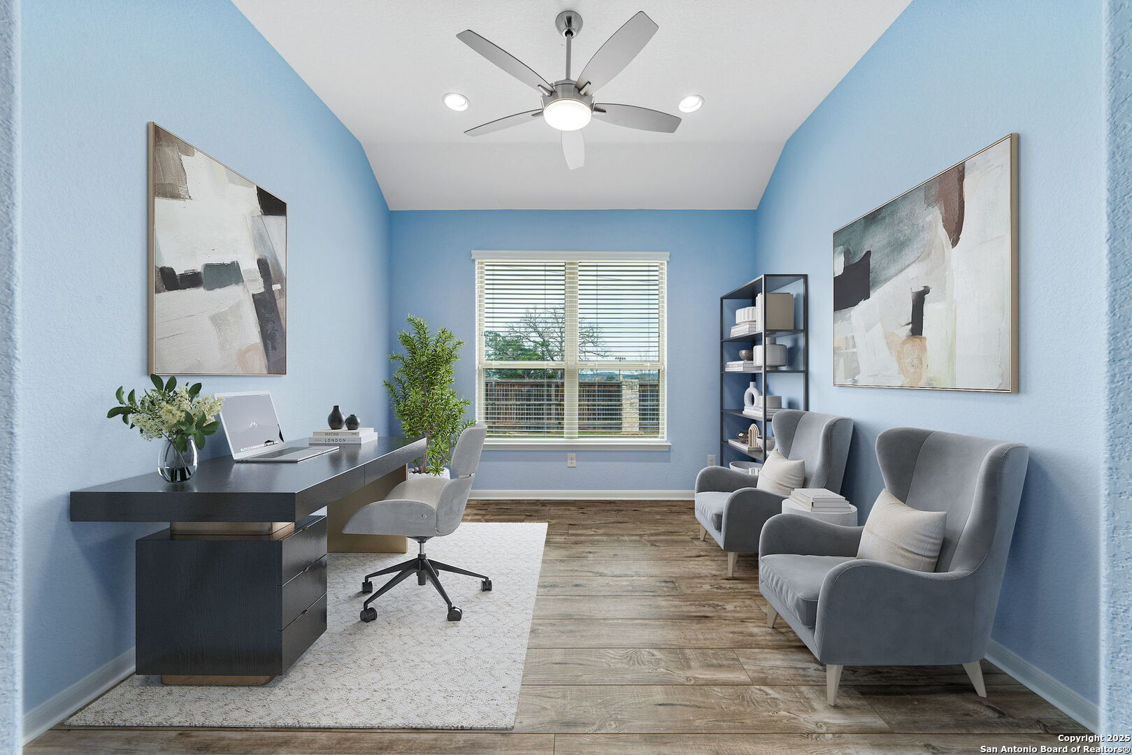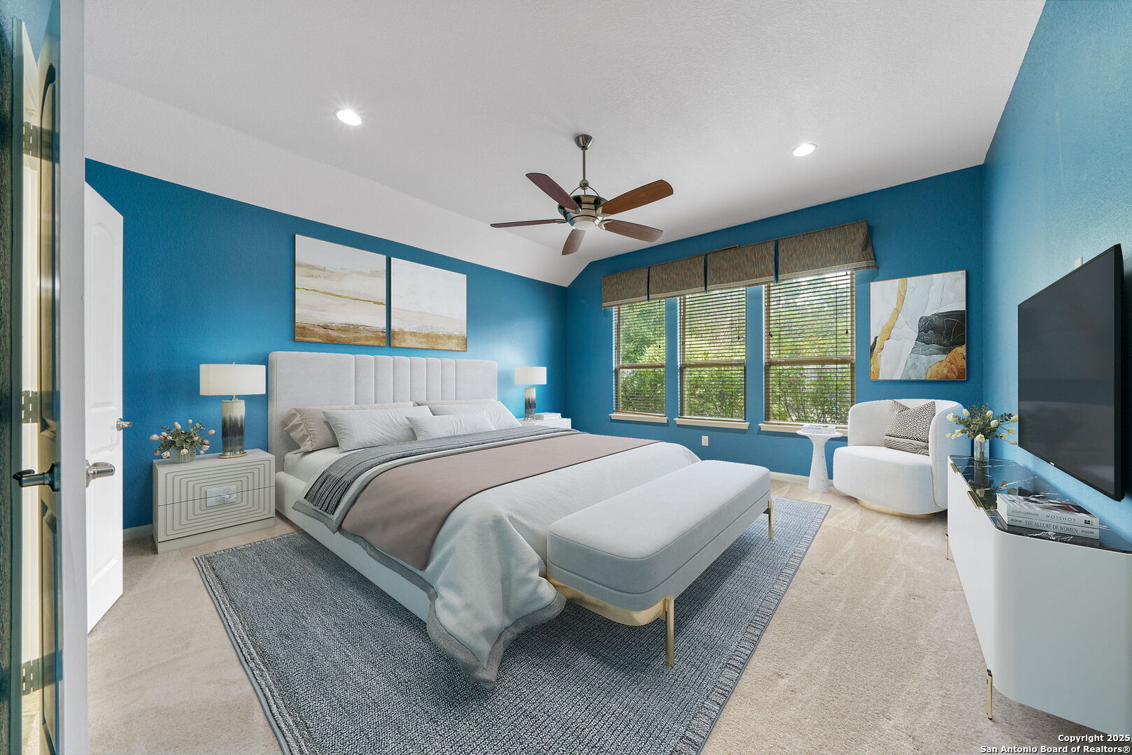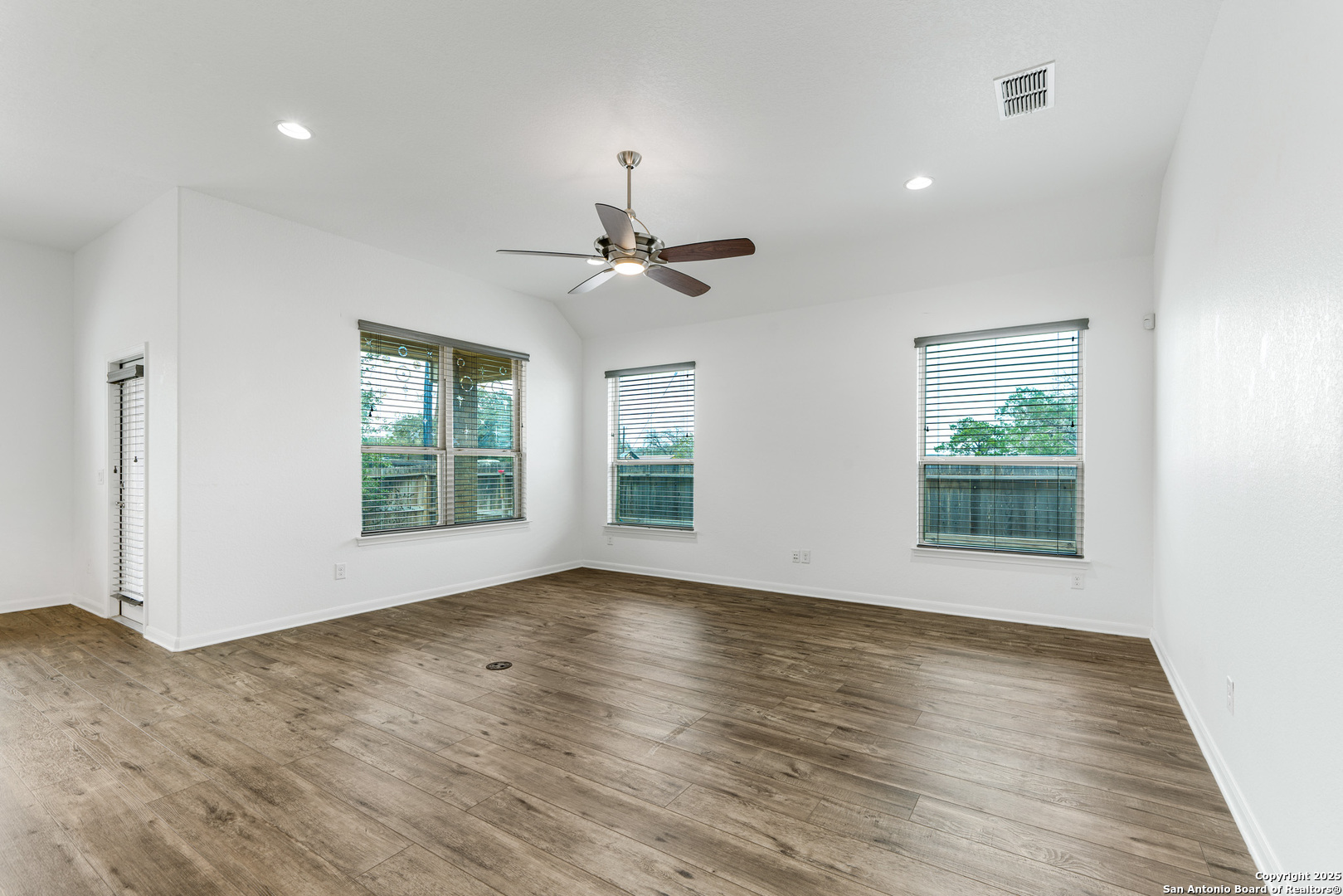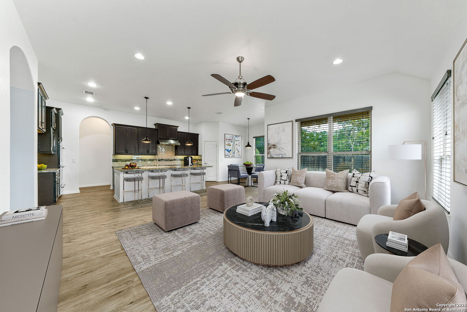 Nestled on a private cul-de-sac in the highly desirable Prospect Creek at Kinder Ranch, this stunning custom Sitterle one-story home offers 4 bedrooms, 3 baths, and an oversized 3-car garage. Boasting exceptional curb appeal, the home welcomes you with a spacious, open floor plan and soaring ceilings that create an airy, inviting atmosphere. The chef's eat-in kitchen is a true centerpiece, featuring granite countertops, stainless steel appliances, an abundance of custom cabinetry, a large walk-in pantry, and ample storage space. Perfectly designed for entertaining, it opens seamlessly to the cozy family room. Retreat to the private primary suite, where you'll find a spa-inspired bathroom with a soaking tub, separate shower, dual vanities, and a generous walk-in closet. The three additional bedrooms, including a flexible 4th bedroom ideal for a hobby room or flex space, provide versatility and comfort for family or guests. Work from home in the dedicated private study or host memorable gatherings in the separate dining room, which can also serve as an additional living area. Step outside to the tranquil backyard, featuring a covered patio, lush landscaping, and the added privacy of no rear neighbors. Located in a gated community with access to a neighborhood pool and served by top-rated Comal ISD schools, this home combines luxury, practicality, and convenience. Don't miss the opportunity to make this exceptional property yours!