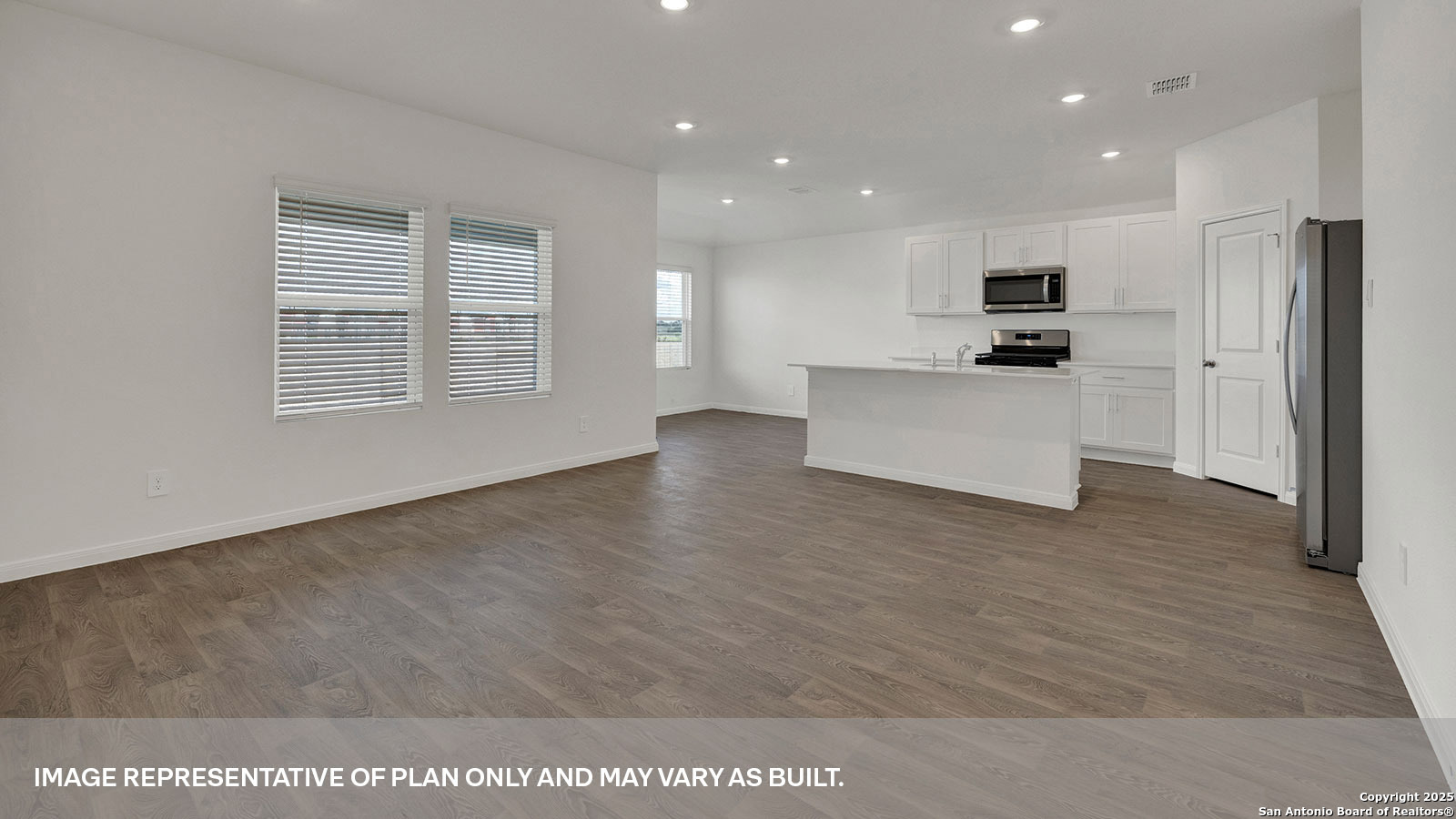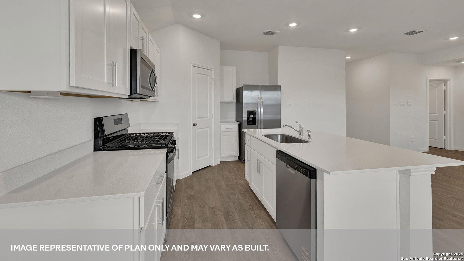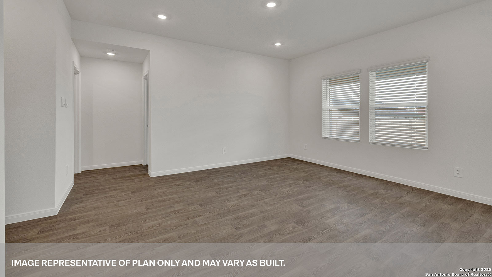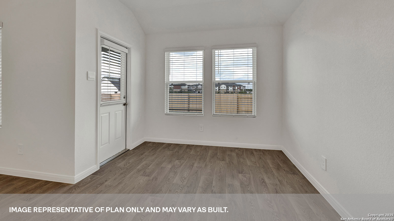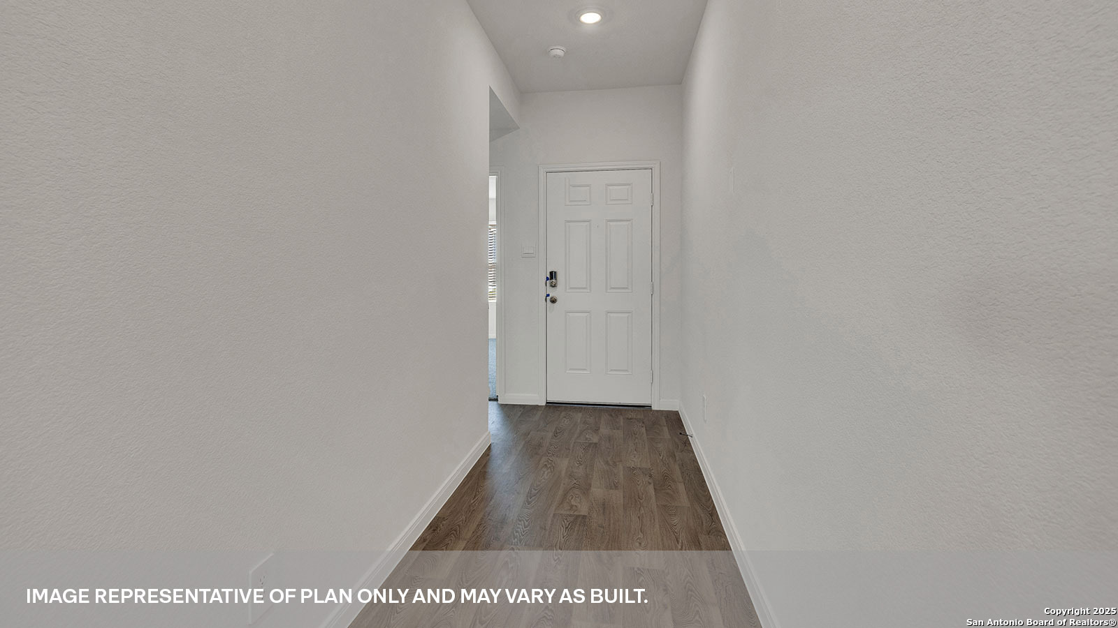 MOVE IN READY! COMMUNITY LOCATED NEXT TO I-35. The Bellvue is one of our one-story floorplans featured at our Trace community in San Marcos, Texas. This home is perfect for smaller families or homeowners looking to downsize. Featuring 3 bedrooms and 2 bathrooms, this home also includes a 2-car garage all within 1,407 square feet of living space. Our homes in Trace feature farmhouse exteriors. Stepping inside the home from the covered front porch, you will find a short hallway that leads to the secondary bedrooms and bathroom. Bathroom 2 includes a tub/shower combination, and both bedrooms include a walk-in closet with shelving. Whether you use these rooms for an office, child's room or guest room, there is amble space for the entire family. The living area is an open concept design, so you are always close to the action in the family room, kitchen or dining area. The kitchen features an island with an undermount sink facing the family room, stainless steel appliances, quartz countertops, corner pantry closet and 36" upper cabinets. Enjoy the natural light with four rear windows looking out to the backyard. The primary bedroom is off the family room and includes its own attached bathroom, making the start of your day a seamless step from sleep to your morning routine. Enjoy the 5' walk in shower, vanity and separate door to the toilet for privacy. A walk-in closet with generous shelving is connected to the bathroom. The utility room is outside the primary bedroom, allowing for the laundry chores to be completed with ease. The Bellvue includes vinyl flooring throughout the common areas of the home, and carpet in the bedrooms. All our new homes feature a covered back patio, full sod, an irrigation system in the front and back yard, and a 6' privacy fence around the back yard. This home features our America's Smart Home base package, which includes the Video Front Doorbell, Front Door Deadbolt Lock, Home Hub, Thermostat, and Deako Smart Switches.