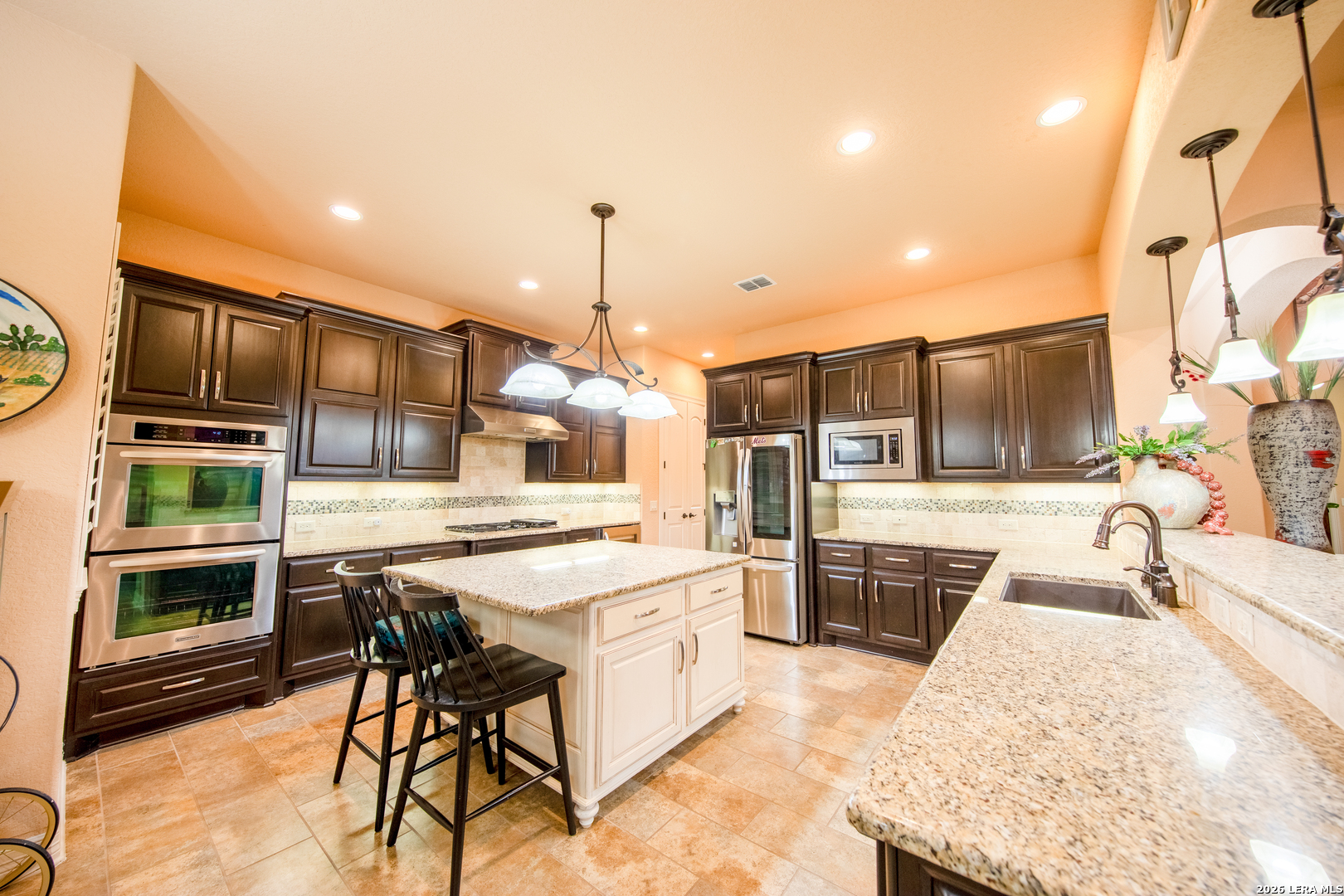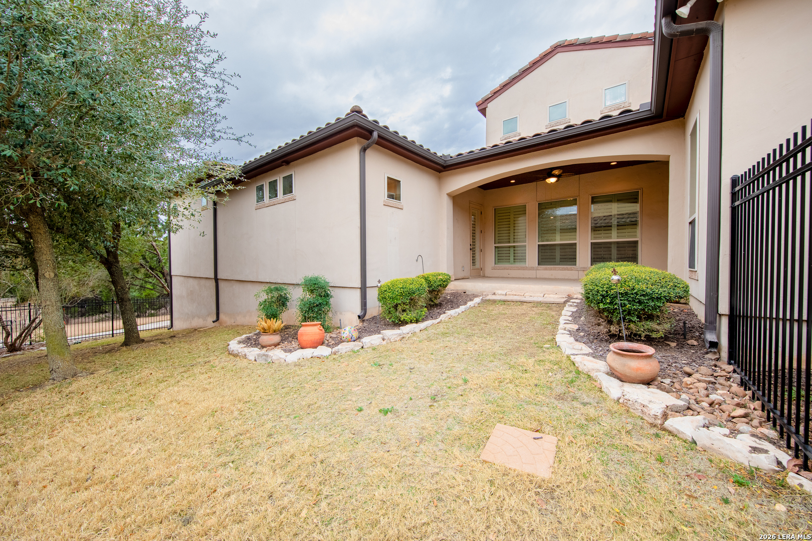 Located in the gated Campanas section of the Cibolo Canyons Resort Community, this beautifully maintained one-story Mediterranean-style home by Sitterle Homes backs to a peaceful greenbelt and offers elegant, low-maintenance living. The home welcomes you with 18-foot ceilings, arched architectural details, and abundant natural light that create an open and inviting atmosphere. Interior finishes include ceramic tile and wood flooring, granite countertops, custom cabinetry, and decorative iron accents throughout. Designed for both everyday comfort and entertaining, the chef's kitchen features stainless steel appliances, built-in double ovens, a wine refrigerator, and generous workspace. Enjoy outdoor living with three separate spaces including an elevated backyard patio with storage below, a private garden retreat with a stone feature wall, and a spacious covered loggia perfect for relaxing or hosting guests. Additional upgrades include spray foam insulation, custom plantation shutters, built-in 5.1 surround sound in the living room and patio, and a central vacuum system. HOA services include alarm monitoring, lawn care, and landscape maintenance, making this ideal for lock-and-leave living. Residents enjoy access to the 9,000+ sq ft Campanas clubhouse featuring a fitness center, resort-style pool, tennis court, pickleball courts, fire pit, ballroom, game room, and library.