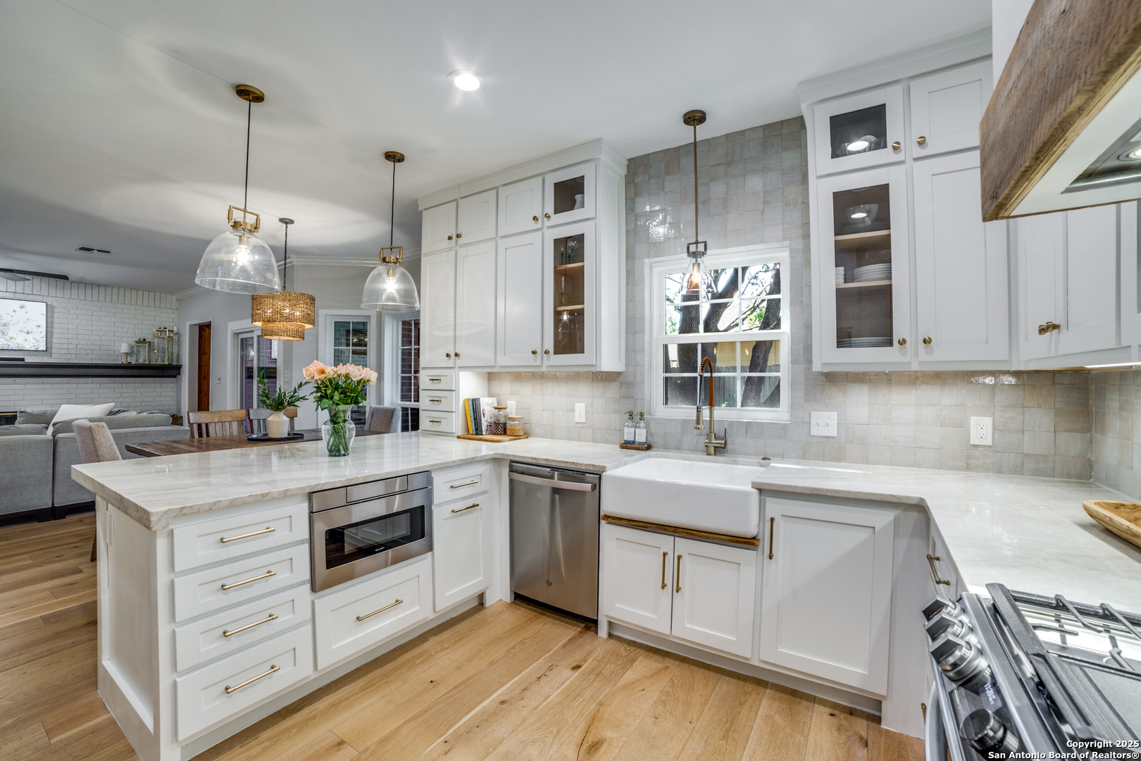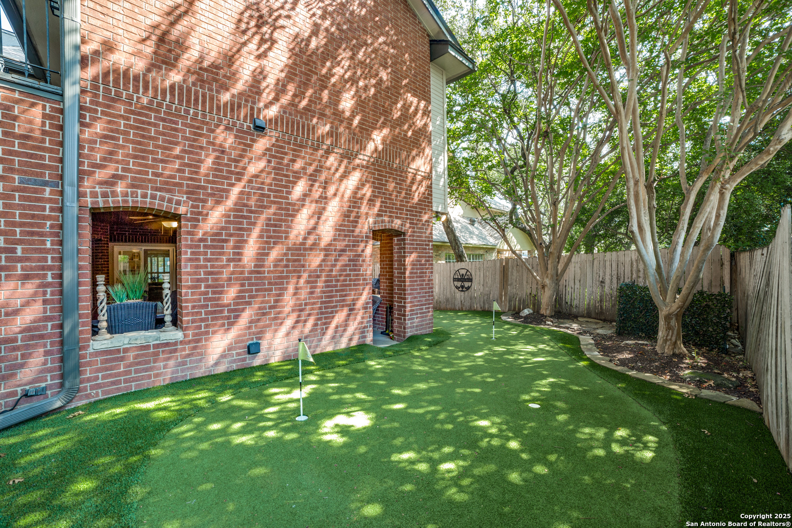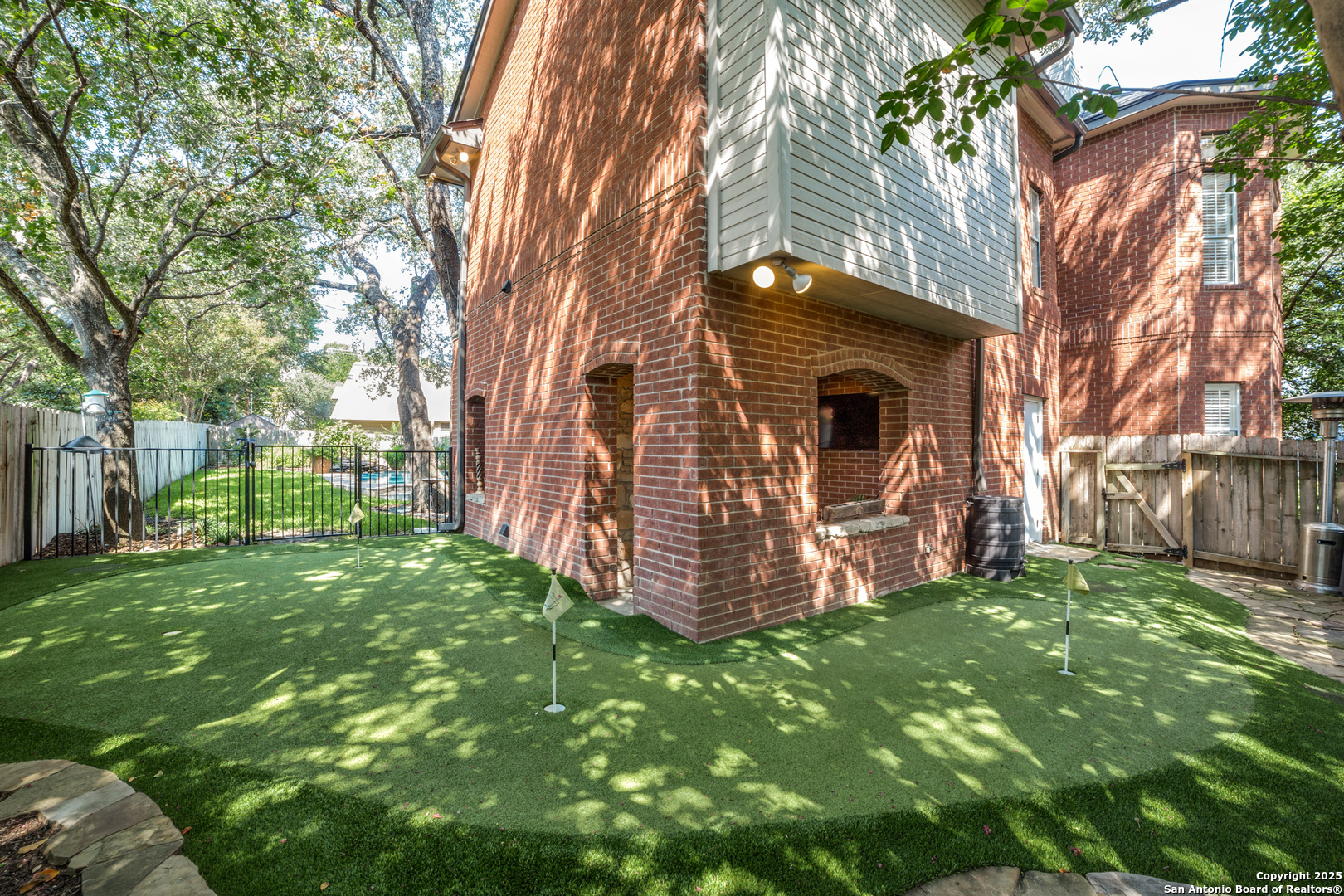 This stunning 4-bedroom, 2.5-bathroom home in the highly desirable Woods of Deerfield has been thoughtfully remodeled with designer upgrades and custom touches throughout. Shaw wood floors, elegant new tile, and high-end carpet set the tone for a home that is both sophisticated and inviting. Original hardwood flooring also lies beneath the upstairs carpet, offering future flexibility for design and style. The chef's kitchen is a true centerpiece, featuring Taj Mahal quartzite countertops, custom cabinetry with a built-in trash drawer and lazy Susan corner cabinets, a handcrafted Zellige tile backsplash, added storage under the peninsula, and premium appliances-perfect for both everyday living and entertaining. Three fireplaces create cozy gathering spaces, while the spacious floor plan includes an oversized office/flex space above the covered outdoor living area. Step outside to your private retreat with a sparkling pool featuring a solar-powered heater, covered patio, and a 3-hole putting green surrounded by lush Texas native plants. A well-insulated outdoor storage room provides ample space and stays cool year-round, adding even more function to the home. Designed for both relaxation and entertainment, the outdoor spaces make this property ideal in every season. Blending timeless design with modern upgrades, this Woods of Deerfield gem offers both comfort and luxury in one exceptional property.