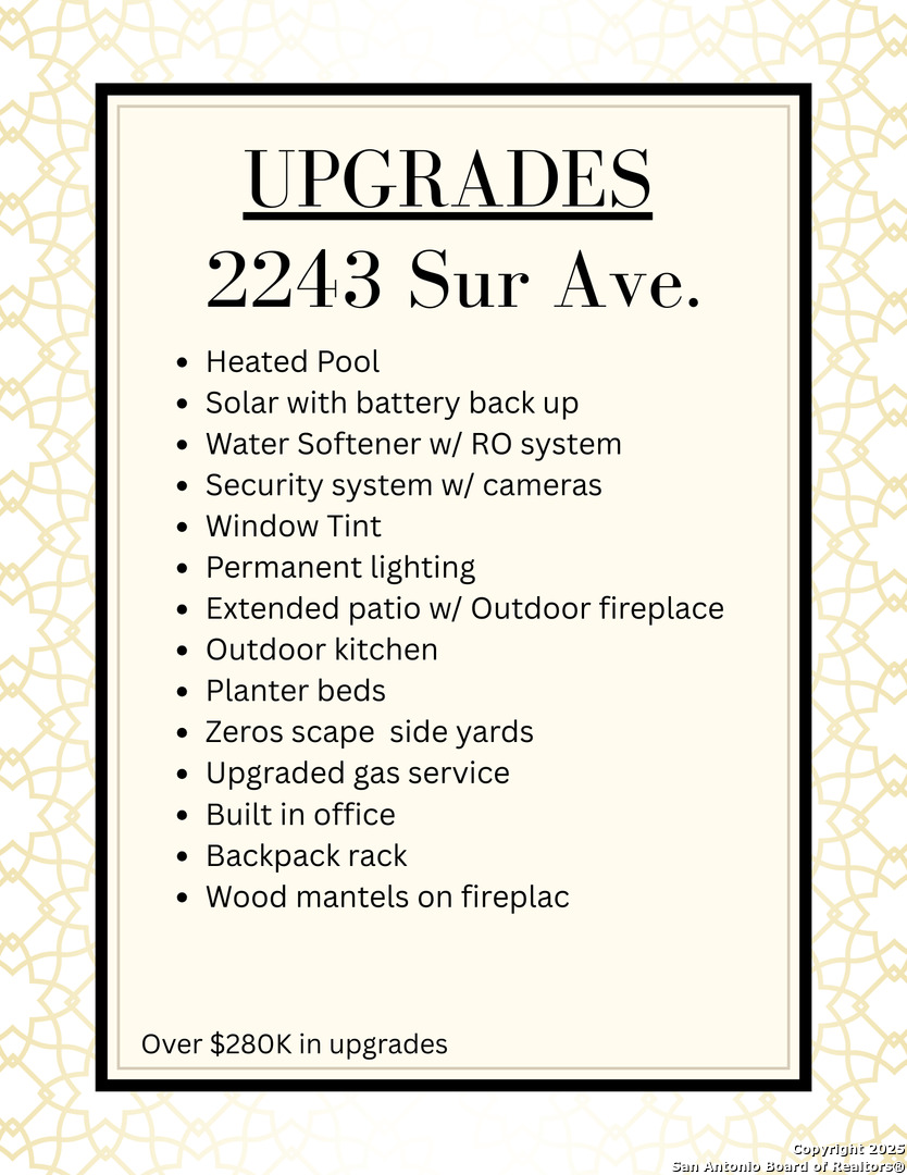 Welcome to 2243 Sur Ave, a stunning home located in the highly desirable Veramendi community in New Braunfels! This spacious 4-bedroom, 3.5-bath home offers the perfect blend of luxury, functionality, and comfort with an open floor plan, ideal for modern living and entertaining. The gourmet kitchen features stainless steel appliances, a large island, and plenty of cabinet space, flowing seamlessly into the living and dining areas. A dedicated office provides the perfect spot to work from home or manage daily tasks. The home includes a Jack and Jill bathroom between two secondary bedrooms, offering both privacy and convenience. The owner's suite is a true retreat with a spa-like ensuite and a generous walk-in closet. Step outside to your own private oasis! The backyard is an entertainer's dream, complete with an in-ground pool, a full outdoor kitchen, and a cozy outdoor fireplace-perfect for year-round enjoyment. Whether you're relaxing with family or hosting a summer BBQ, this outdoor space has it all. Additional features include a 3-car garage, ideal for vehicles, storage, or even a home gym or workshop. Every detail of this home has been thoughtfully designed to enhance everyday living. Veramendi residents enjoy fantastic neighborhood amenities including a community pool, scenic walking trails, parks, and more-all just minutes from downtown New Braunfels, schools, shopping, and dining. Don't miss the opportunity to own this incredible home in one of New Braunfels' most sought-after neighborhoods. Schedule your private showing today!