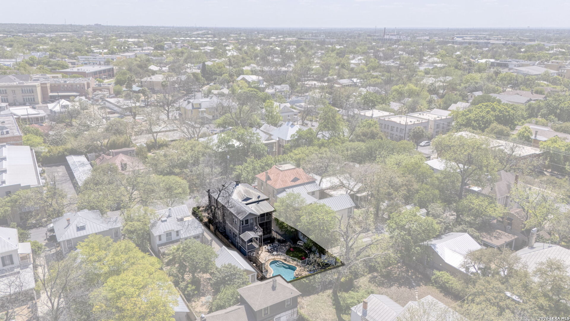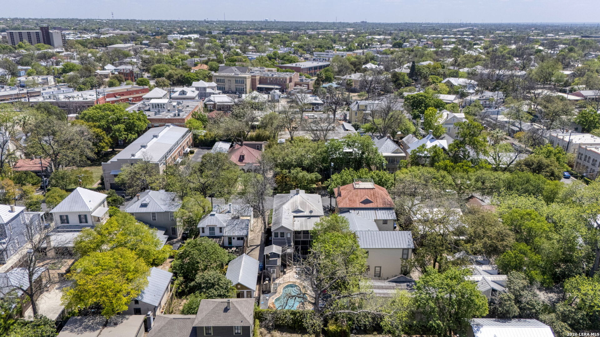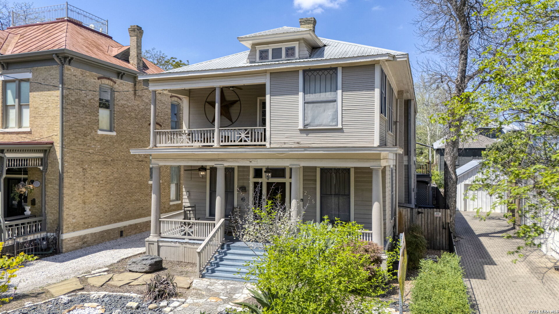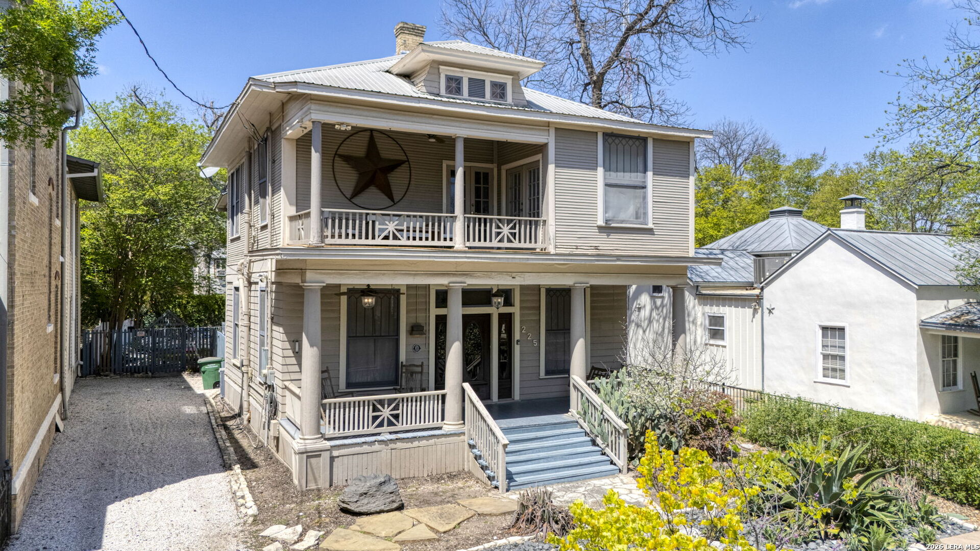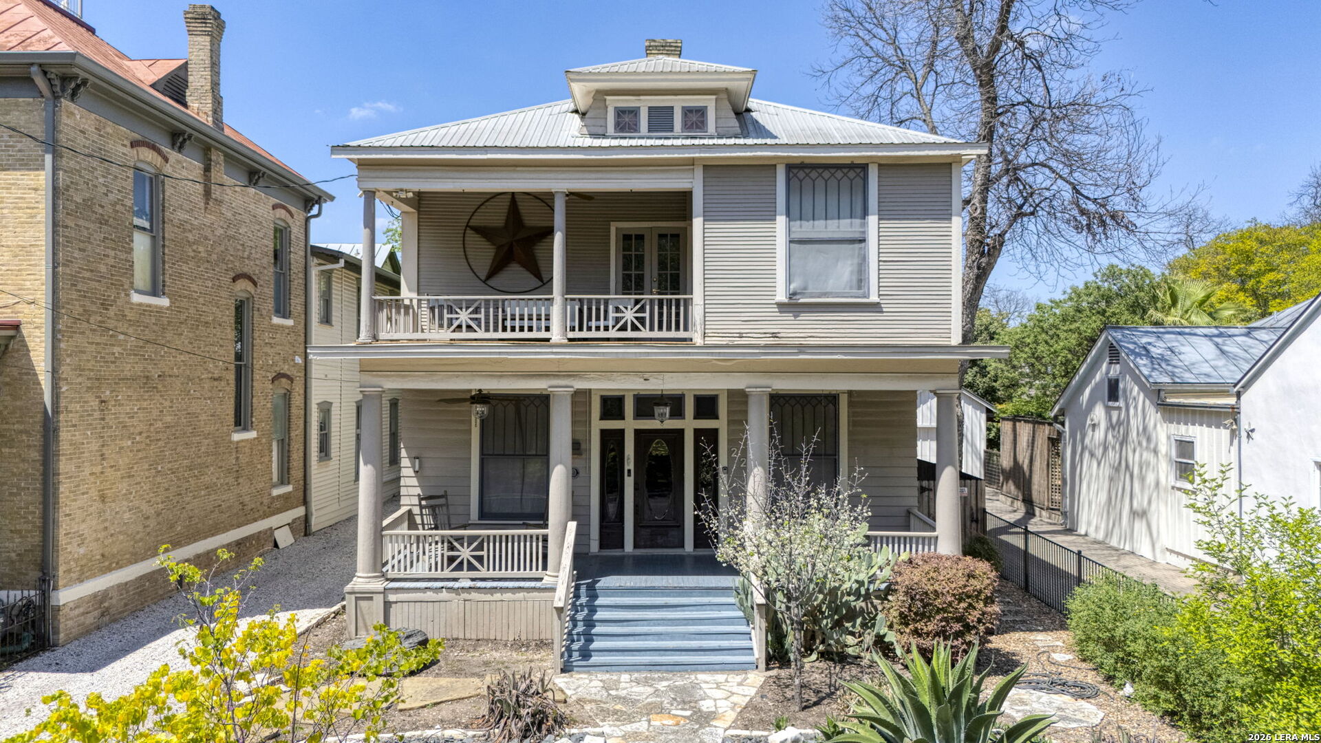 Spectacular 1922 Victorian in the heart of historic King William, offering timeless curb appeal with a true front porch, classic columns, and beautifully preserved architecture. Just two blocks from the River Walk, this home places you steps from parades, restaurants, and downtown living. Inside, the home blends historic charm with thoughtful updates. It features 5 bedrooms (dual primary suites), 4 full bathrooms, a large living room, formal dining room, and a screened-in porch/sunroom. The beautifully updated kitchen includes refreshed tile floors, backsplash, stunning countertops, lighting, and modern appliances. The living area also boasts a state-of-the-art entertainment system with a 110" automated drop-down screen and 7.1 in-ceiling speakers. Among other energy-saving features, the original windows remain intact & are enhanced with Indow Windows for improved energy efficiency & noise reduction. The backyard is a private retreat with an in-ground pool, deck, low-maintenance turf landscaping, pool fence, and standalone hot tub/spa. Private off-street parking and an electric car charger add convenience. A rare opportunity to enjoy an updated historic home in one of San Antonio's most iconic neighborhoods.