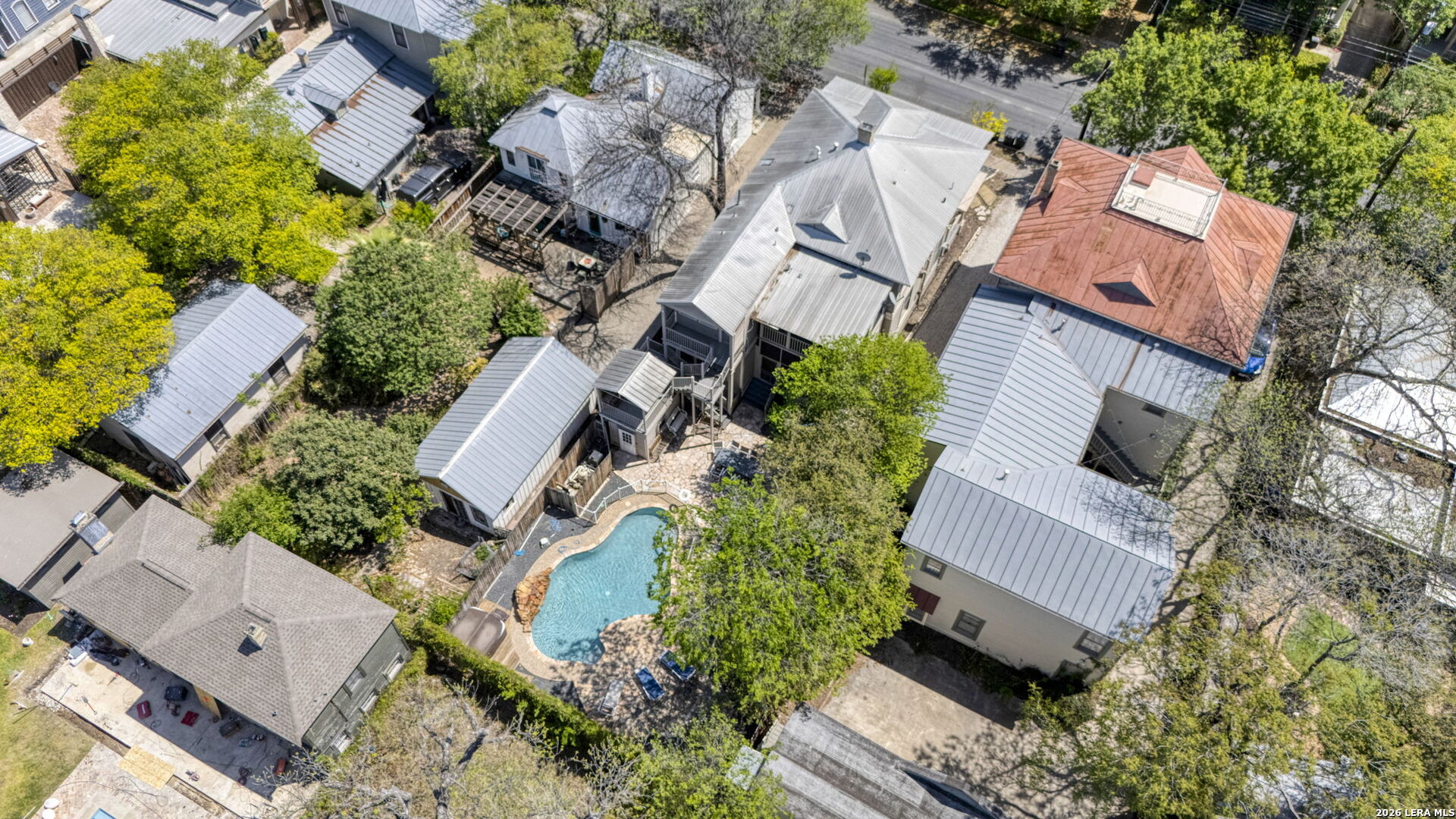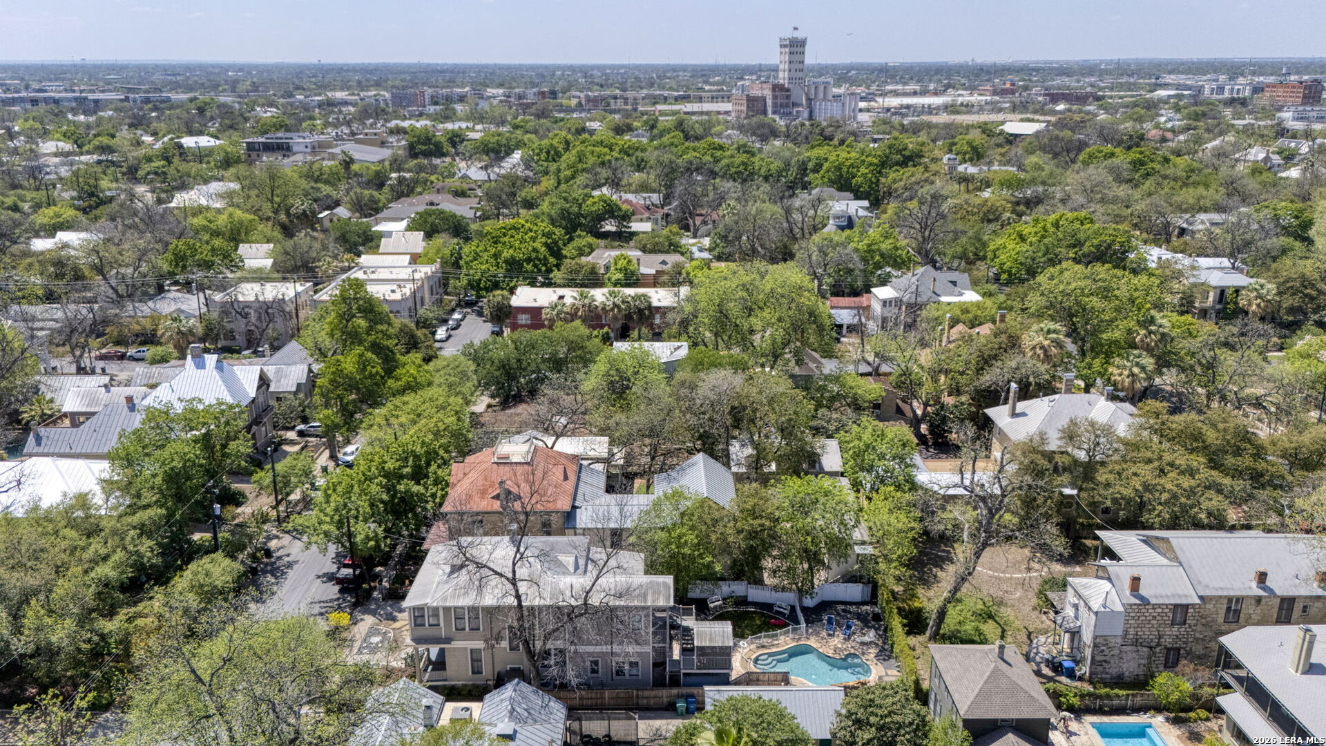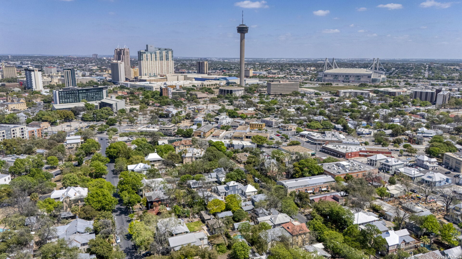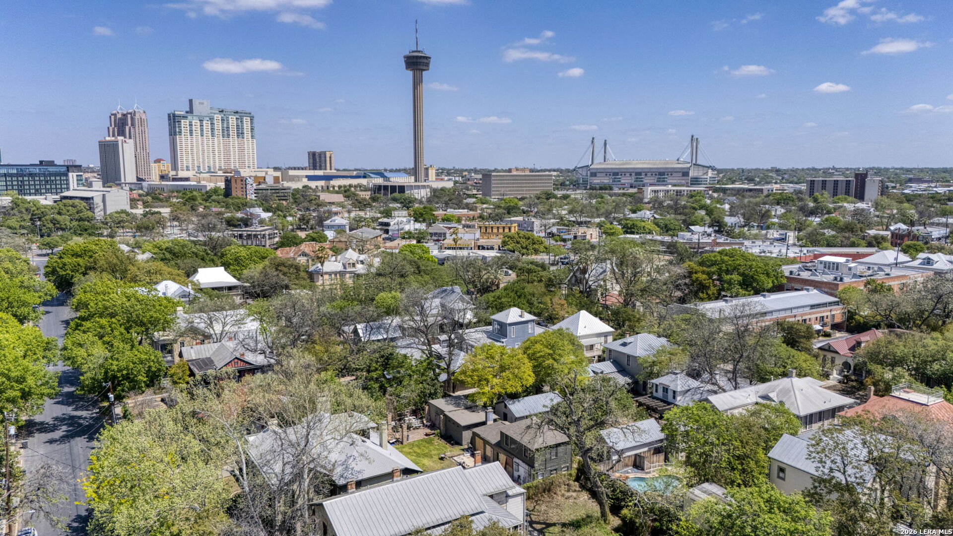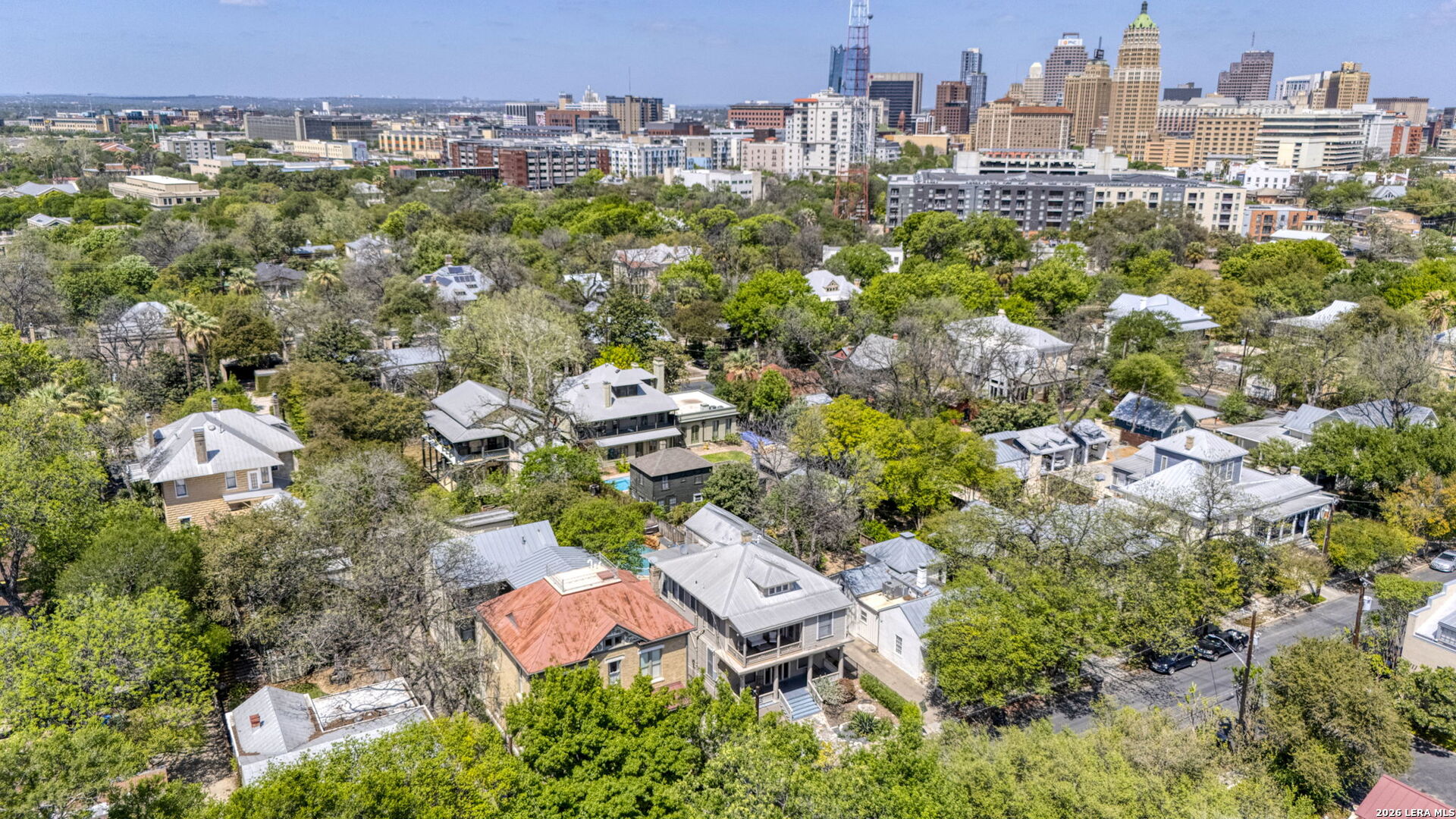 Spectacular 1922 Victorian in the heart of historic King William, offering timeless curb appeal with a true front porch, classic columns, and beautifully preserved architecture. Just two blocks from the River Walk, this home places you steps from parades, restaurants, and downtown living. Inside, the home blends historic charm with thoughtful updates. It features 5 bedrooms (dual primary suites), 4 full bathrooms, a large living room, formal dining room, and a screened-in porch/sunroom. The beautifully updated kitchen includes refreshed tile floors, backsplash, stunning countertops, lighting, and modern appliances. The living area also boasts a state-of-the-art entertainment system with a 110" automated drop-down screen and 7.1 in-ceiling speakers. Among other energy-saving features, the original windows remain intact & are enhanced with Indow Windows for improved energy efficiency & noise reduction. The backyard is a private retreat with an in-ground pool, deck, low-maintenance turf landscaping, pool fence, and standalone hot tub/spa. Private off-street parking and an electric car charger add convenience. A rare opportunity to enjoy an updated historic home in one of San Antonio's most iconic neighborhoods.