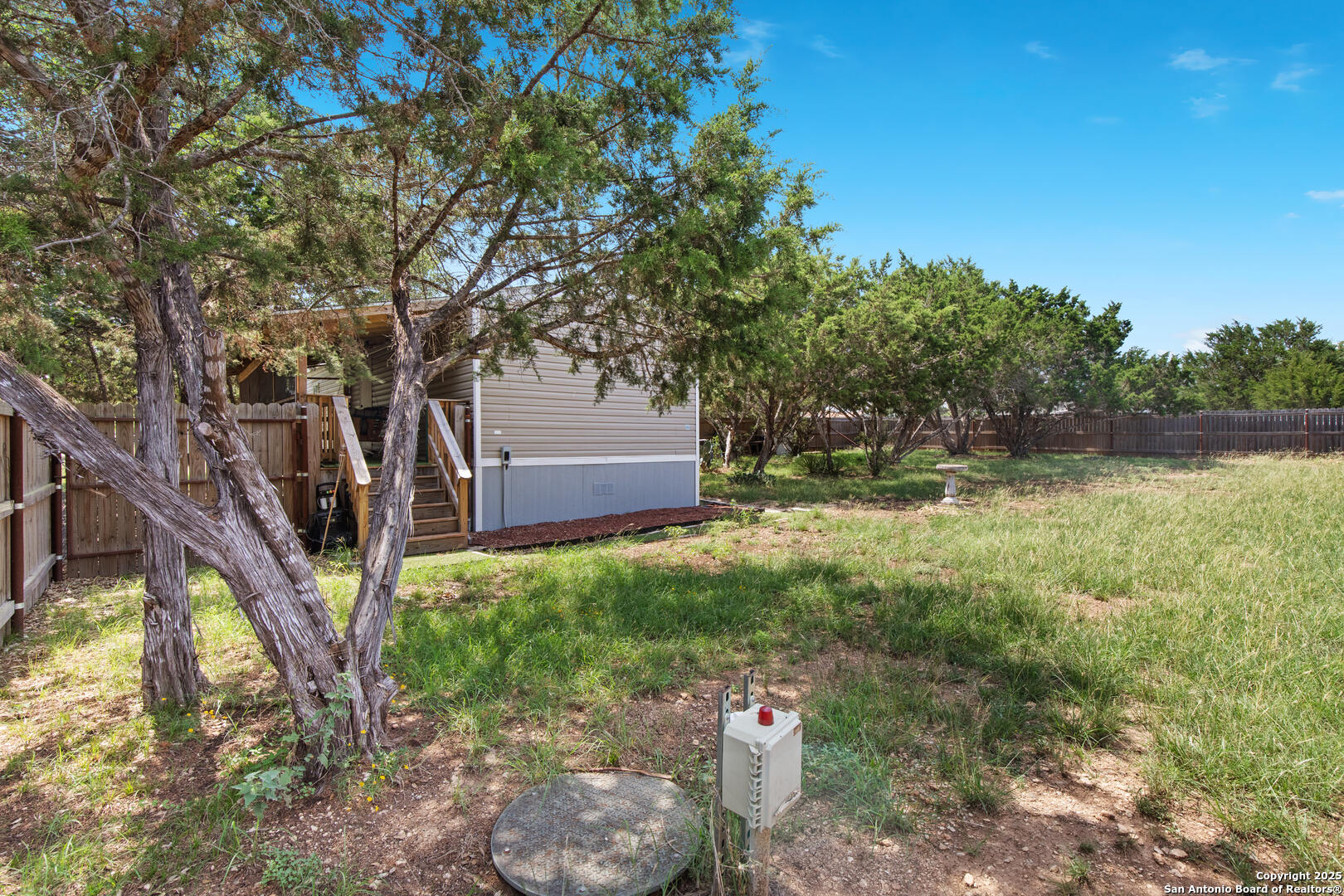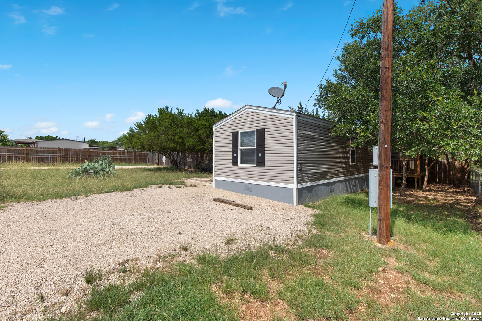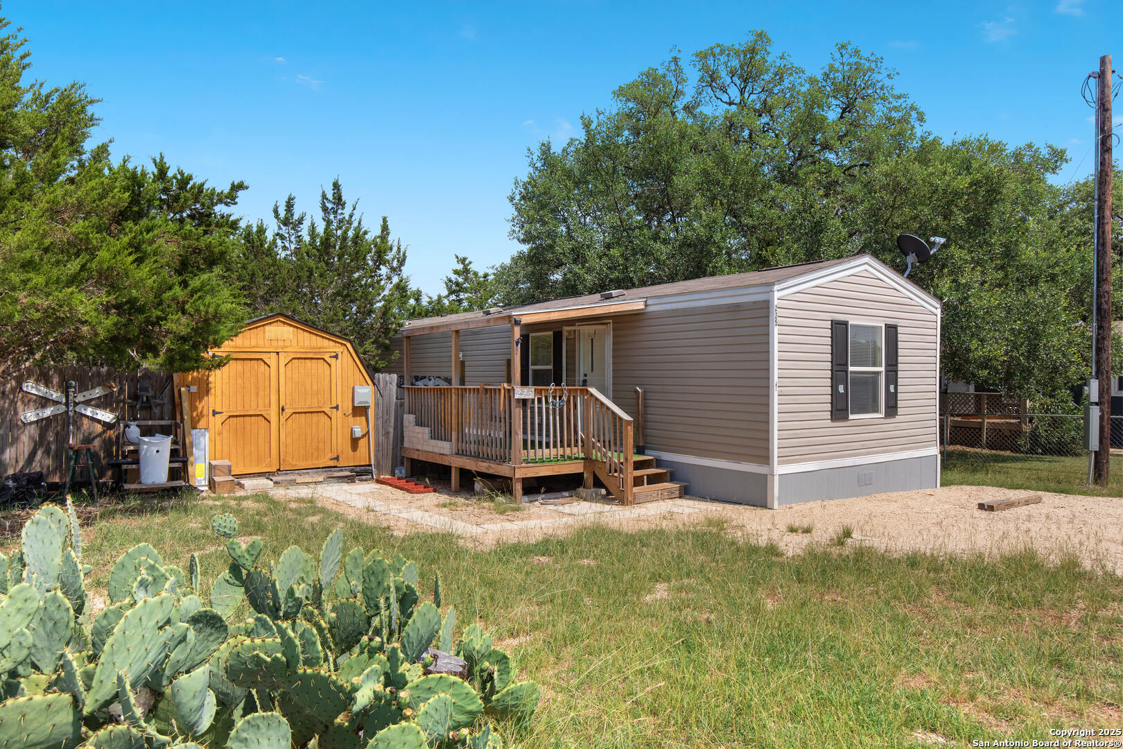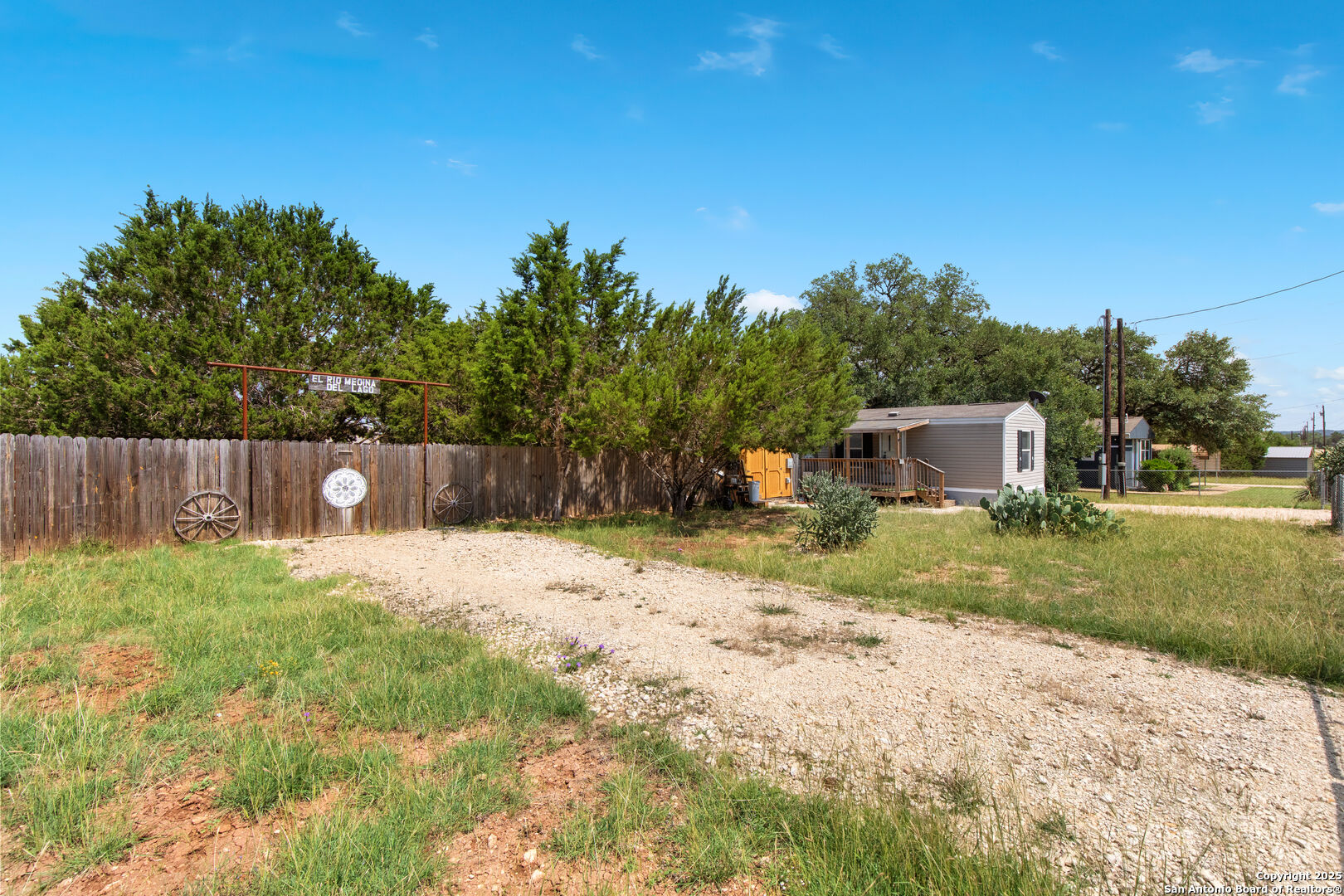 Cozy, well-maintained home in the gated community of Holiday Villages of Medina Lake! This affordable property features two spacious porches, underfloor insulation, a new skirt, and a fully fenced yard-chain link in front and privacy fencing with metal poles in back. Enjoy a beautifully landscaped outdoor space plus a storage shed/workshop perfect for gardening or hobbies. Washer, dryer, and fridge convey! Ideal as a weekend getaway or full-time residence, the home offers peace and quiet in a protected setting near a world-class medical facility. Neighborhood amenities include a pool, clubhouse, playground, basketball and tennis courts, and a lake park with boat launch. Gate guard on duty 9AM-6PM.