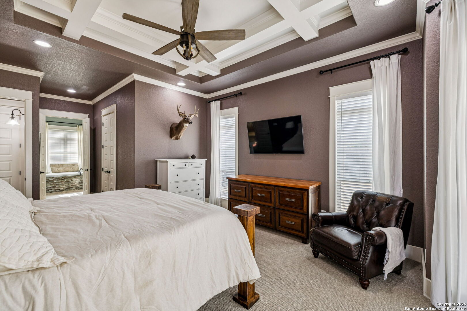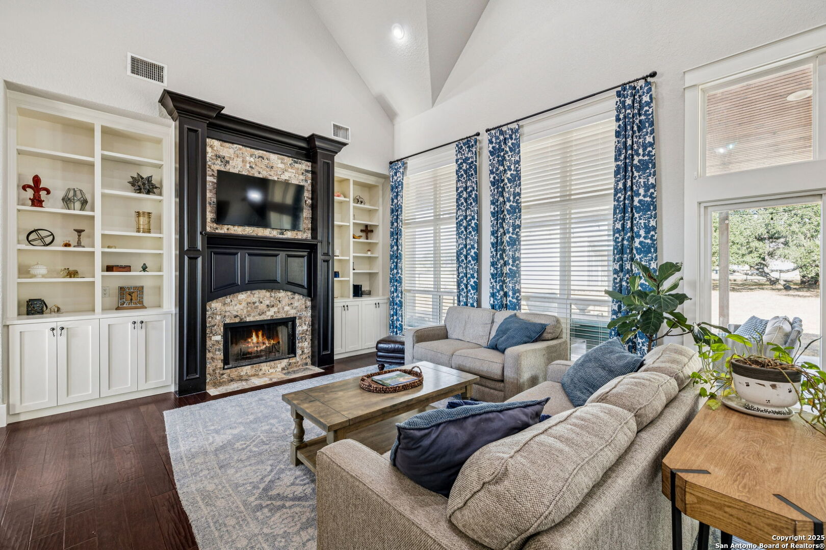 Life in River Chase is all about embracing the Hill Country lifestyle-mornings on winding trails, afternoons fishing or floating the Guadalupe River, and evenings under expansive Texas skies. Residents enjoy 58 acres of private riverfront parkland for swimming, kayaking, and picnicking, plus a 32-acre clubhouse with pools, sports courts, fitness center, and gathering spaces that make every weekend feel like a retreat. Perched on a meticulously maintained acre, this home blends style, comfort, and practicality. A spacious workshop sits steps from the back patio, ready for hobbies, storage, or projects, while the covered patio overlooks a fenced yard framed by mature trees, creating an ideal space for entertaining or relaxing. Inside, natural light pours through expansive windows onto travertine and warm wood floors. The kitchen is a showpiece with leathered granite countertops, custom cabinetry, a large center island, and built-in appliances-perfect for both casual meals and lively gatherings. The owner's suite offers a private escape with patio access, a spa-style bath with soaking tub, and walk-in shower. Additional bedrooms provide flexibility and storage, including a guest suite with a kitchenette ideal for visitors or multi-generational living. With lush landscaping, a fenced dog run, and spaces made for both fun and tranquility, this property captures the essence of River Chase-laid-back luxury and outdoor adventure just minutes from the best of New Braunfels.