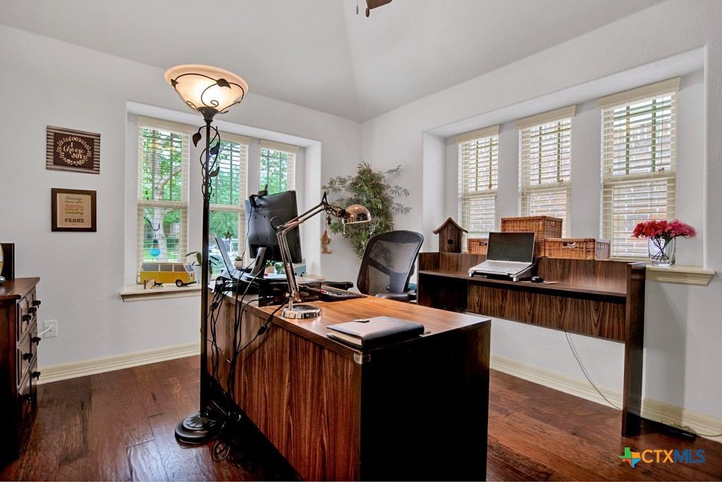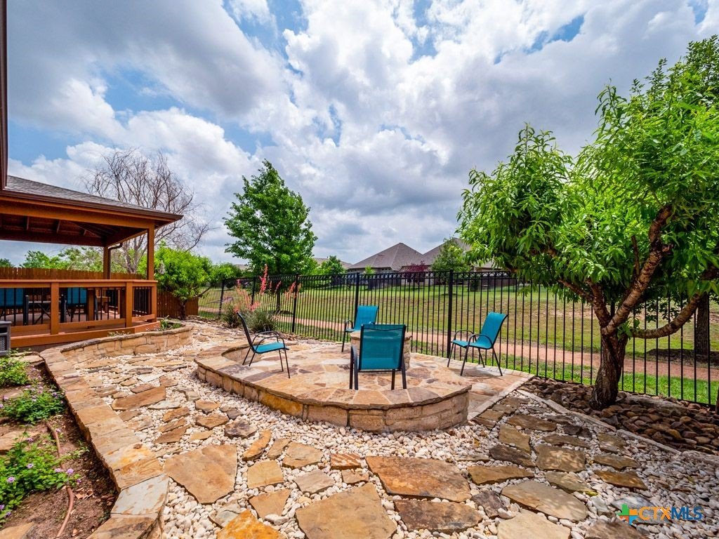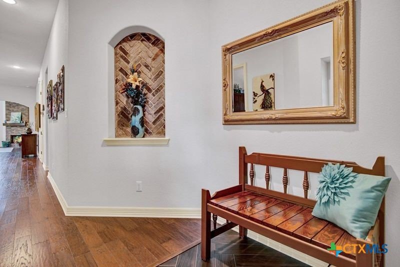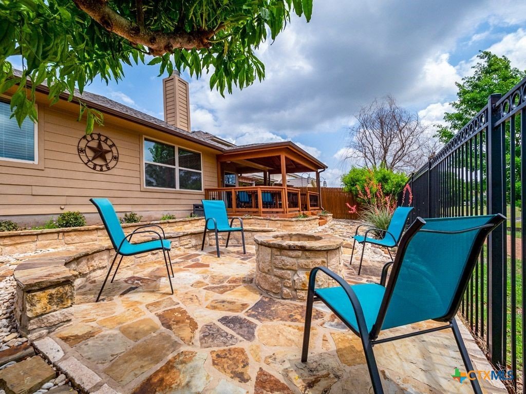 Welcome to this beautifully updated home in the sought-after Blanco Vista community of San Marcos, TX! Located just minutes from I-35, Texas State University, and the Blanco River, this vibrant neighborhood features a community pool, splash pad, playgrounds, hike and bike trails, and the highly rated Blanco Vista Elementary School. This thoughtfully maintained home is loaded with upgrades and recent improvements—starting with an Owens Corning Driftwood roof - installed 1/31/25, with a transferable warranty (pending approval). Enjoy low maintenance living with full gutters, an automatic sprinkler system, and a foundation drip line. Step inside to find Shaw hardwood floors in warm Sunset tones and an abundance of custom touches throughout. The home office features built-in cabinetry by Closets by Design, perfect for remote work. The kitchen is a cook’s dream with a Whirlpool double oven, reverse osmosis filtration, and an expanded pantry. Relax in the spacious living room with a custom brick fireplace flanked by brick niches. The owner's suite includes an upgraded bath with a ceiling fan, custom shoe shelves, and additional cabinetry for extra storage. Bedroom 2 also features a custom closet organizer. You will be super excited to see that all three bedrooms are oversized rooms for plenty of relaxing space, lots of furniture, and still tons of floor space to walk around! The garage is equipped with cabinets, a workbench, water softener, and an attic fan controlled from inside. The laundry room has upper cabinets for added convenience. Outdoor living shines with a covered deck, built-in bench and BBQ table, firepit with seating, garden planters, and river rock landscaping with peach trees—perfect for relaxing or entertaining. This home truly blends comfort, style, and function. Schedule your tour today!