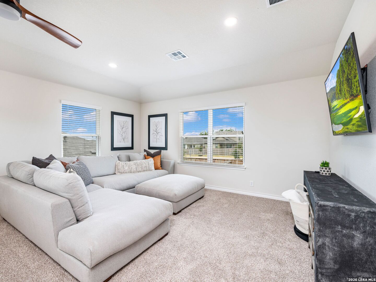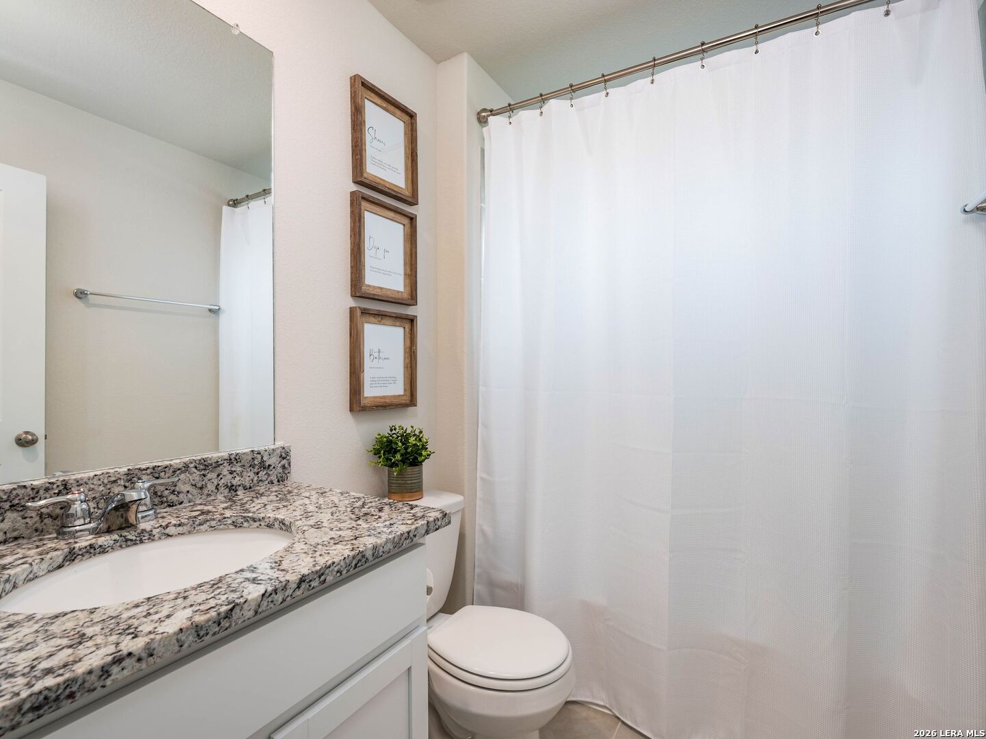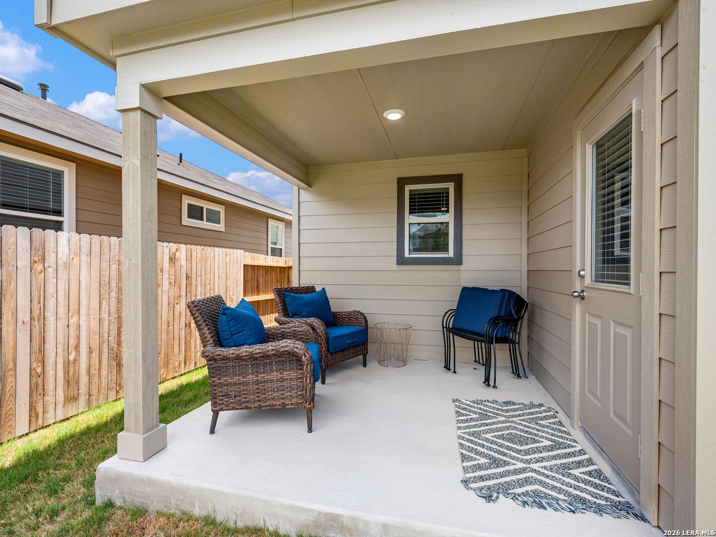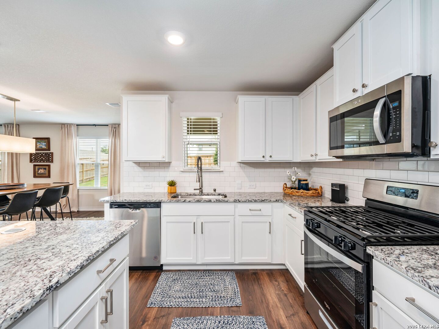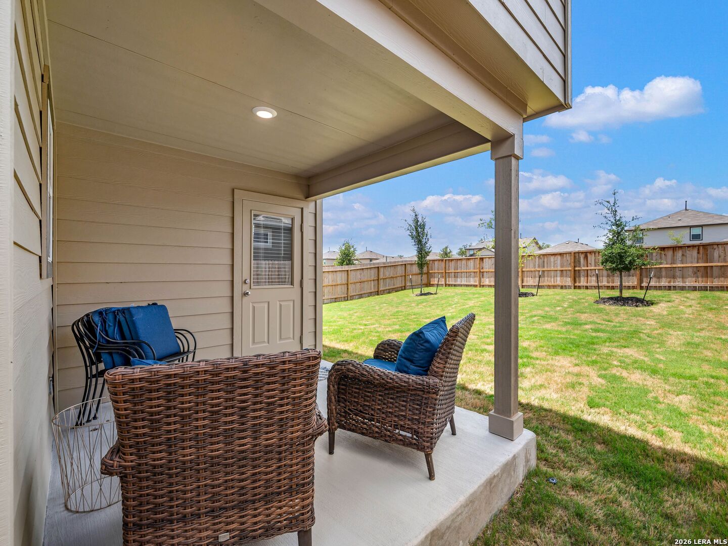 Available as a fully furnished 6-month lease, this two-story home offers a well-designed 3-bedroom, 2.5-bath layout, perfect for those seeking comfort, flexibility, and convenience. A covered front porch opens to a welcoming foyer and powder bath, leading into an open-concept living, dining, and kitchen space ideal for both everyday living and entertaining. The kitchen features granite countertops, a large center island, stainless steel appliances, subway tile backsplash, and a walk-in corner pantry. A window above the sink overlooks the backyard, and the dining area opens to a covered patio. Upstairs offers a bright loft, utility room, and all three bedrooms. The privately situated primary suite includes a semi-vaulted ceiling, ensuite bath with dual vanities, separate tub and shower, and a generous walk-in closet. Secondary bedrooms share a full bath and are positioned across the loft for added privacy. Additional features include 9-foot ceilings, luxury vinyl plank flooring in main living areas, ceramic tile in wet spaces, 2-inch faux wood blinds, a water softener loop, full yard irrigation and landscaping, and integrated smart home technology with remote access to lights, locks, and thermostat. Located near Loop 1604 and Highway 281, the home offers quick access to TPC Golf Course and JW Marriott Resort & Spa. Enjoy resort-style community amenities including a pool, splash pad, fitness center, playground, and a calendar of neighborhood events. Shopping, dining, and entertainment are all close by.